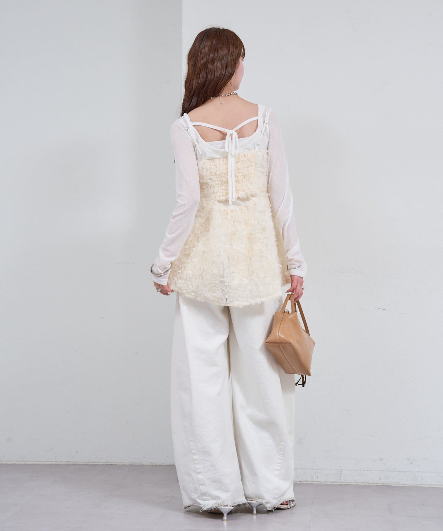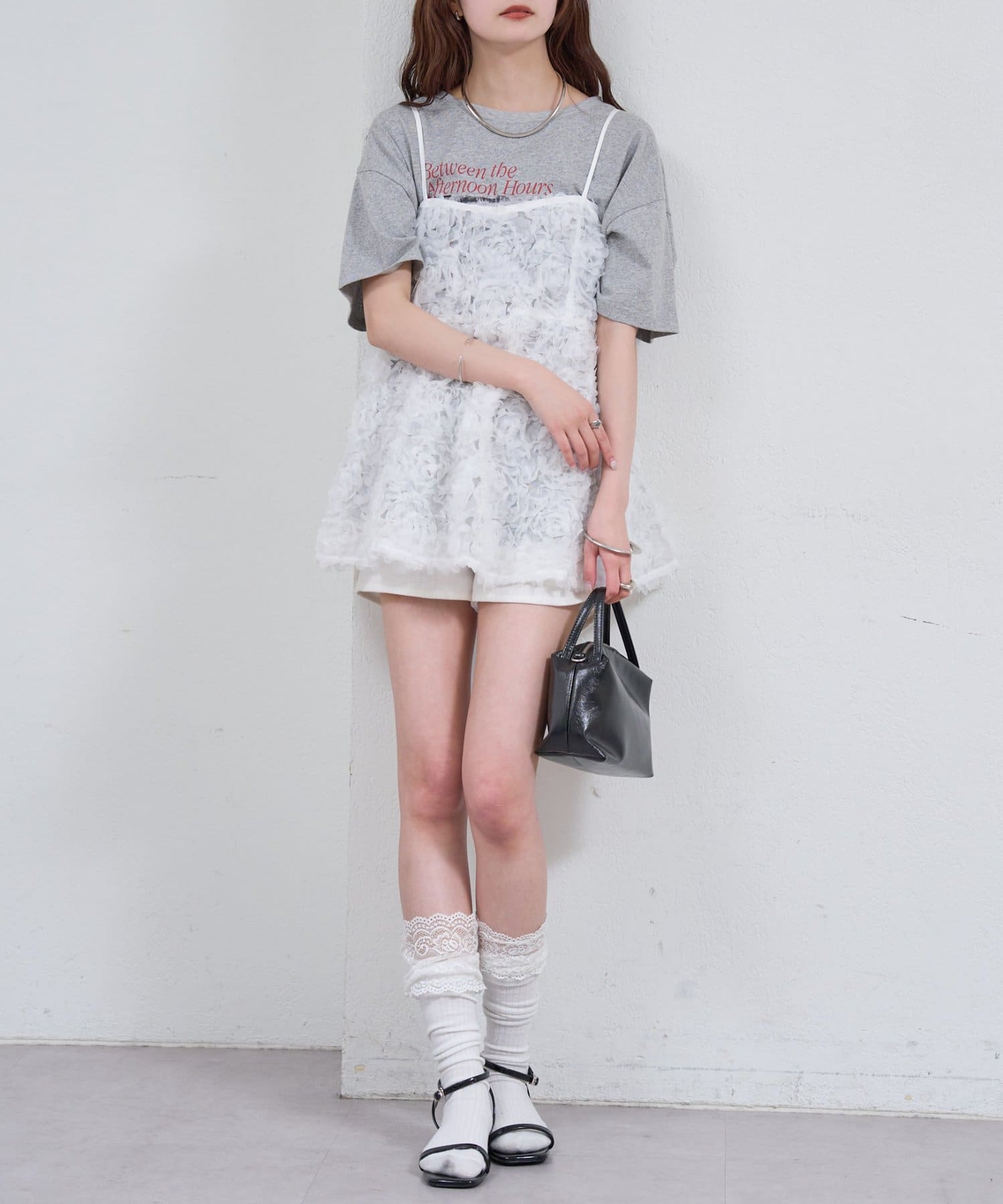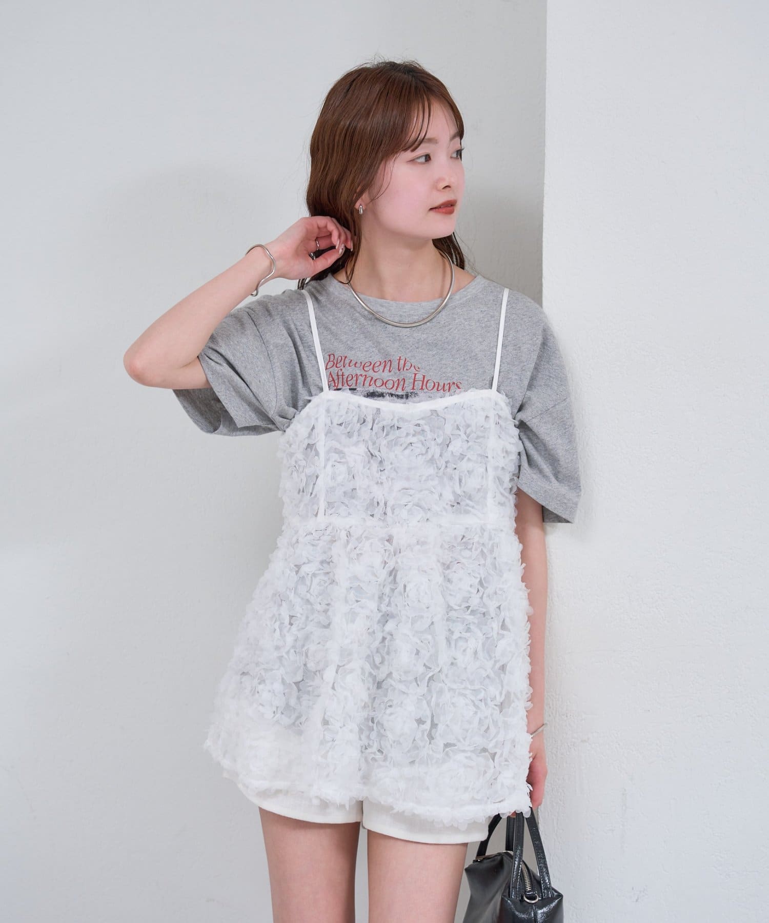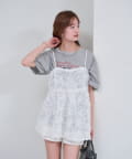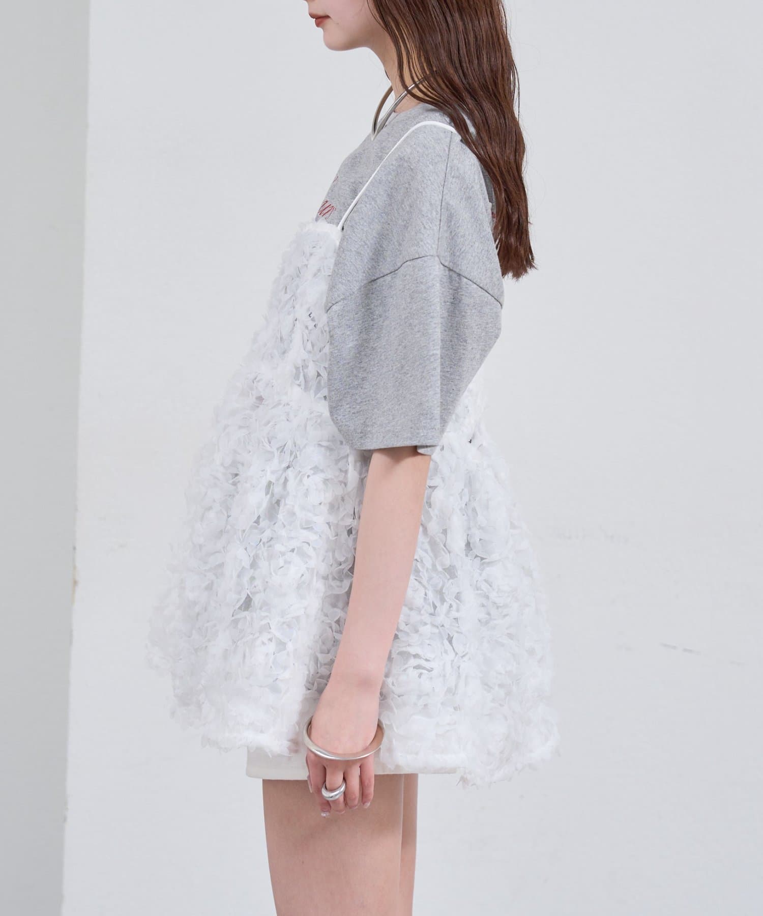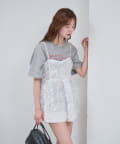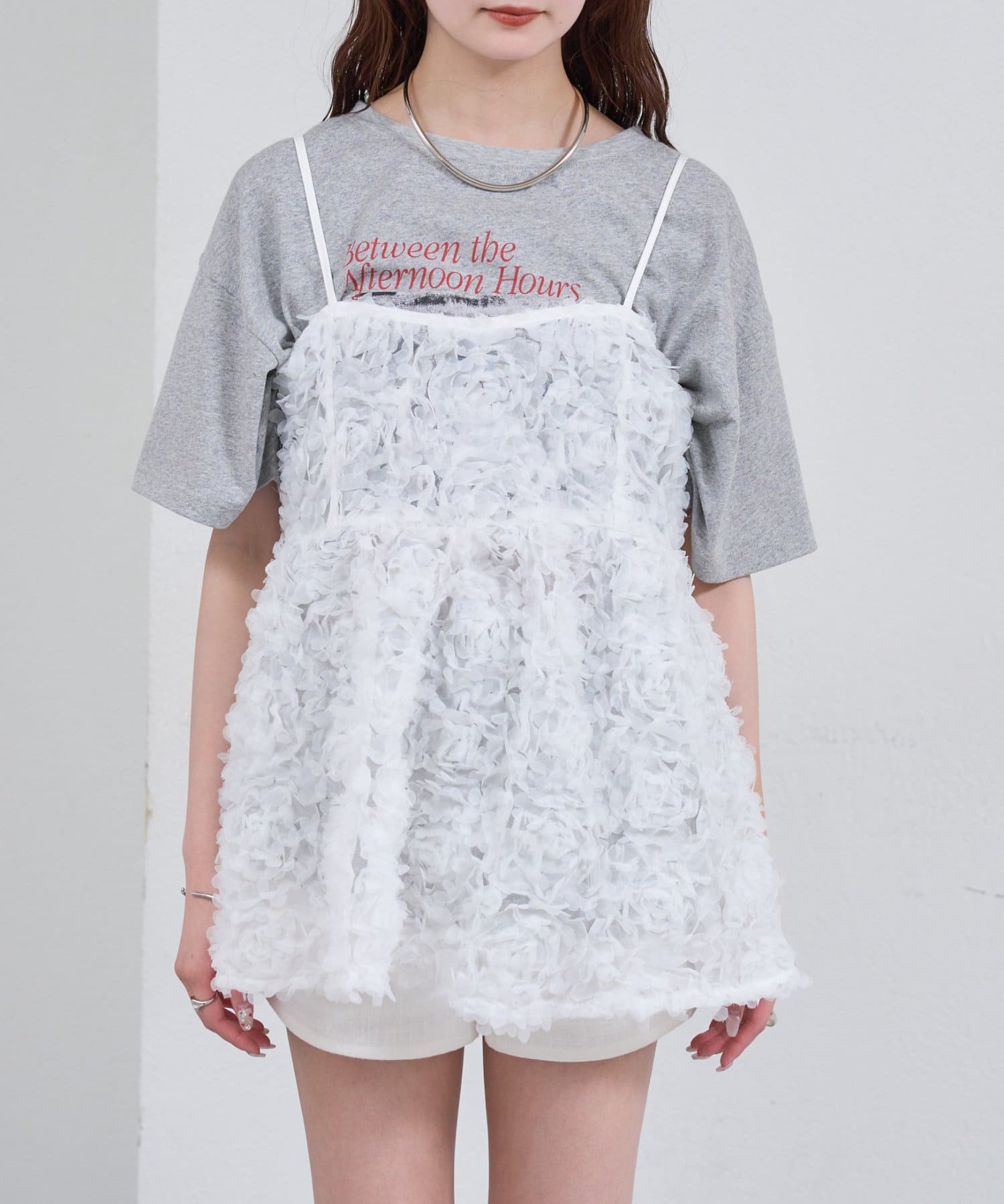 ・立体感のあるフラワーモチーフのチュール素材が目を惹くキャミチュニック。