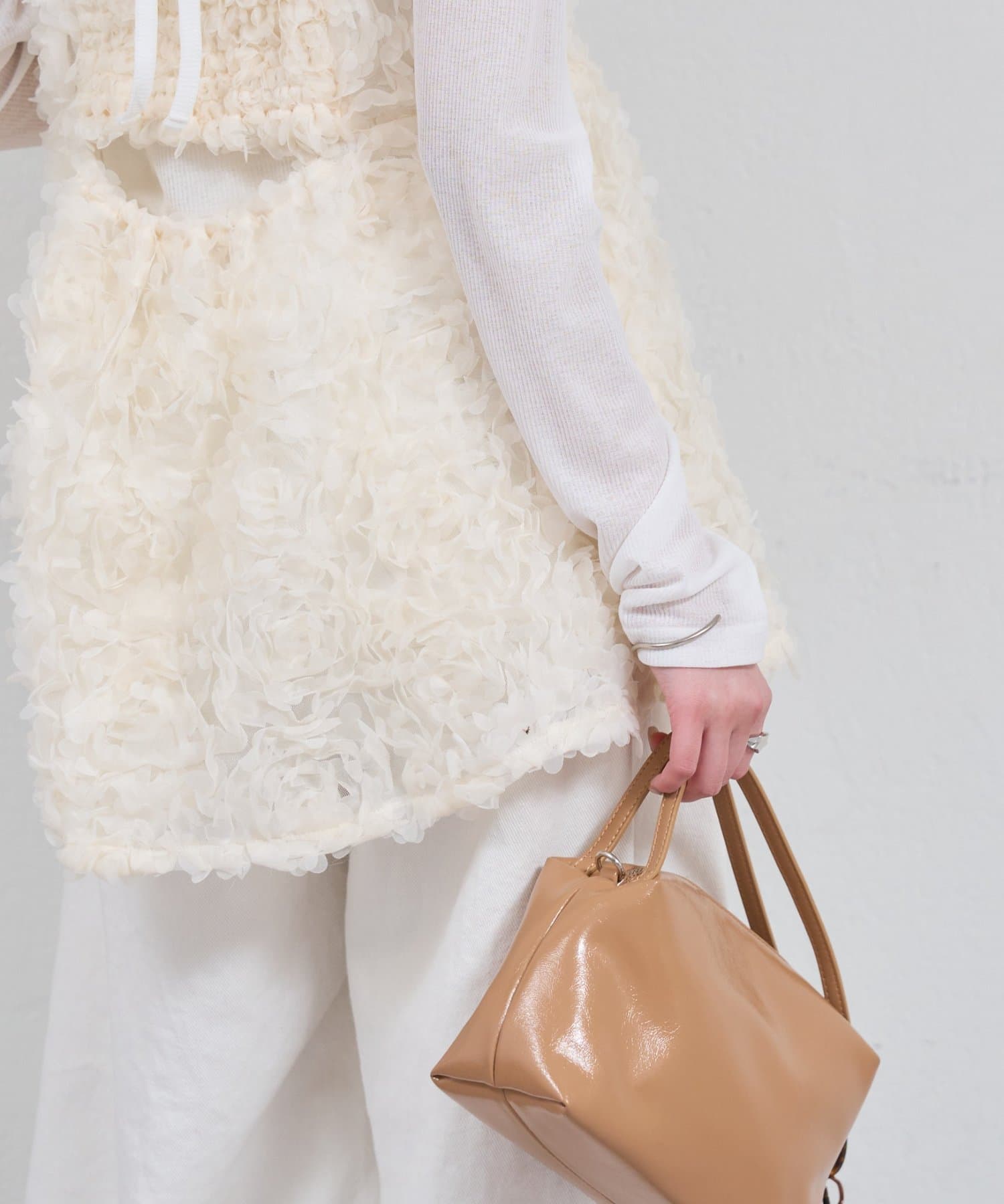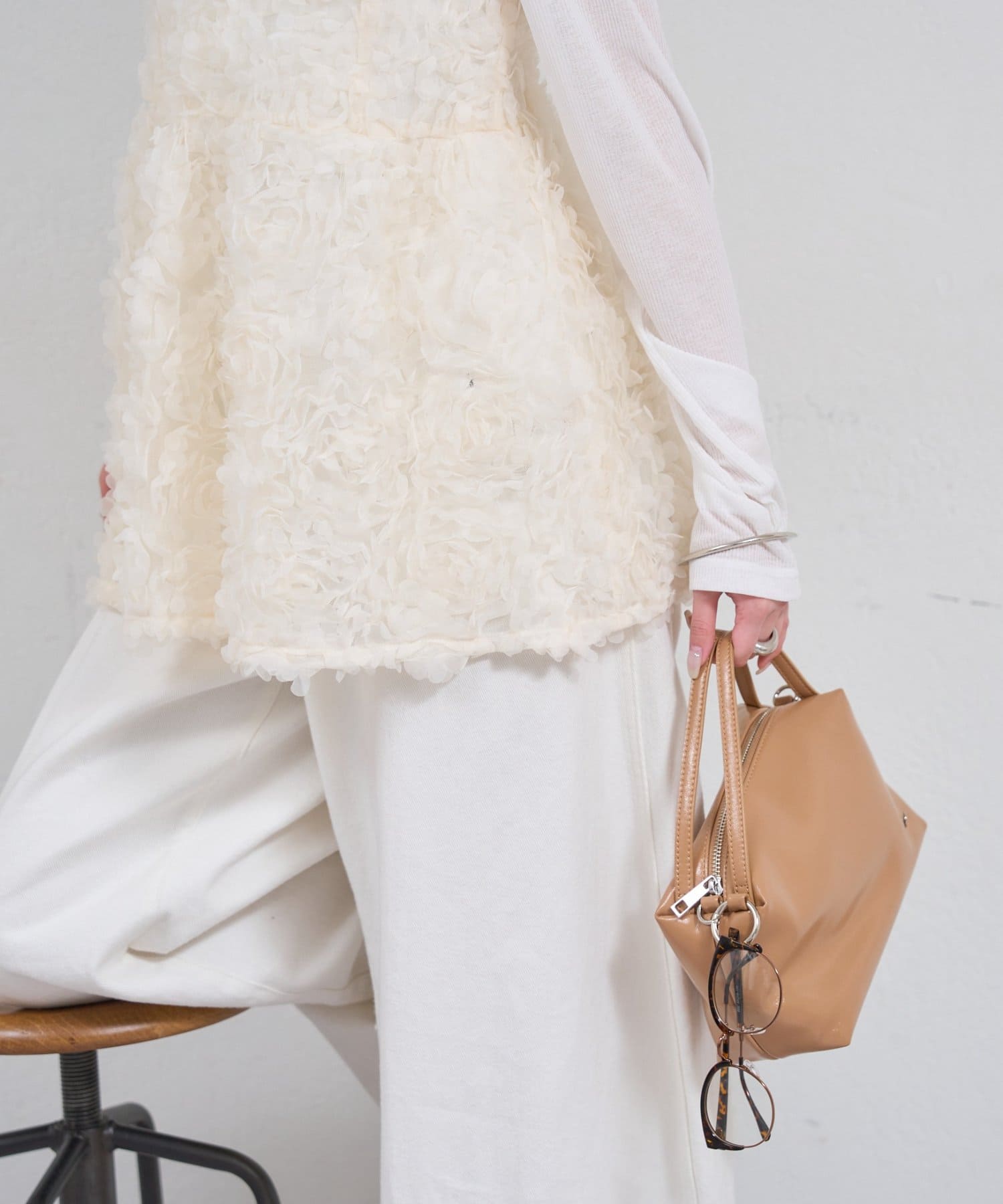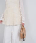 ・ふんわり広がるシルエットでフェミニンな印象に仕上げつつ、シンプルなインナーに合わせるだけでるタイリングを華やかにしてくれます。