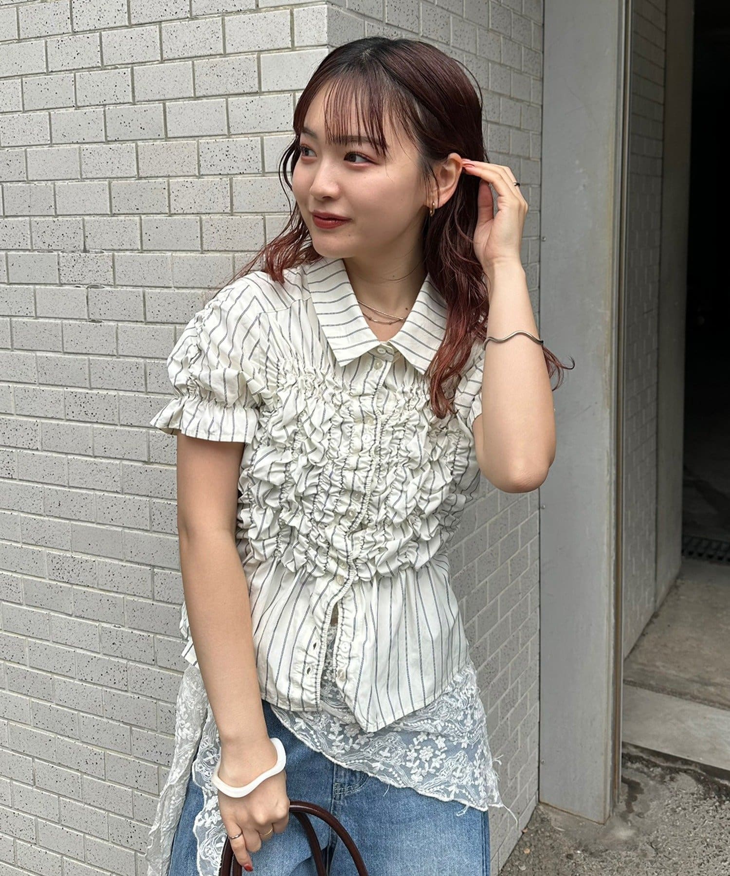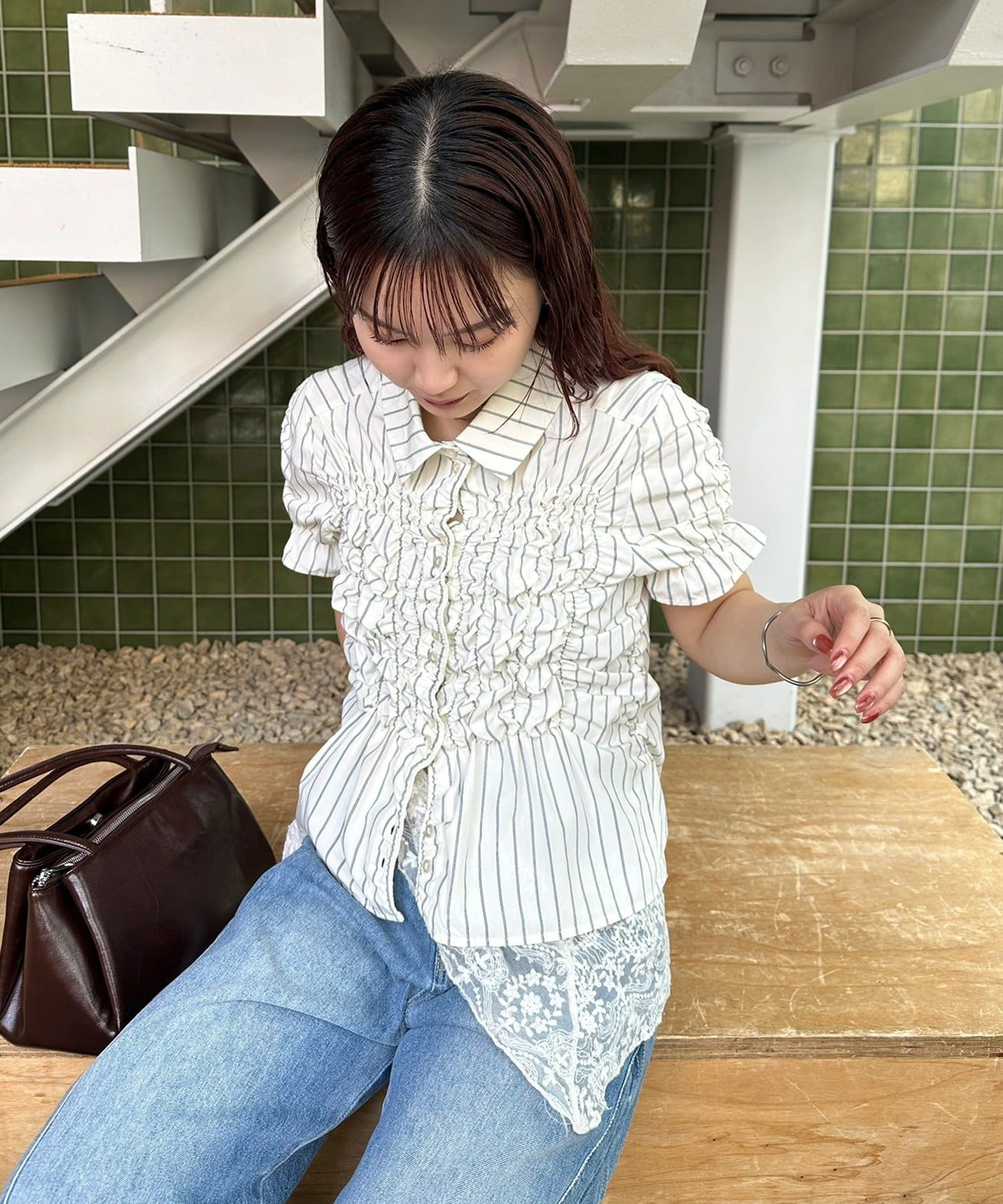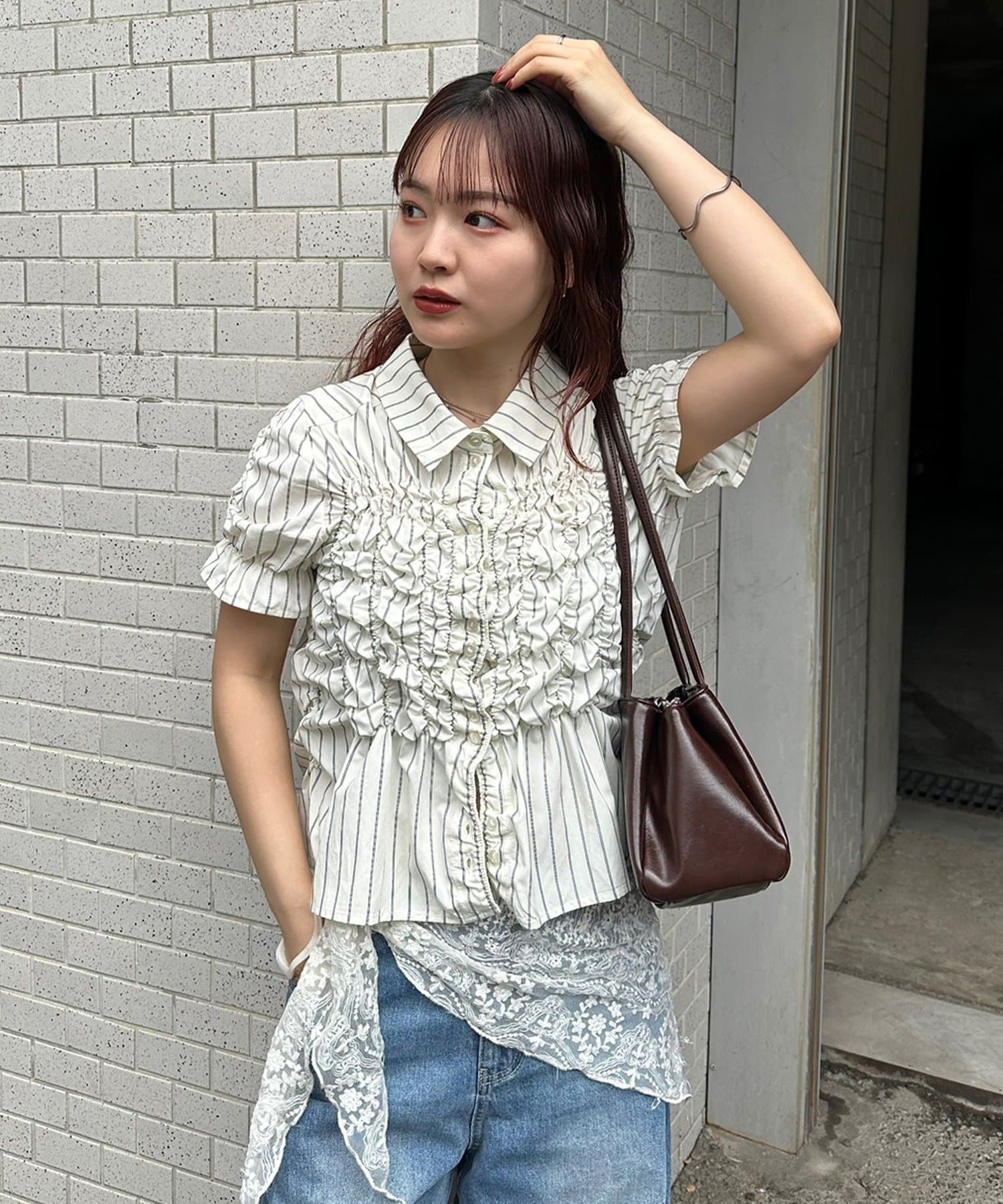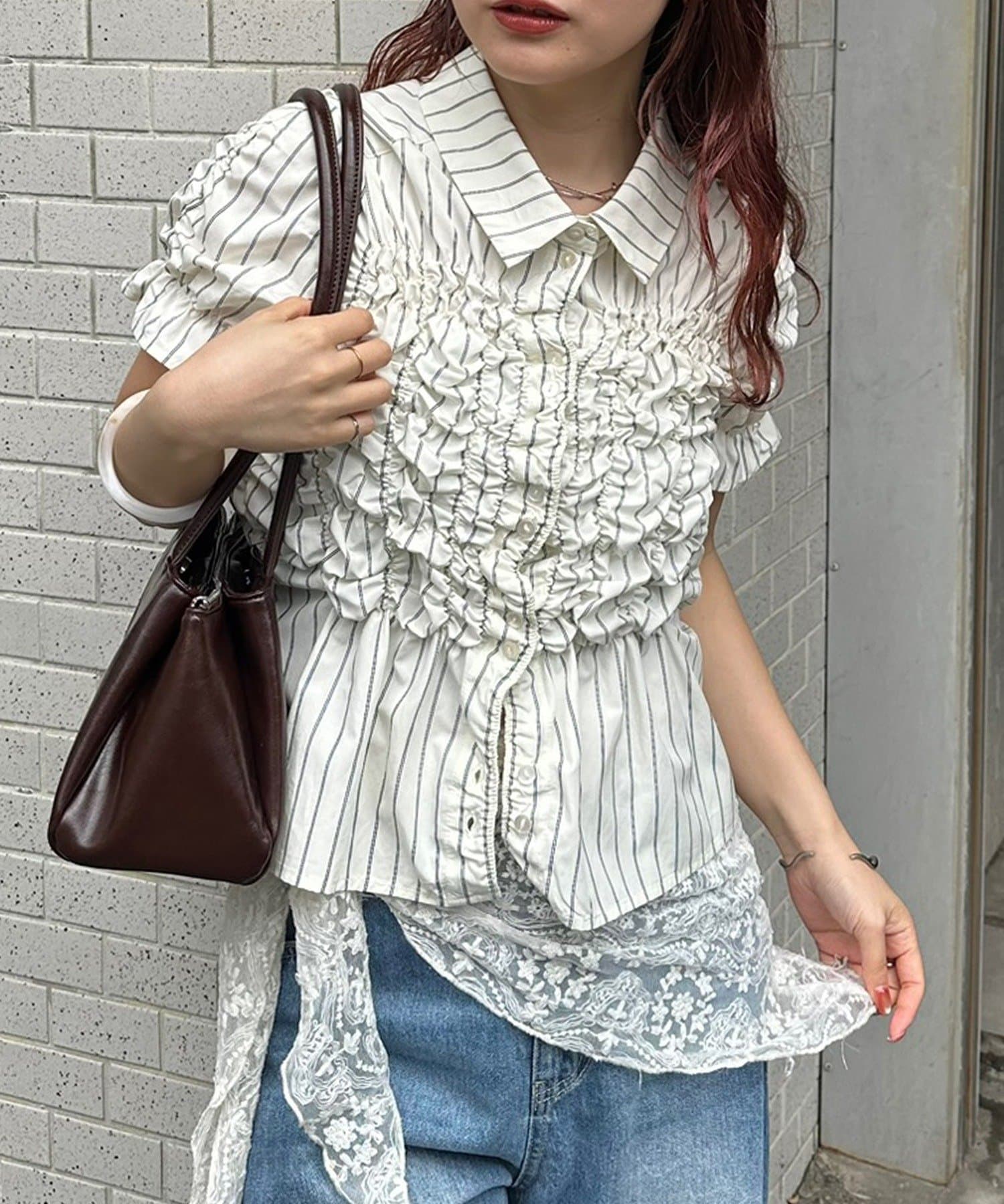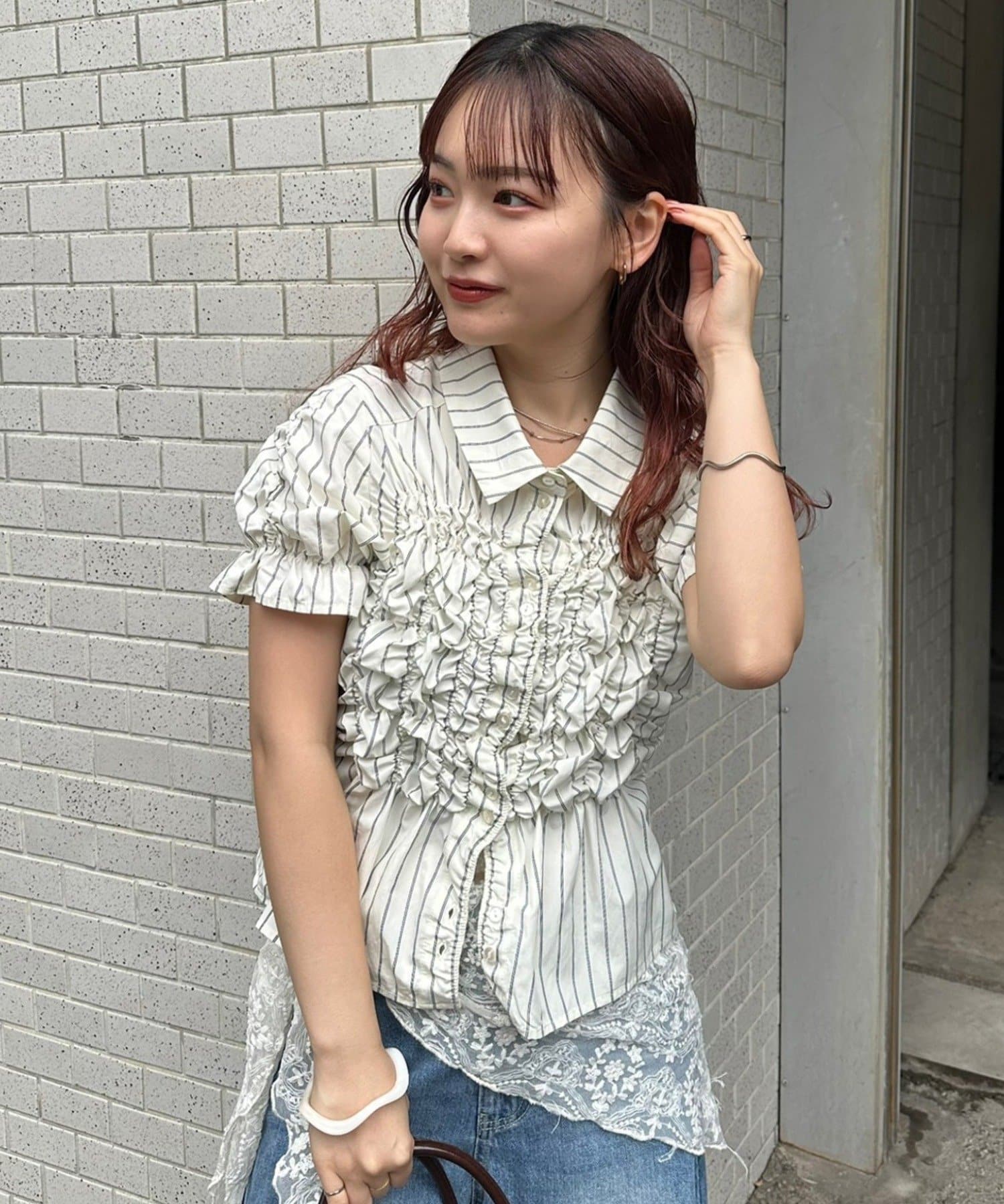 ・ミニボトムと合わせて、フェミニンさをプラスしたスタイリングにも。