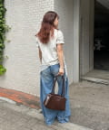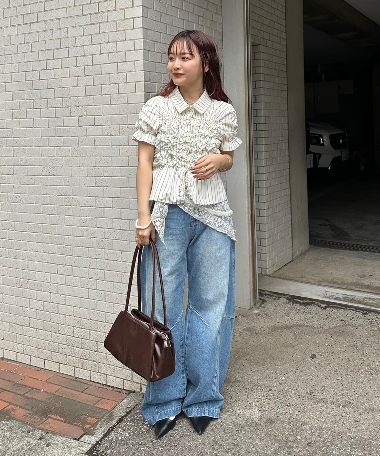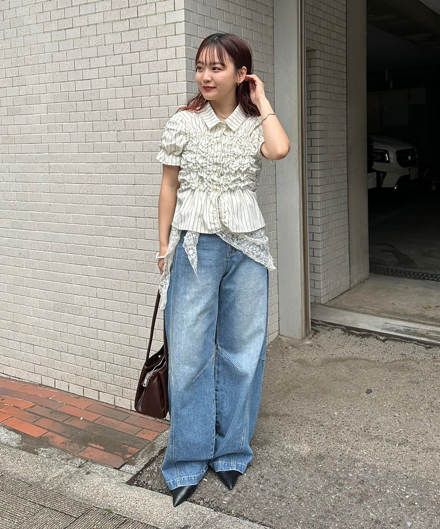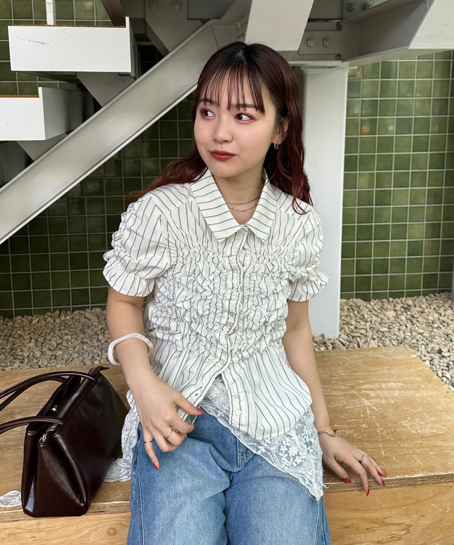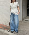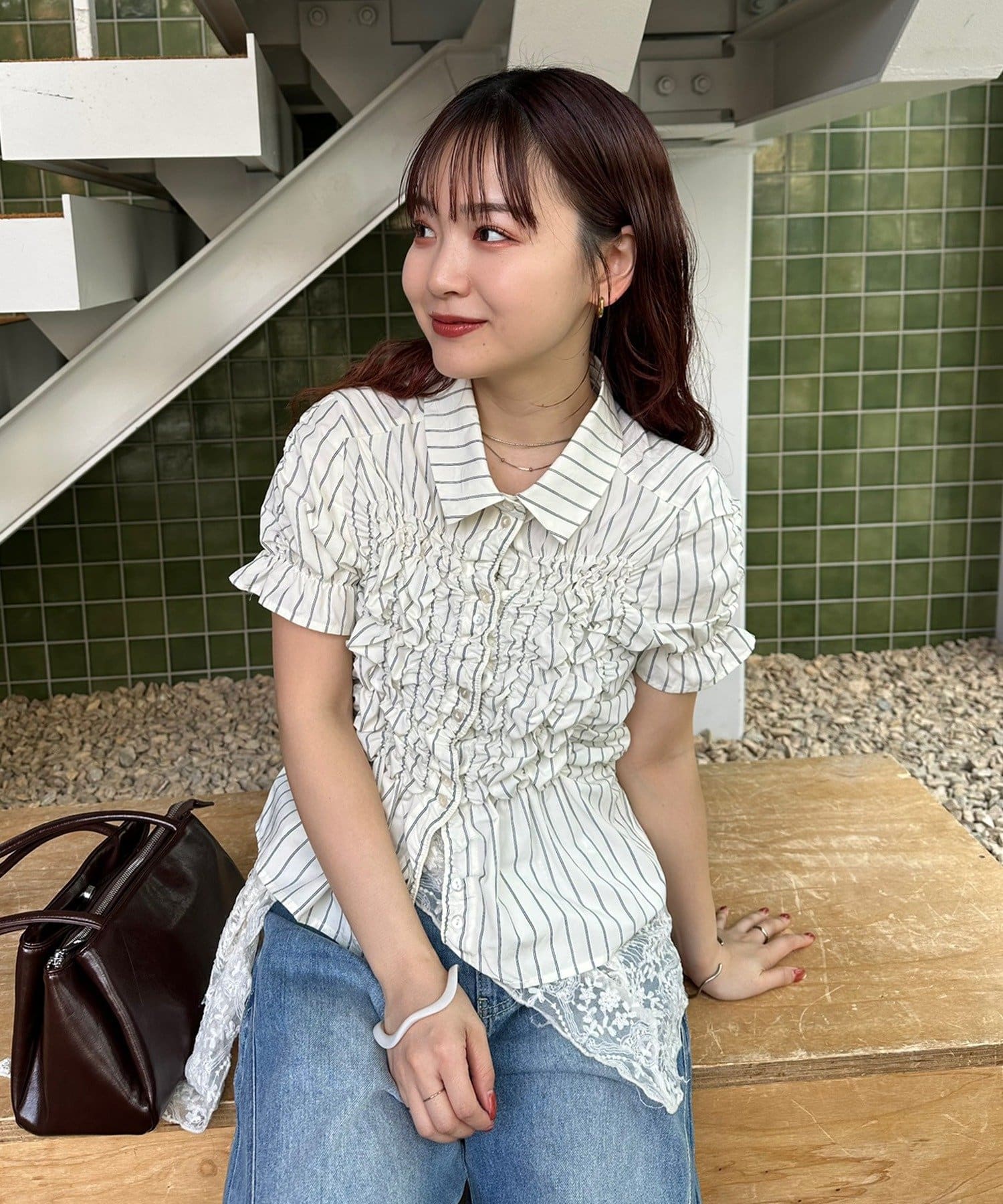 ・ミニボトムと合わせて、フェミニンさをプラスしたスタイリングにも。