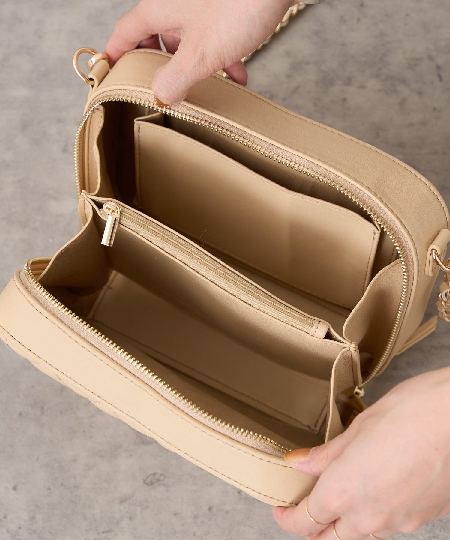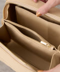 ・コンパクトなサイズ感ながら、マチとインナーポケットもしっかりあるので、見た目以上に収納力も抜群です。センターに仕切りポーチが付いているので、収納しやすく取り出しやすいのも嬉しいポイント◎