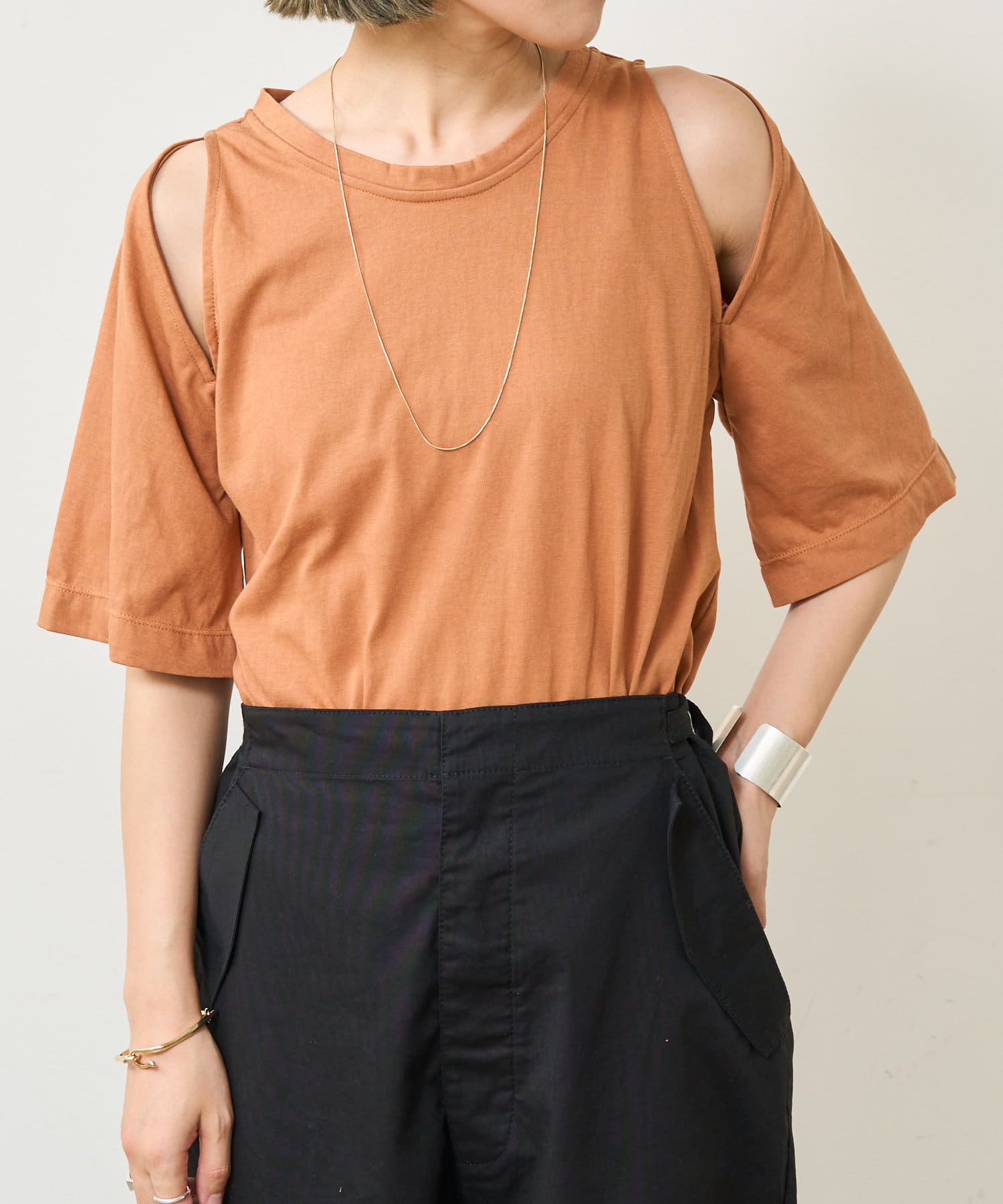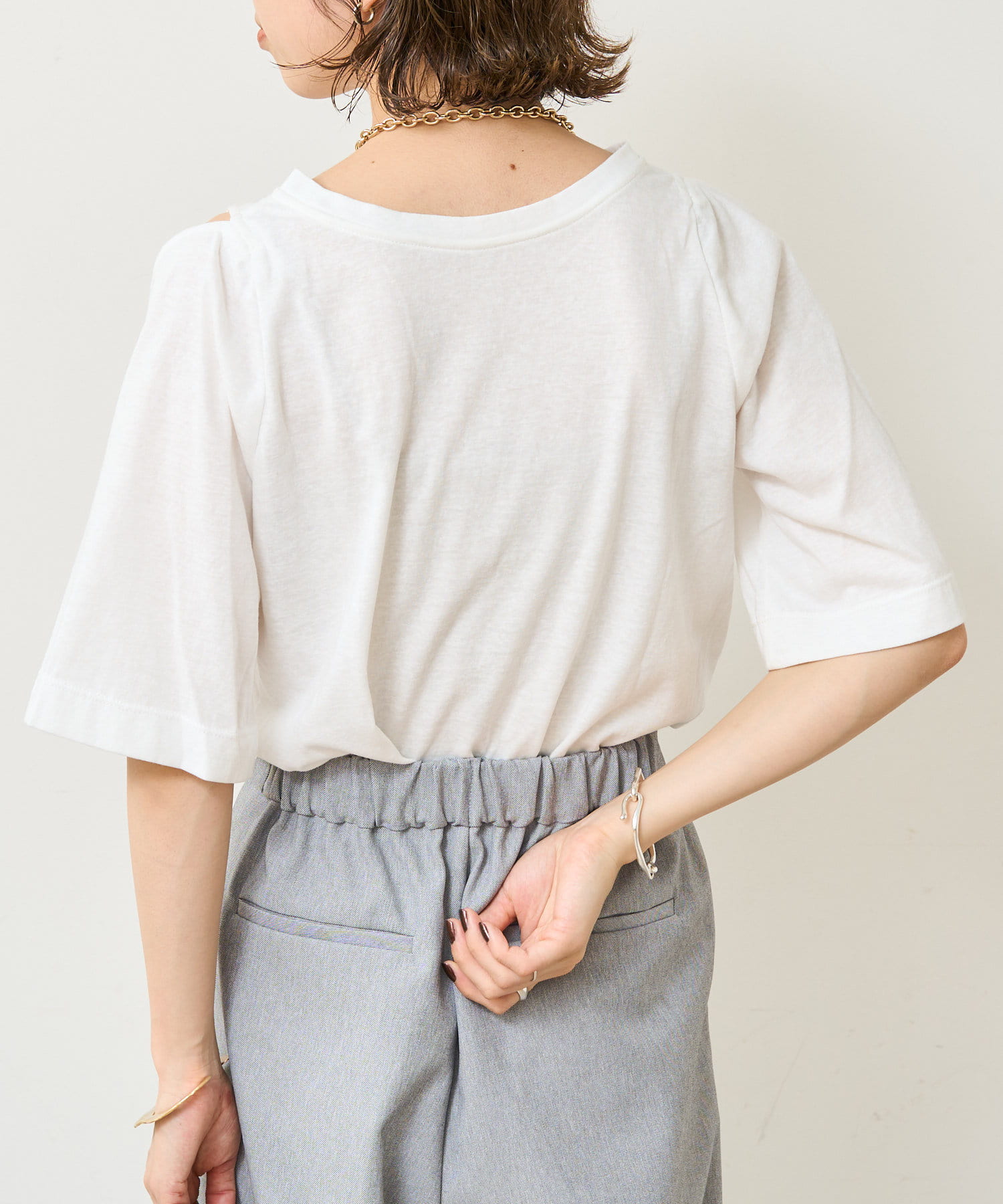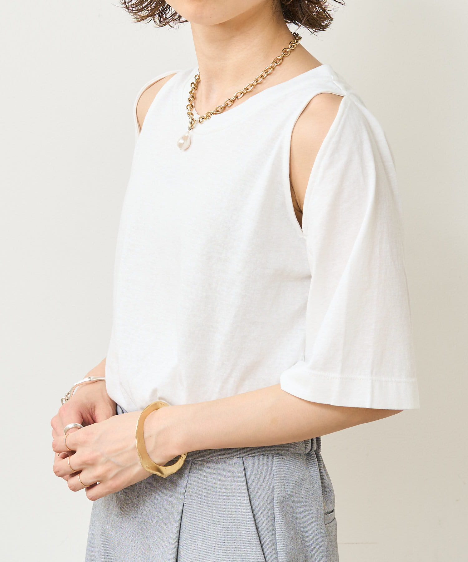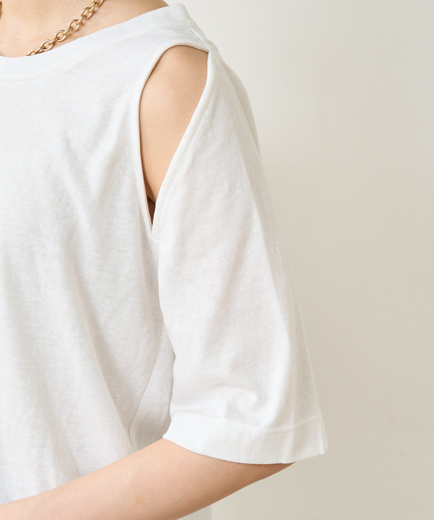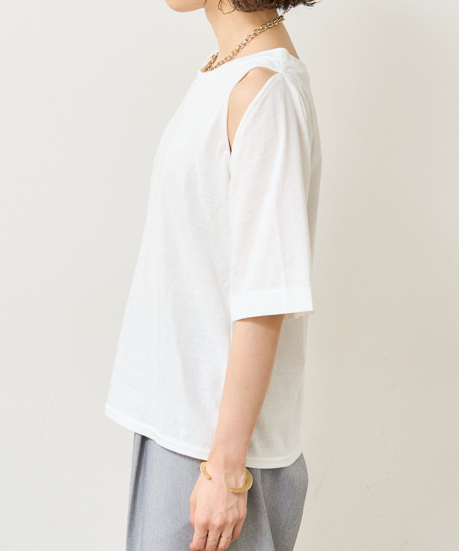 ・アーム部分のデザインスリットが抜け感があり、程よい肌見せが叶うTシャツ。