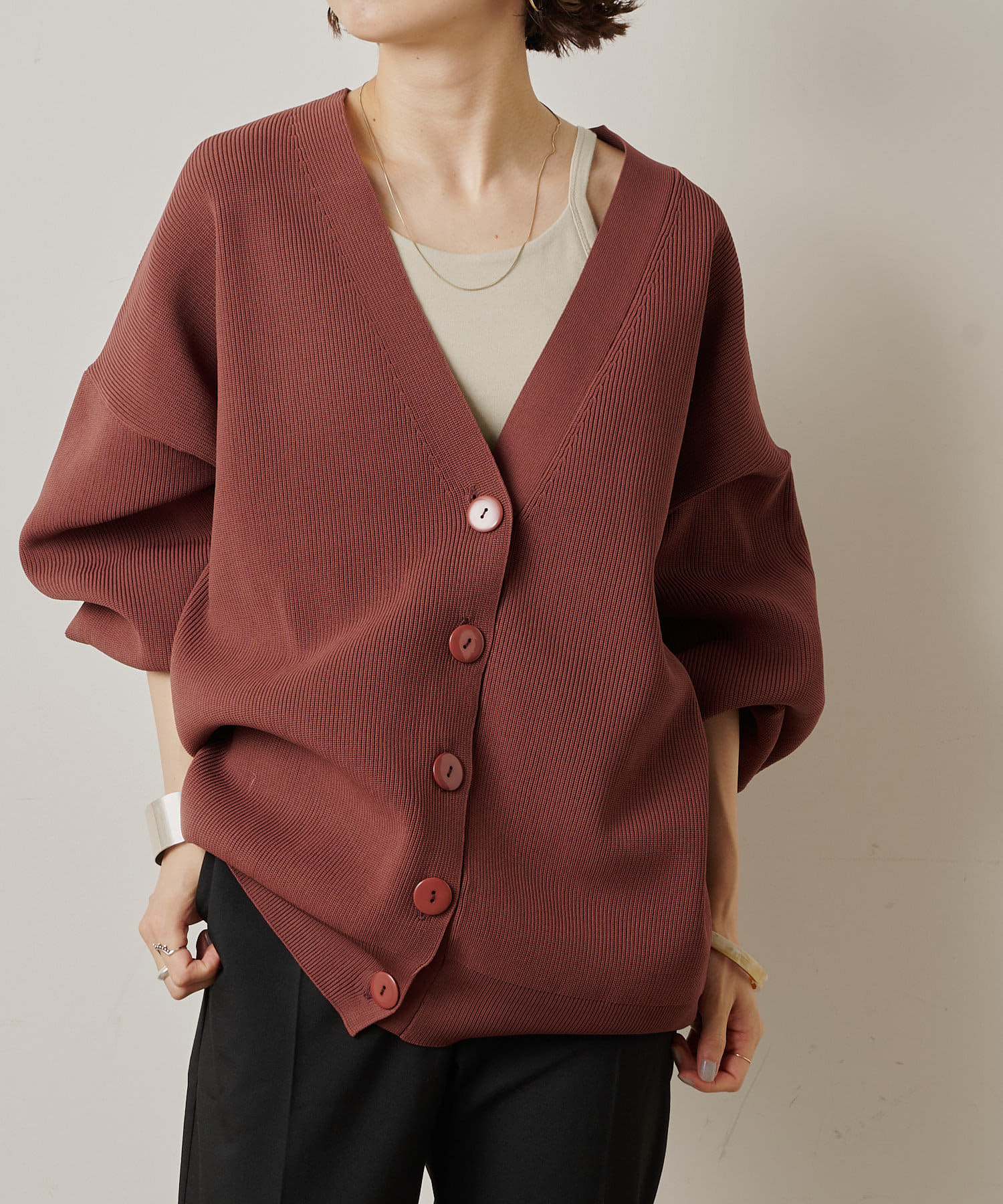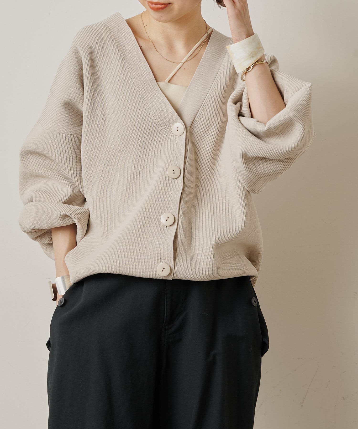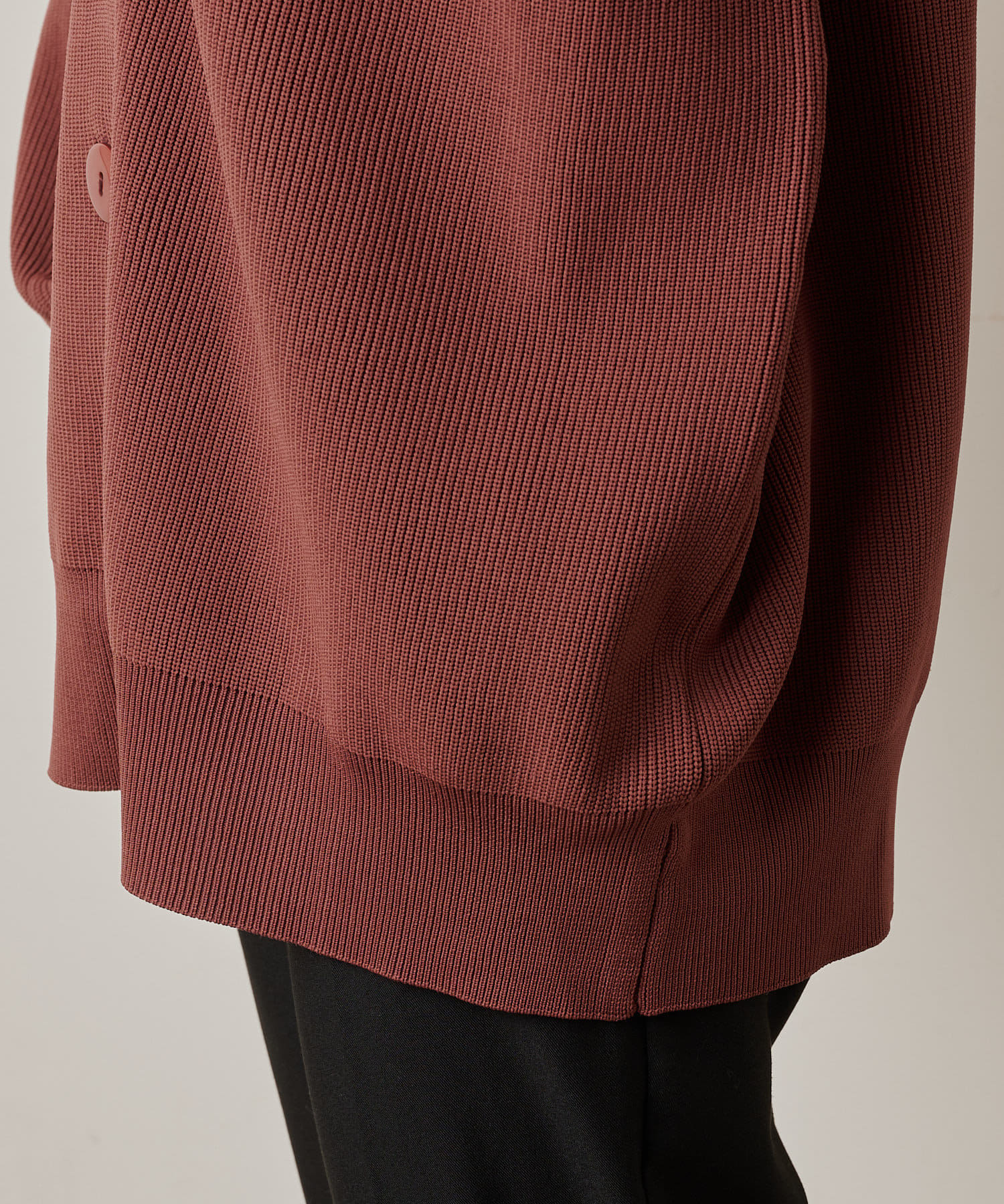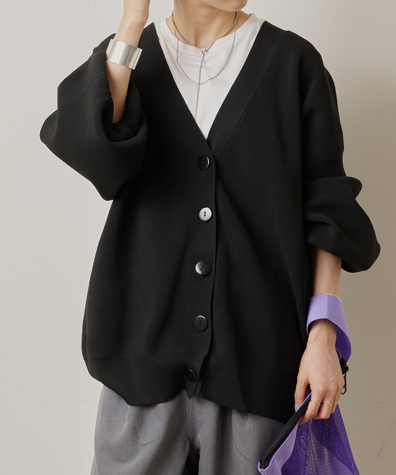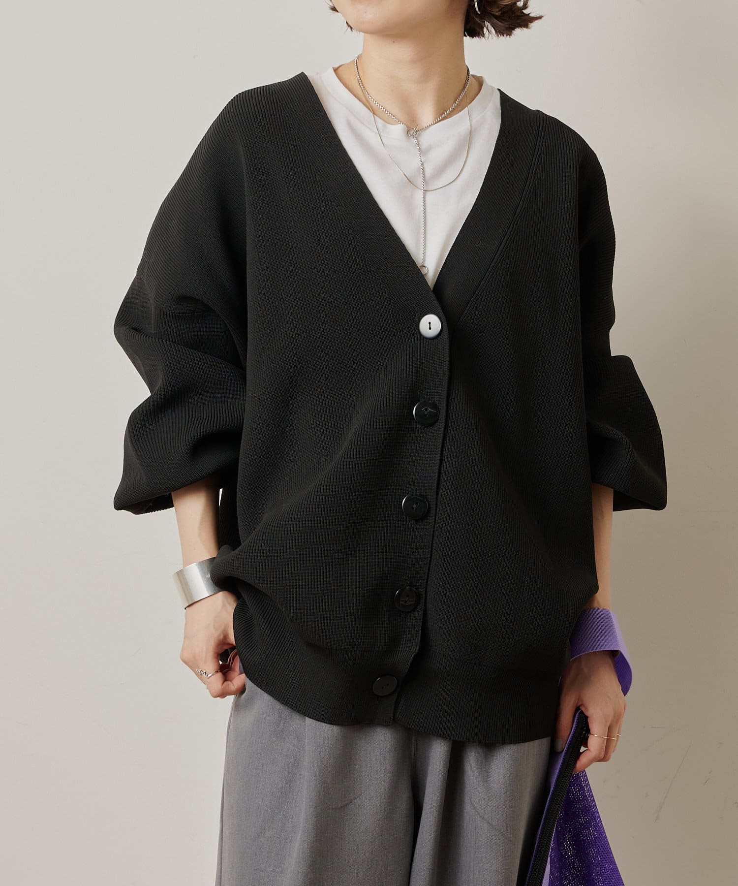 ボリューム感と程よいハリ感がポイントのポリエステル素材のニットカーデ