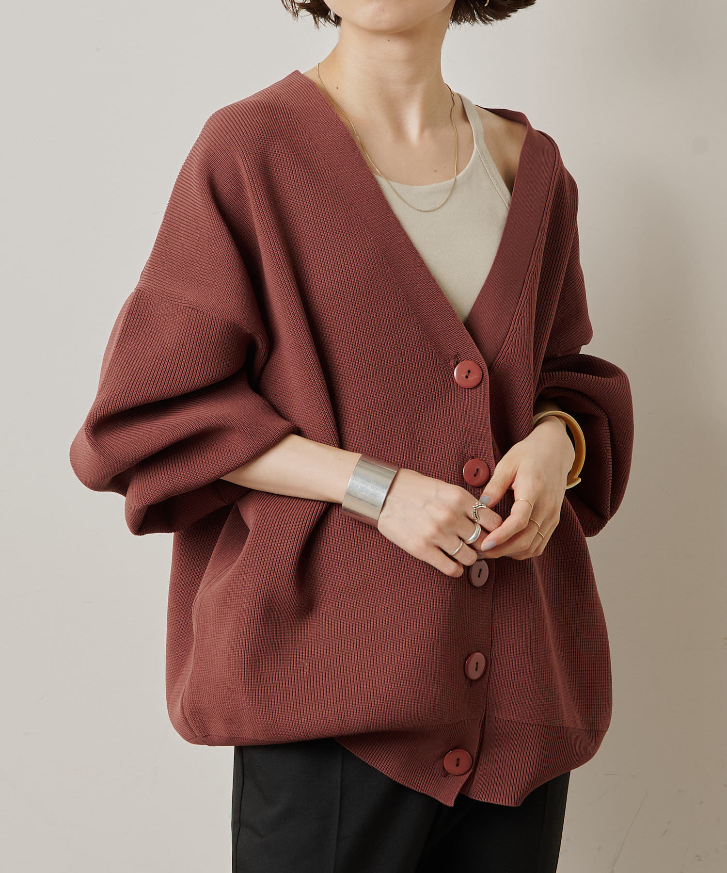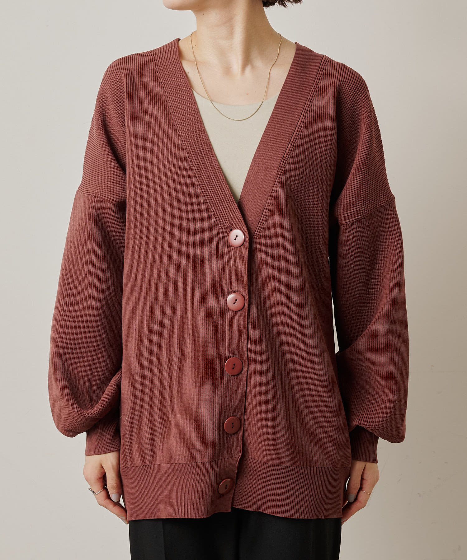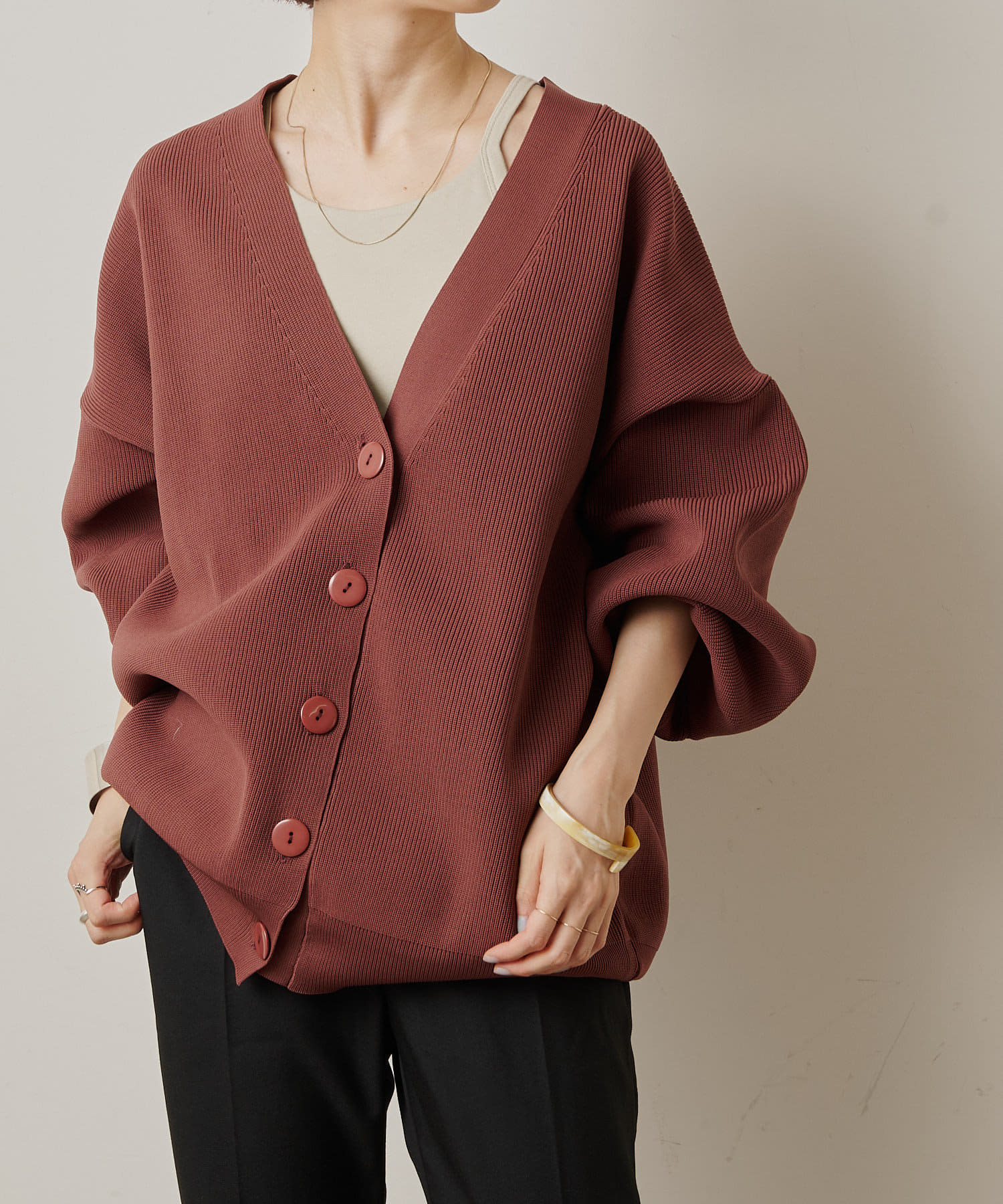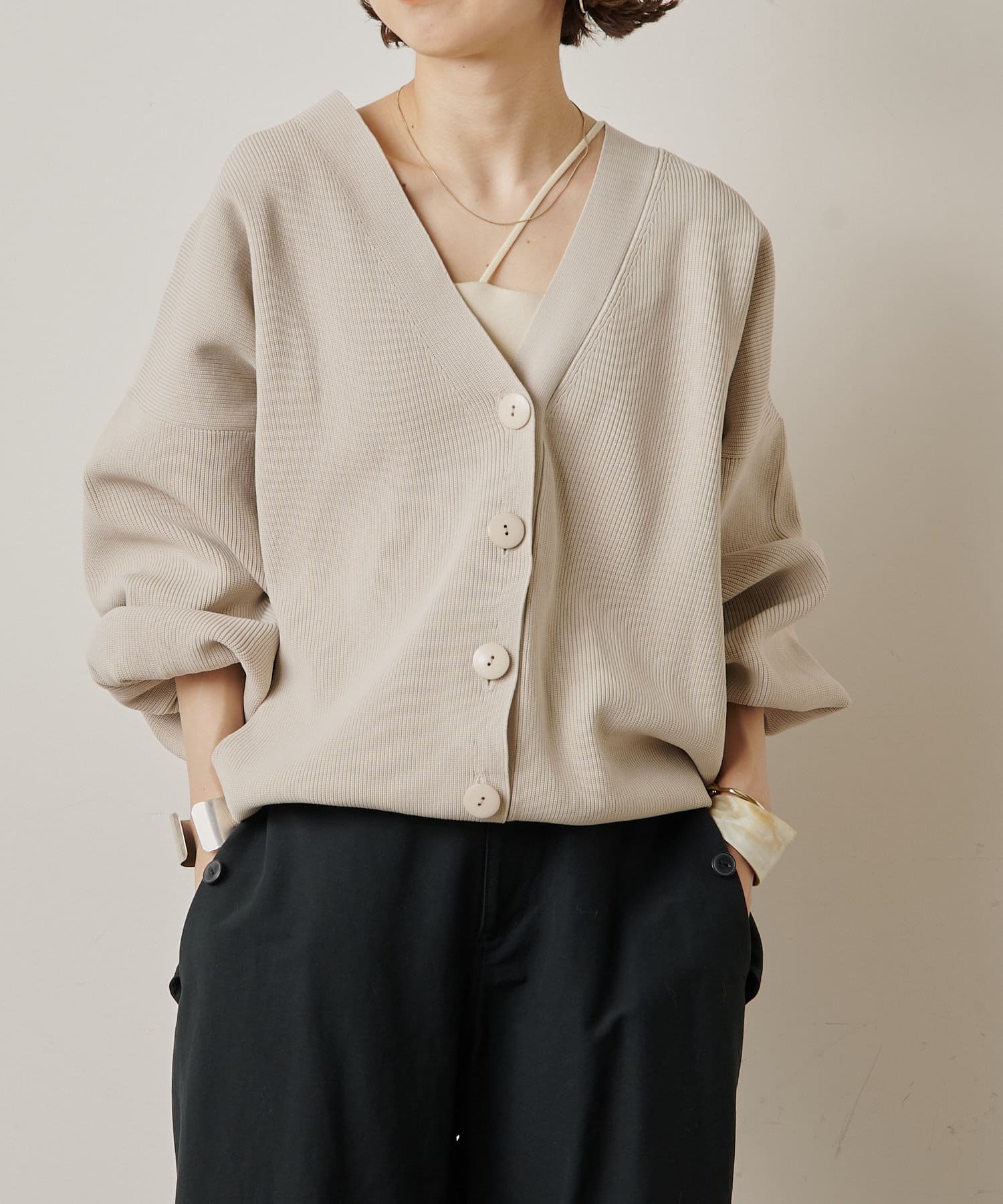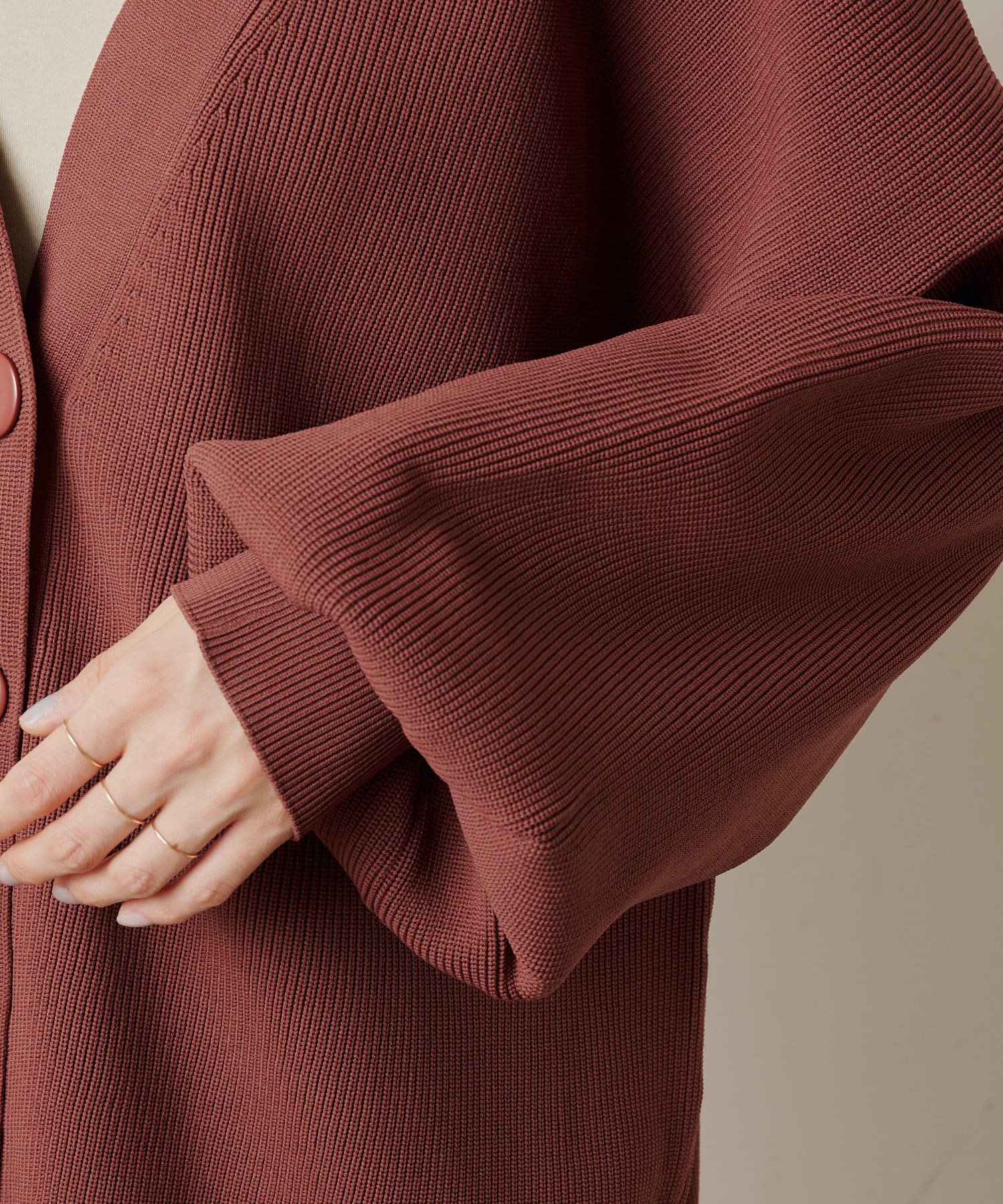 ボリューム感と程よいハリ感がポイントのポリエステル素材のニットカーデ