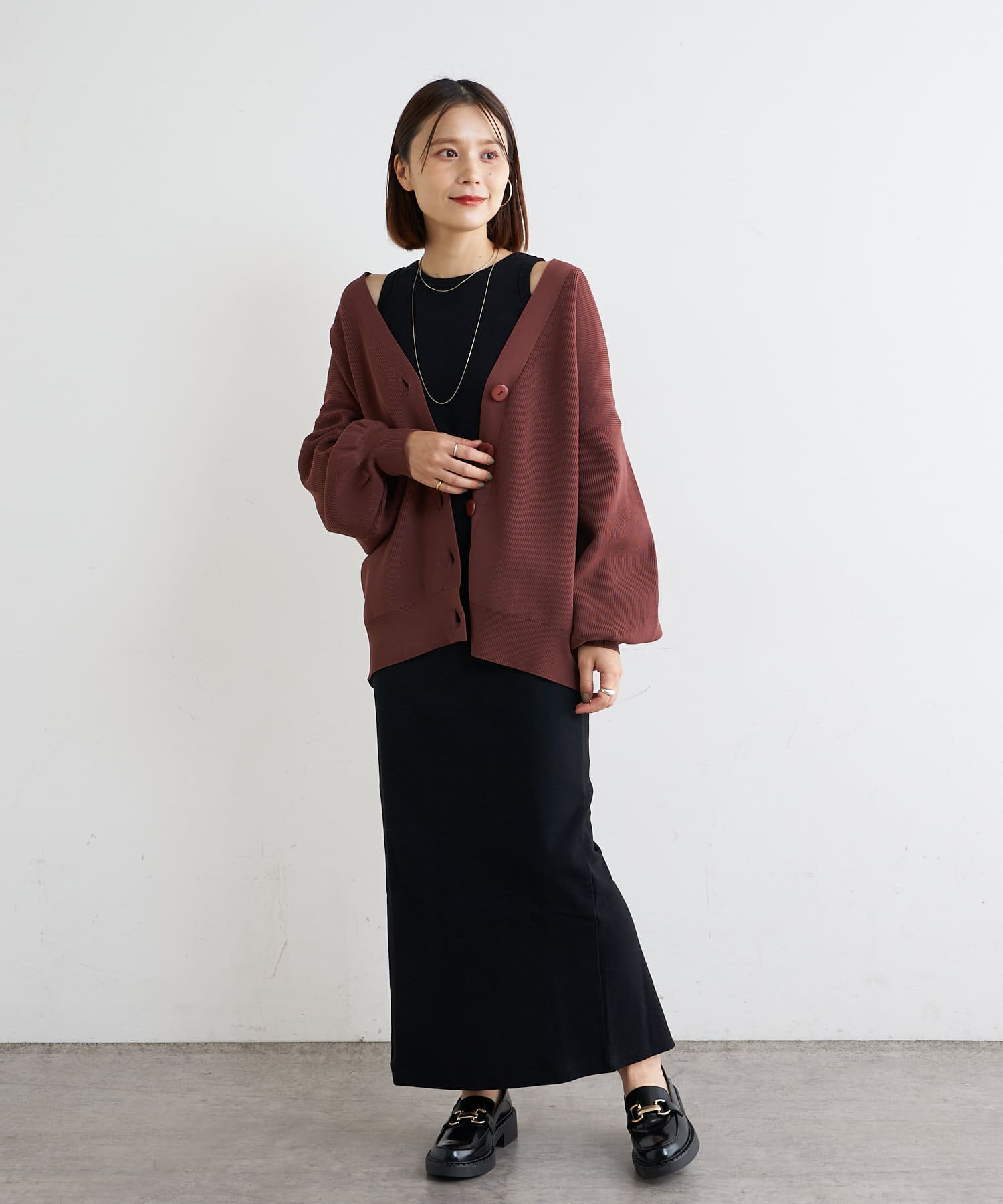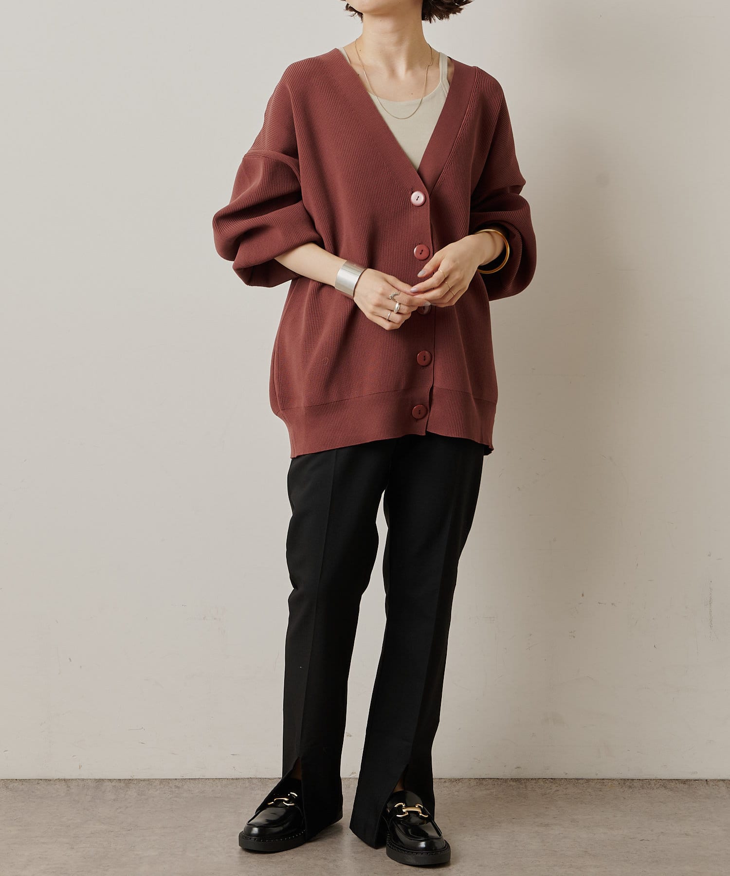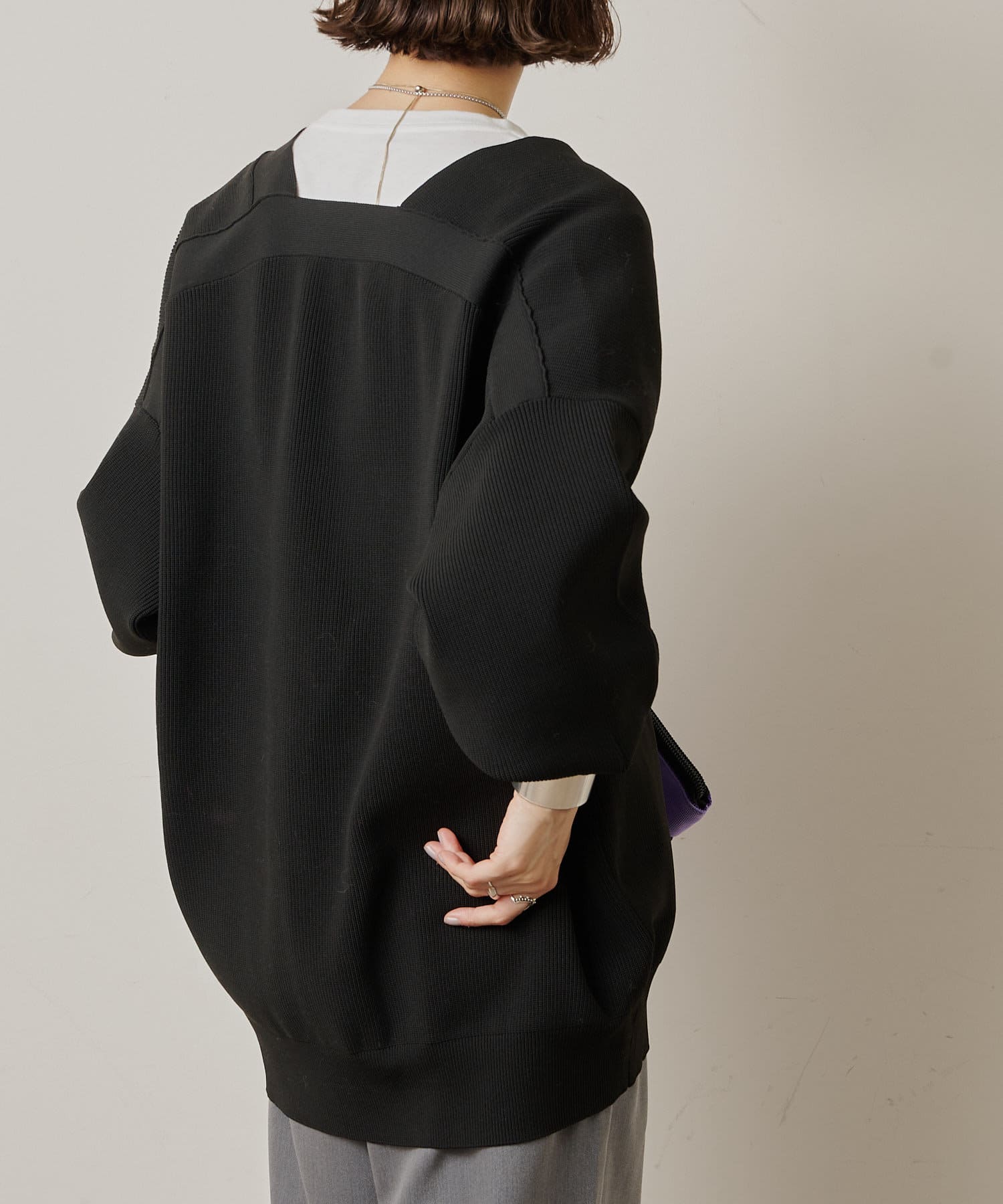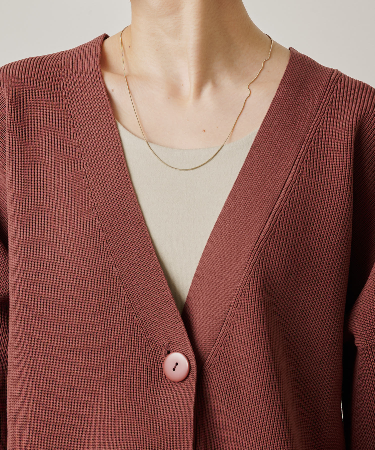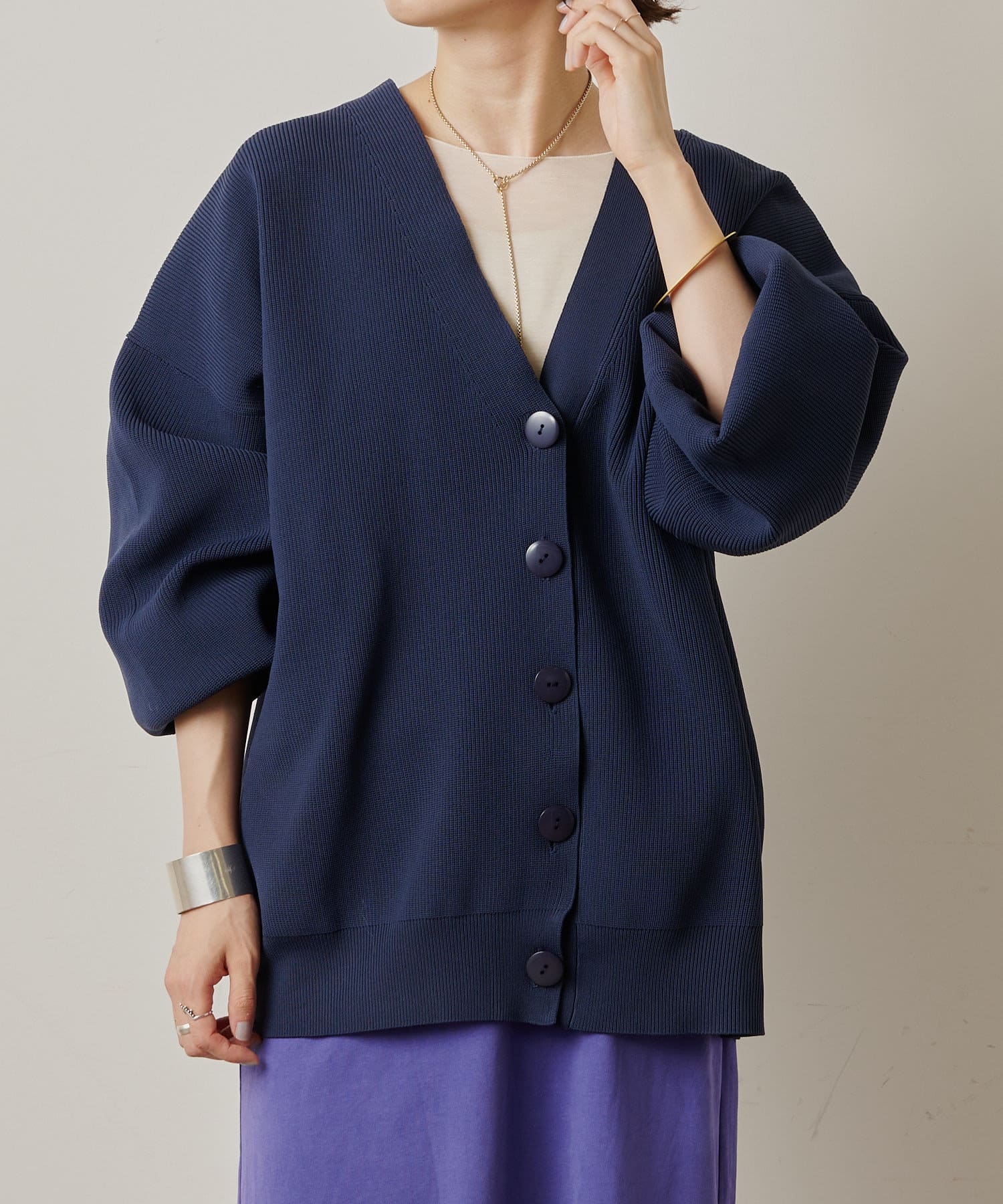 ボリューム感と程よいハリ感がポイントのポリエステル素材のニットカーデ