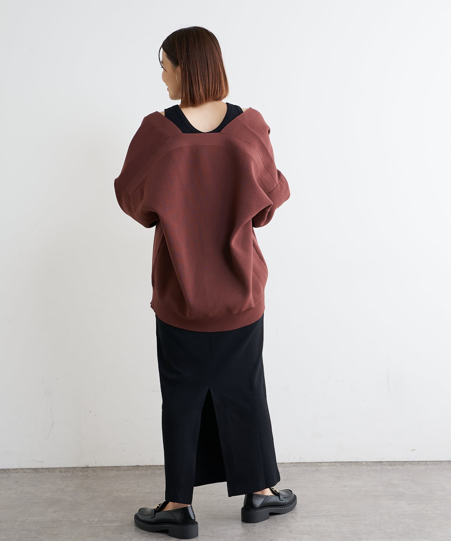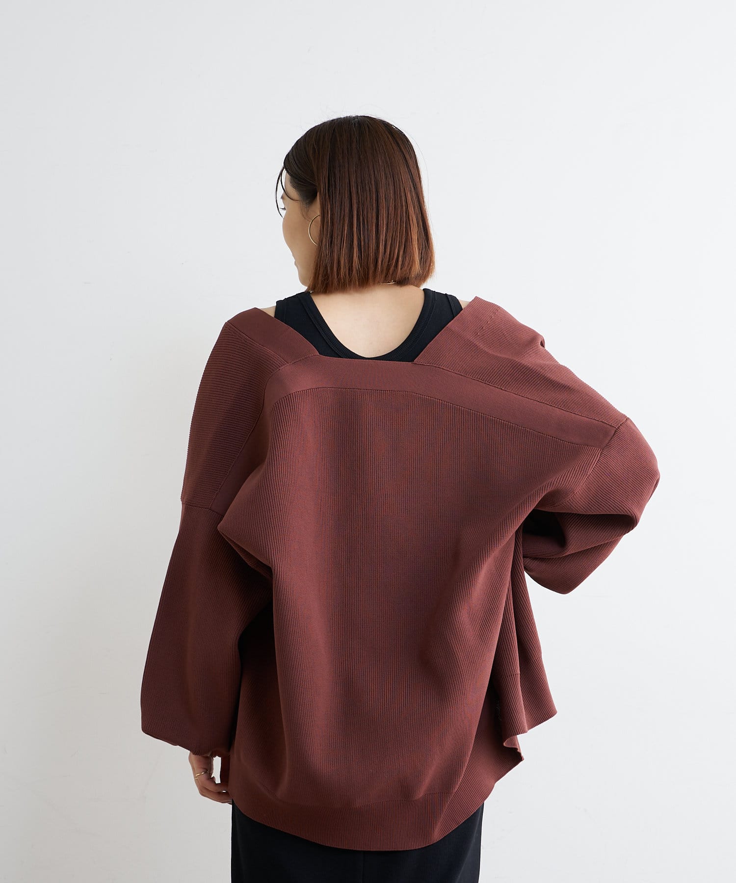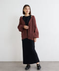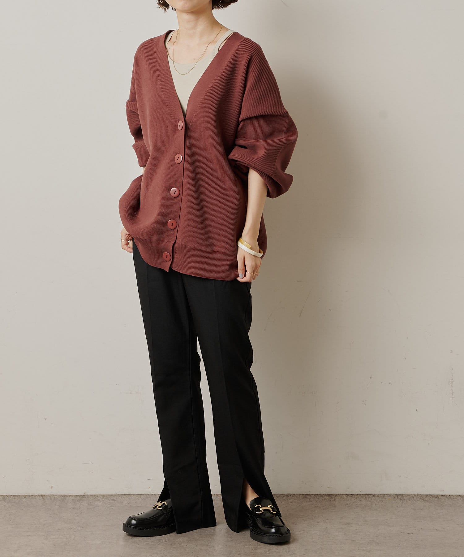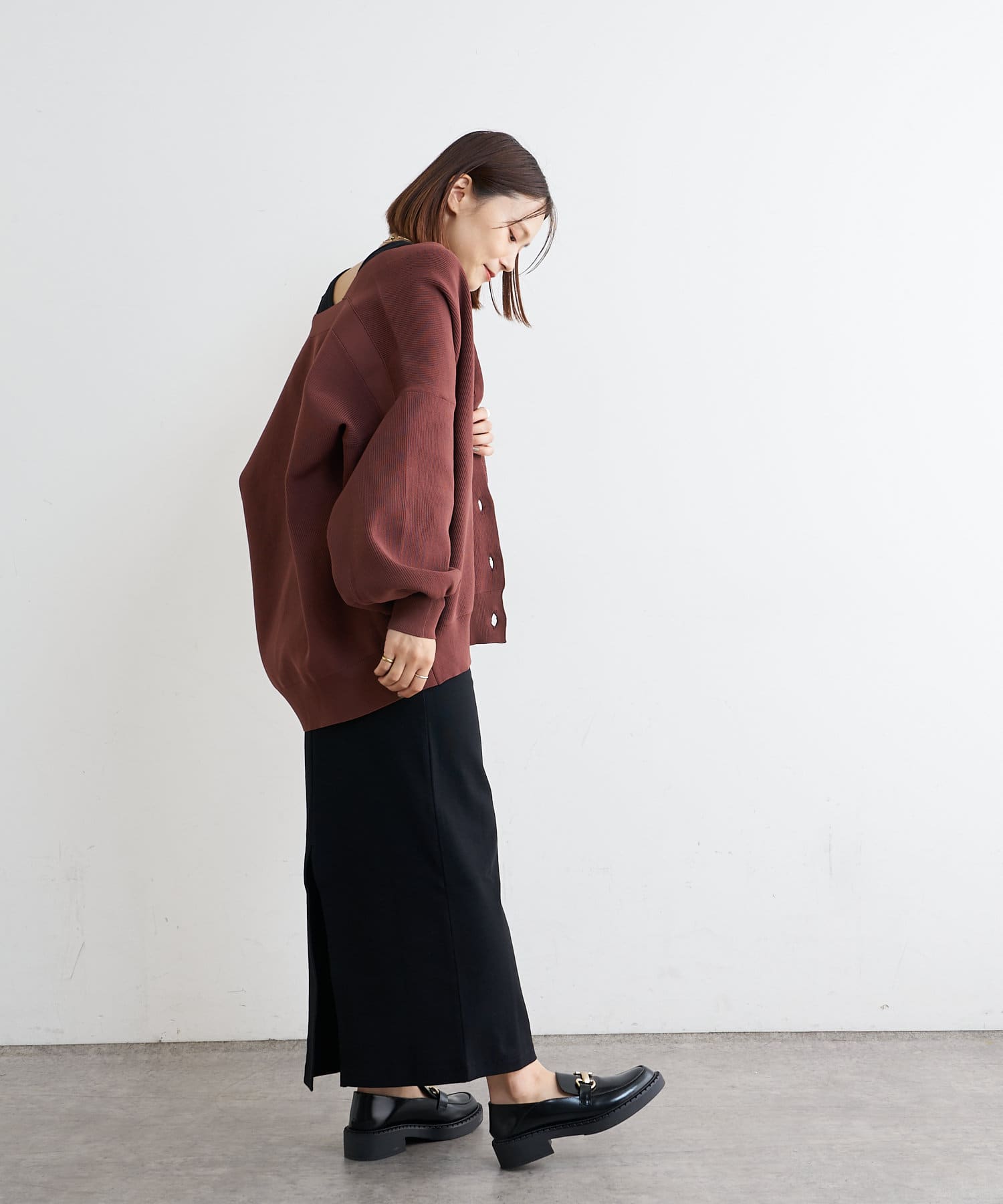 ボリューム感と程よいハリ感がポイントのポリエステル素材のニットカーデ