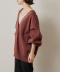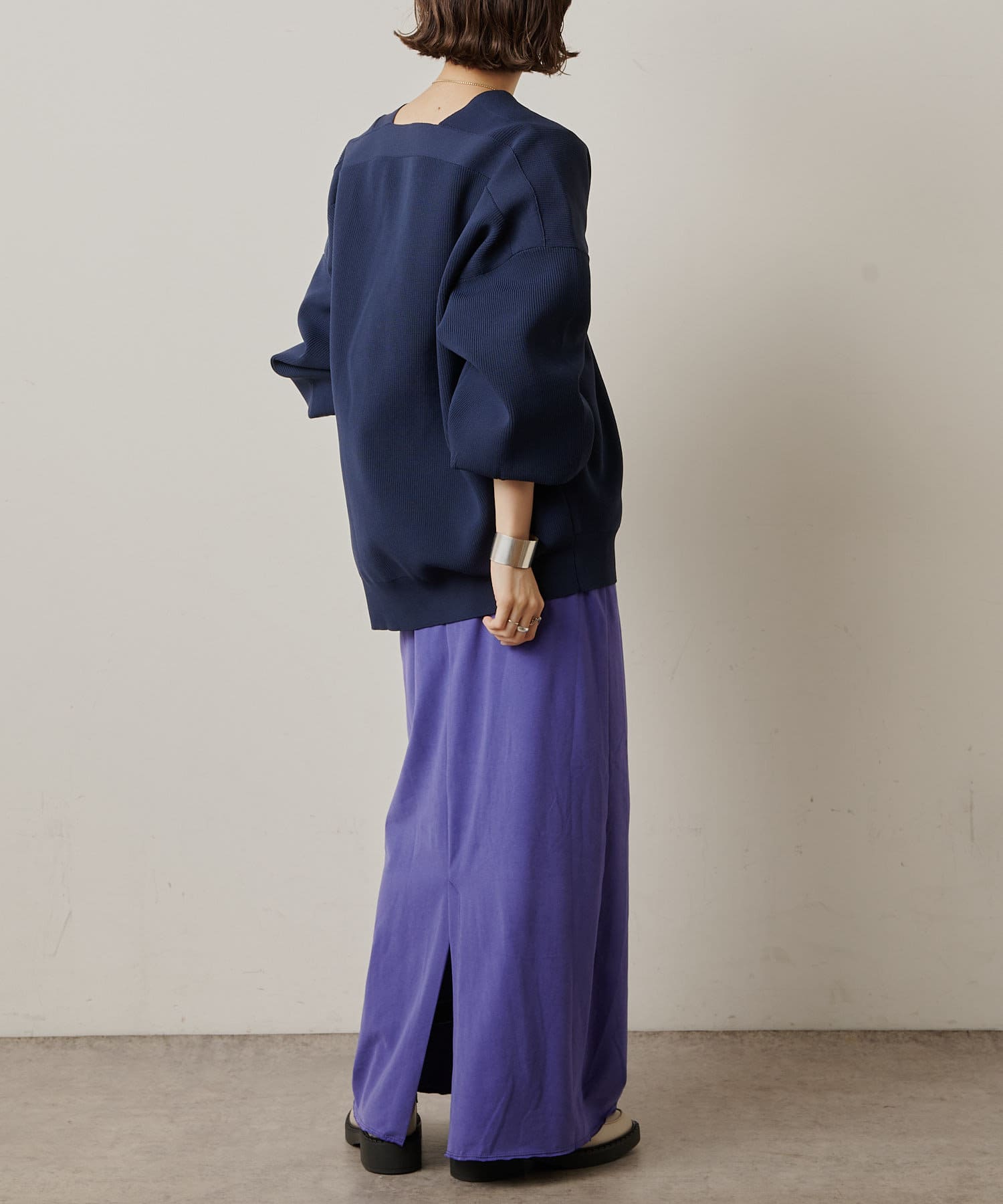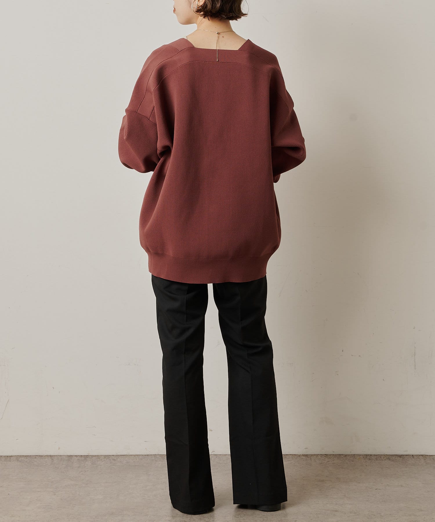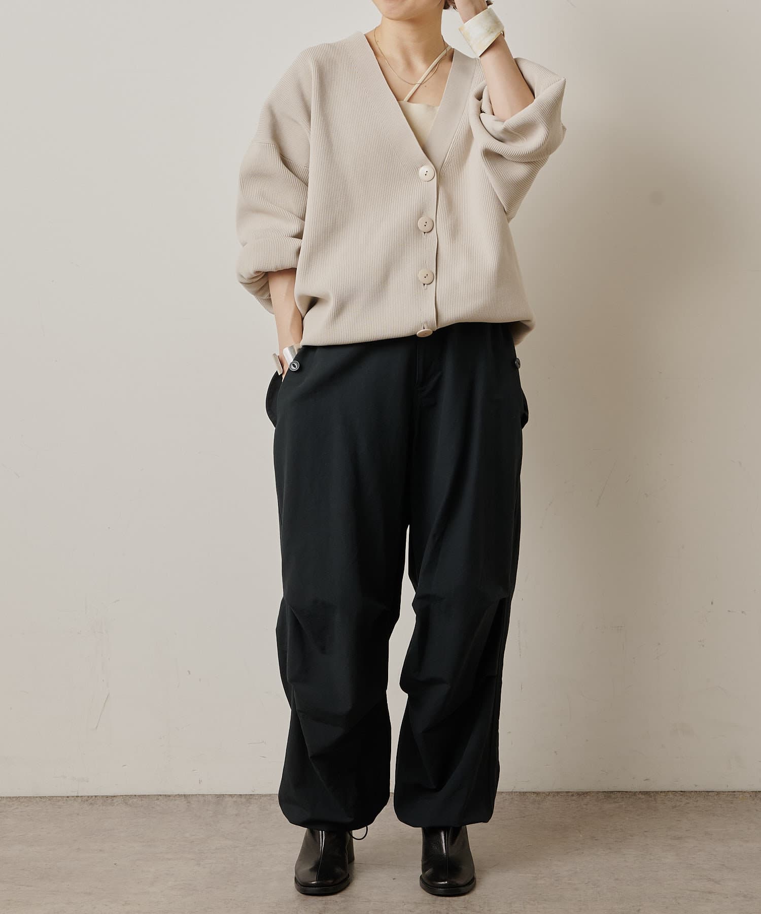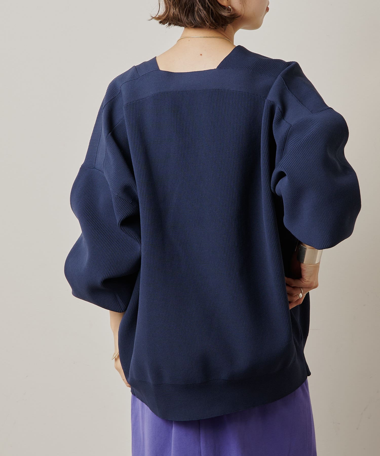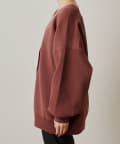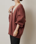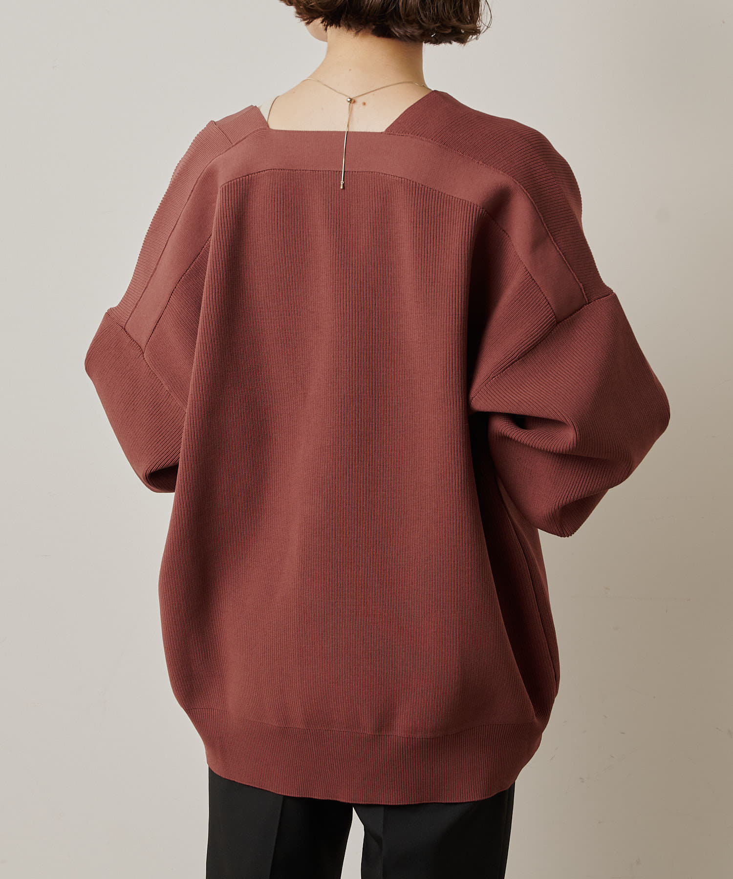 ボリューム感と程よいハリ感がポイントのポリエステル素材のニットカーデ