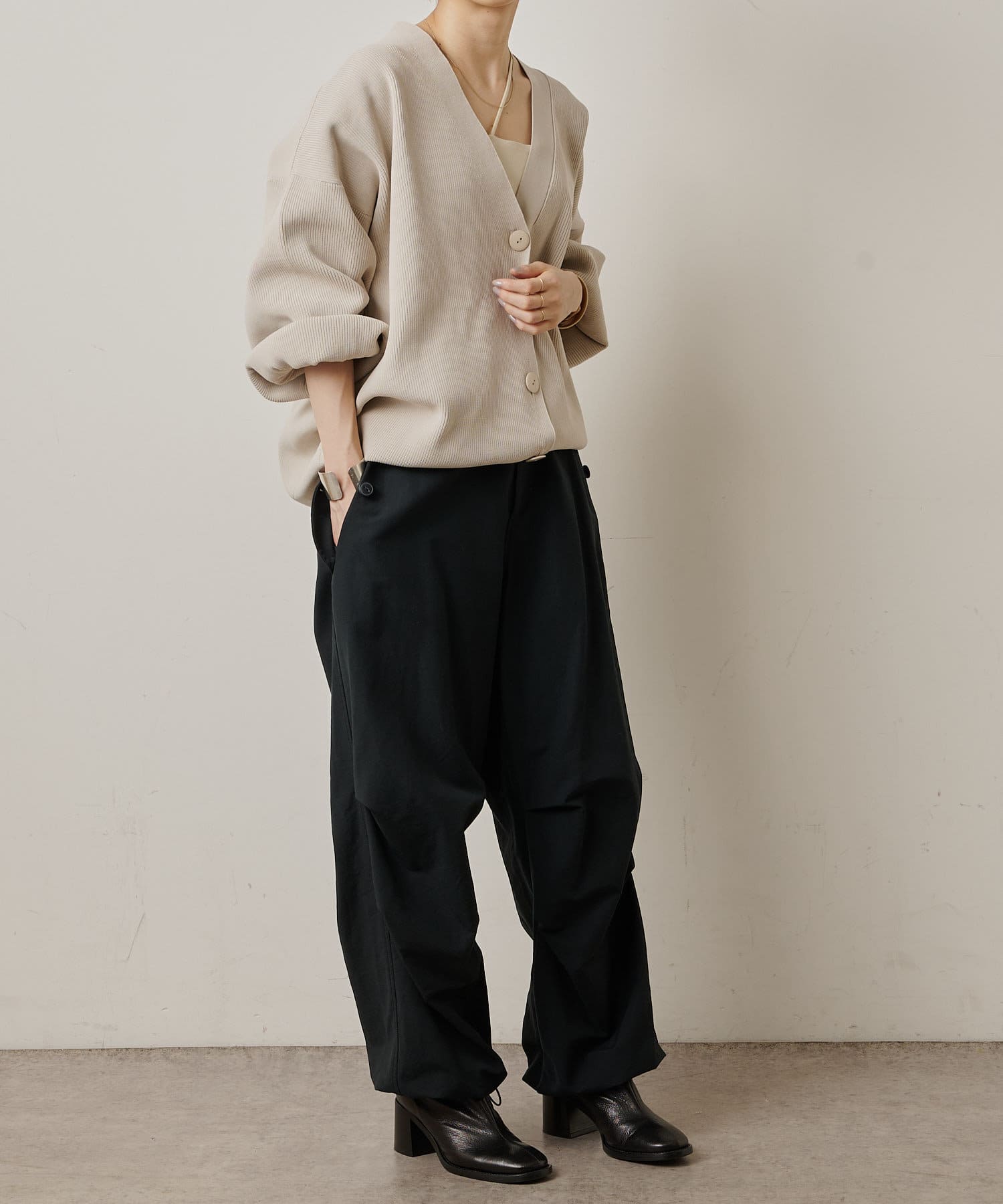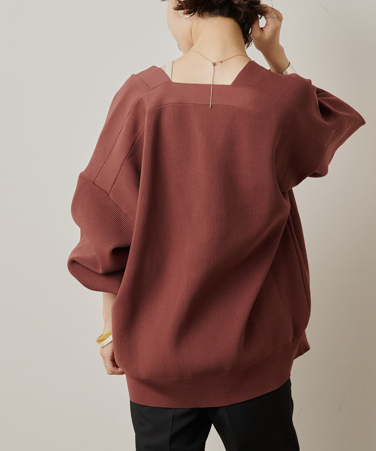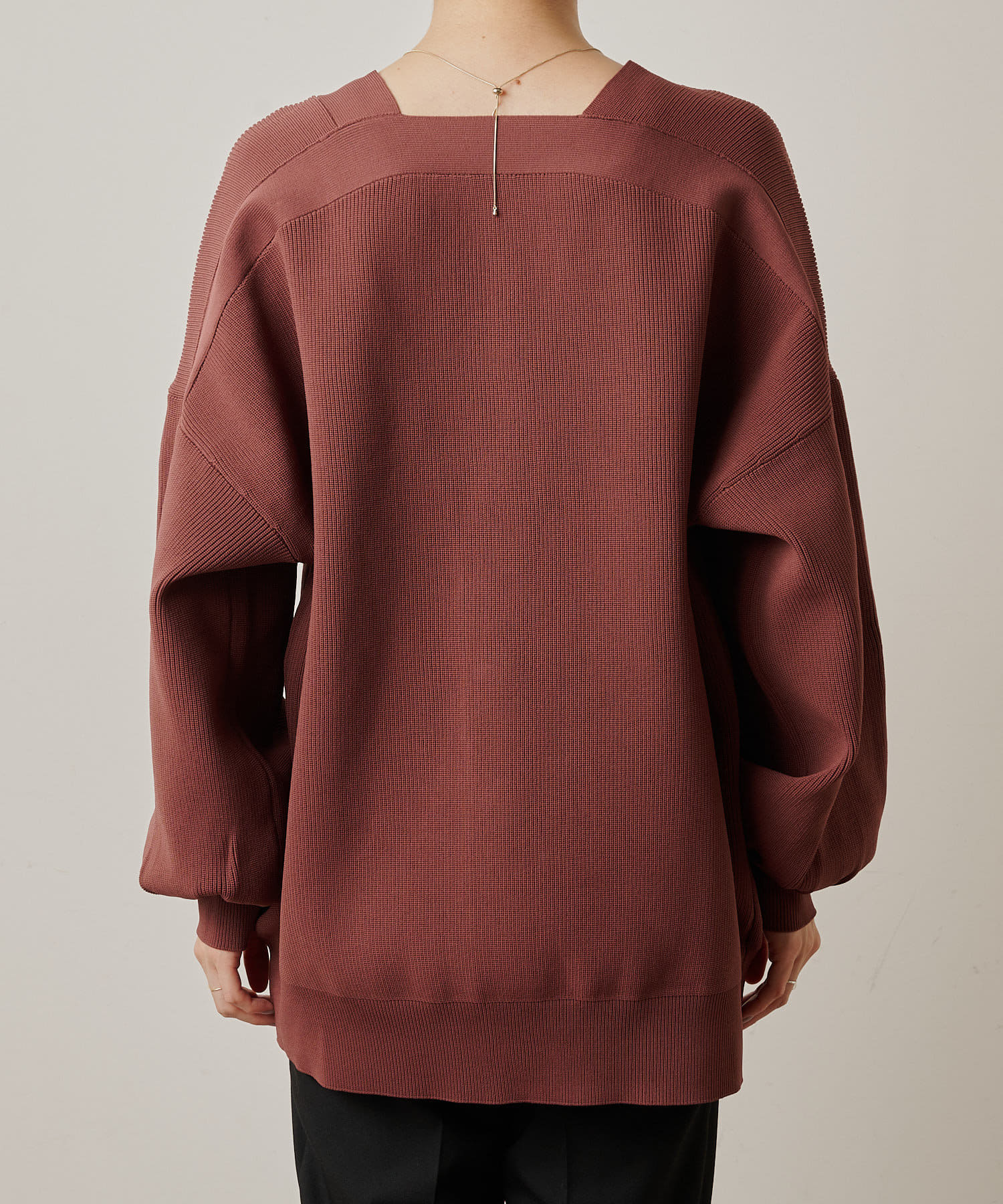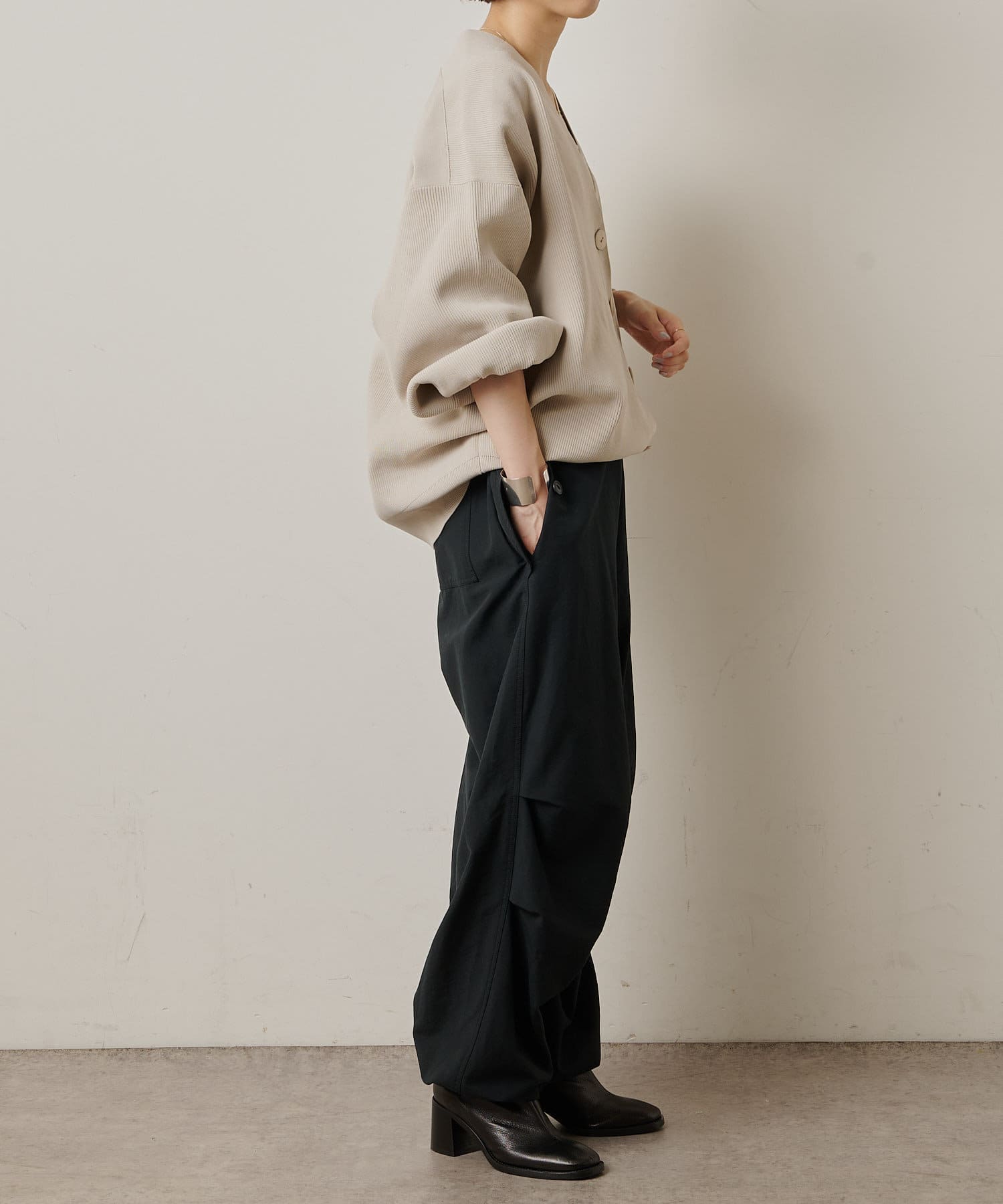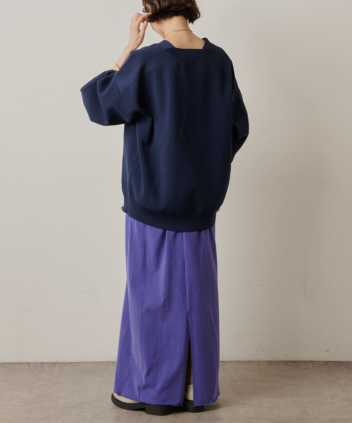 ボリューム感と程よいハリ感がポイントのポリエステル素材のニットカーデ