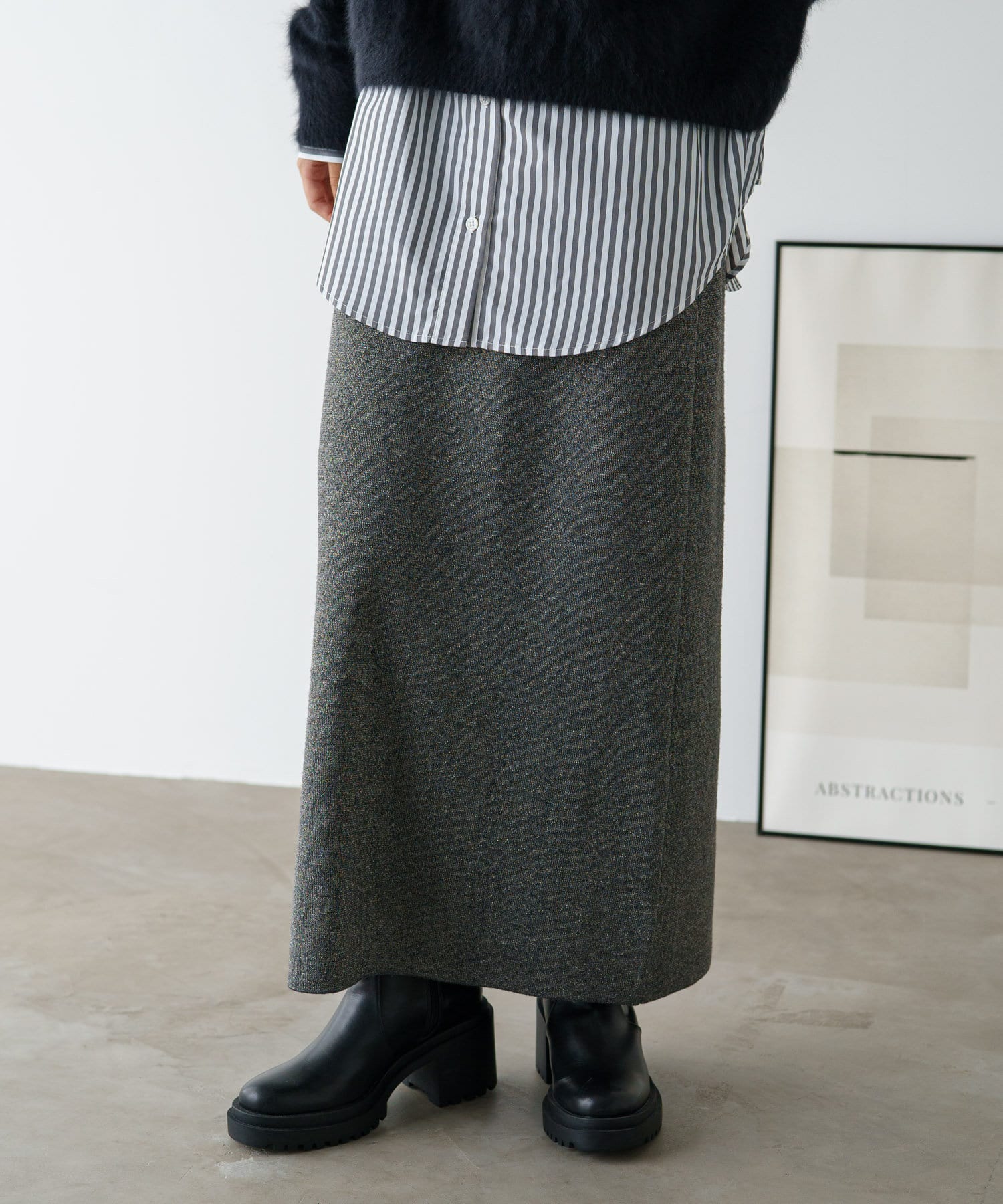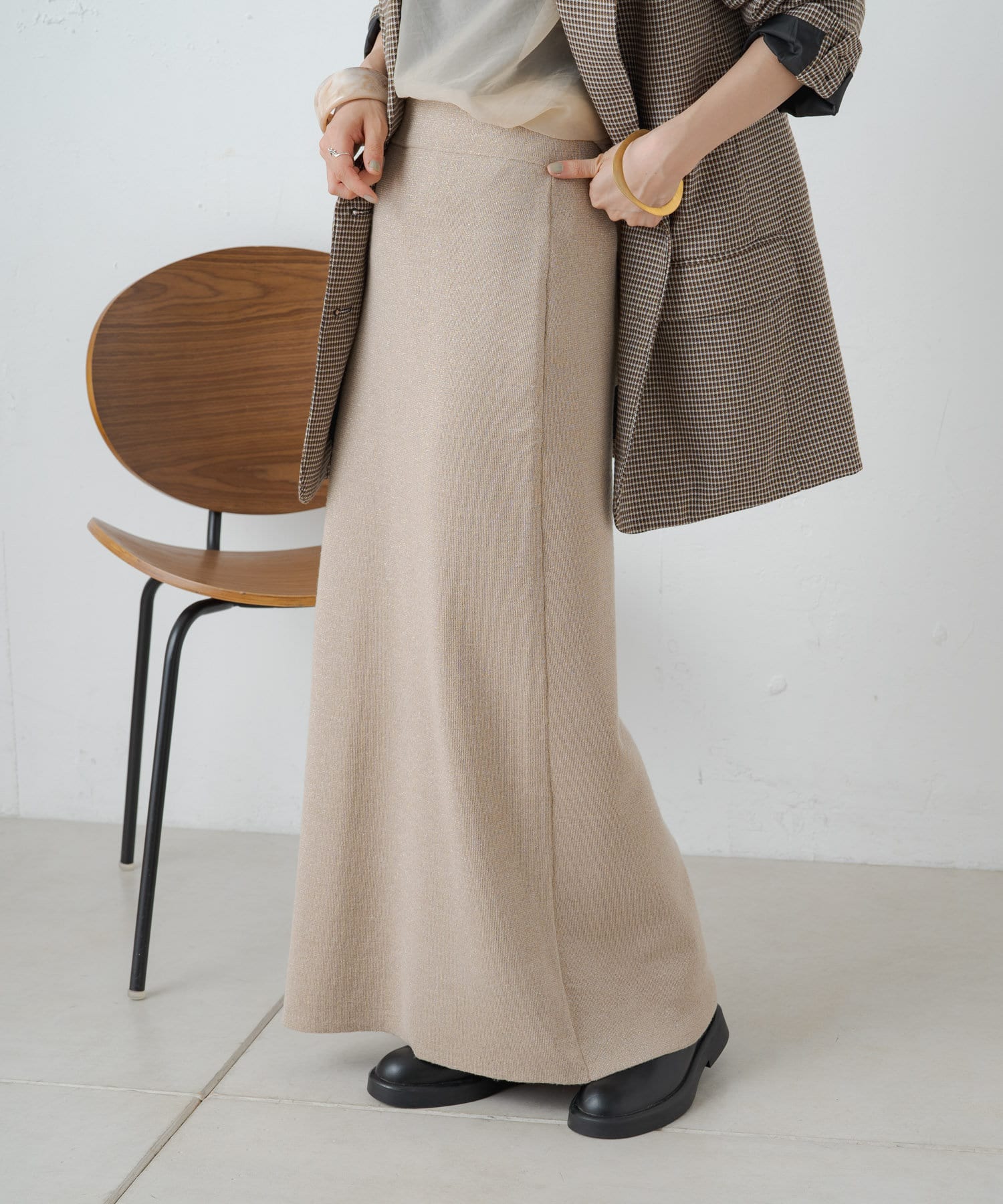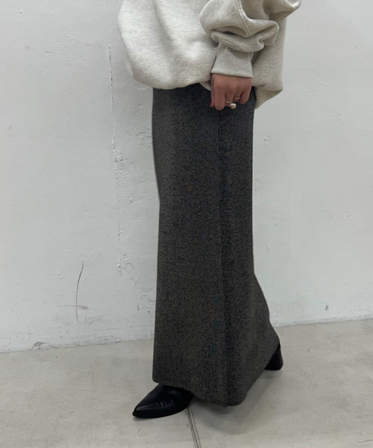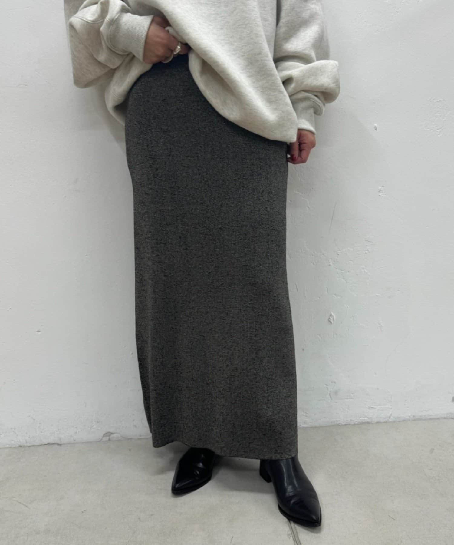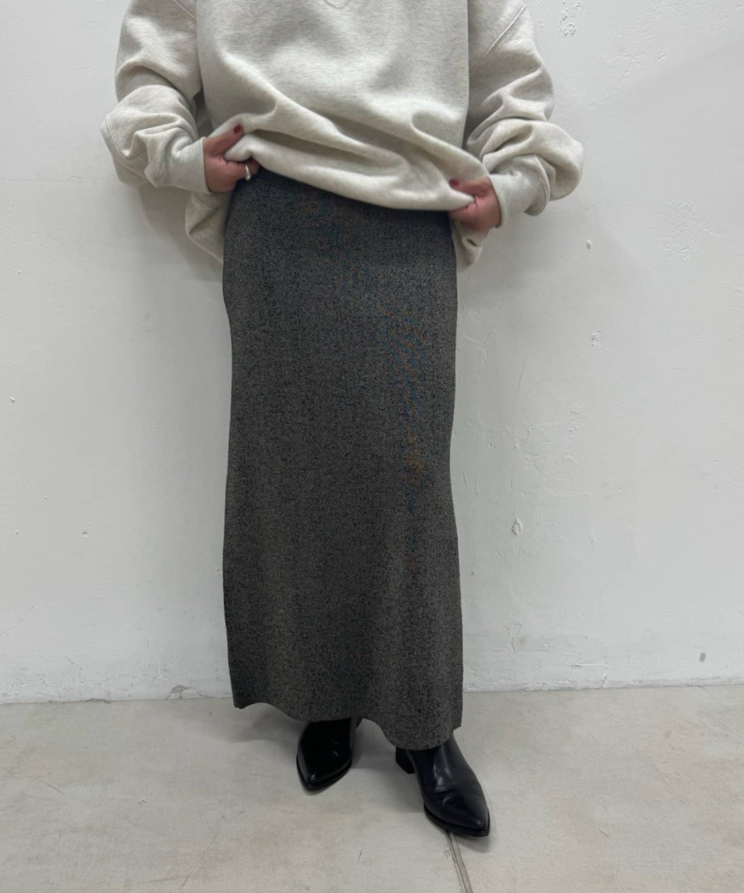 さりげないラメの生地がコーディネートのアクセントになるニットスカート
