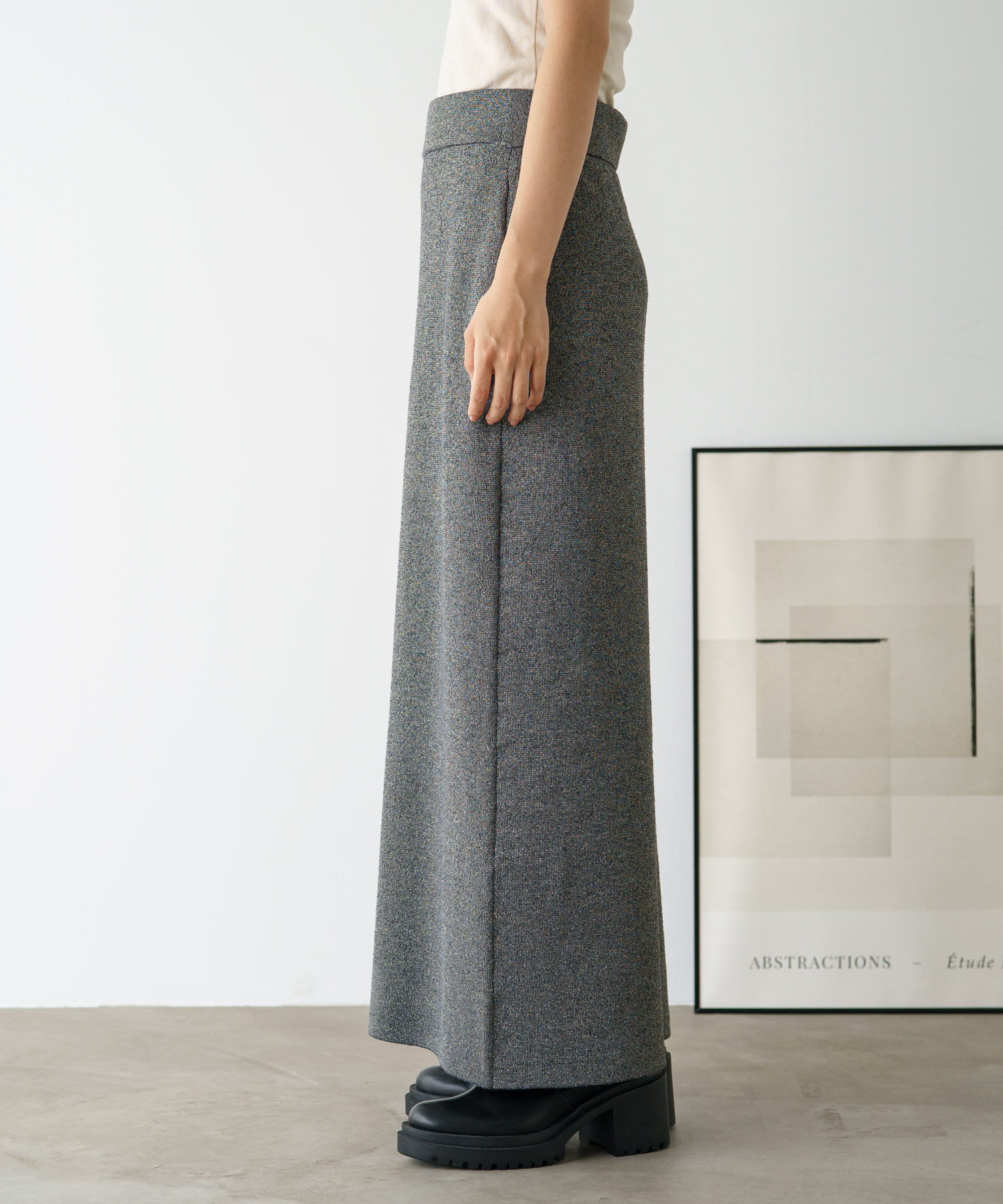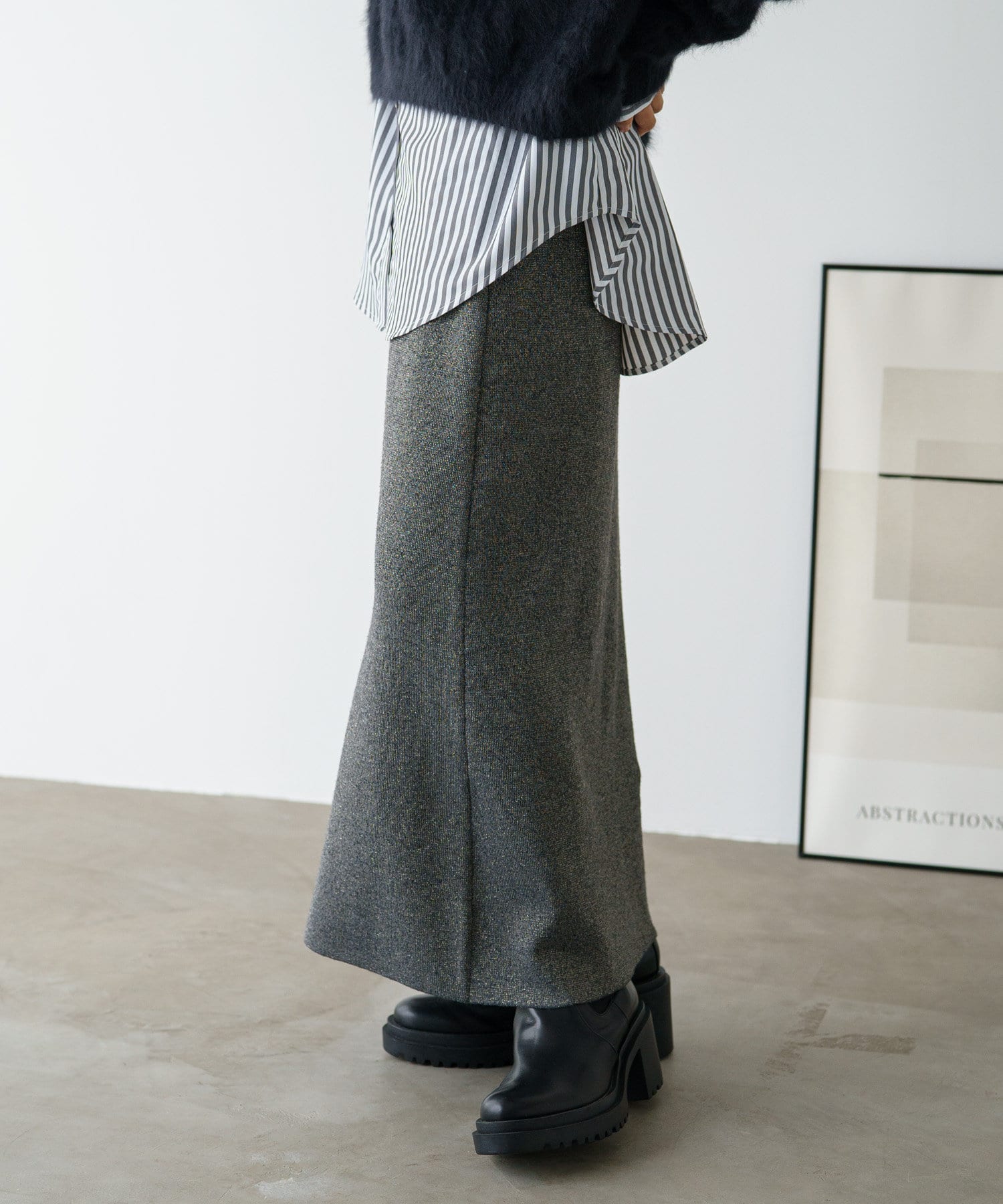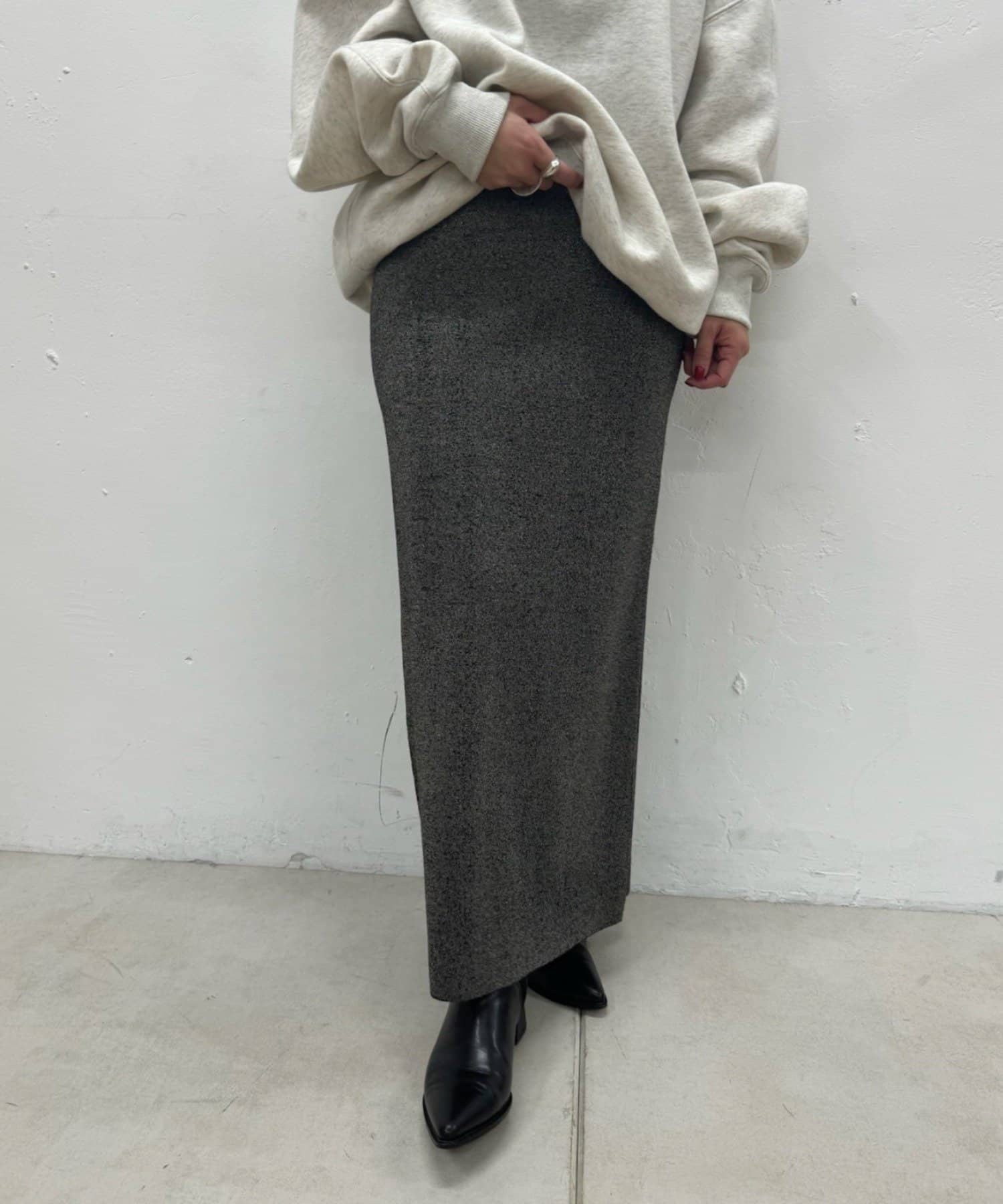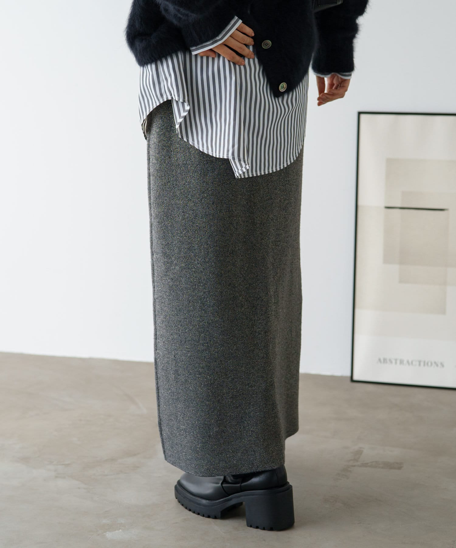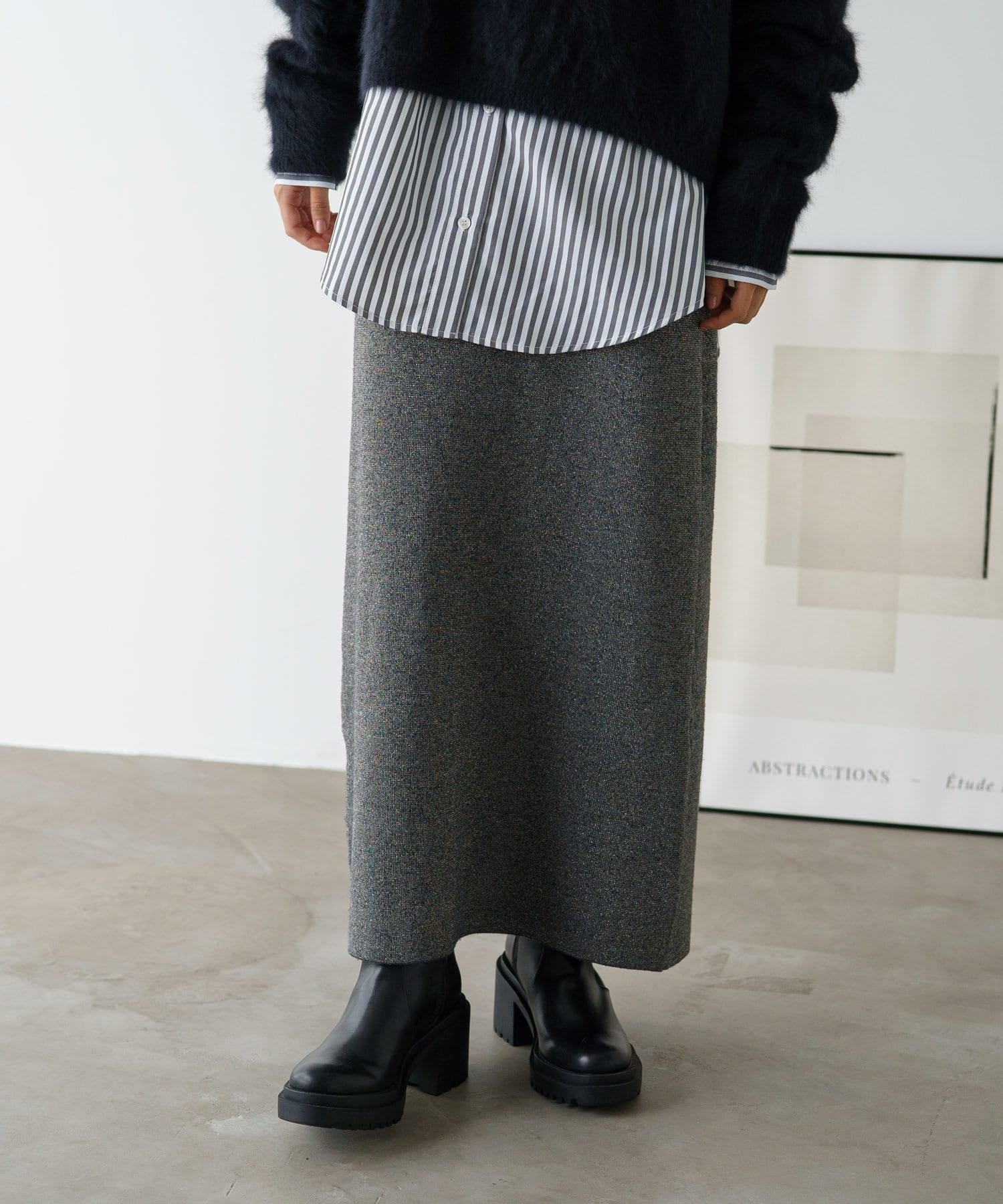 さりげないラメの生地がコーディネートのアクセントになるニットスカート
