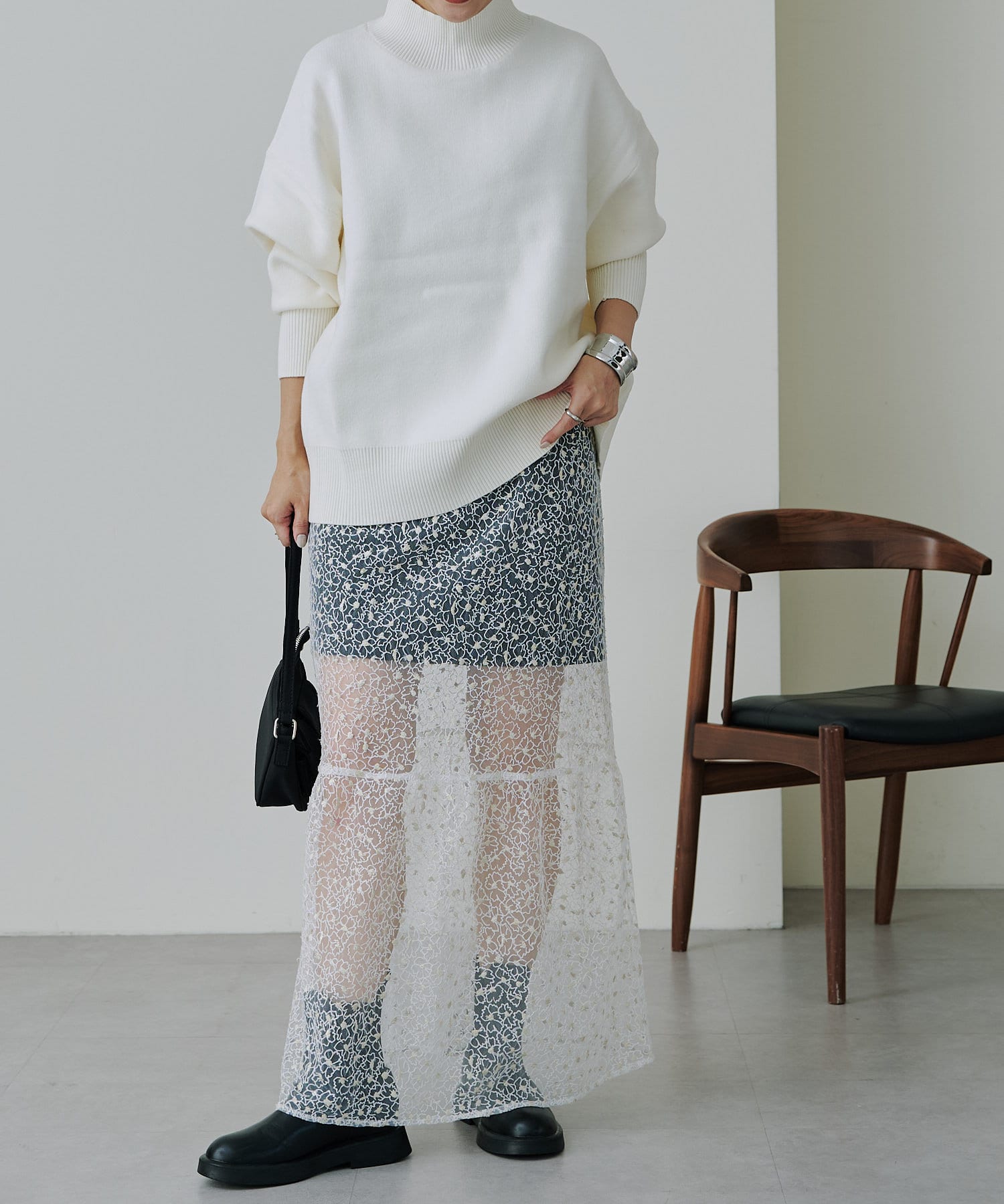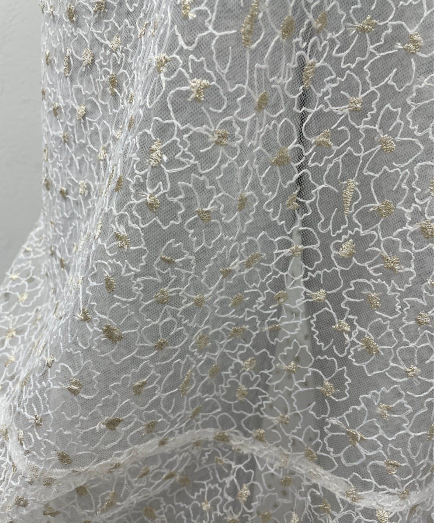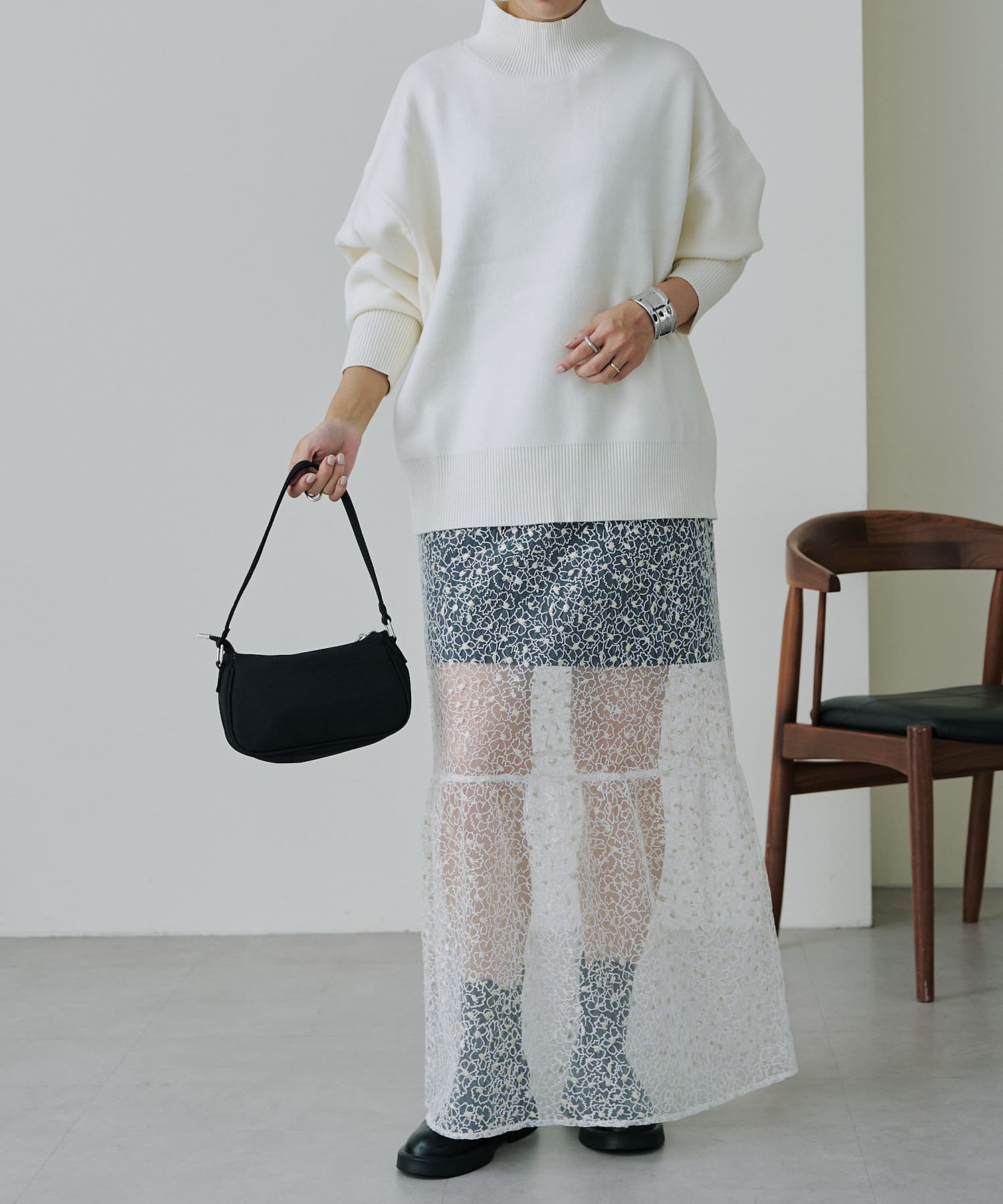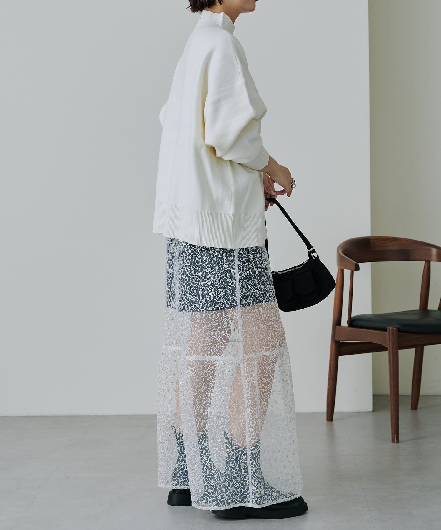 ・コーディネートのポイントになるレース刺繡柄が映える1枚。
