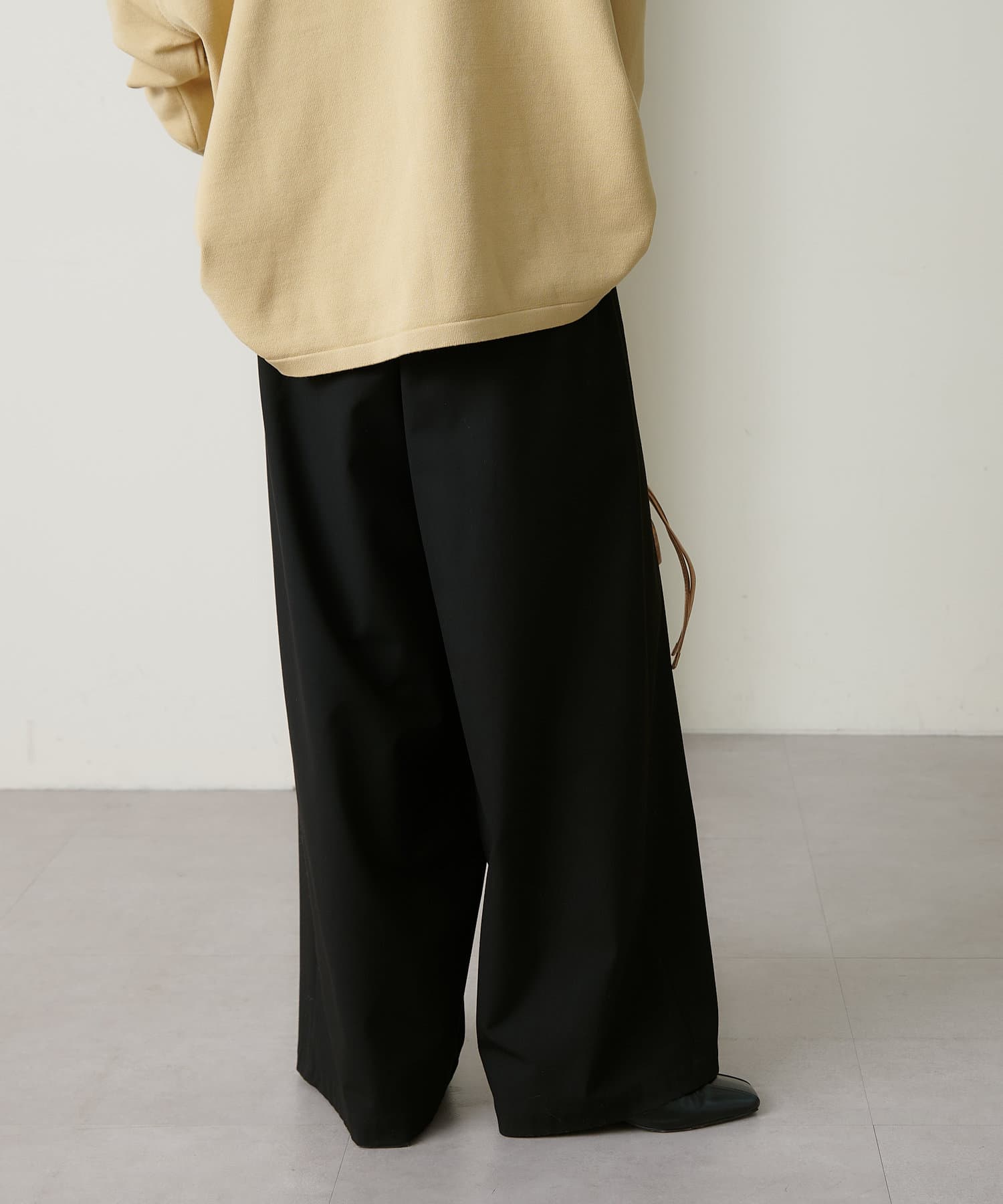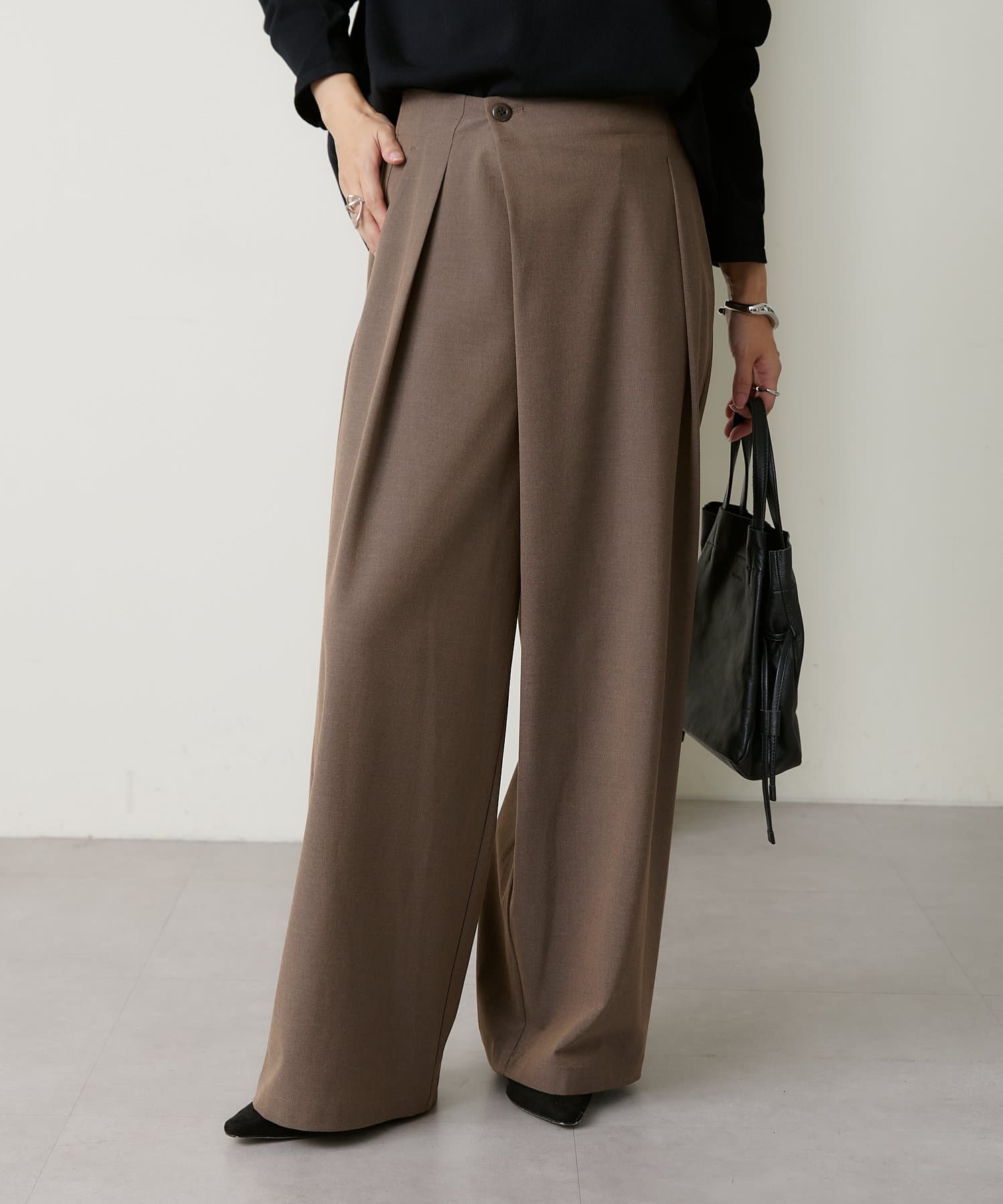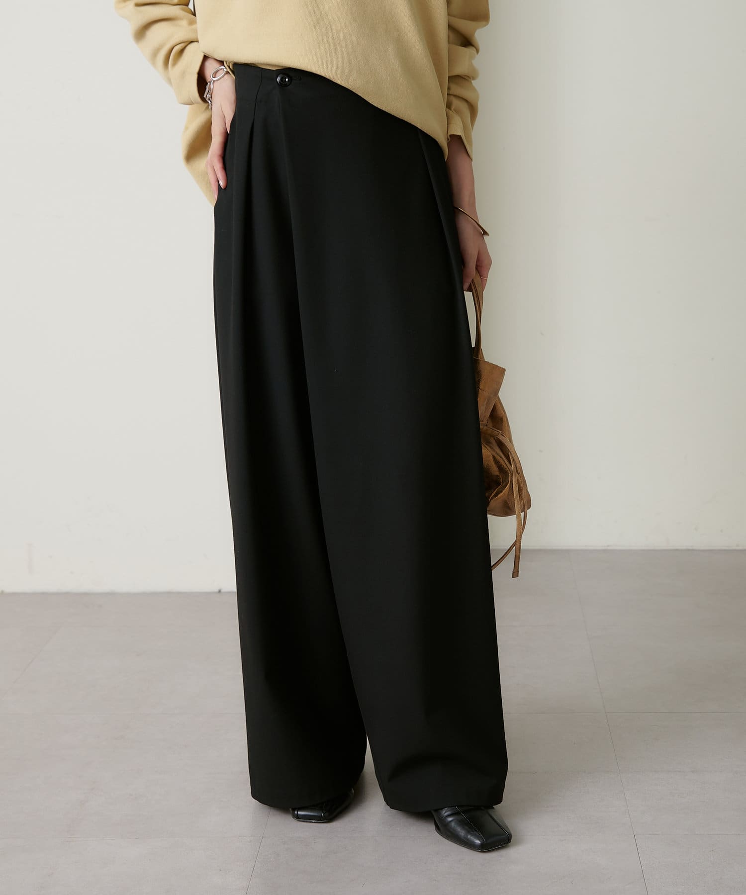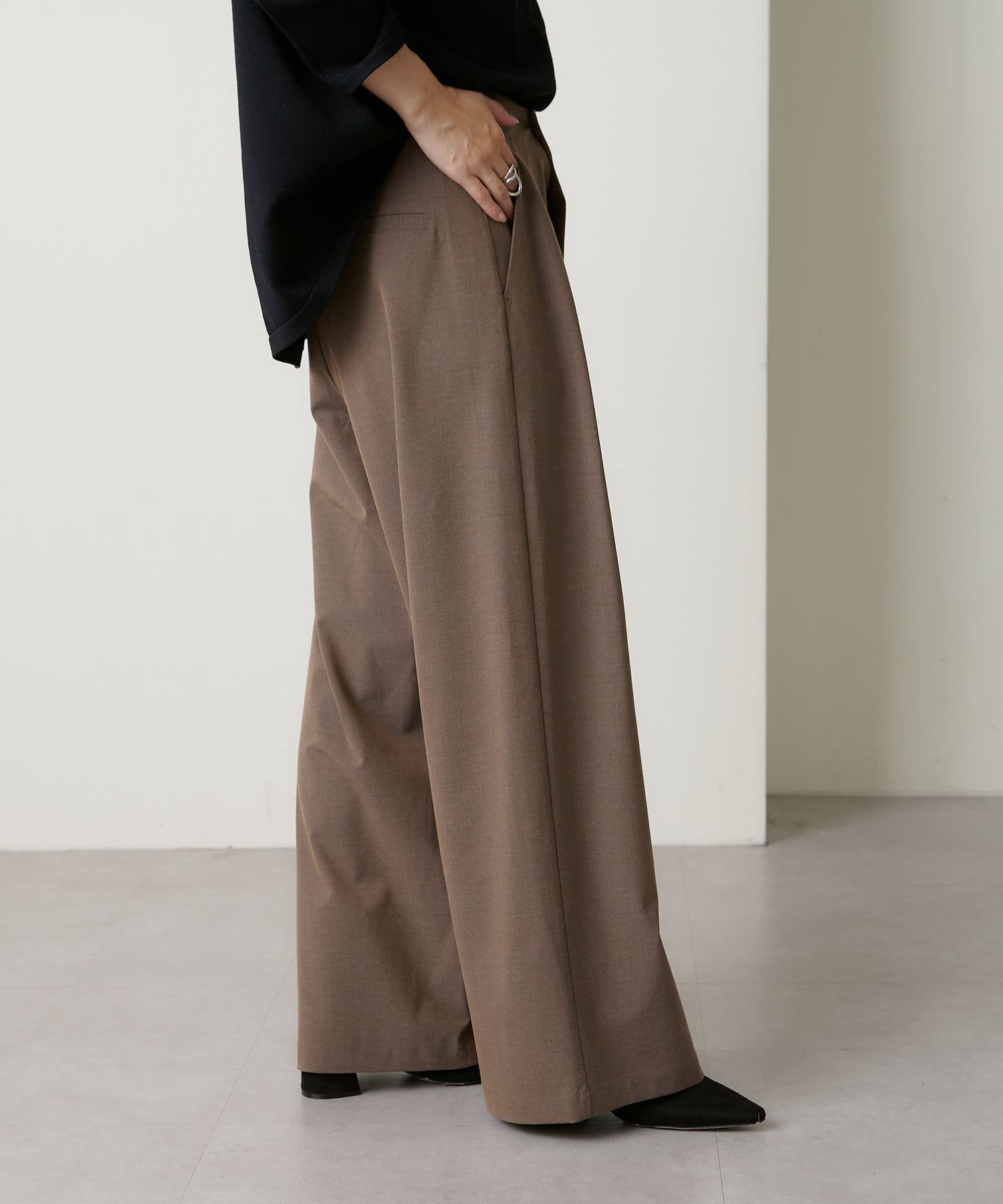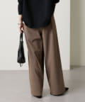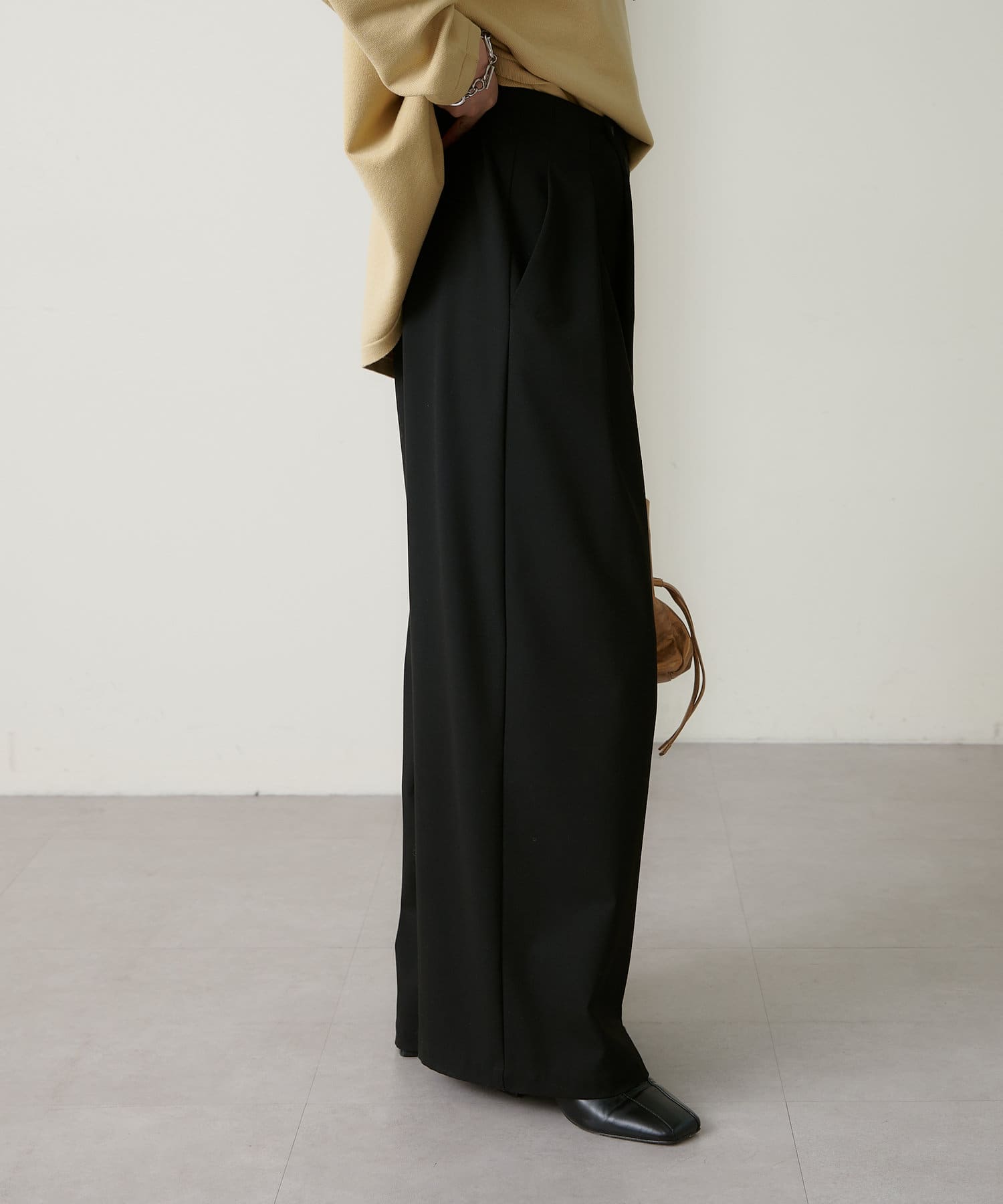 すとんと落ちるシルエットとタックの入ったウエストデザインですっきり一枚で決まるパンツ