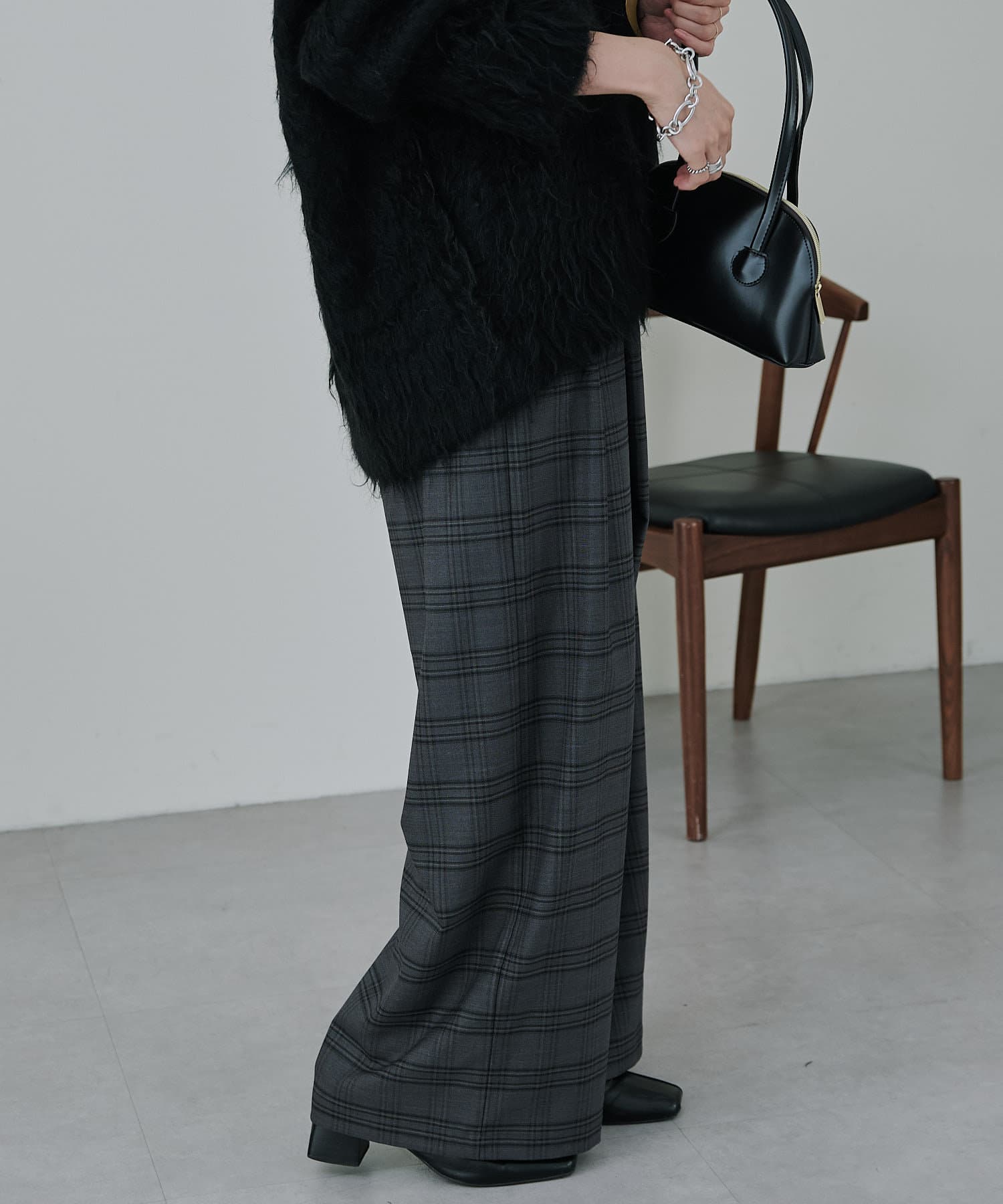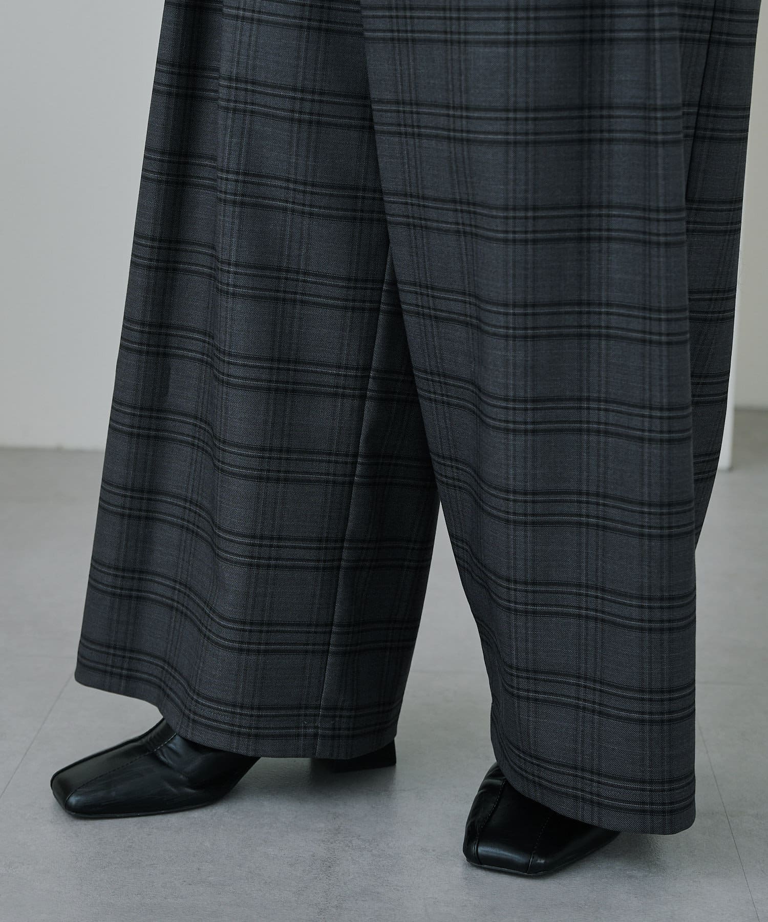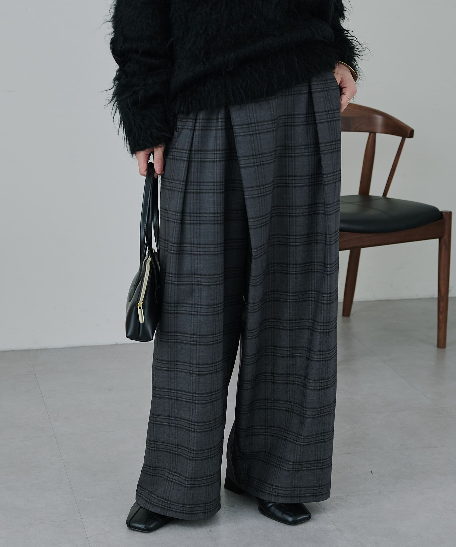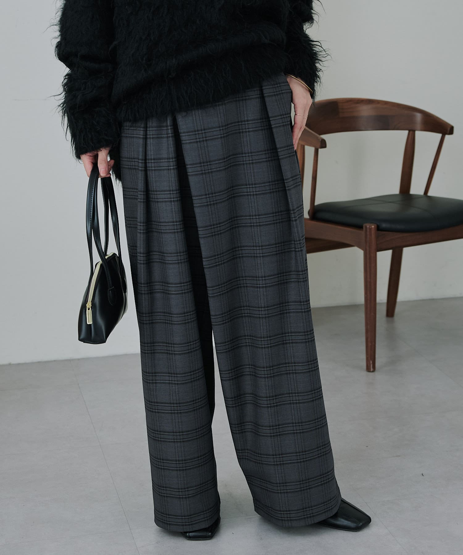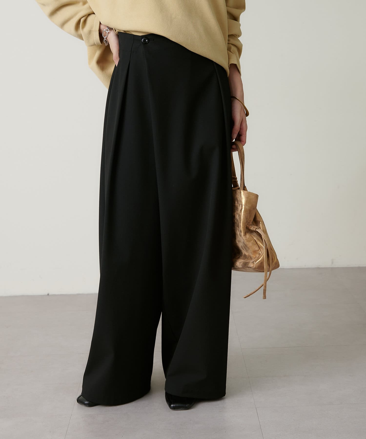 すとんと落ちるシルエットとタックの入ったウエストデザインですっきり一枚で決まるパンツ