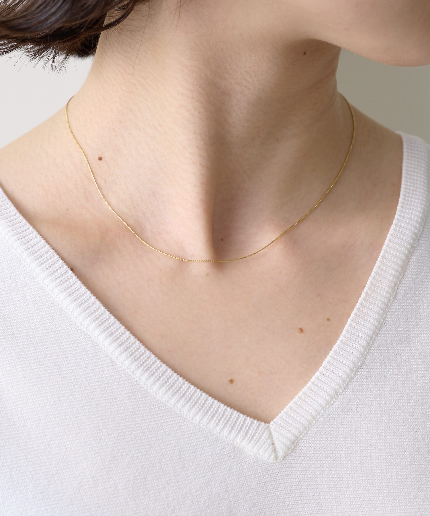 細いネックレスでとても上品に見えます。