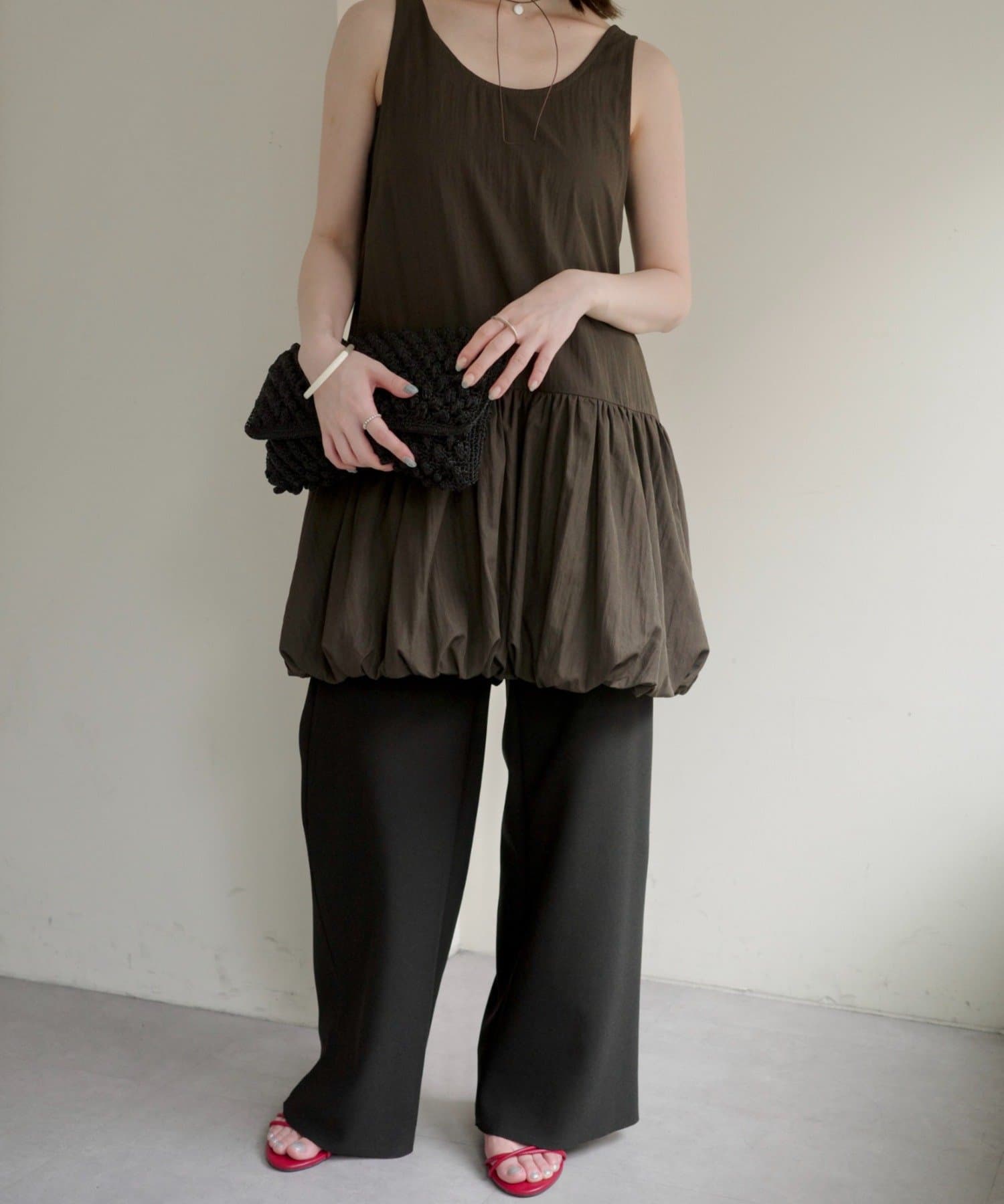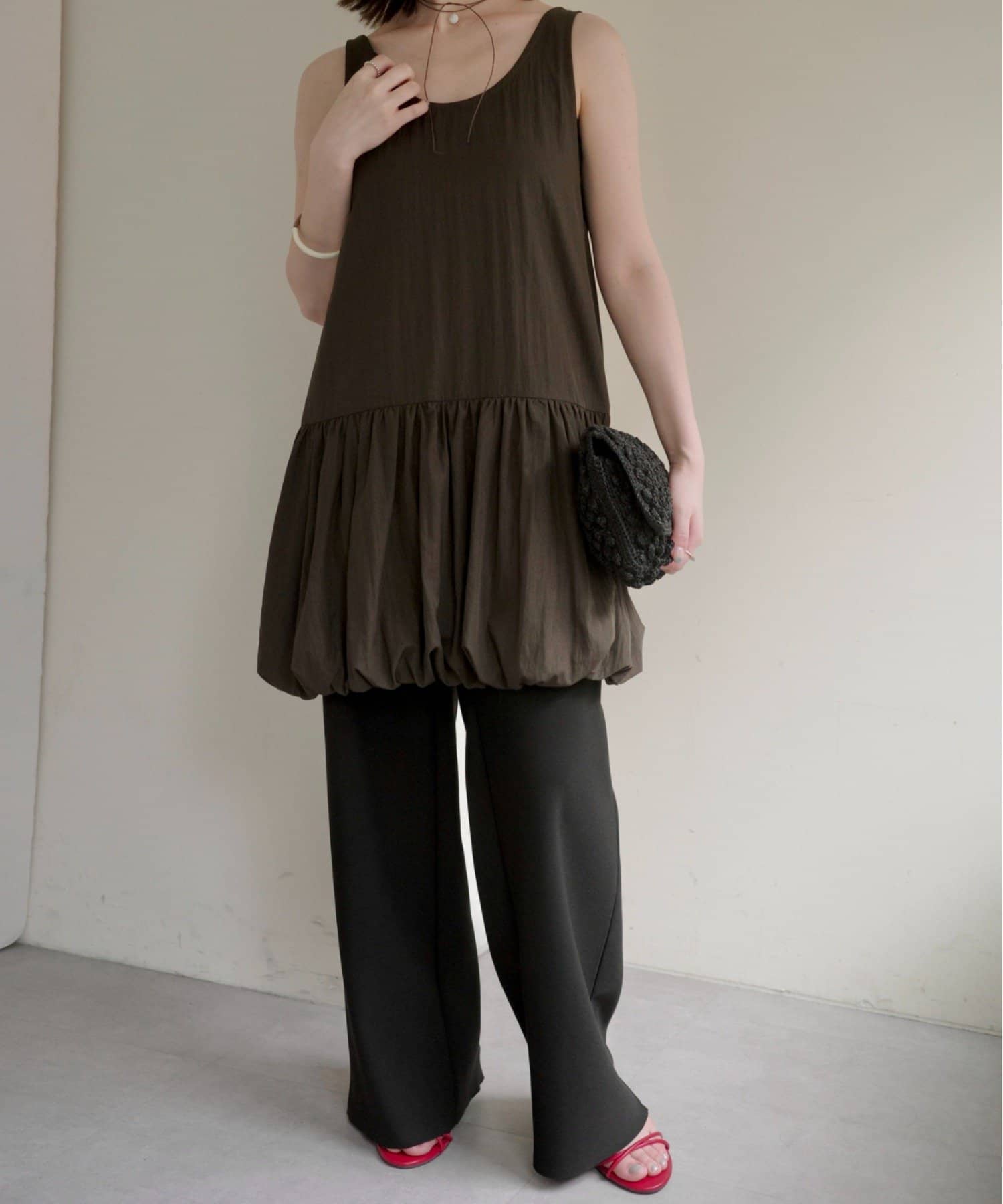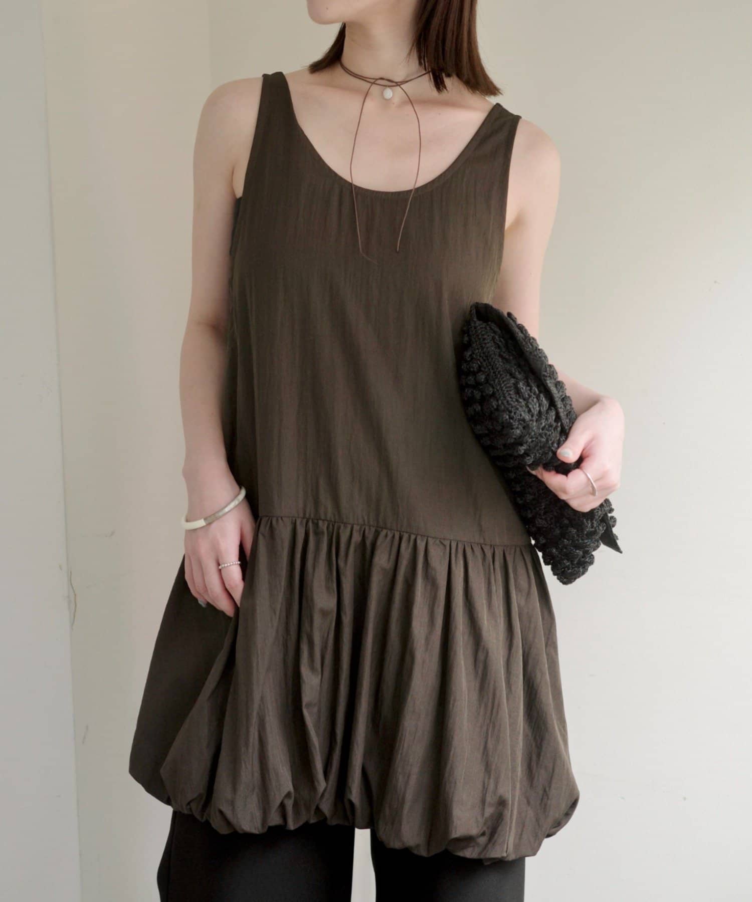 ・ミニワンピとしてだけでなく、パンツ合わせでカジュアルに着こなすこともできるので、スタイリングの幅が広い一枚です。