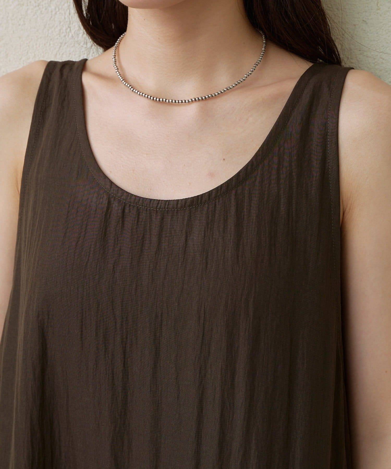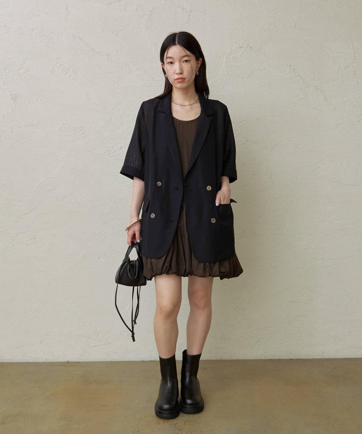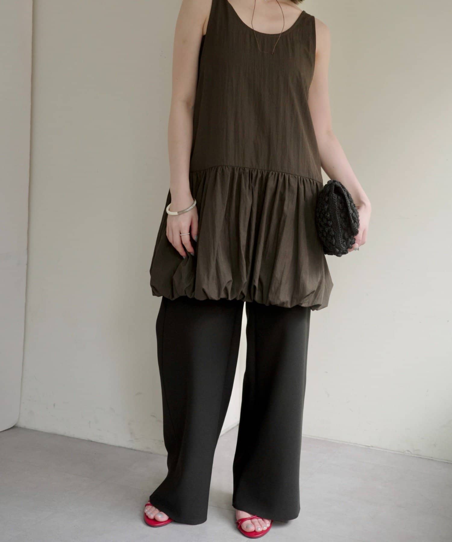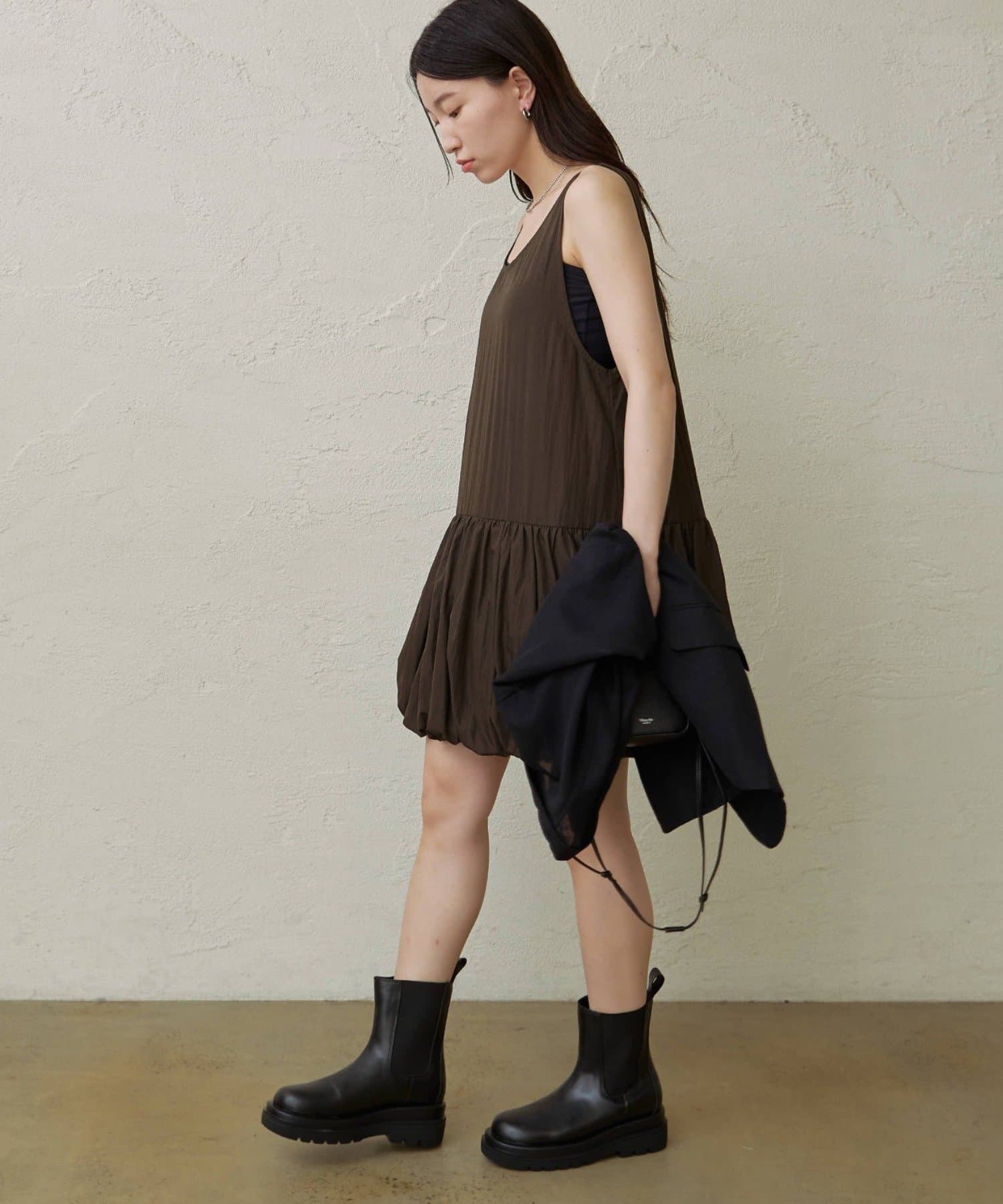 ・ミニワンピとしてだけでなく、パンツ合わせでカジュアルに着こなすこともできるので、スタイリングの幅が広い一枚です。