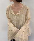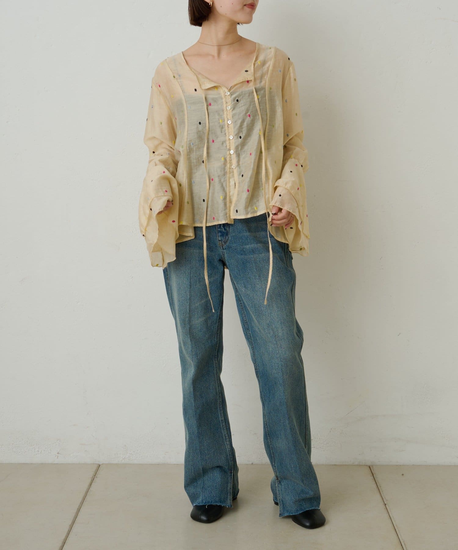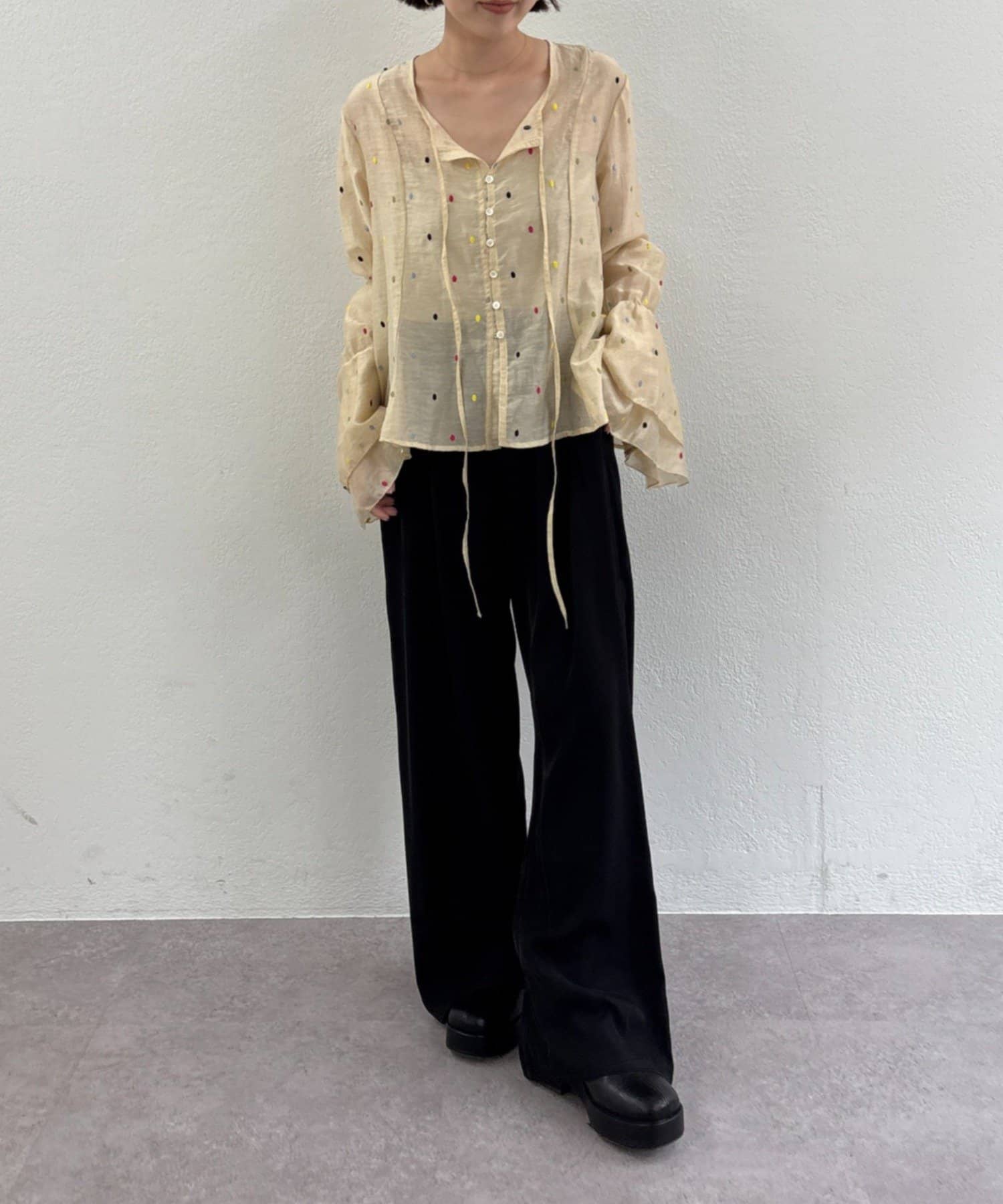 ドットの刺繍が可愛くて、ベージュの色も好きで購入しました。一枚でデニム合わせもしたいし、パープルのニットの下に合わせても可愛かったので、冬もたくさん着たいです!