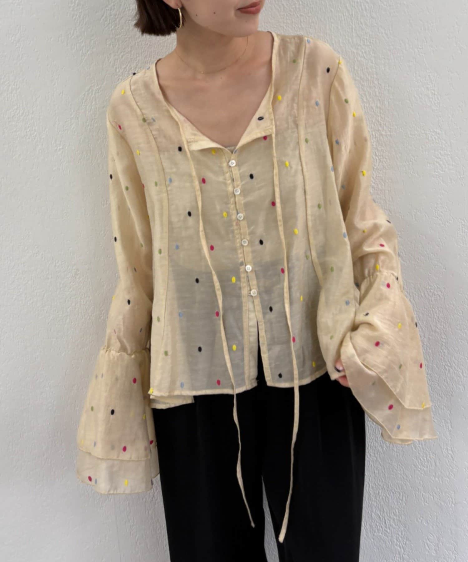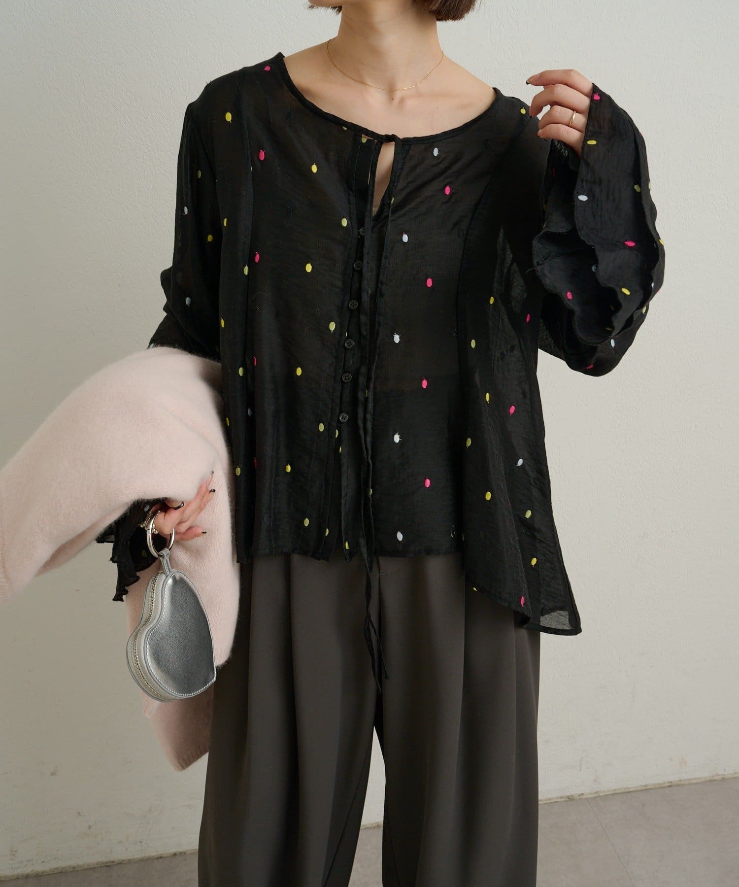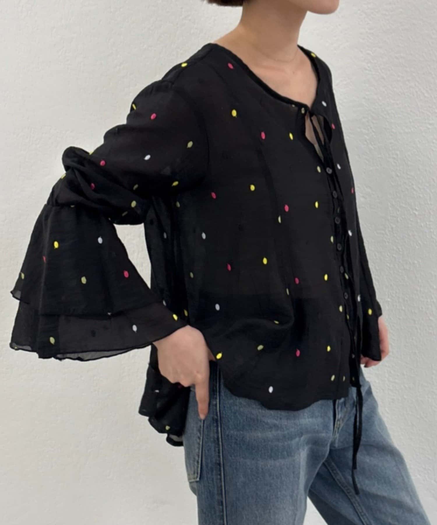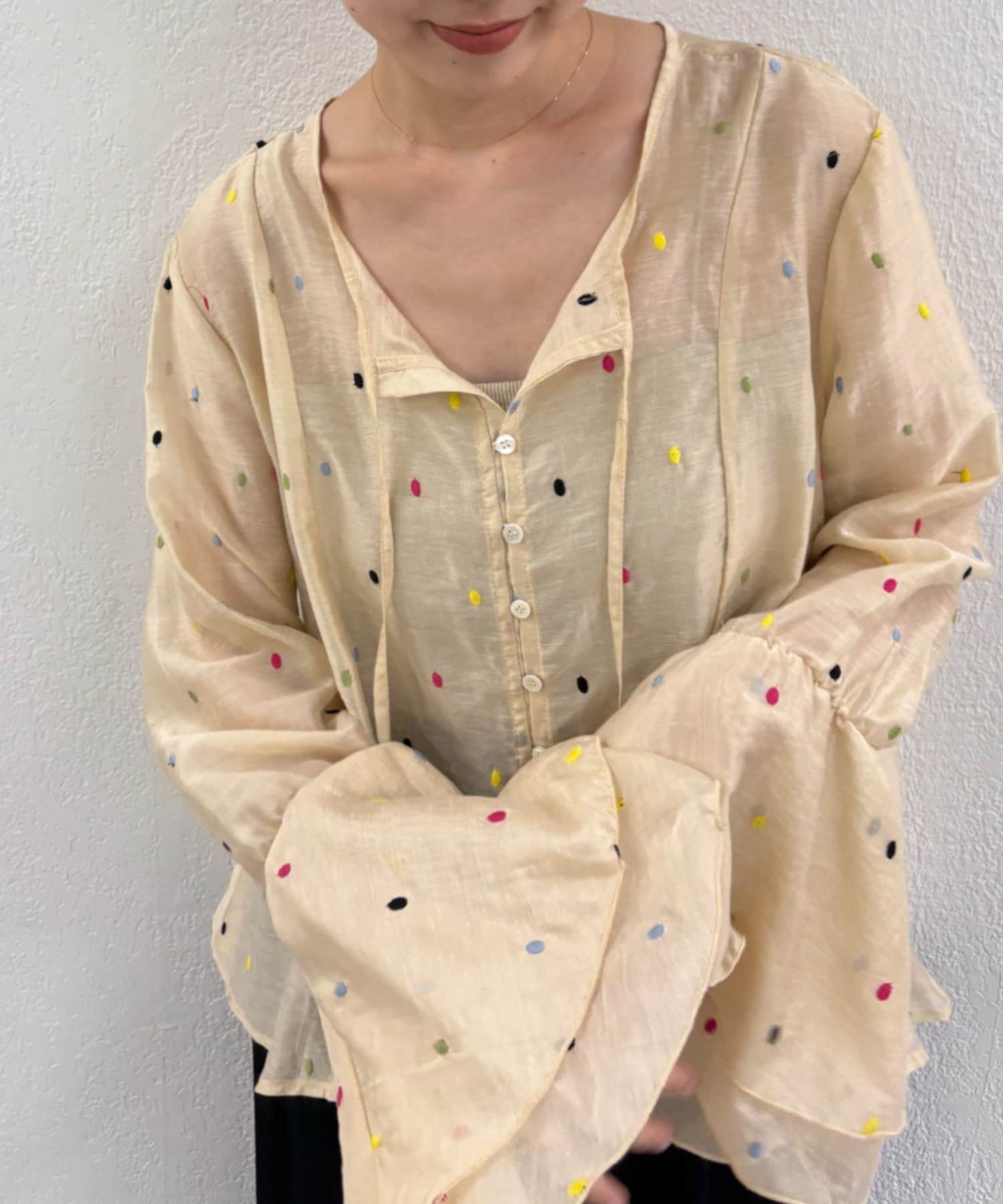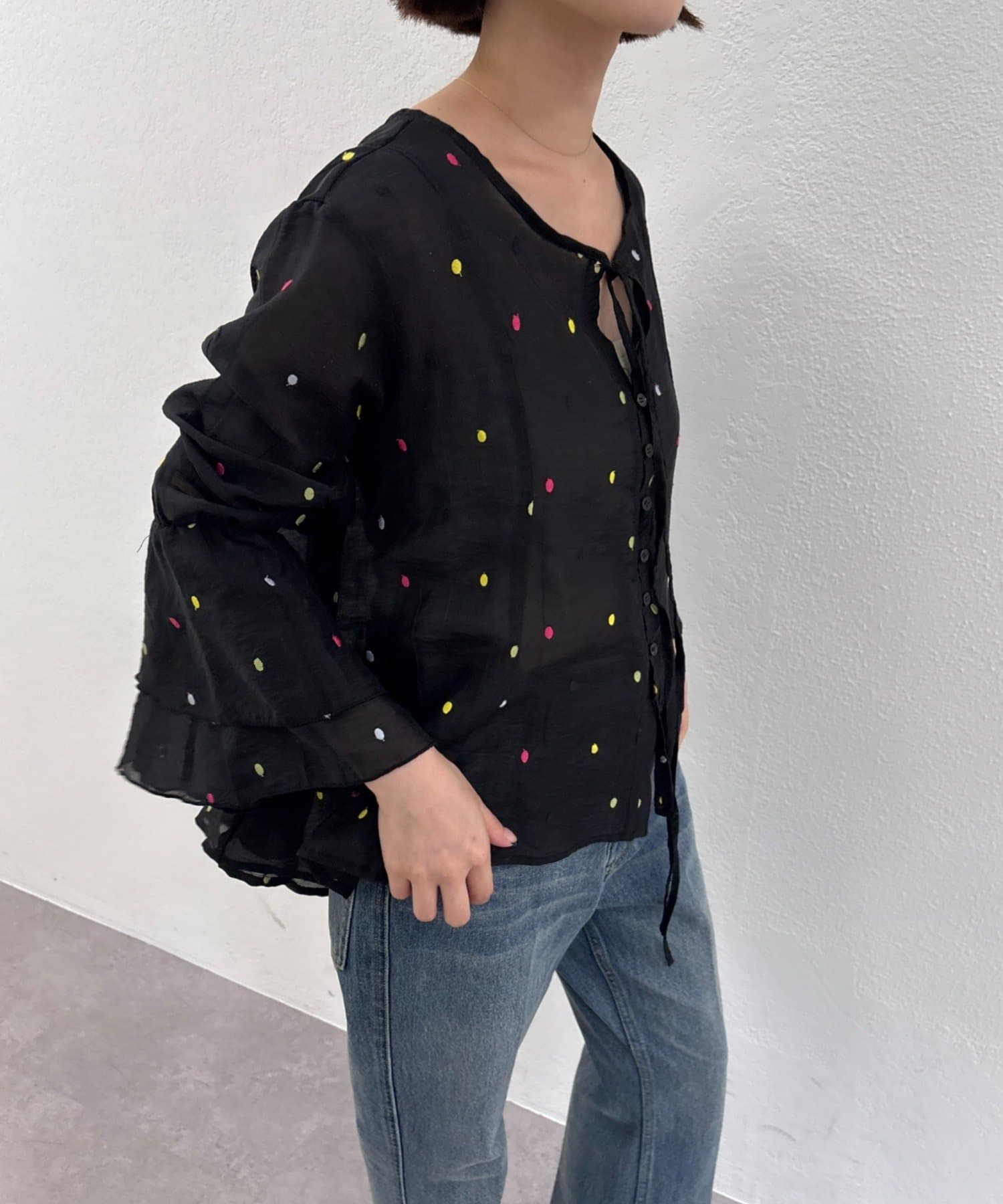 一枚でスタイリングが華やかになるマルチドットブラウス