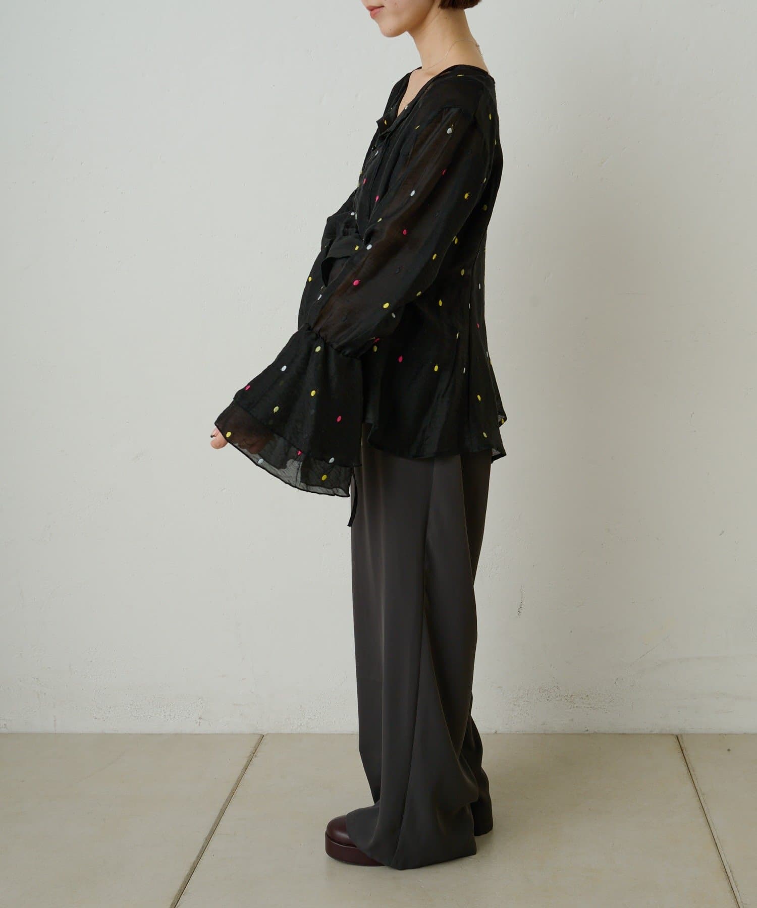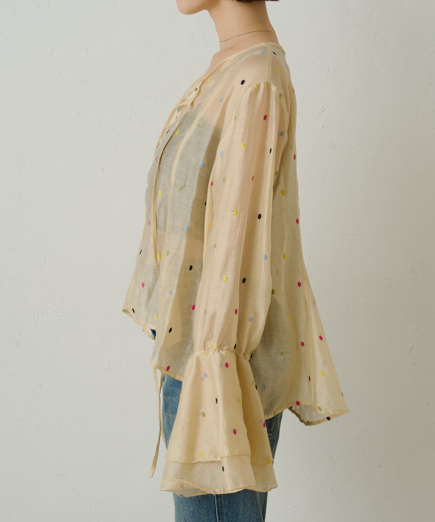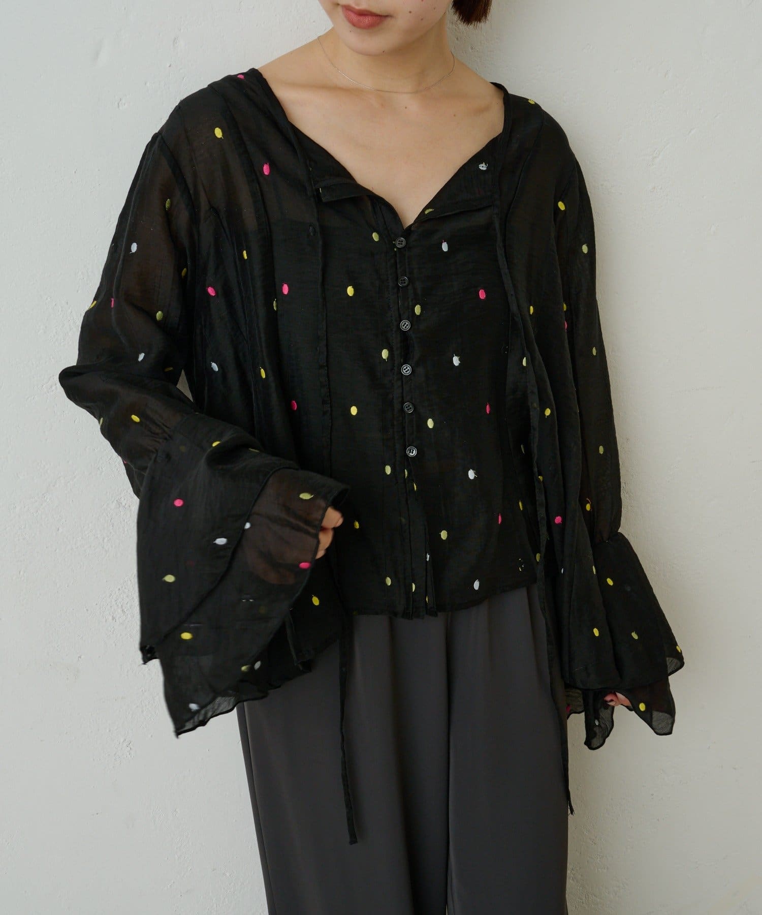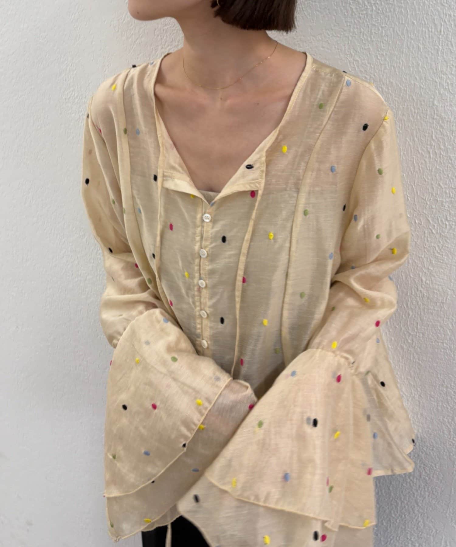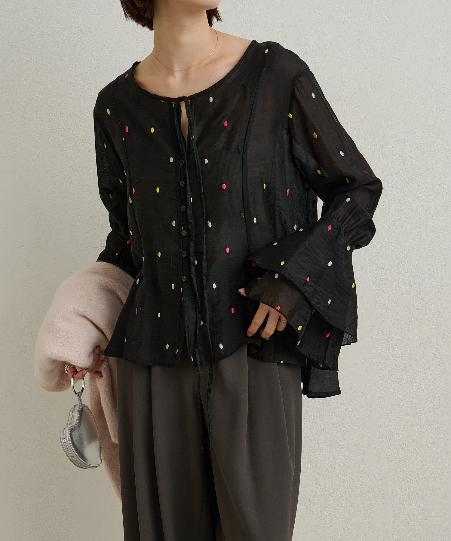 一枚でスタイリングが華やかになるマルチドットブラウス