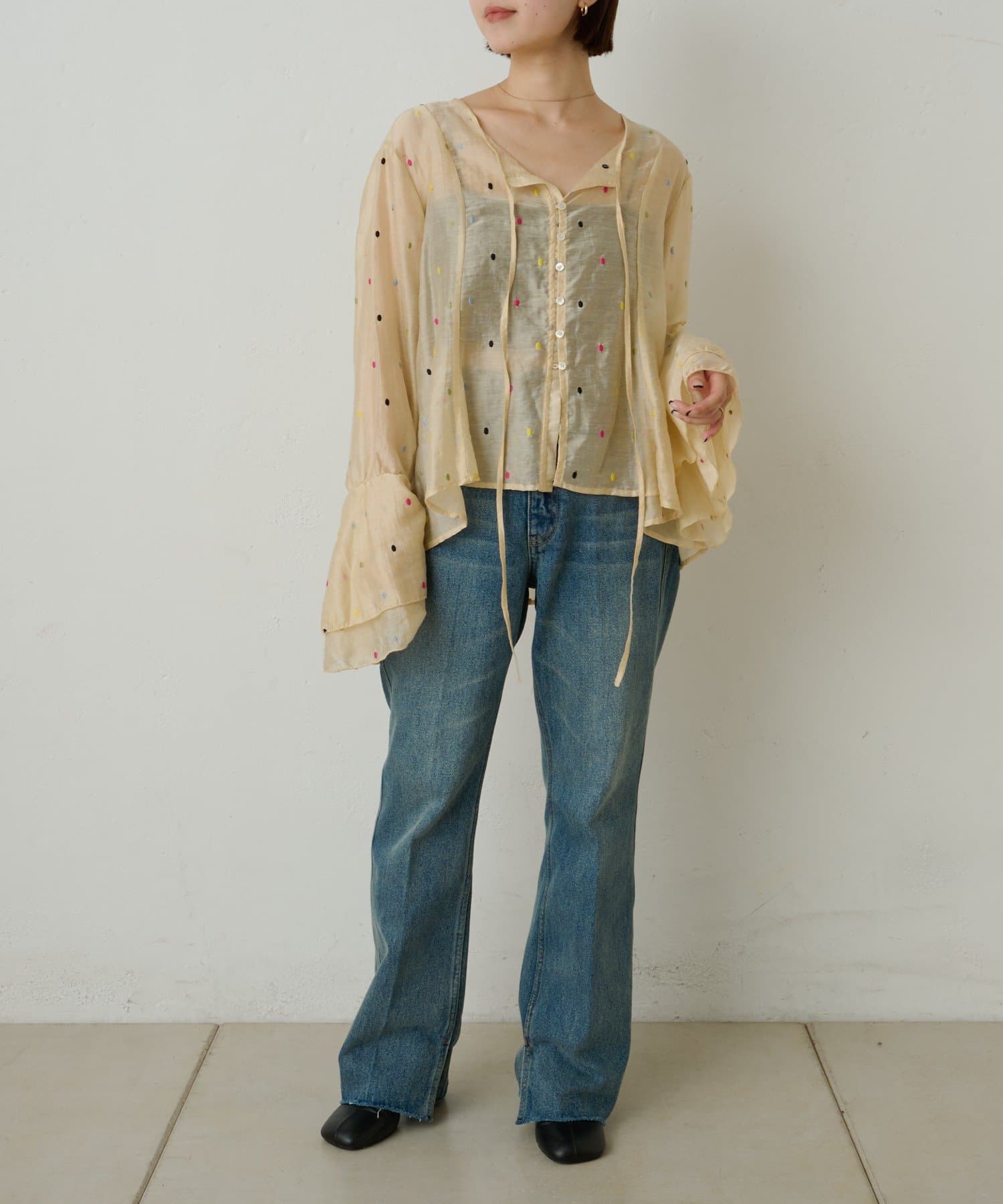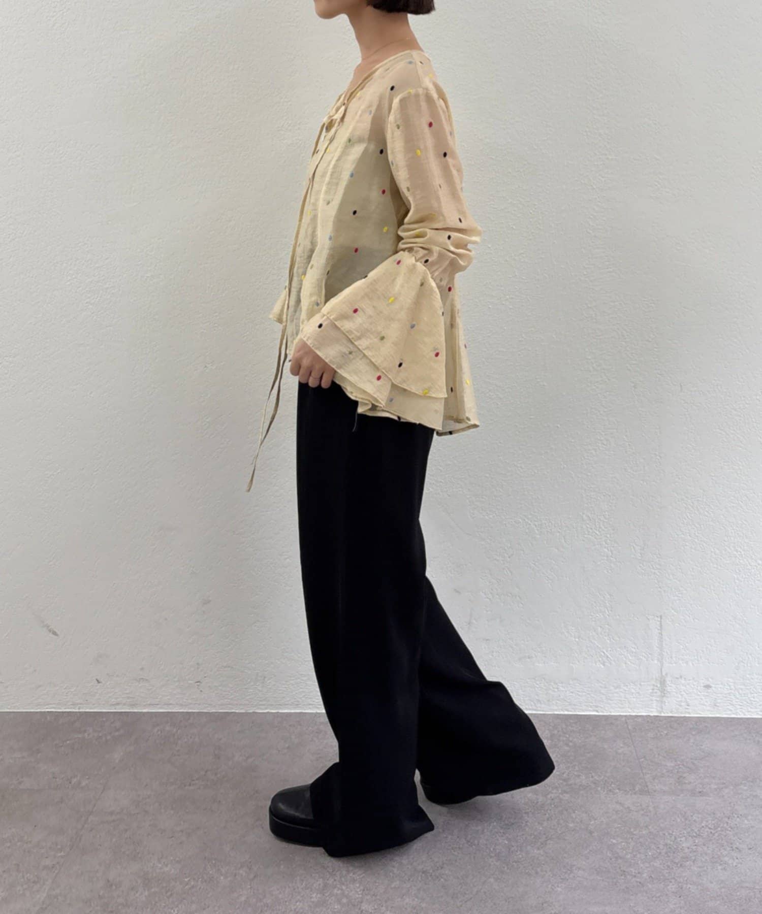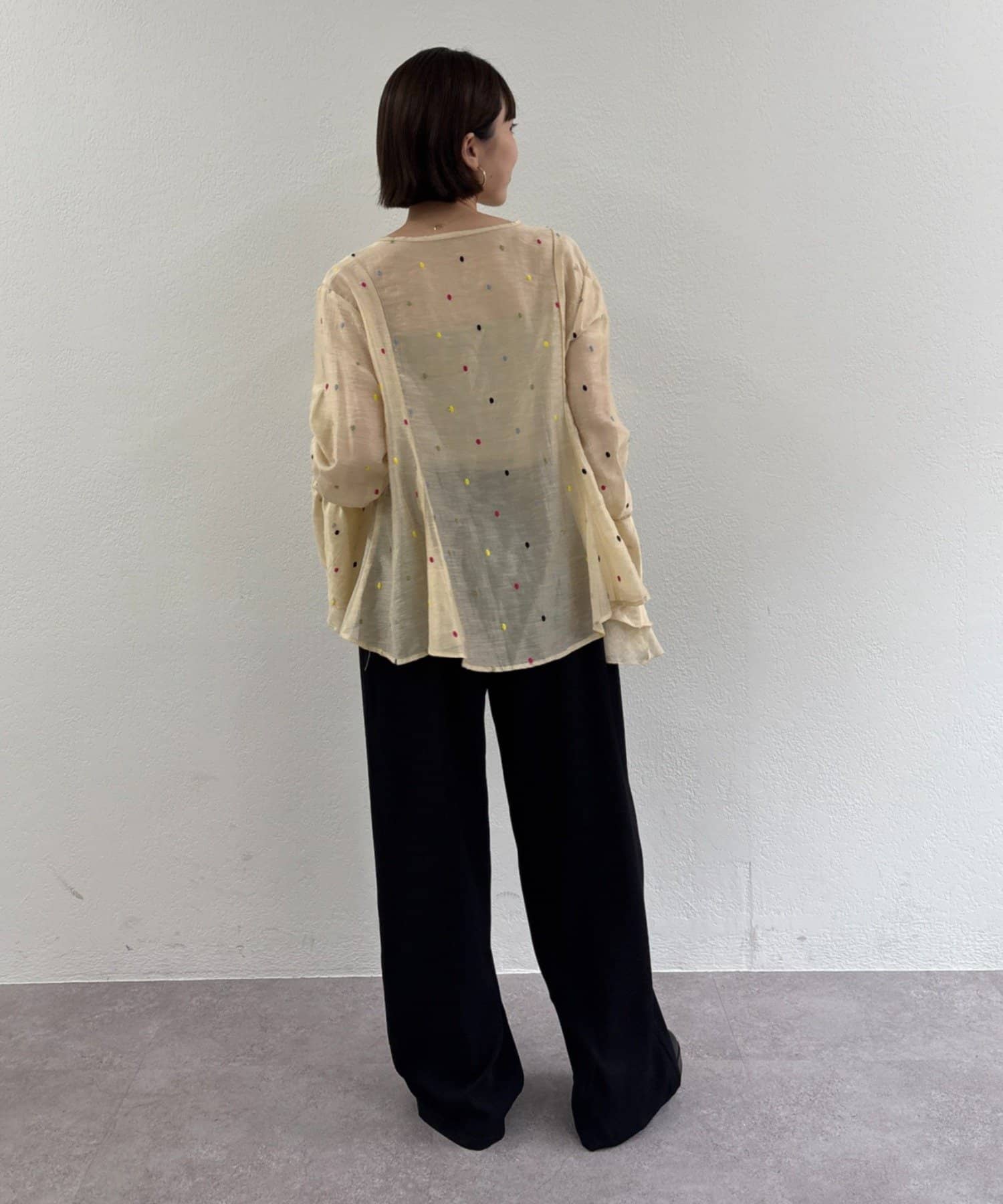刺繍のドット柄が可愛くて、一目惚れしました。甘すぎるかなぁ〜と思いましたが、ボトムにデニムやスラックスを合わせると、大人可愛く着れて最高です。