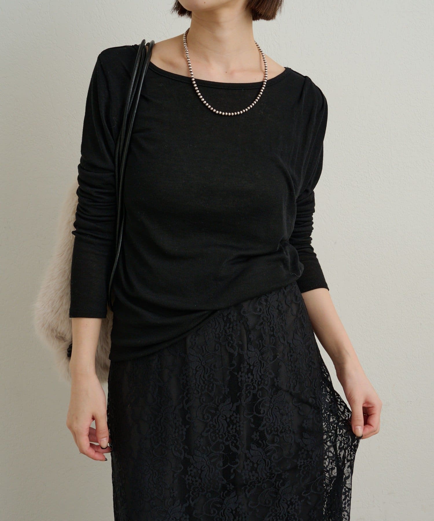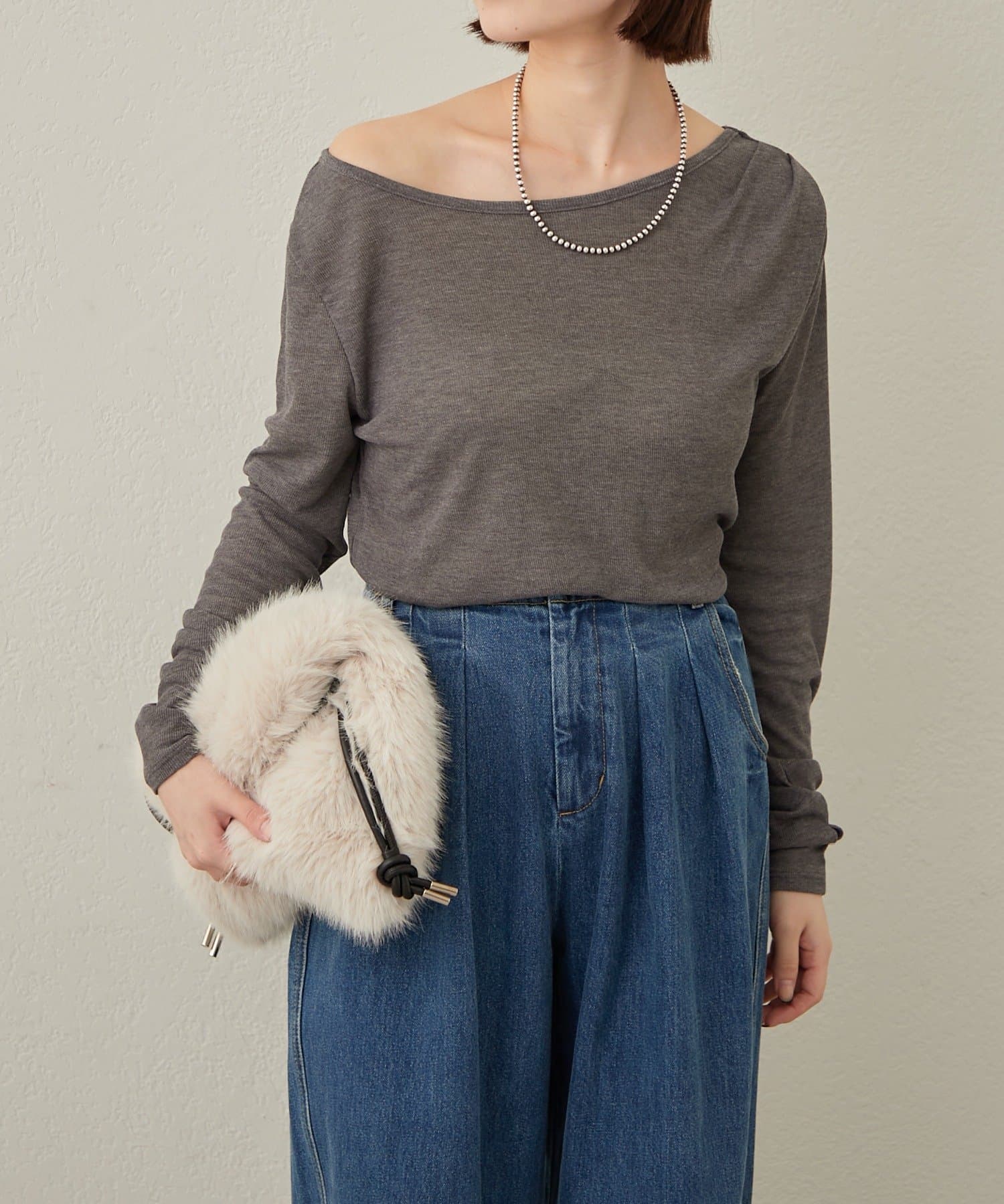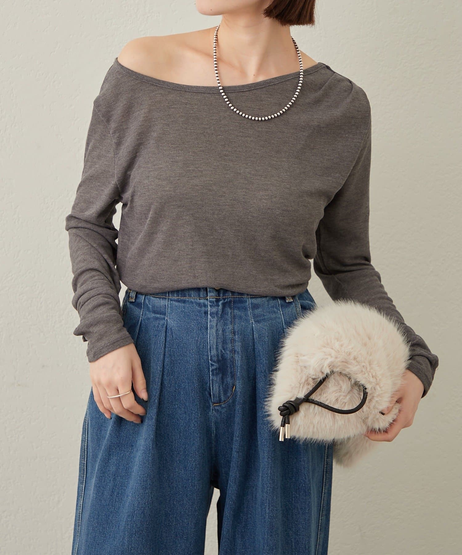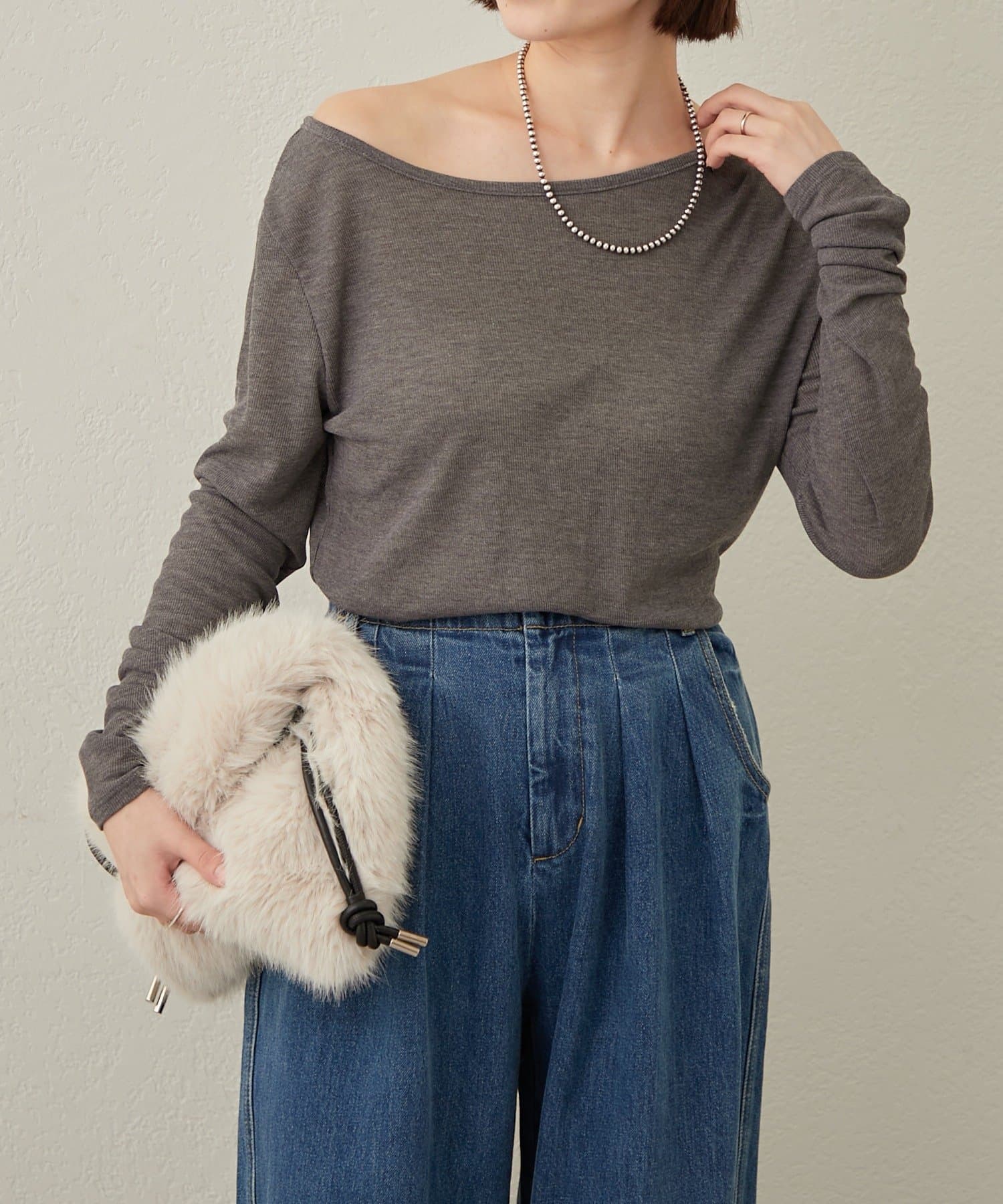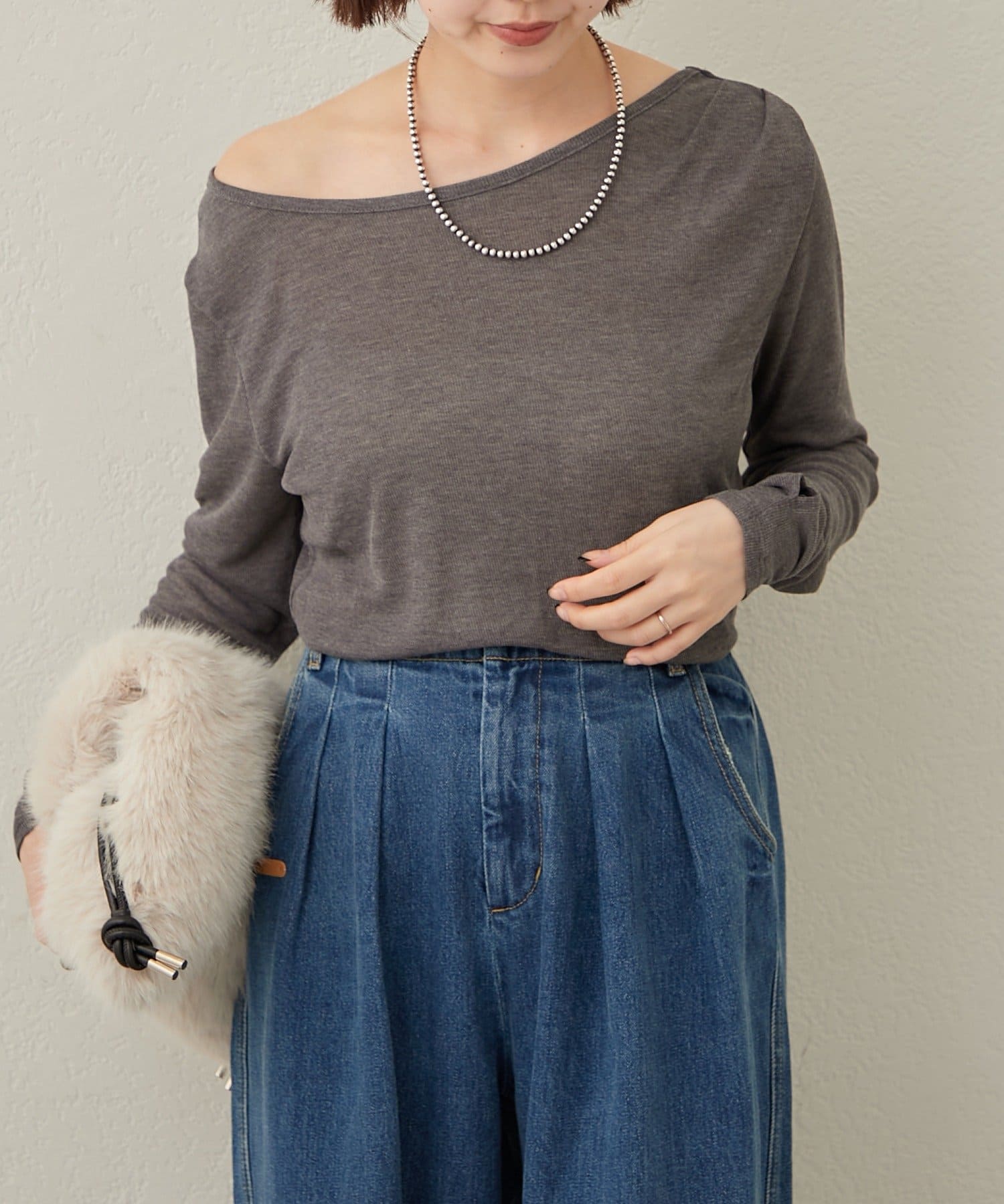 ・ほどよいネックの開きでワンショル、ボートネックなどスタイリング次第で変えていただけます。
