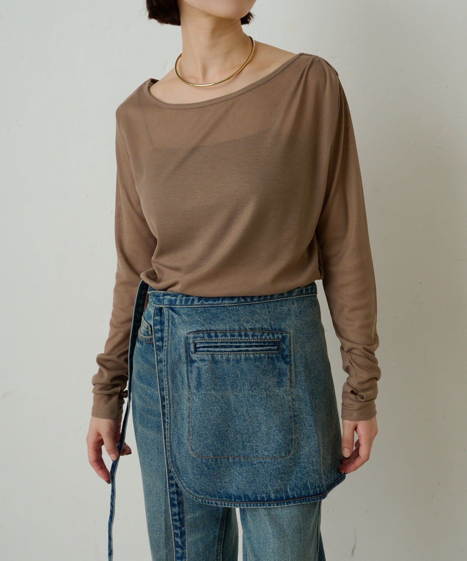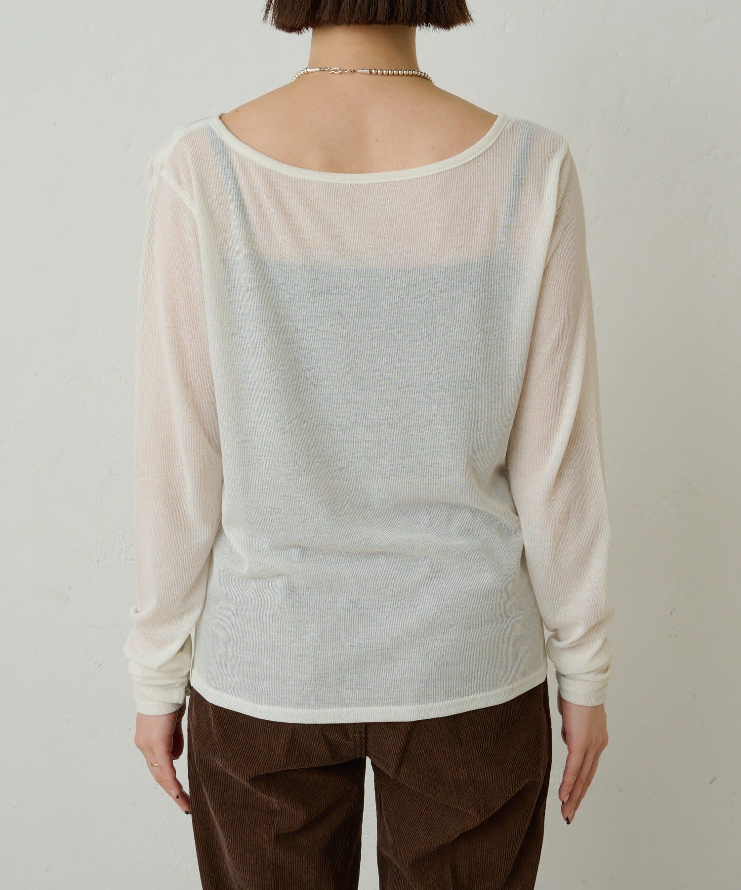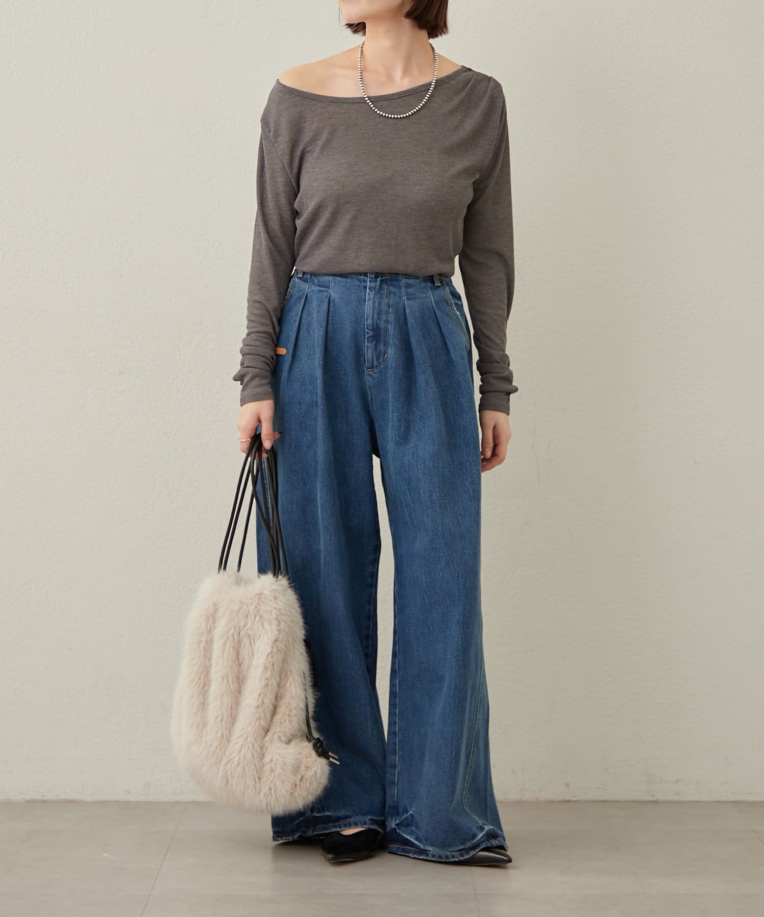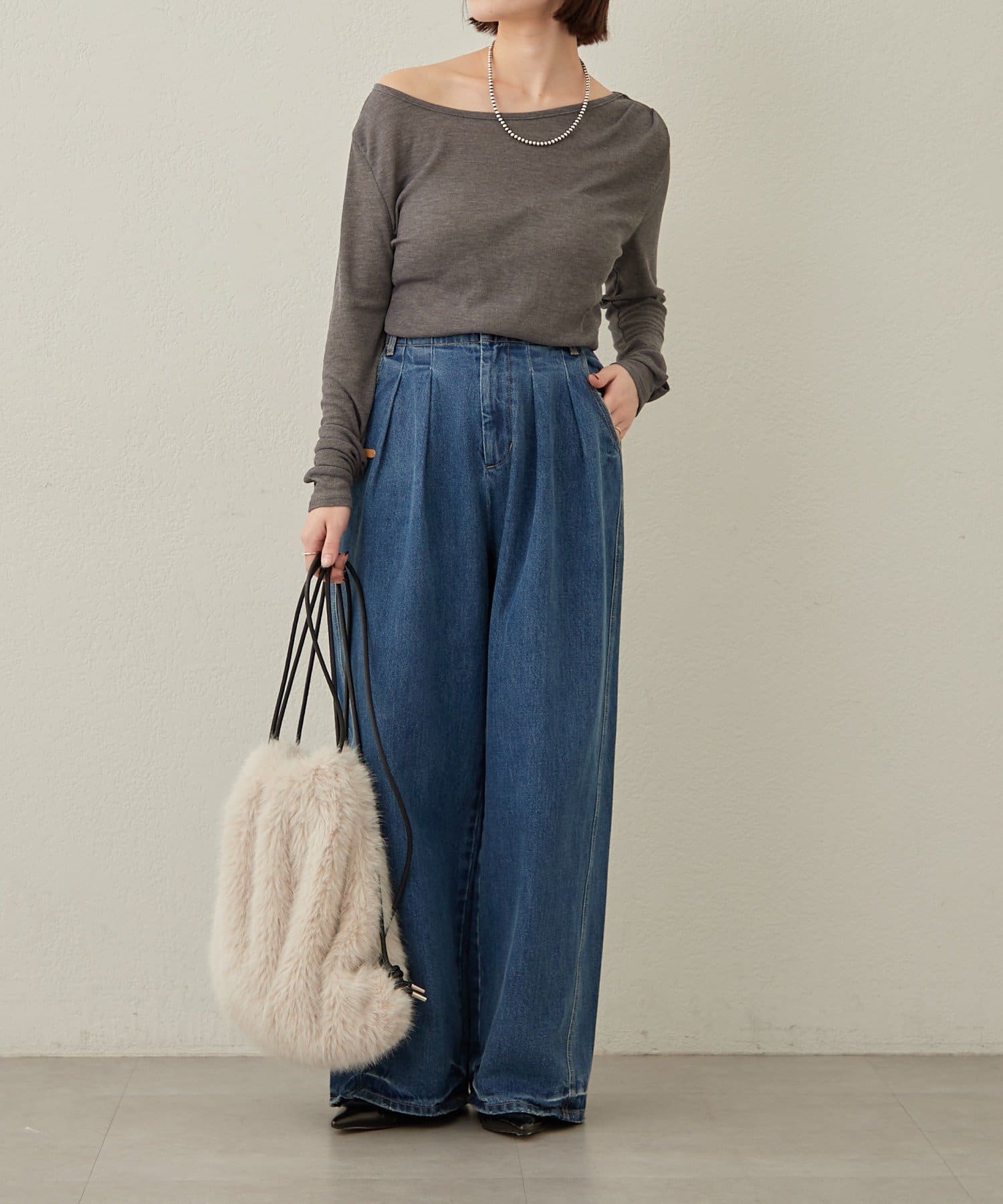 ・ほどよいネックの開きでワンショル、ボートネックなどスタイリング次第で変えていただけます。
