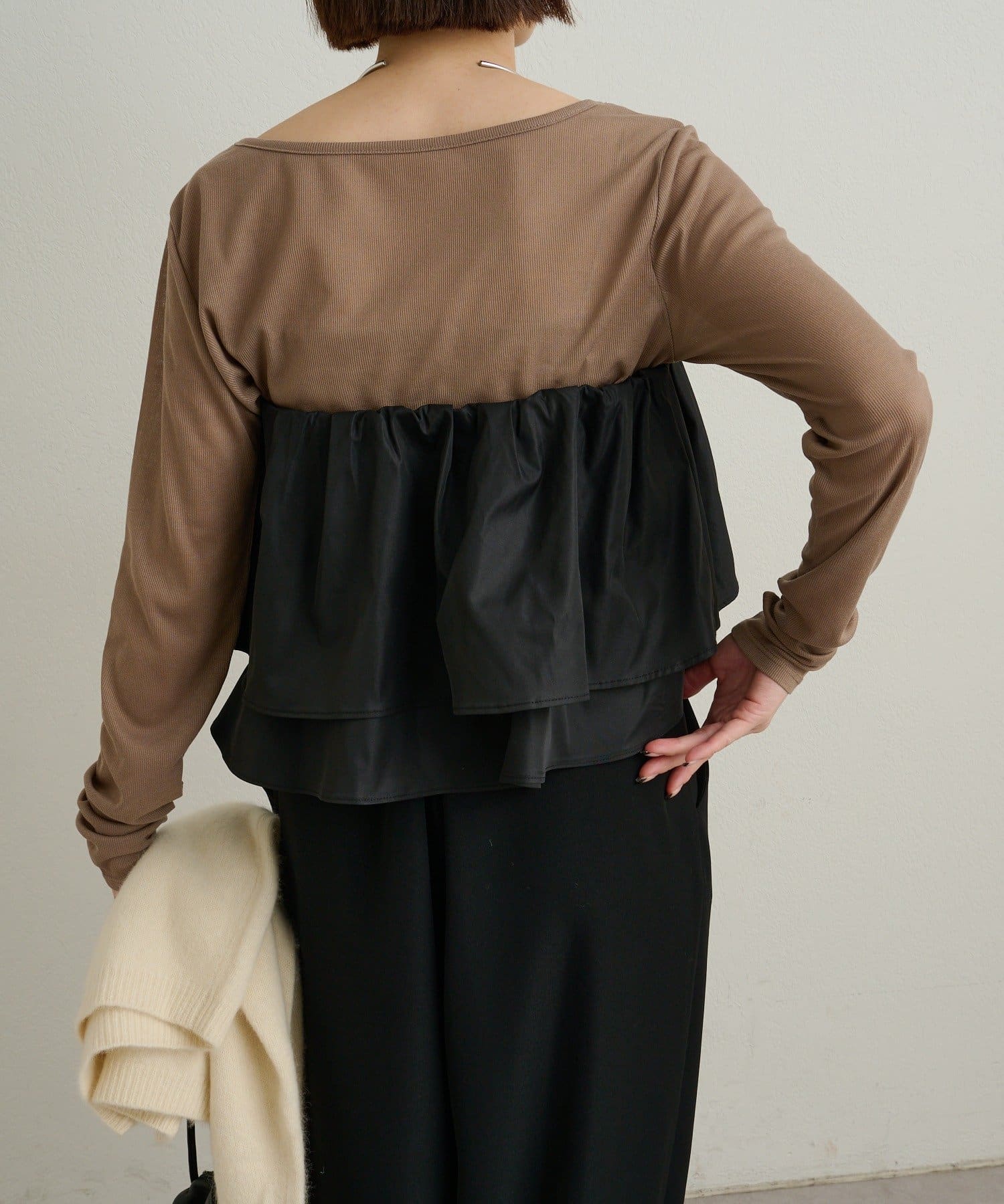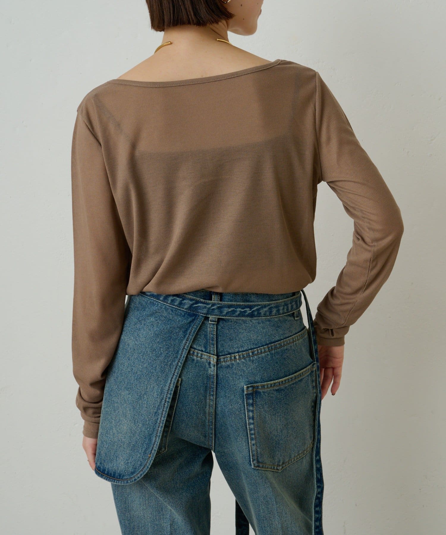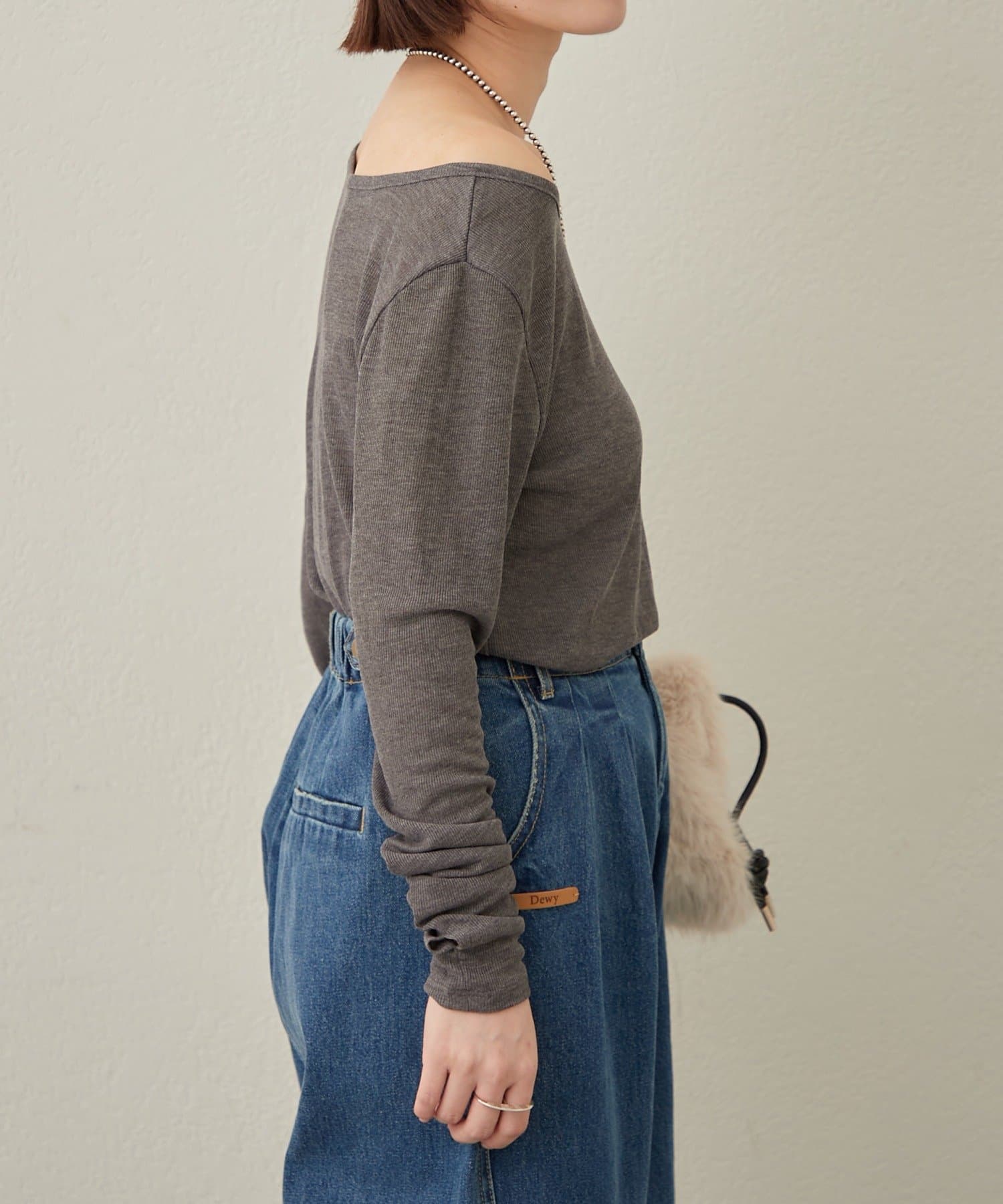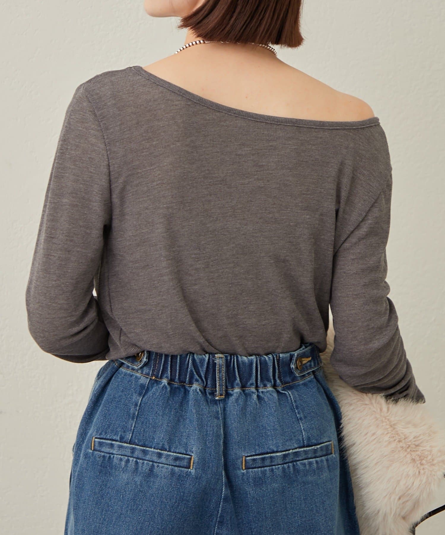 【新色追加/チャコールグレー・ピンク】シアーリブオフショルロングTシャツ