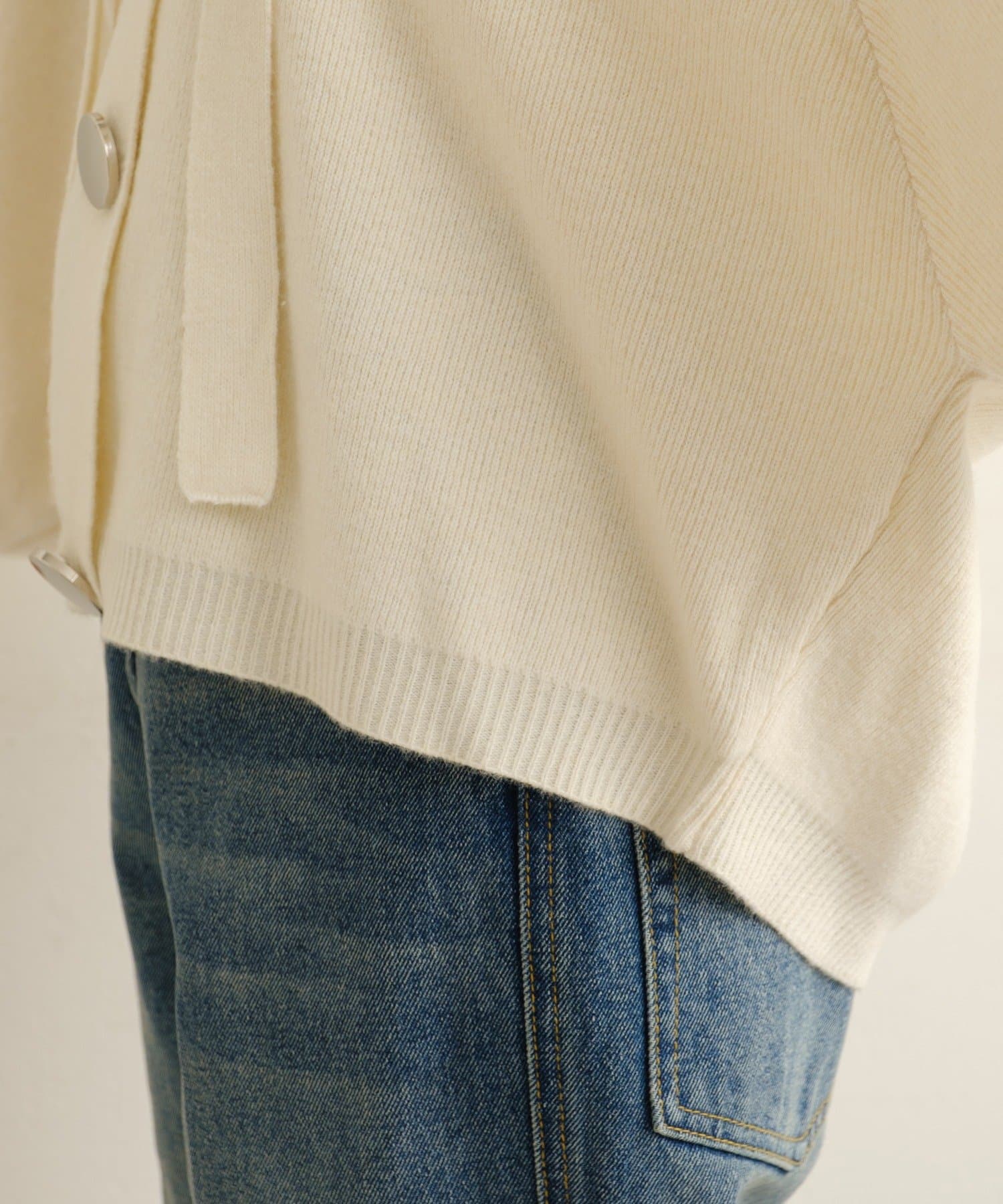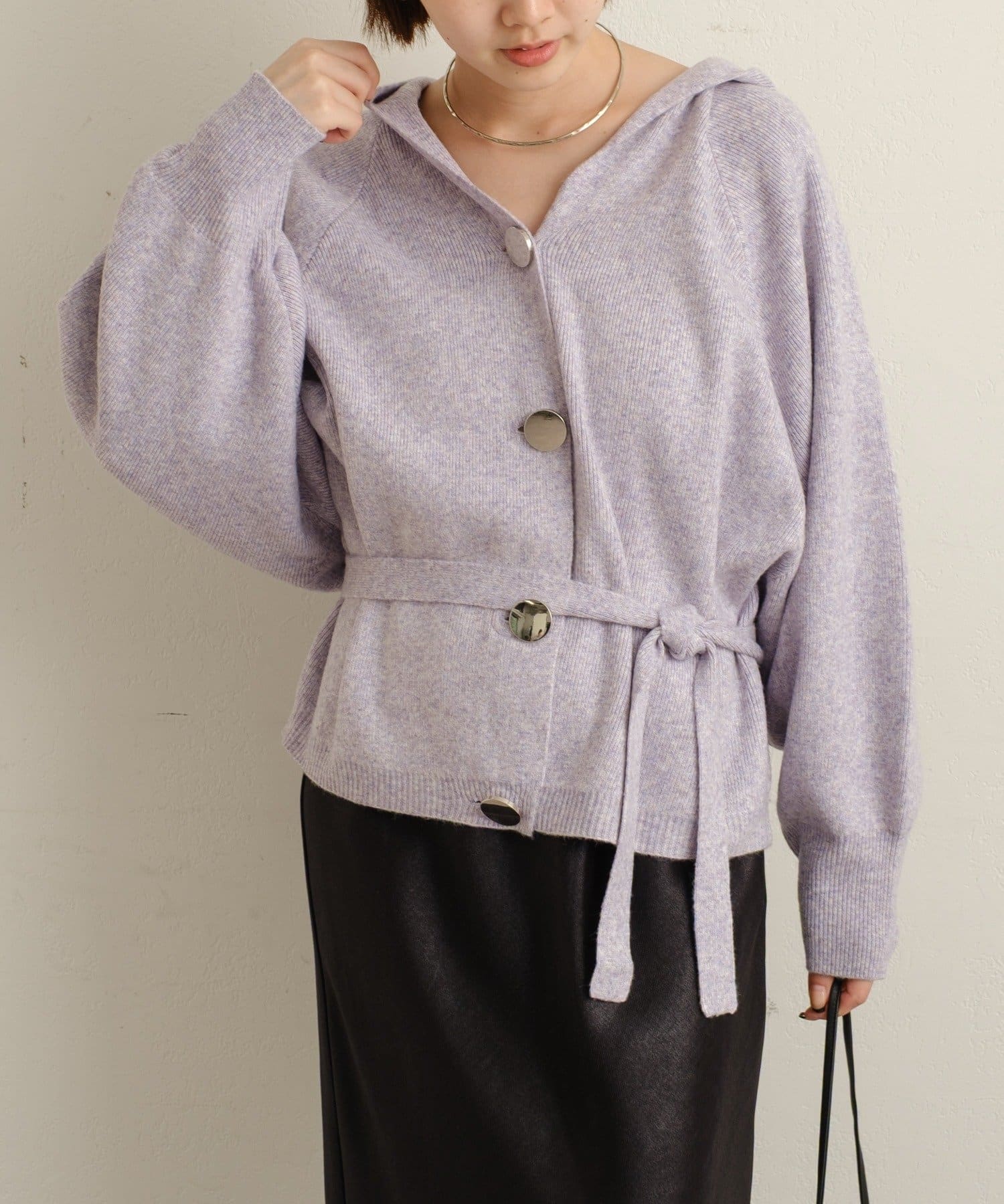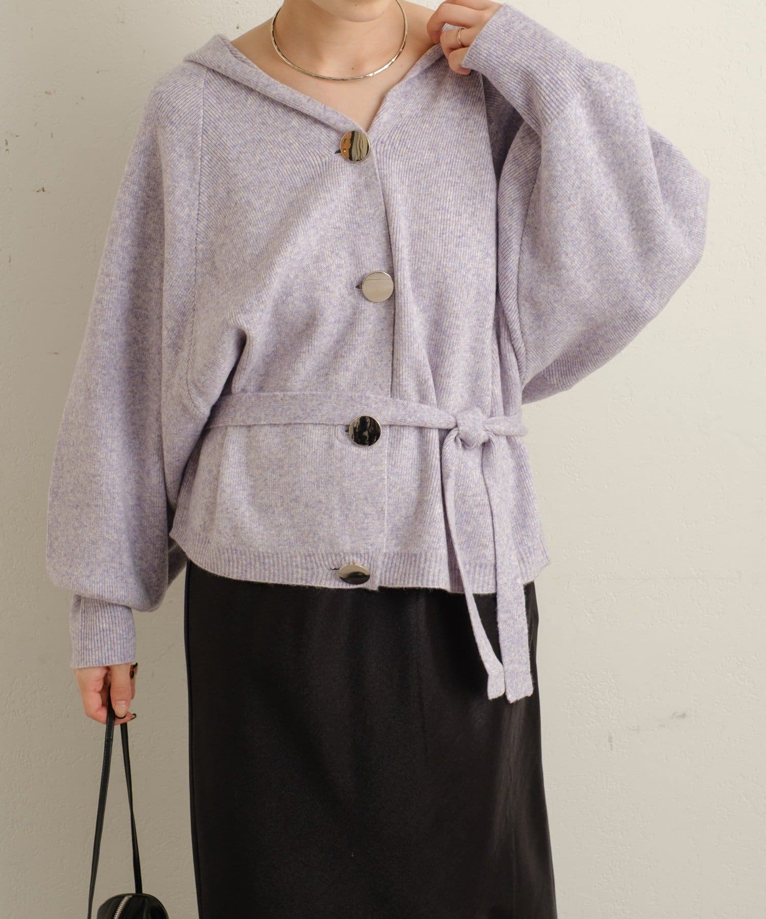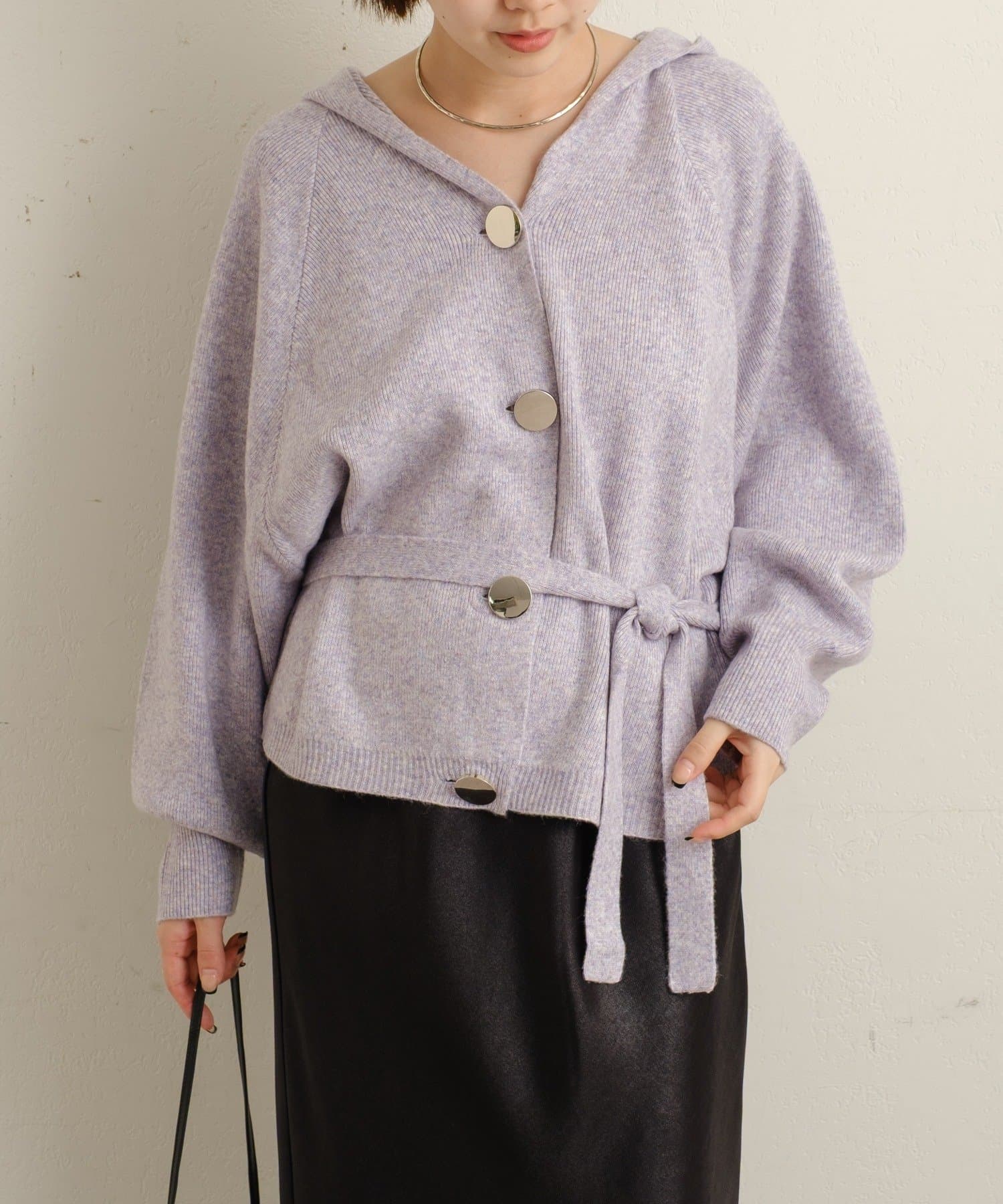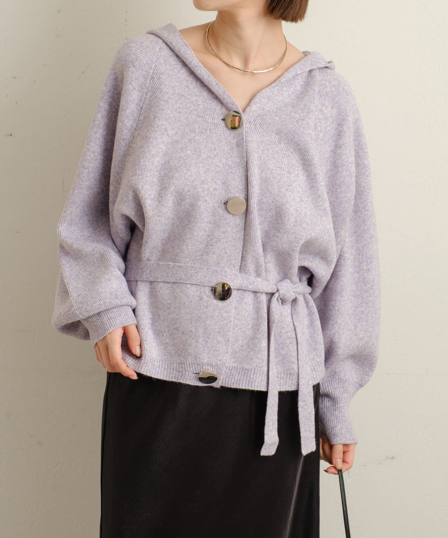 ・シルバーボタンとベルトがアクセントになったフーディニットカーディガン。