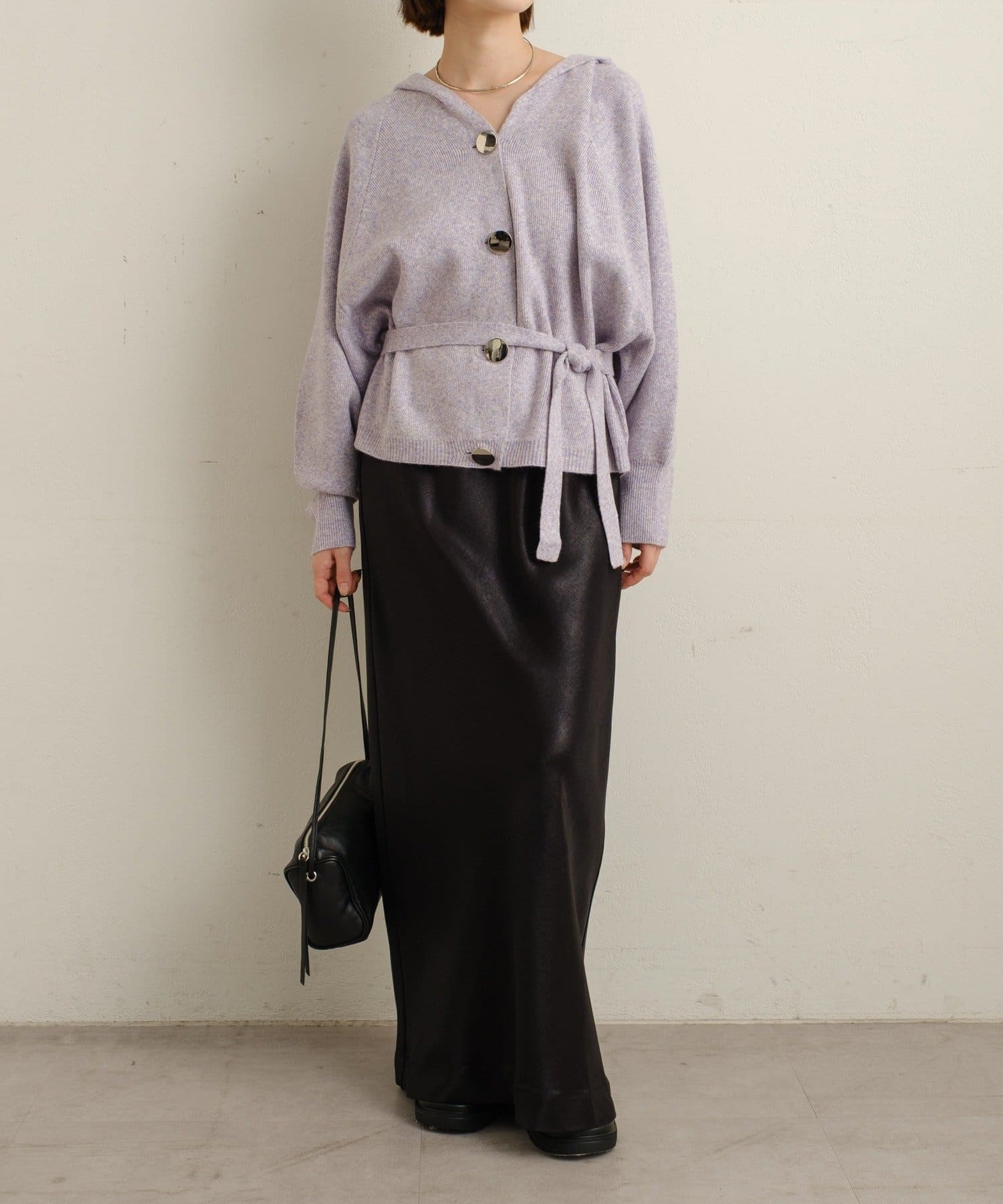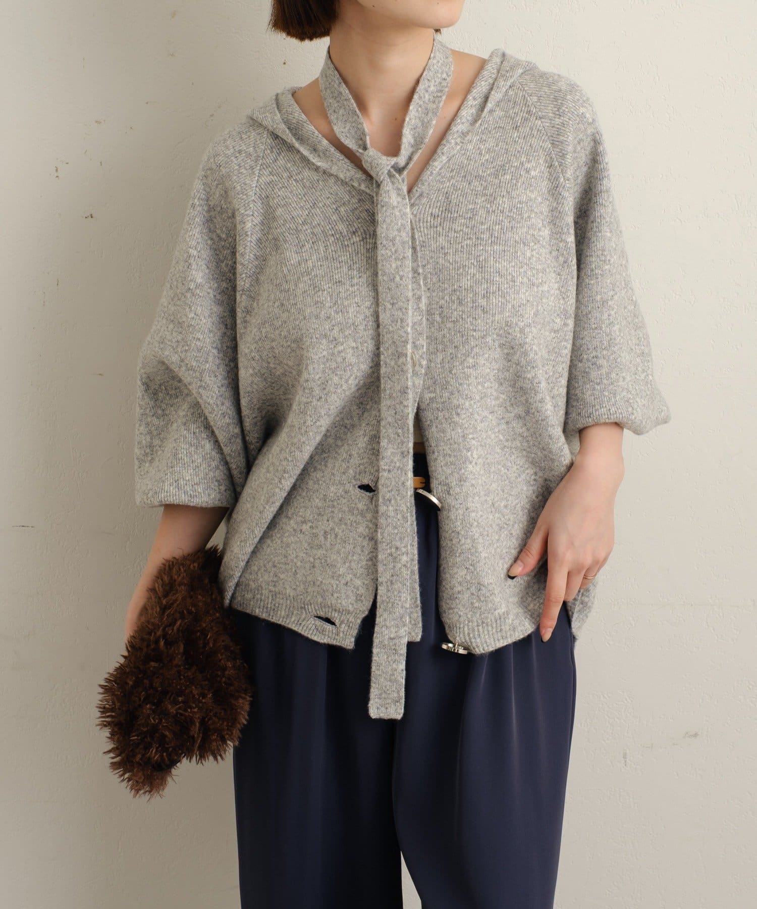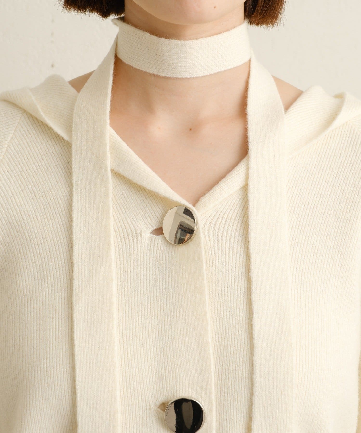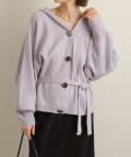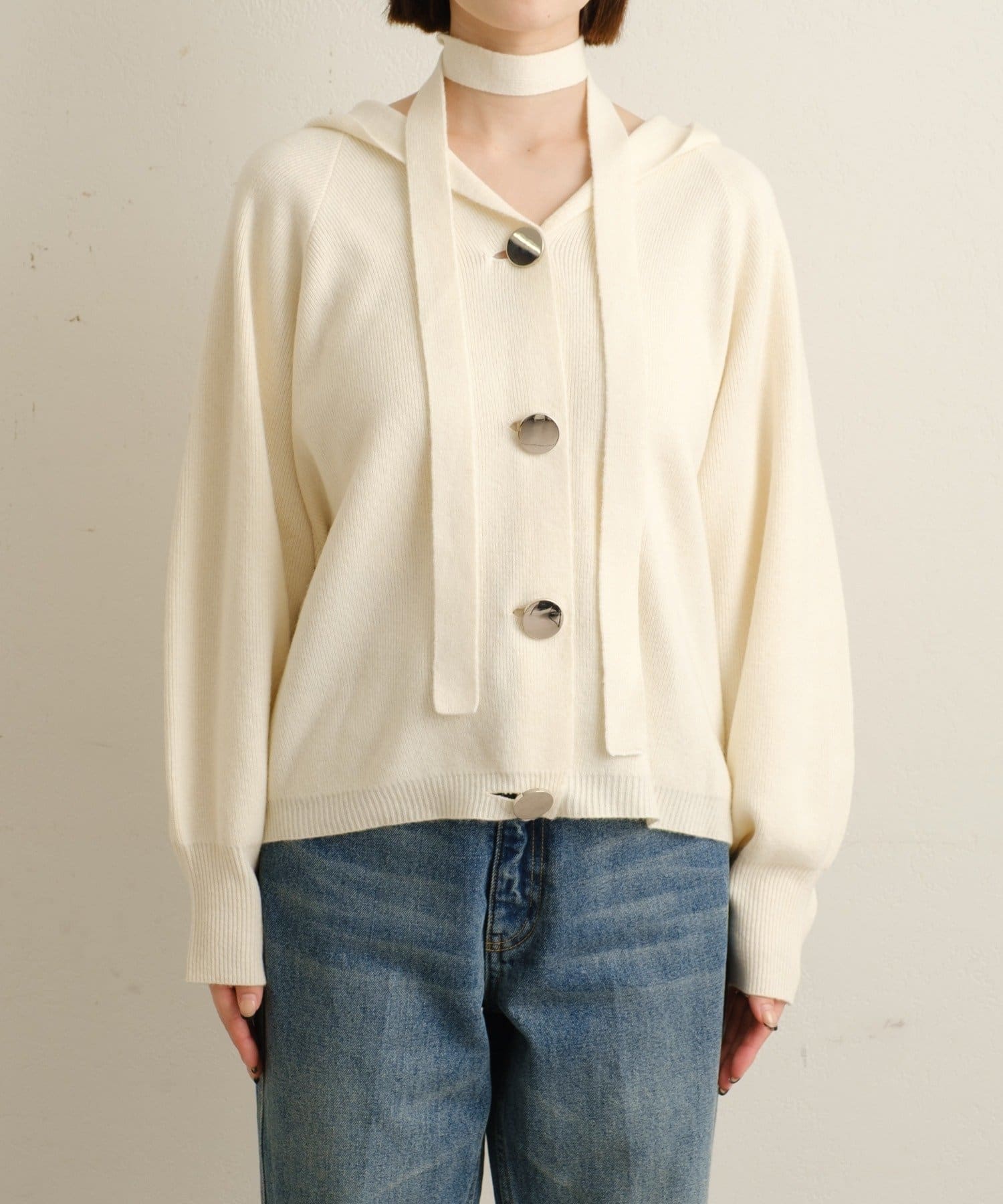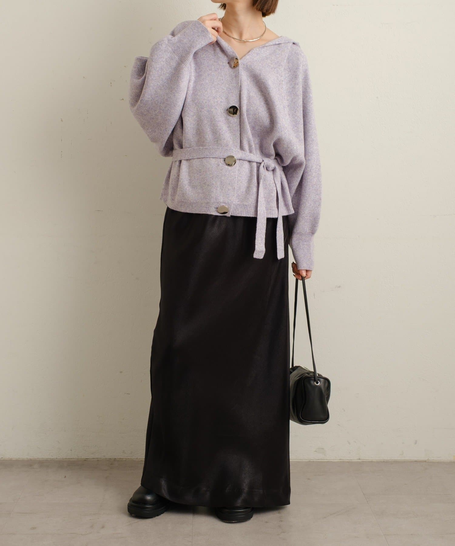 ・シルバーボタンとベルトがアクセントになったフーディニットカーディガン。