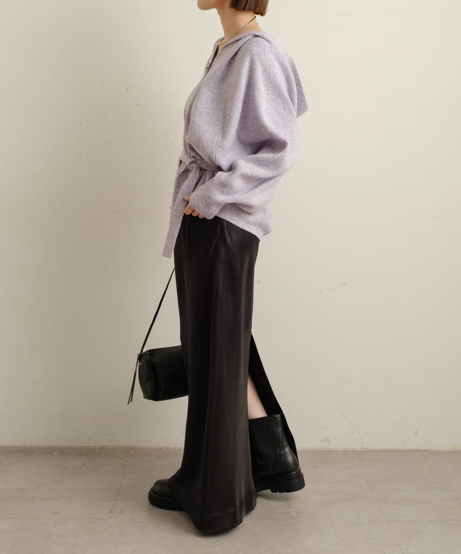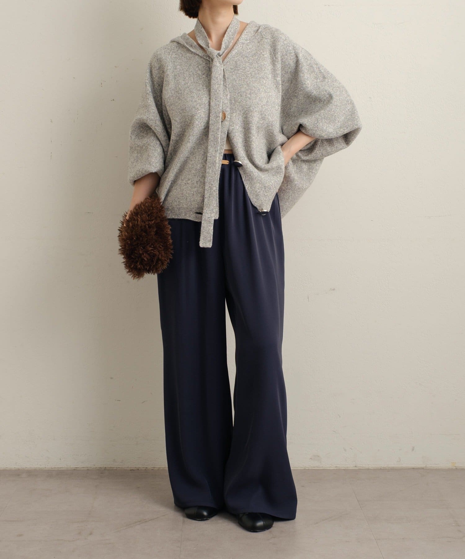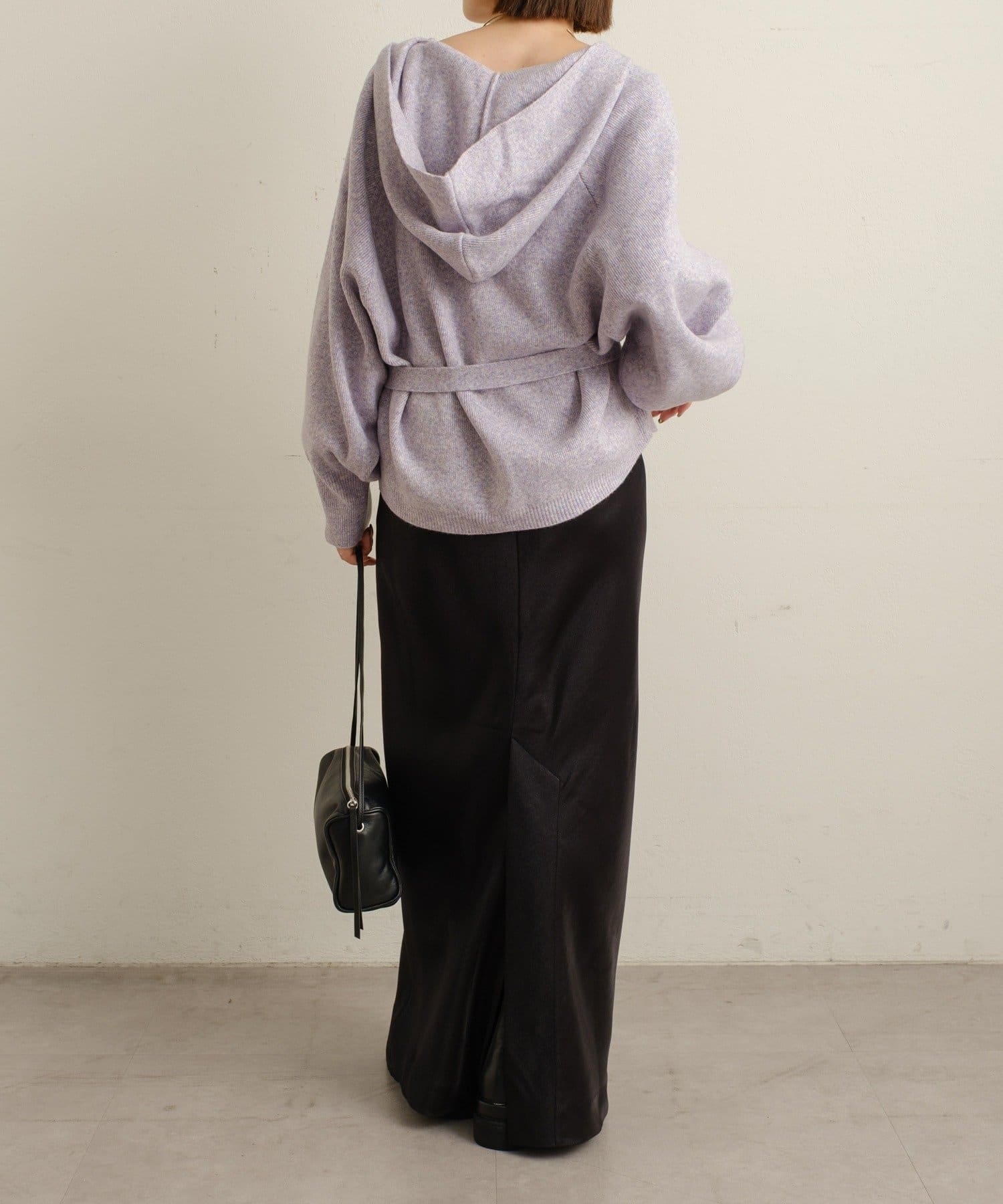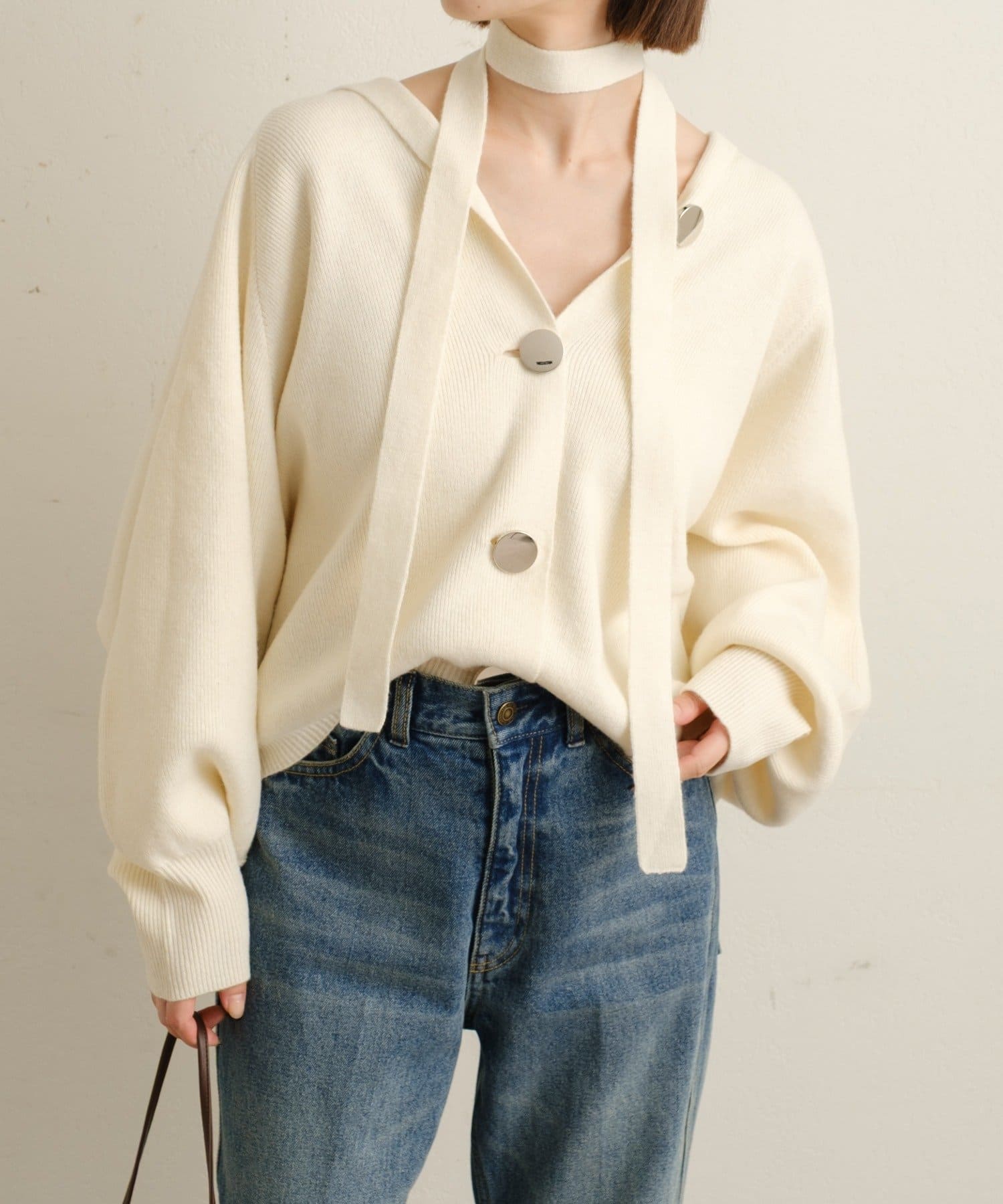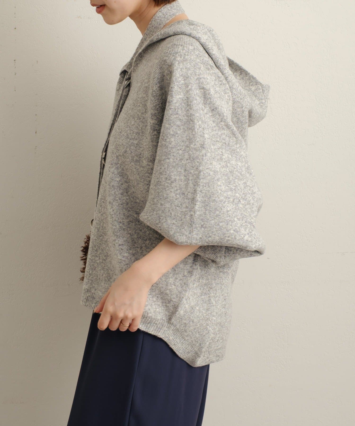 ・シルバーボタンとベルトがアクセントになったフーディニットカーディガン。