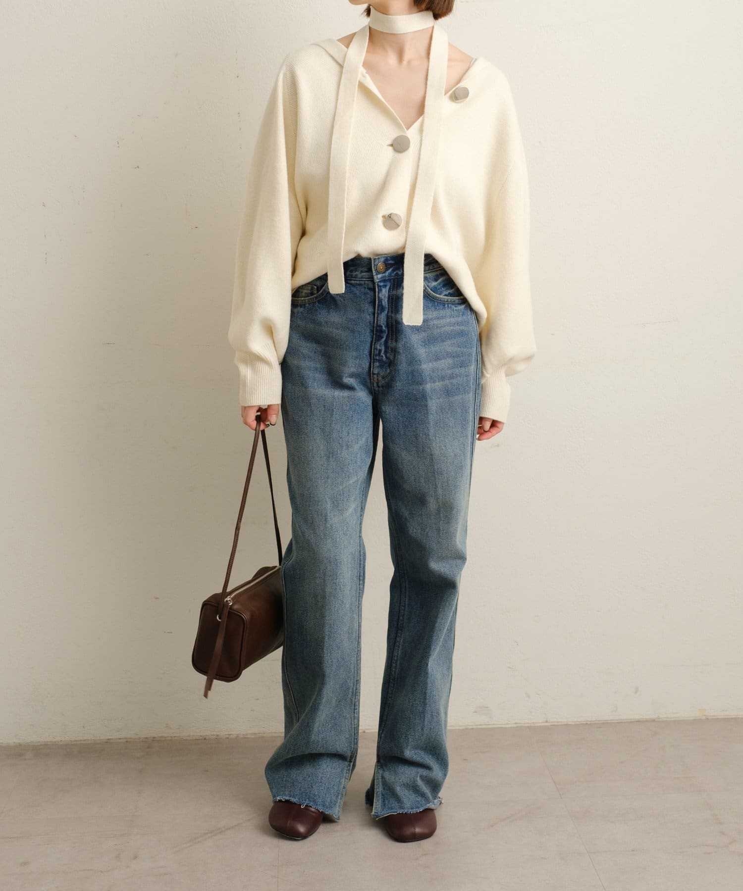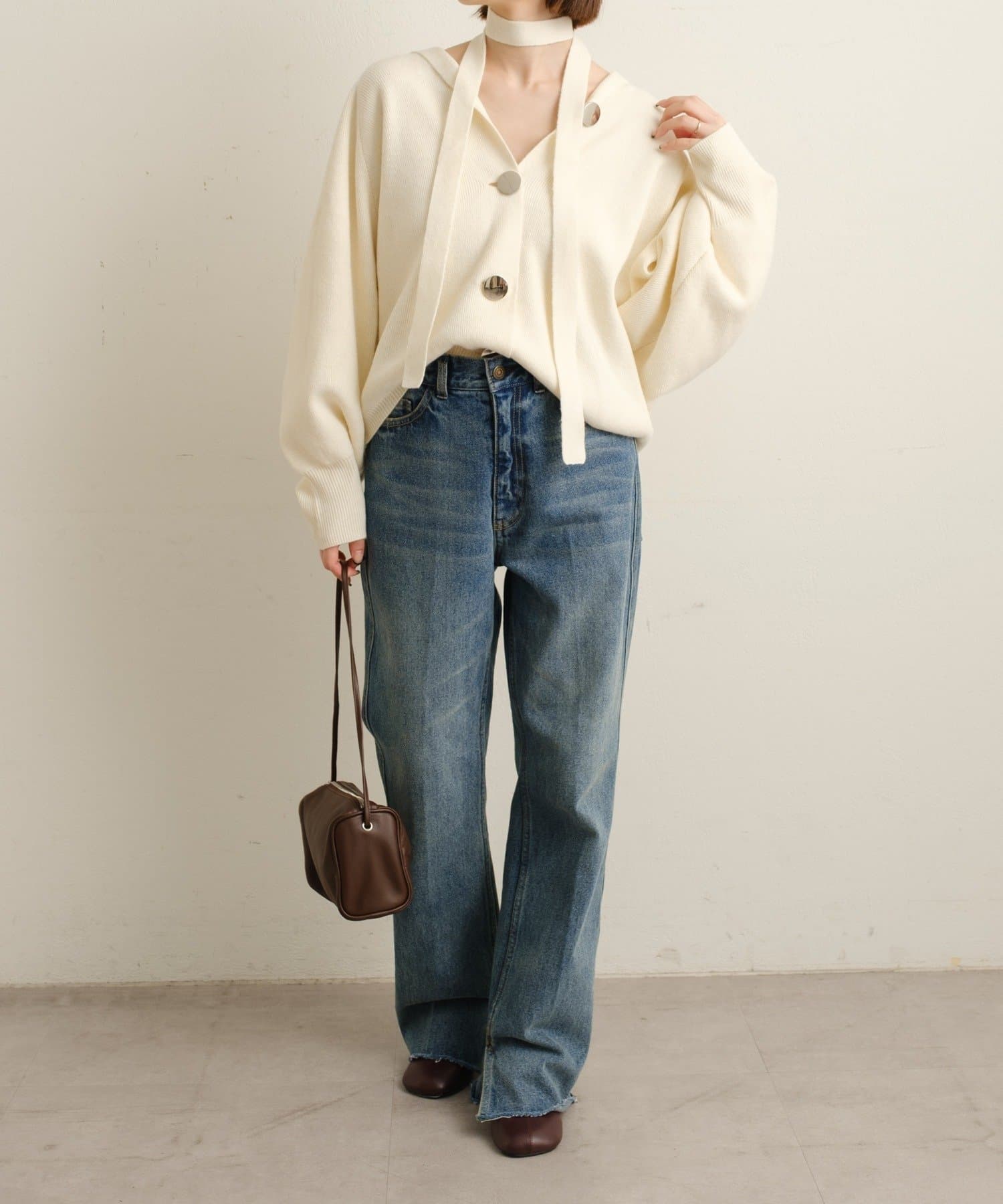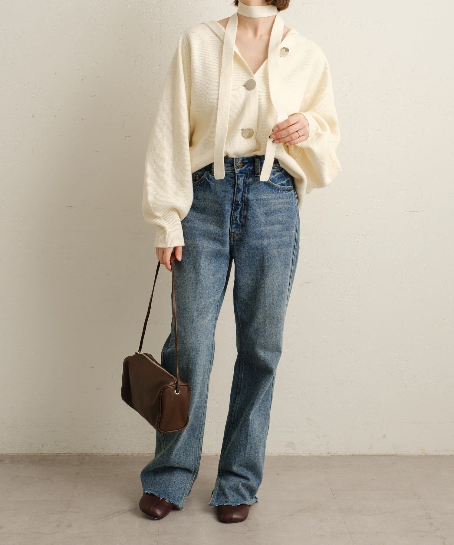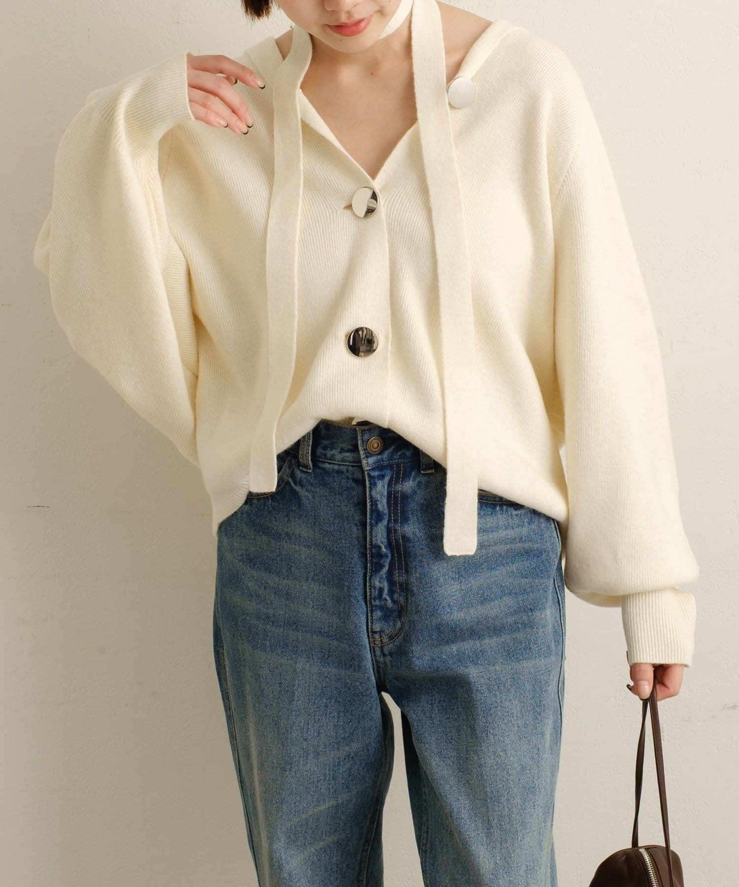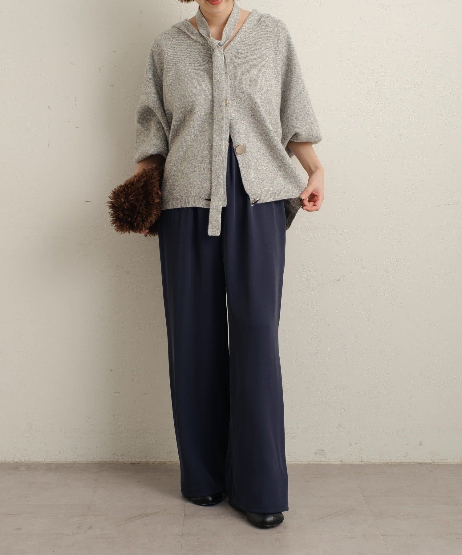 ・シルバーボタンとベルトがアクセントになったフーディニットカーディガン。