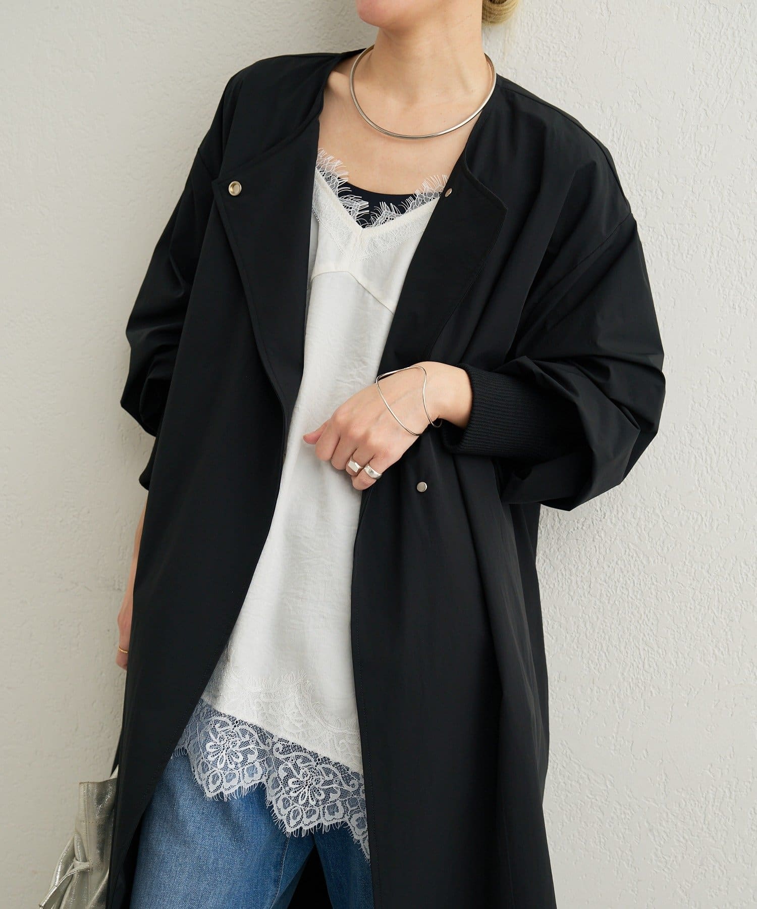・ノーカラーデザインが首回りをすっきりと見せてくれて、アクセサリーや小物が映える一着。