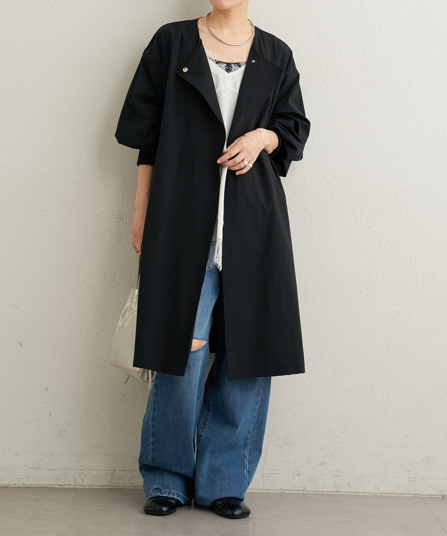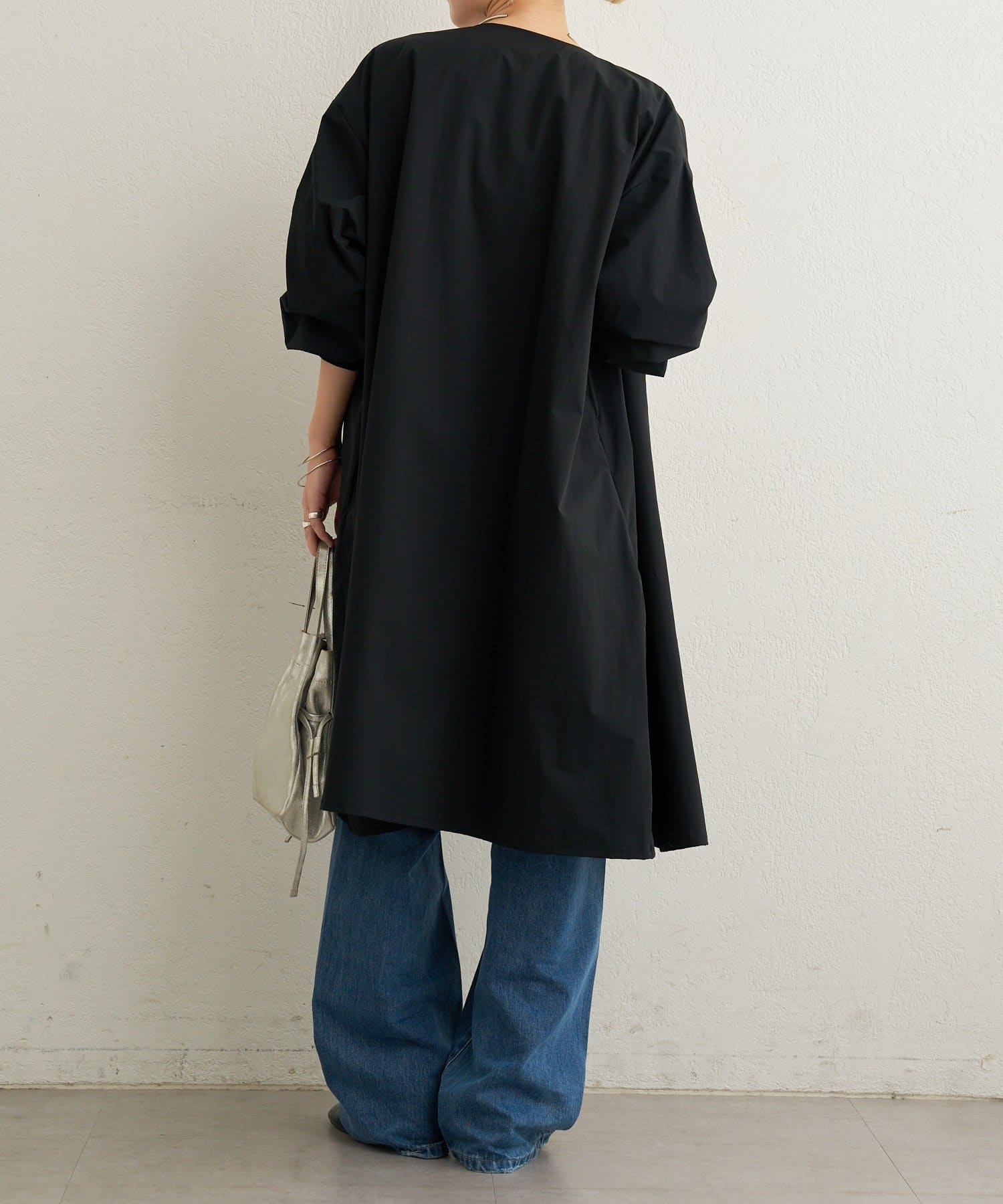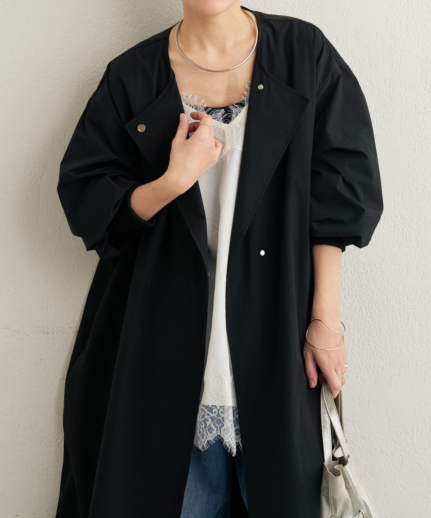 ・袖口の太めのリブとバルーンデザインがアクセントになるトレンチコート