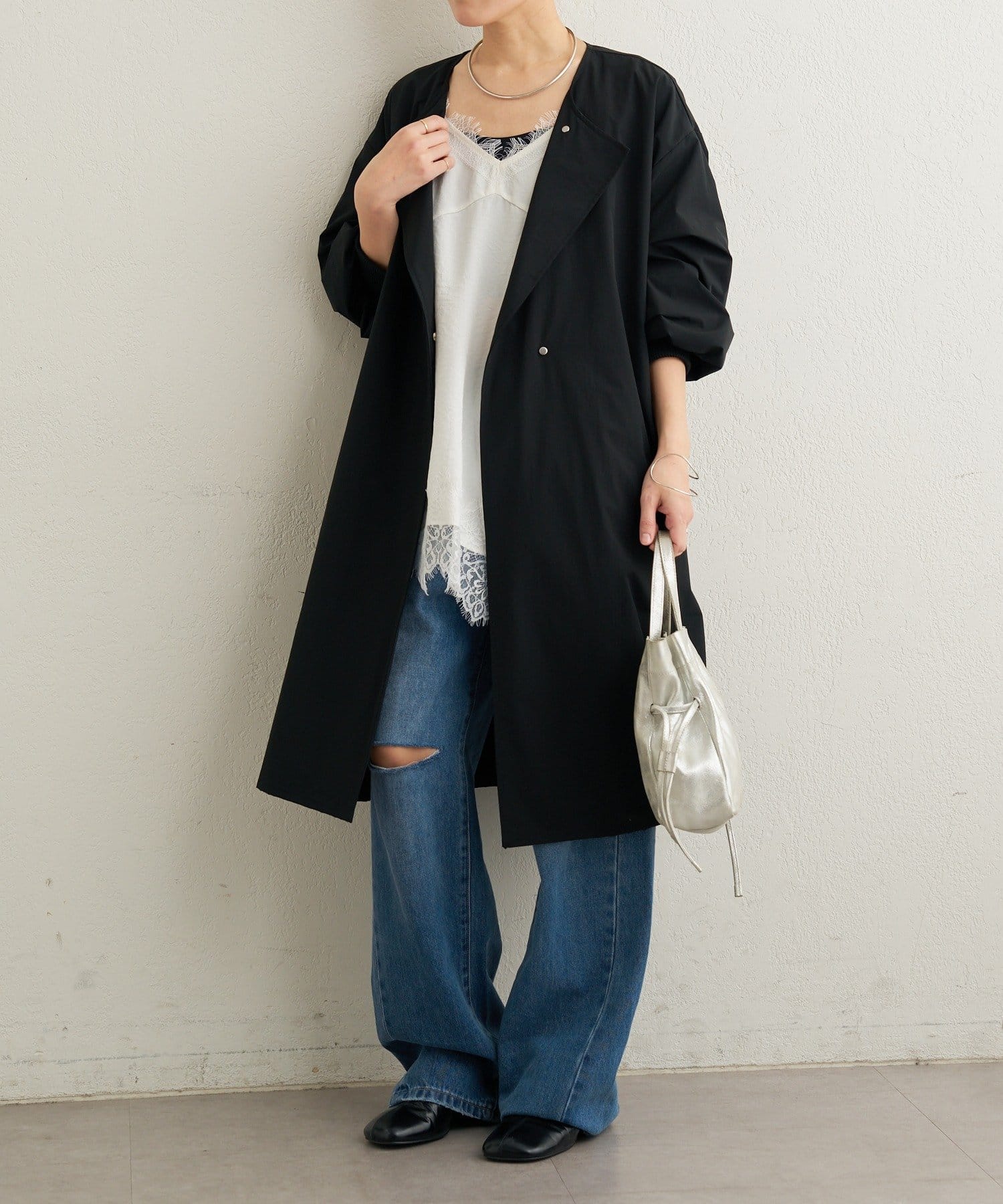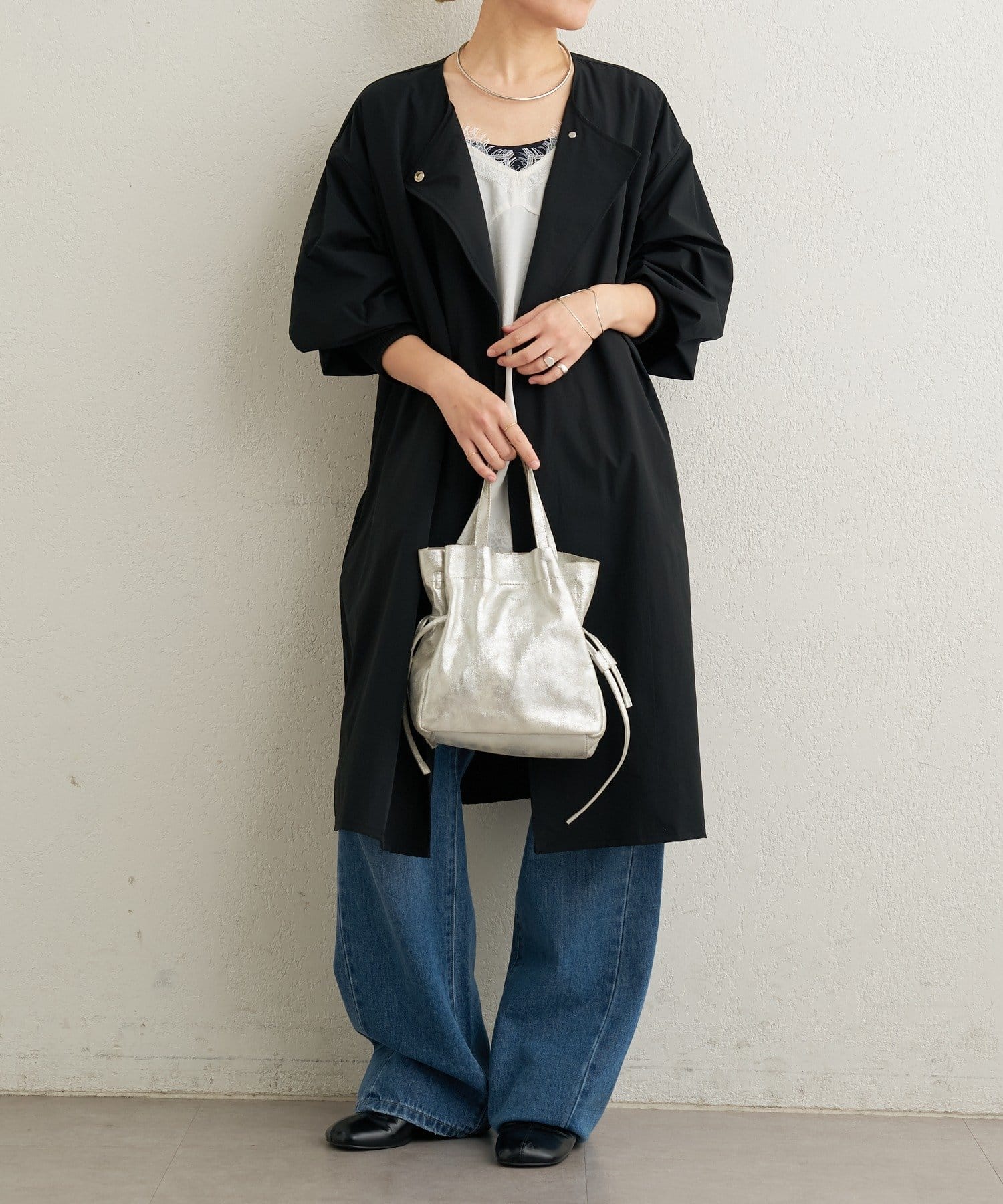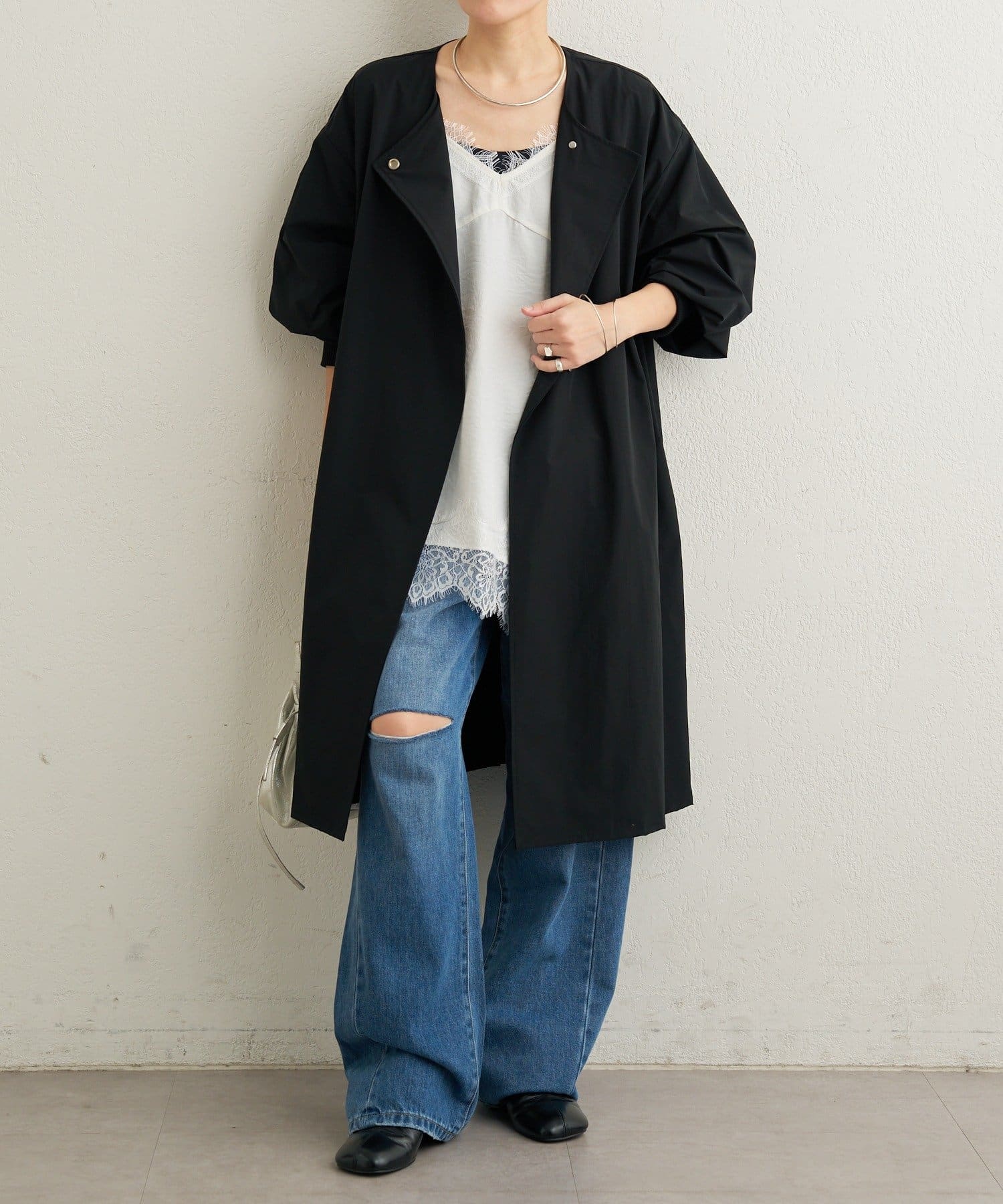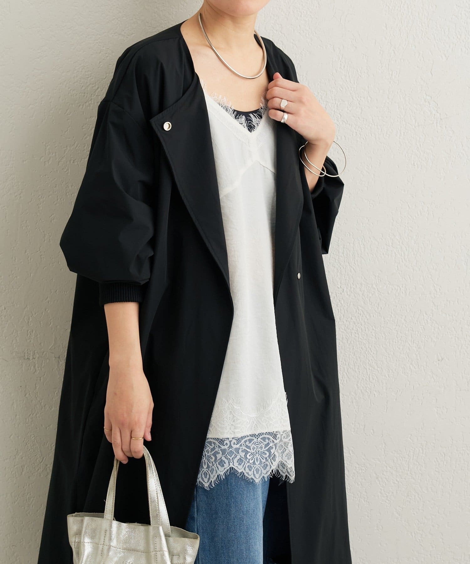 ・袖口の太めのリブとバルーンデザインがアクセントになるトレンチコート