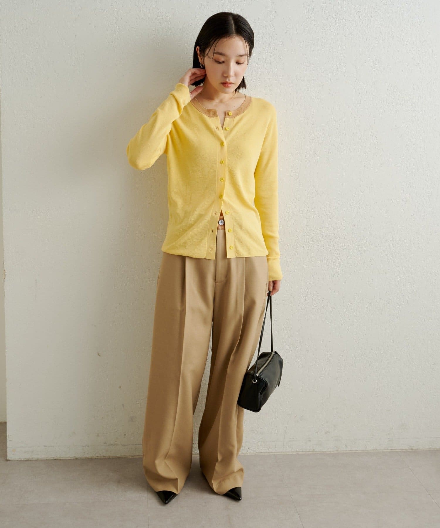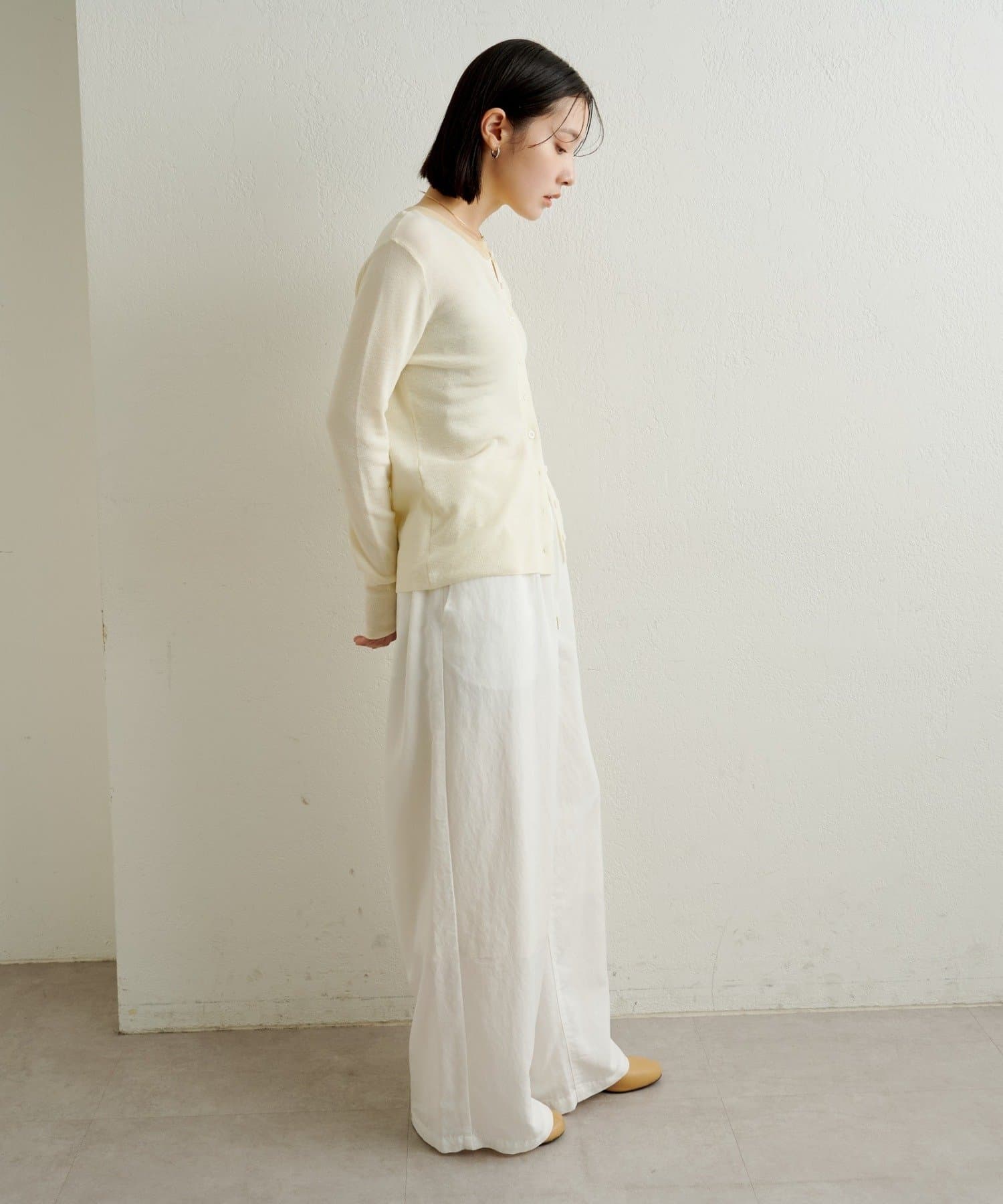 ・シアー素材がスタイリングに抜け感を与えてくれるニットカーディガン。
