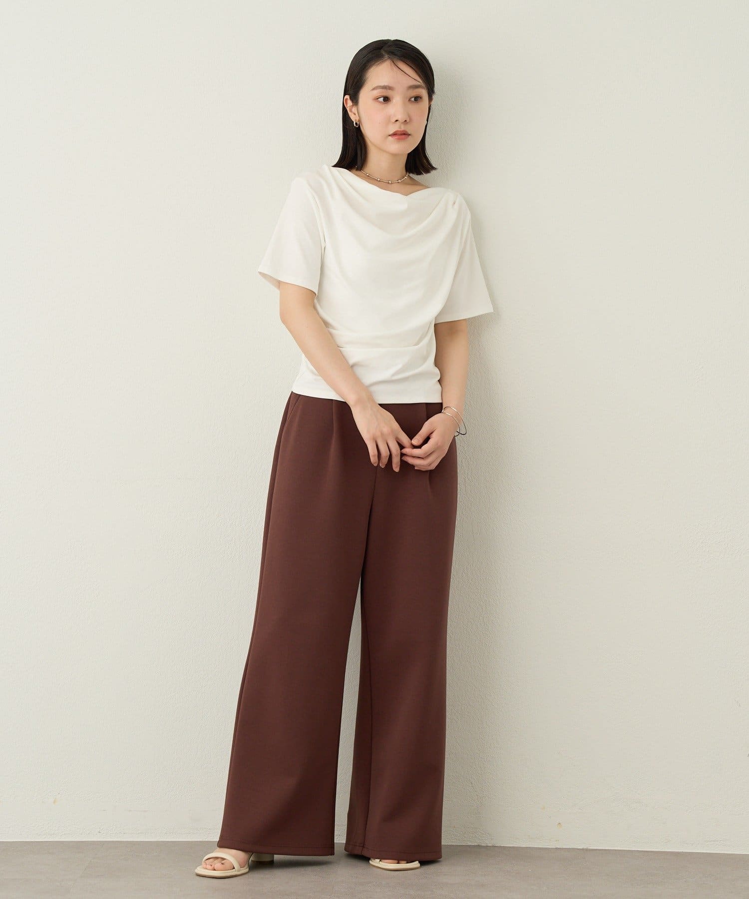 ・足元に向かってストンと落ちるシルエットとウエストのタックが、スッキリとしたラインを作ってくれるため、美脚効果も◎
