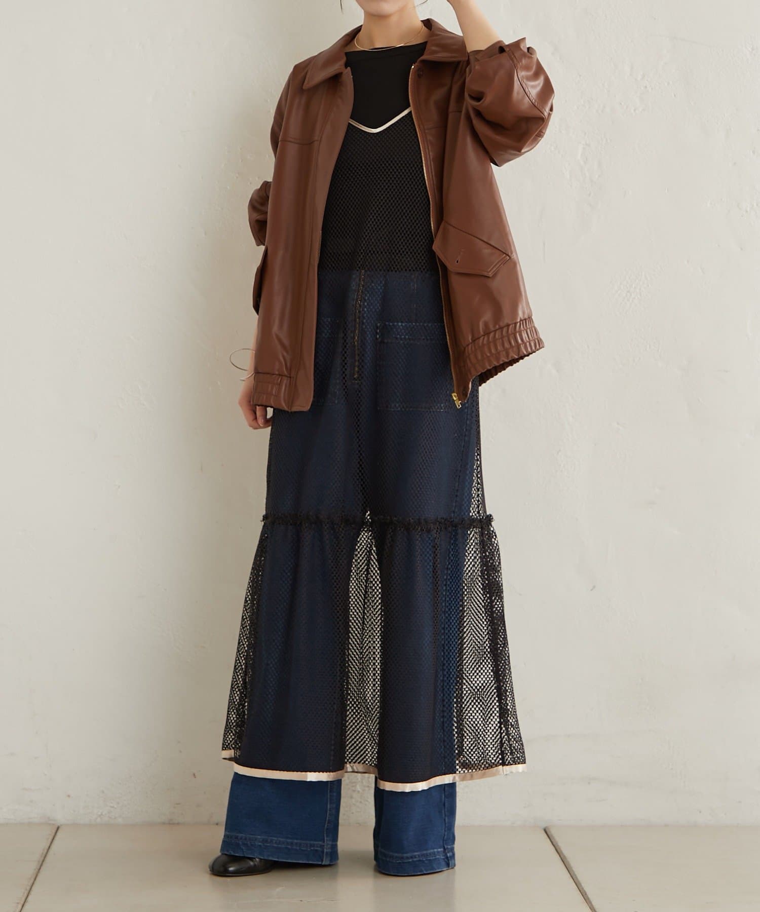 ・カジュアルなメッシュ素材ながら、裾に向かって広がるティアードデザインが女性らしい一枚。