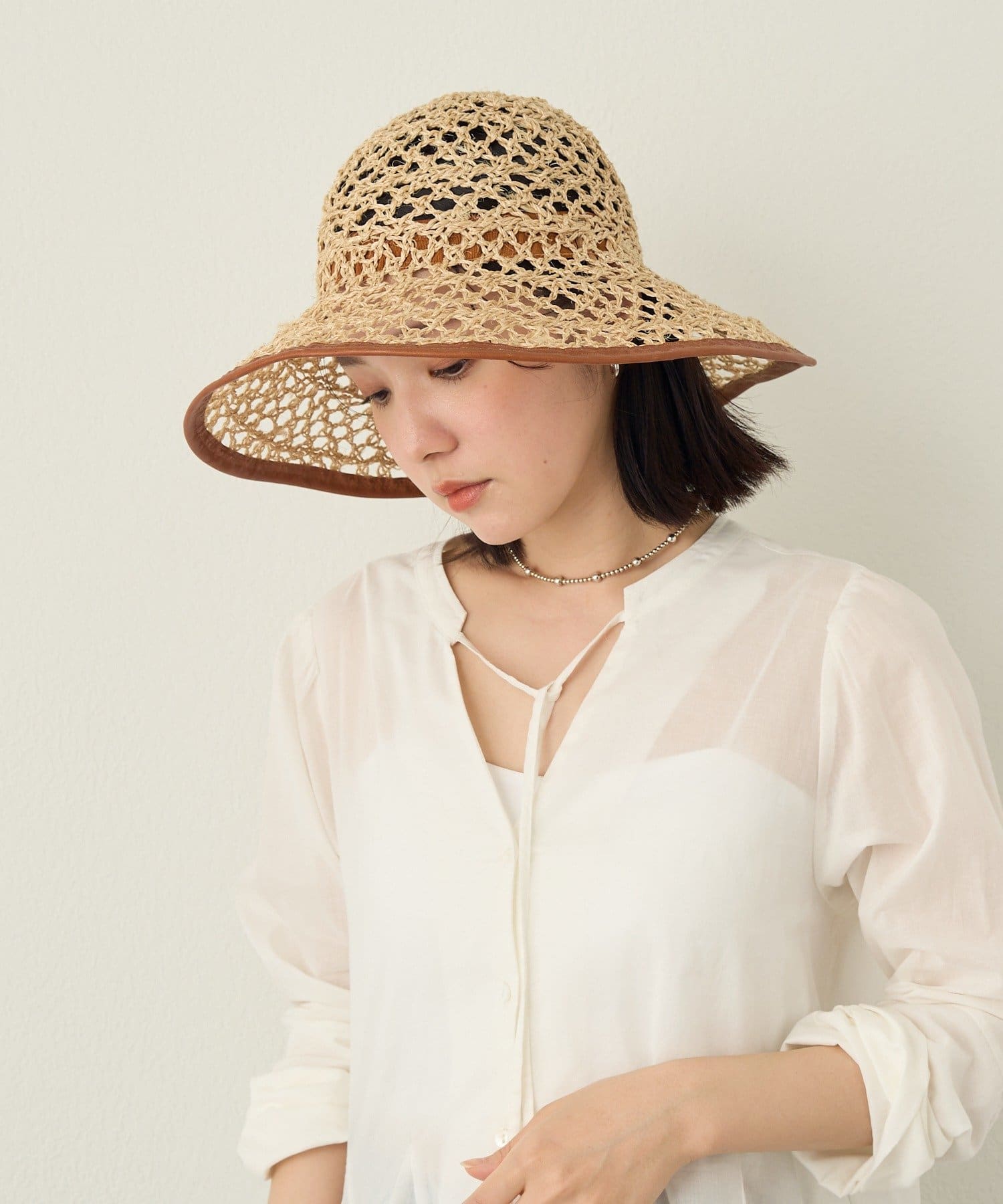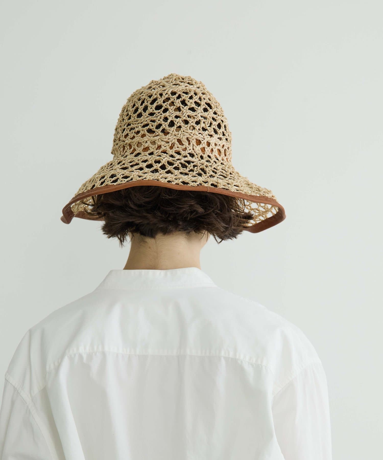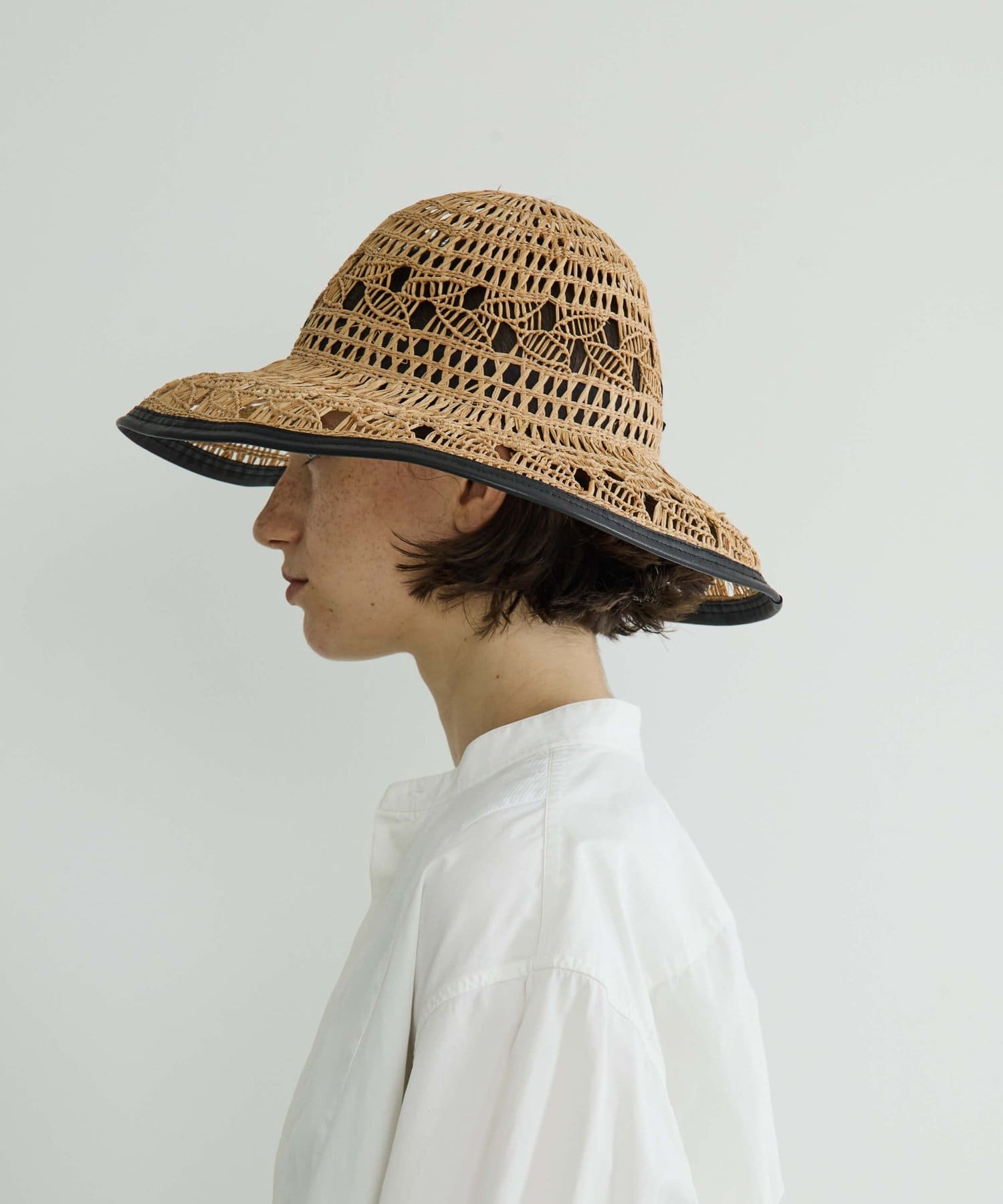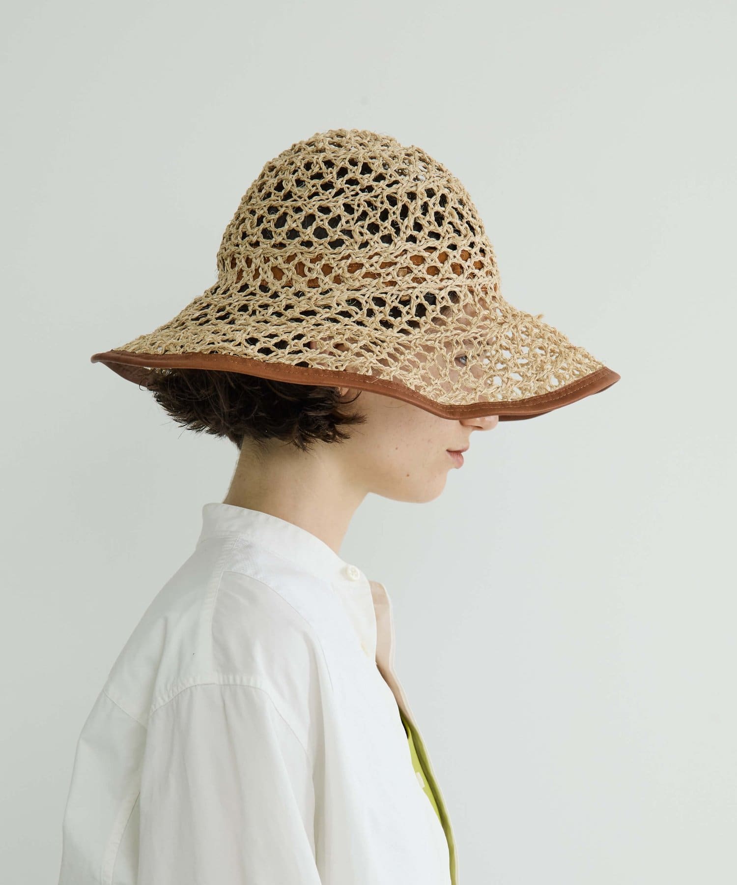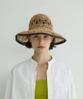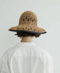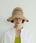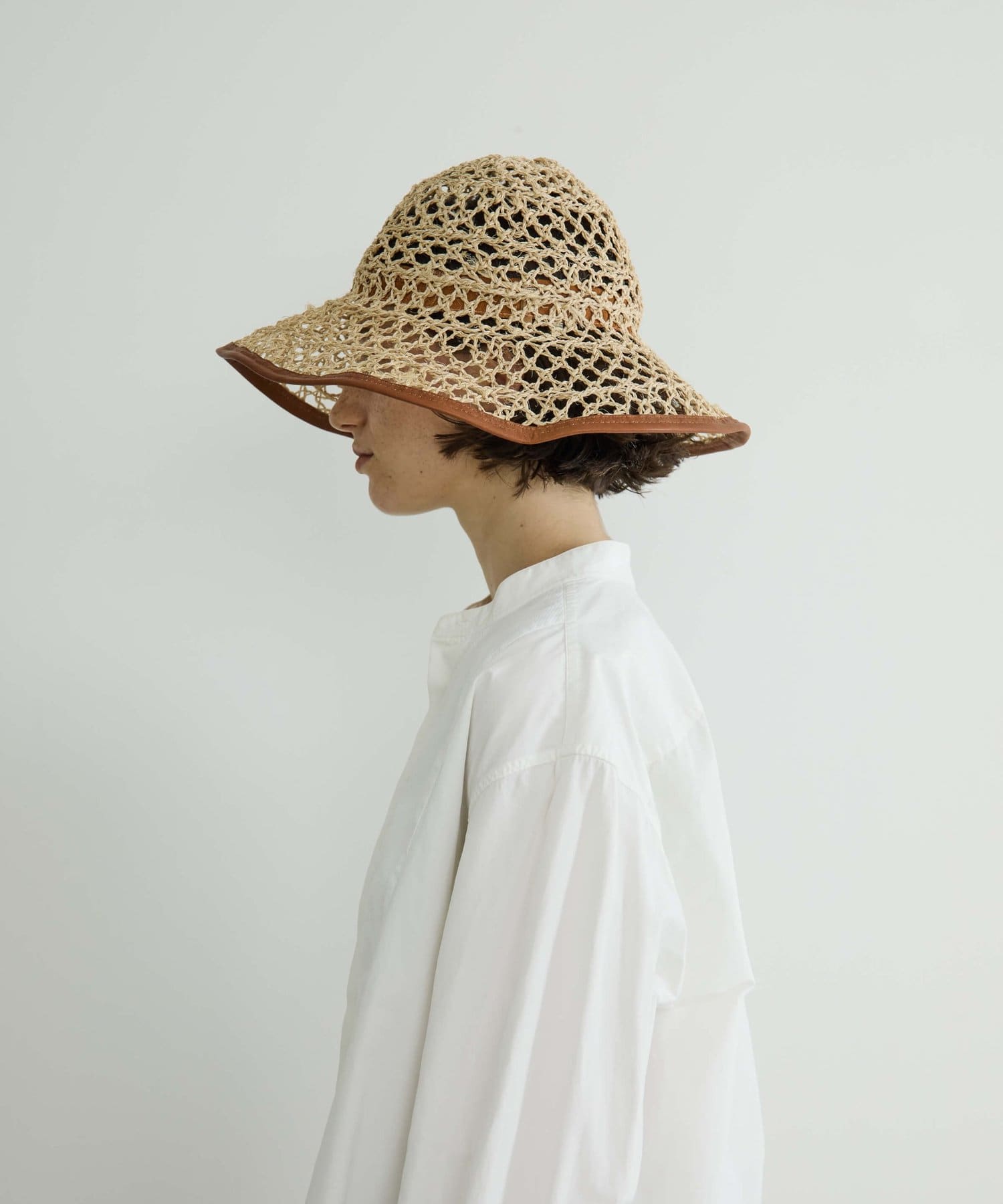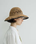 繊細な編み目が美しい、デッドストックの手編み帽体を使用した、アクセサリーのような印象のダウンハット。ブリム端には牛革のパイピングを施し、さりげないアクセントに。さらに、ブリムにはワイヤーを仕込むことで、フォルムに表情をつけることができます。編み目を通り抜ける風や、木漏れ日のように落ちる影が、薄着になる季節に涼しげな表情を演出してくれます。折りたたみ可能で、持ち運びにも便利。