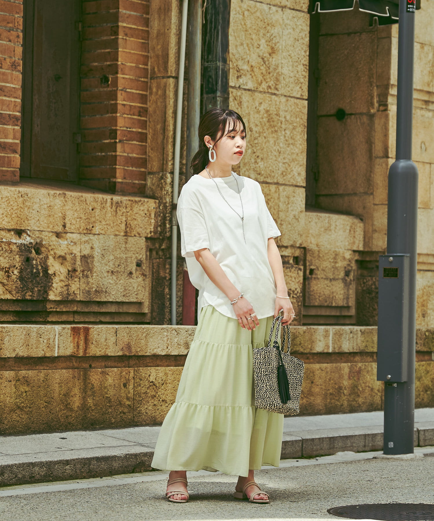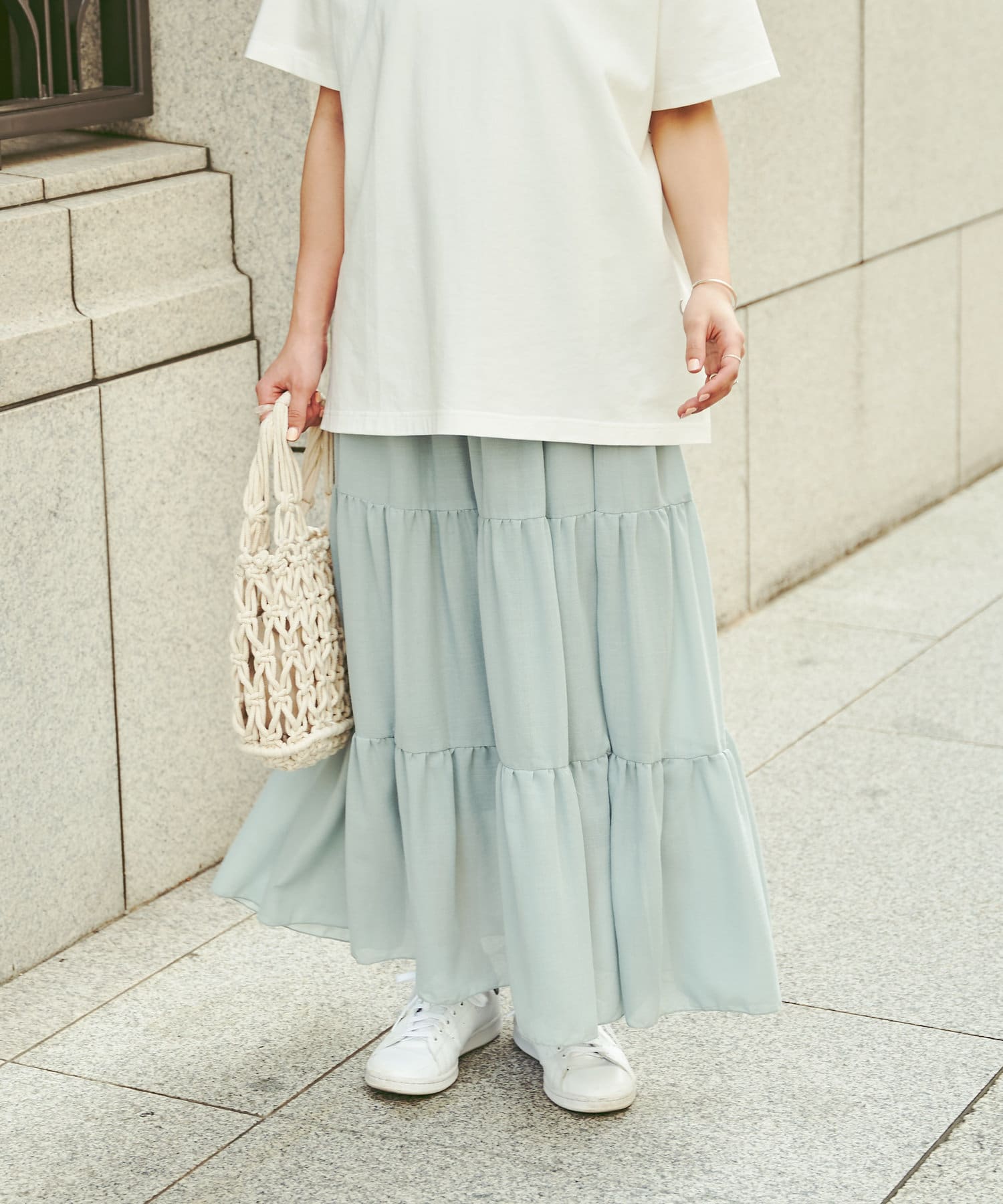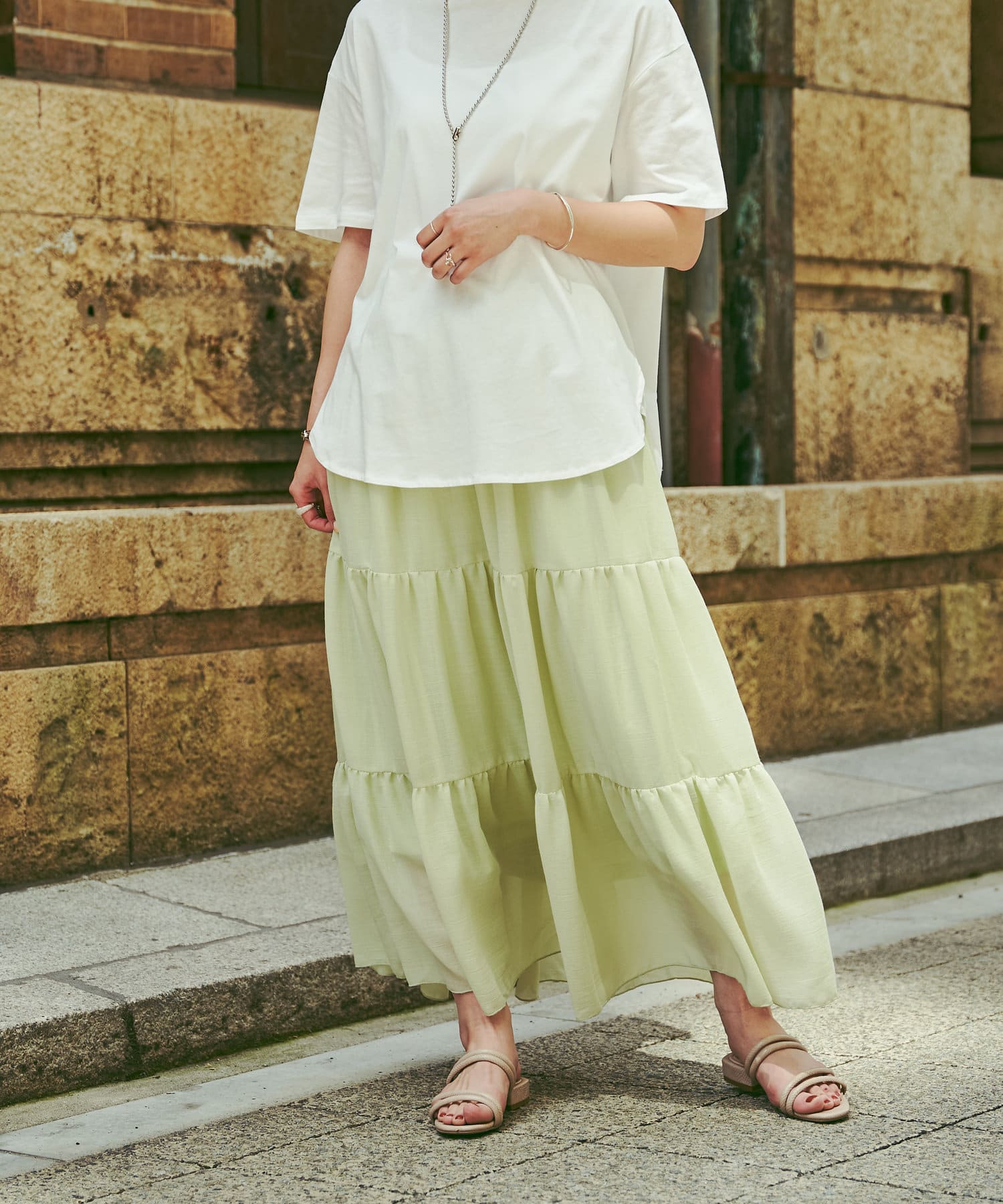 今年トレンドのティアードスカート。ふんわりしてデザインが女性らしい印象に◎