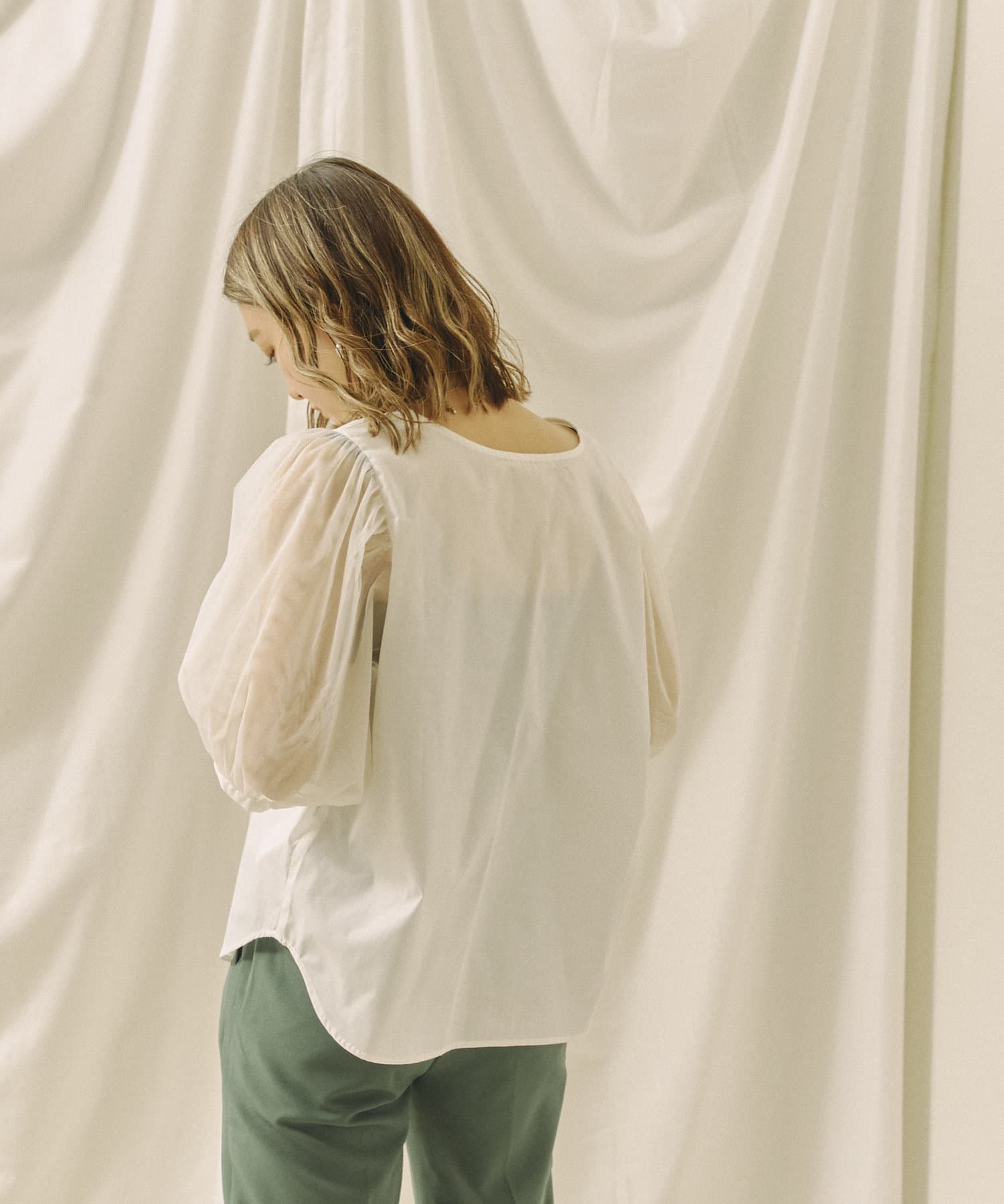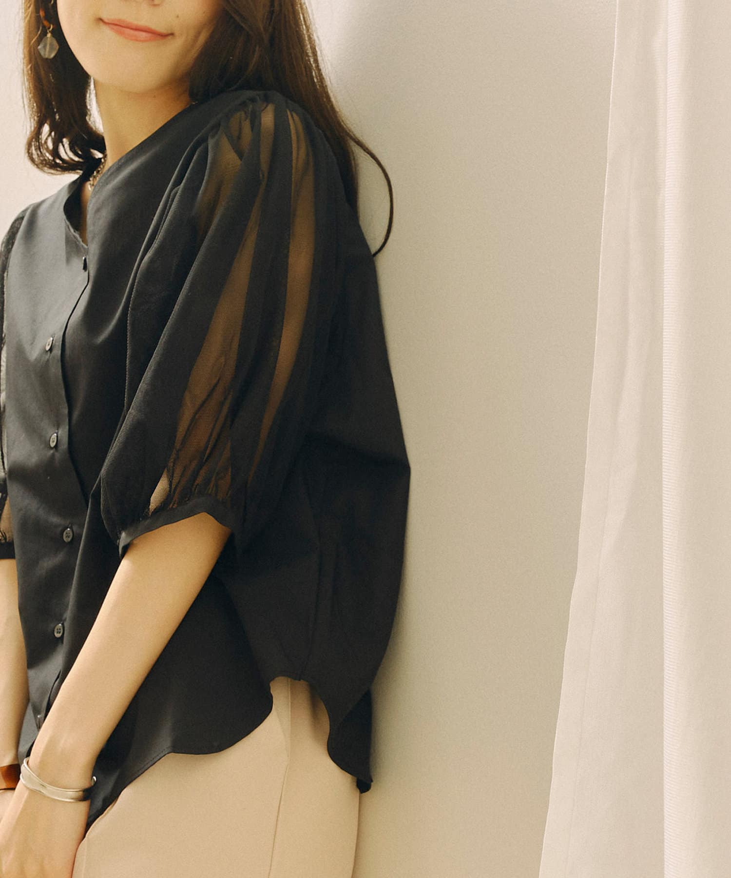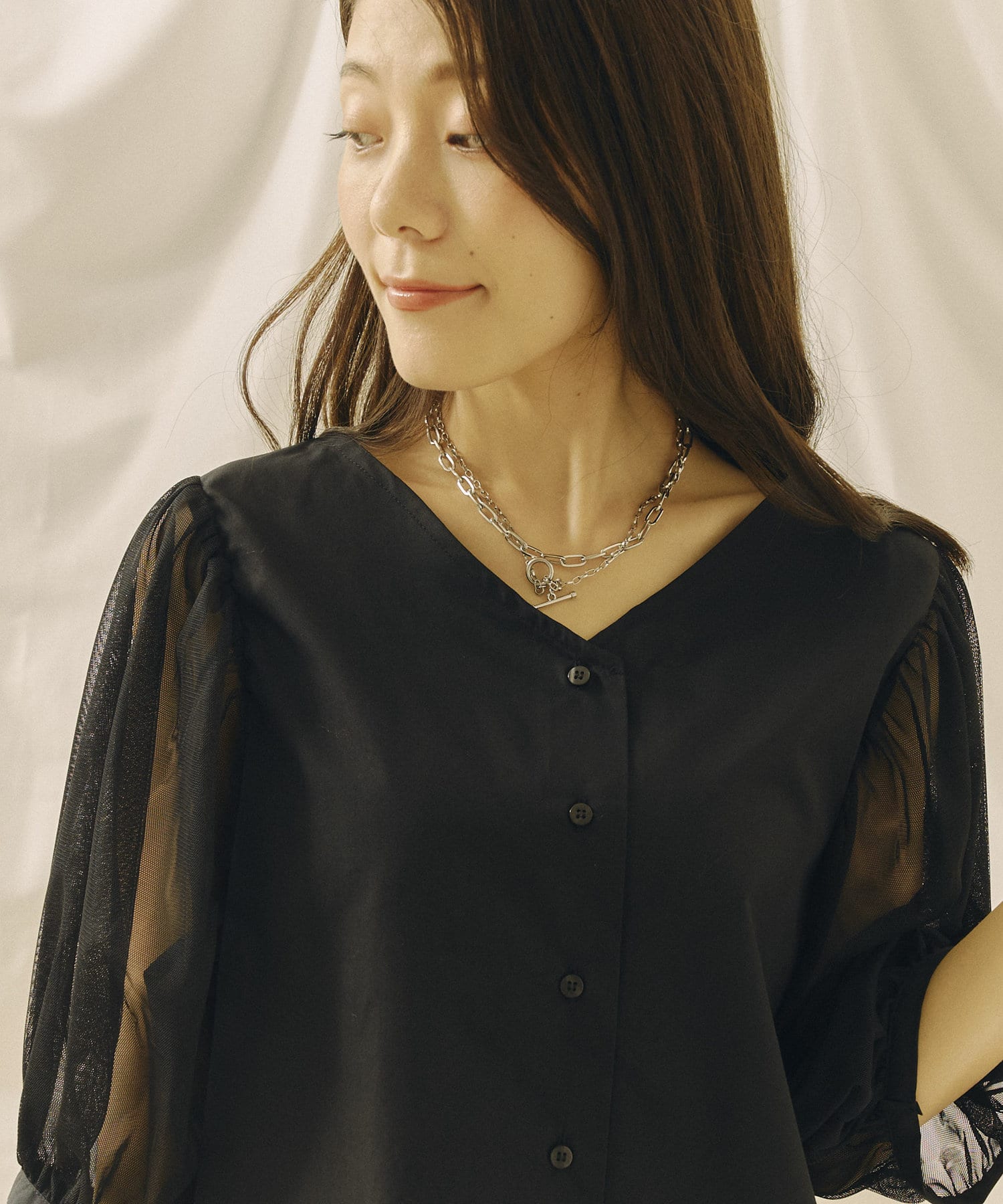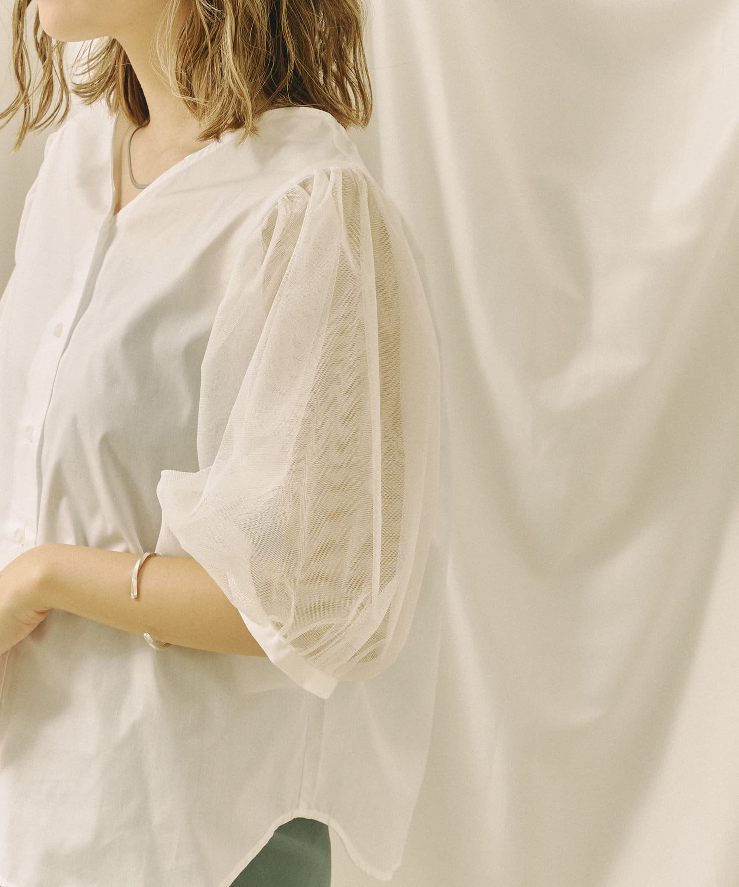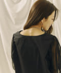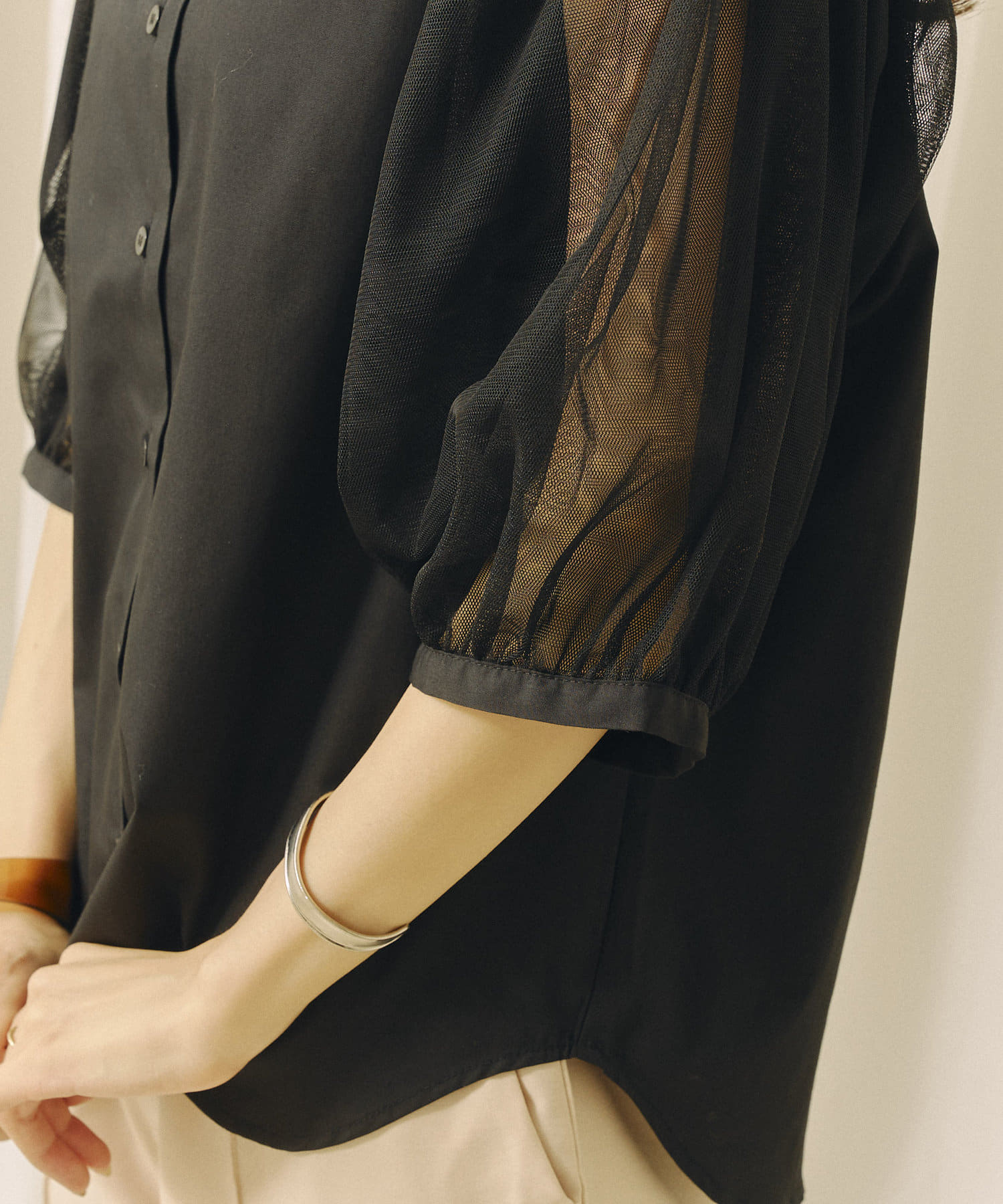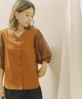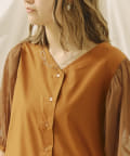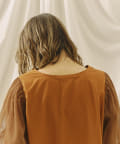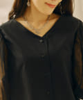 チュール袖がポイントのブラウス。首元スッキリ見えるデザインです。