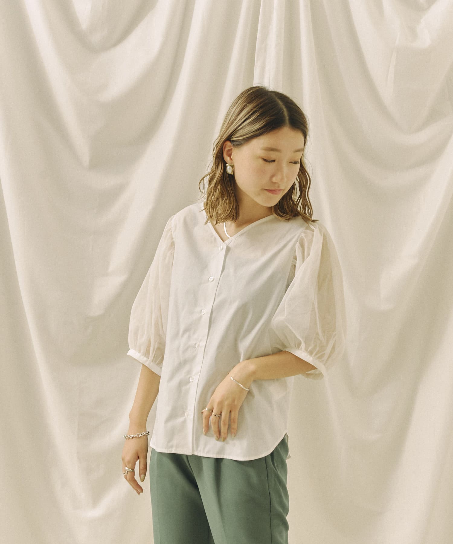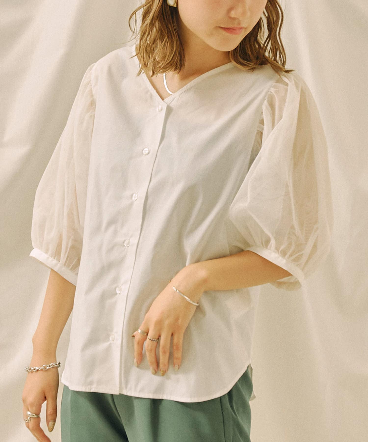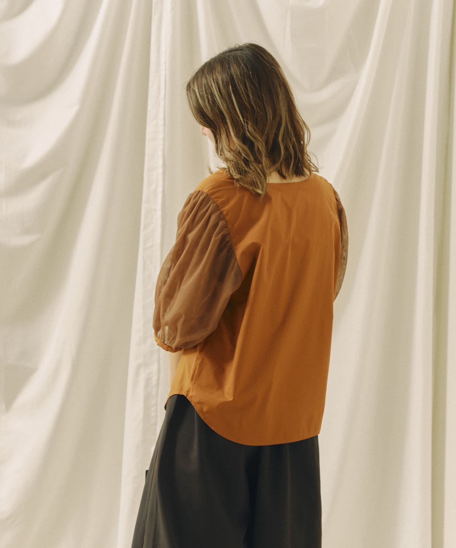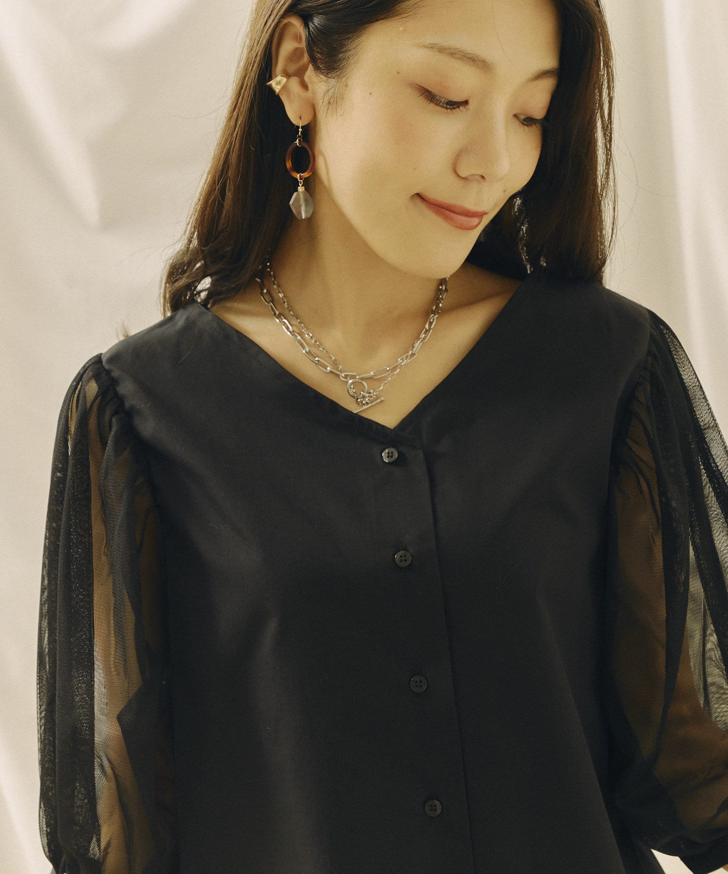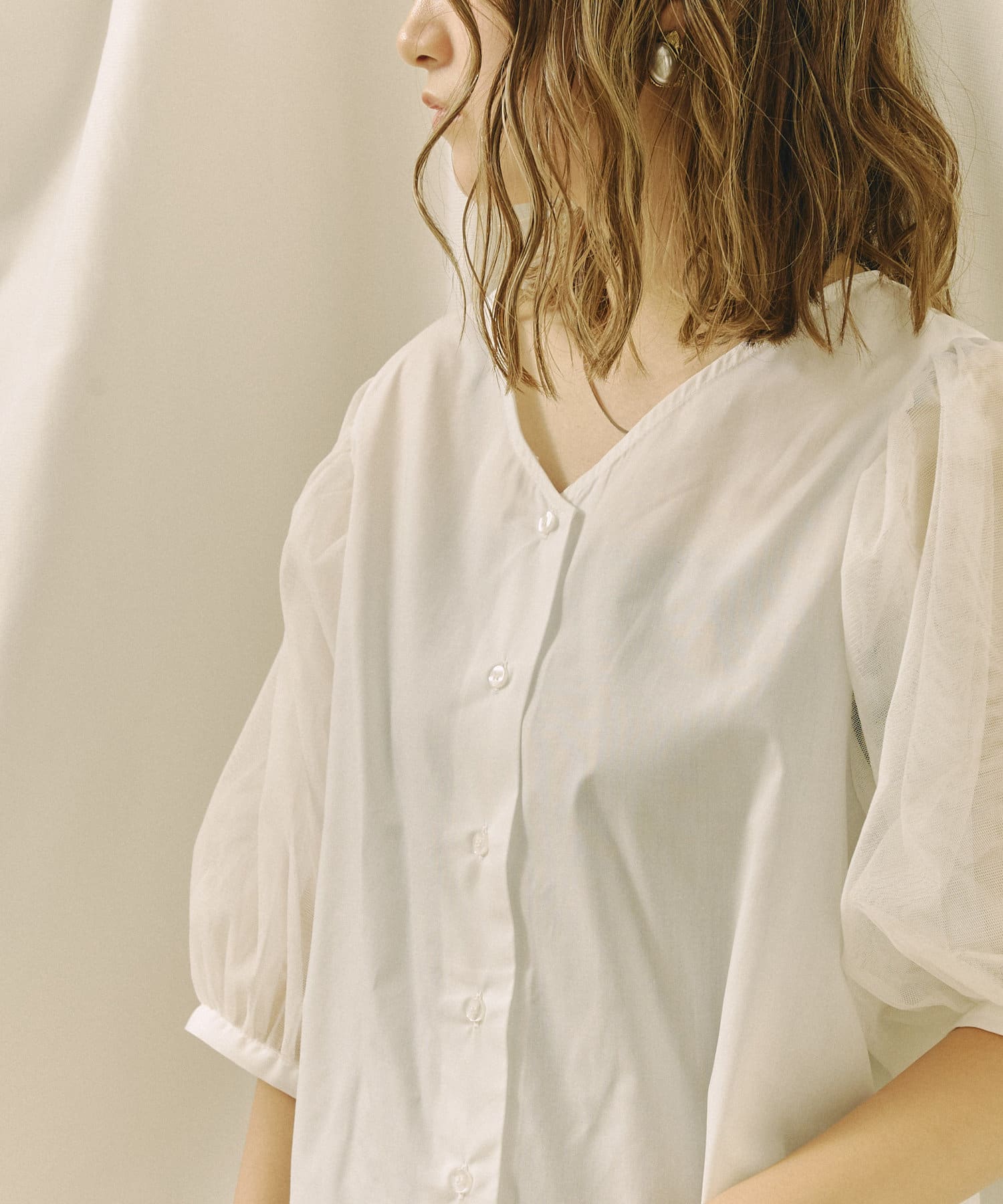チュール袖がポイントのブラウス。首元スッキリ見えるデザインです。