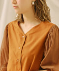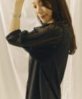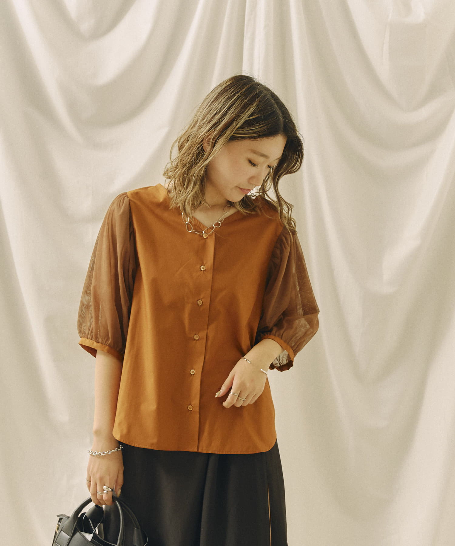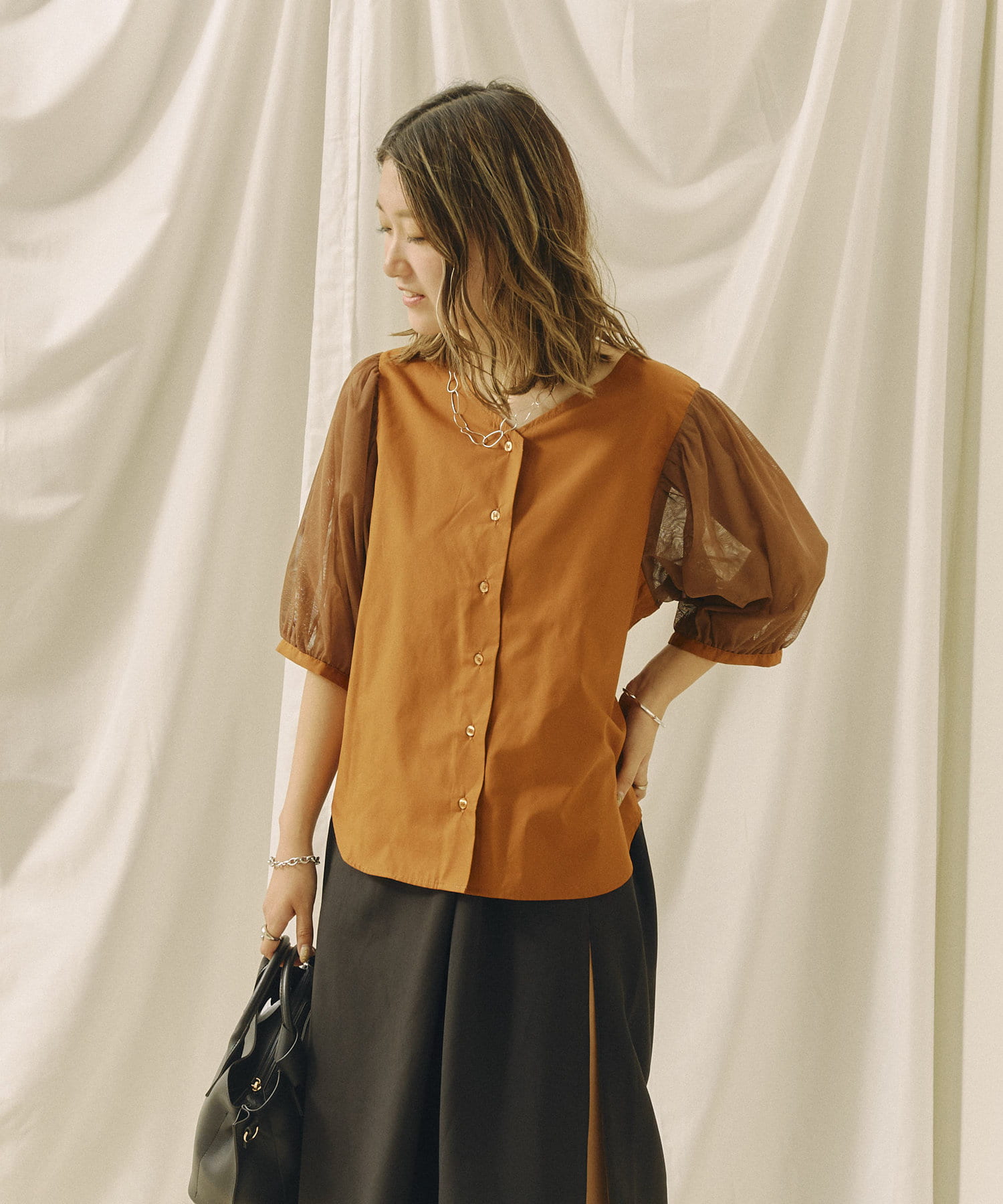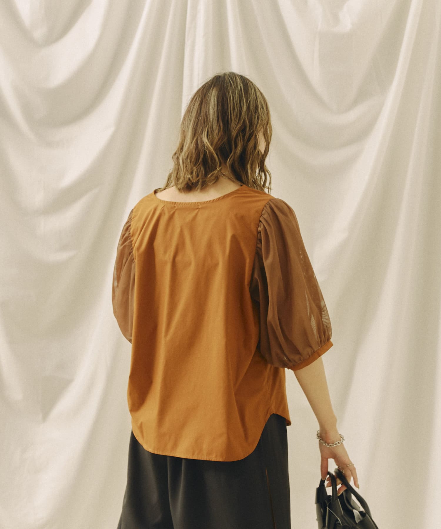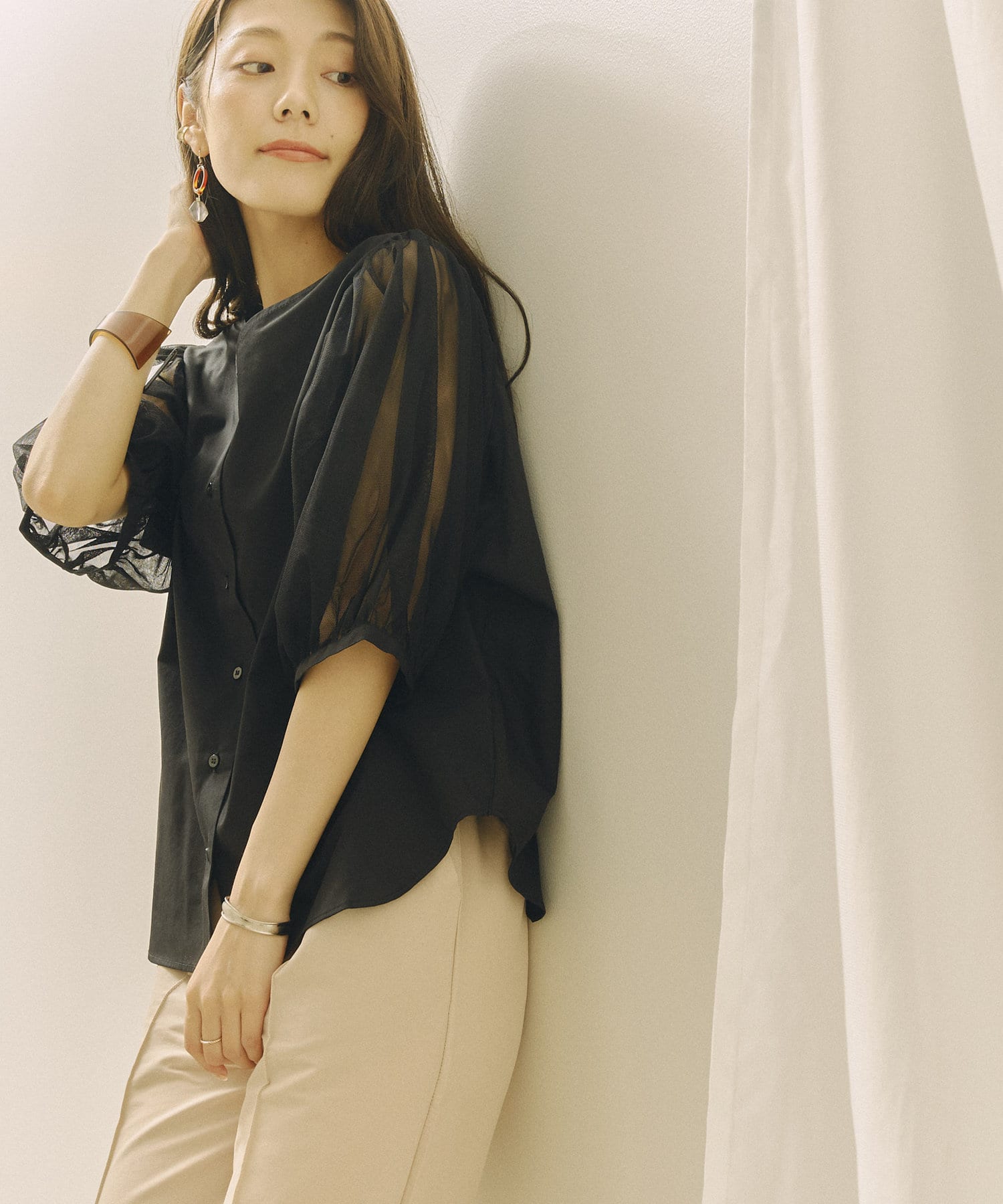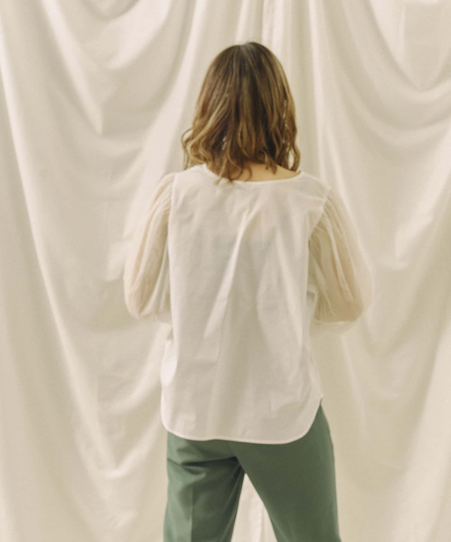 チュール袖がポイントのブラウス。首元スッキリ見えるデザインです。