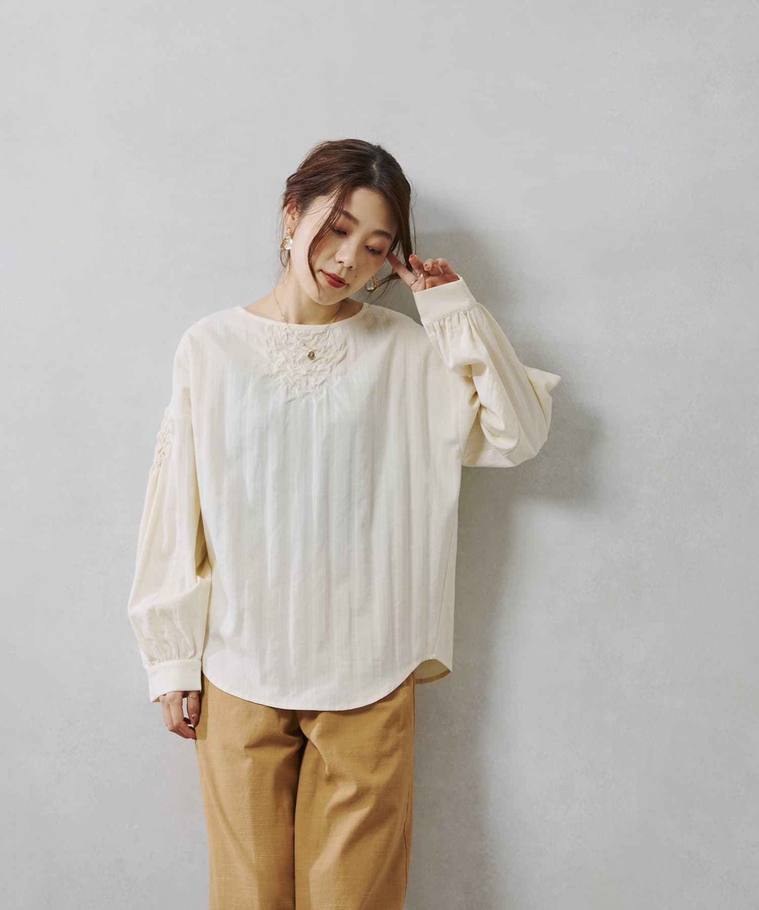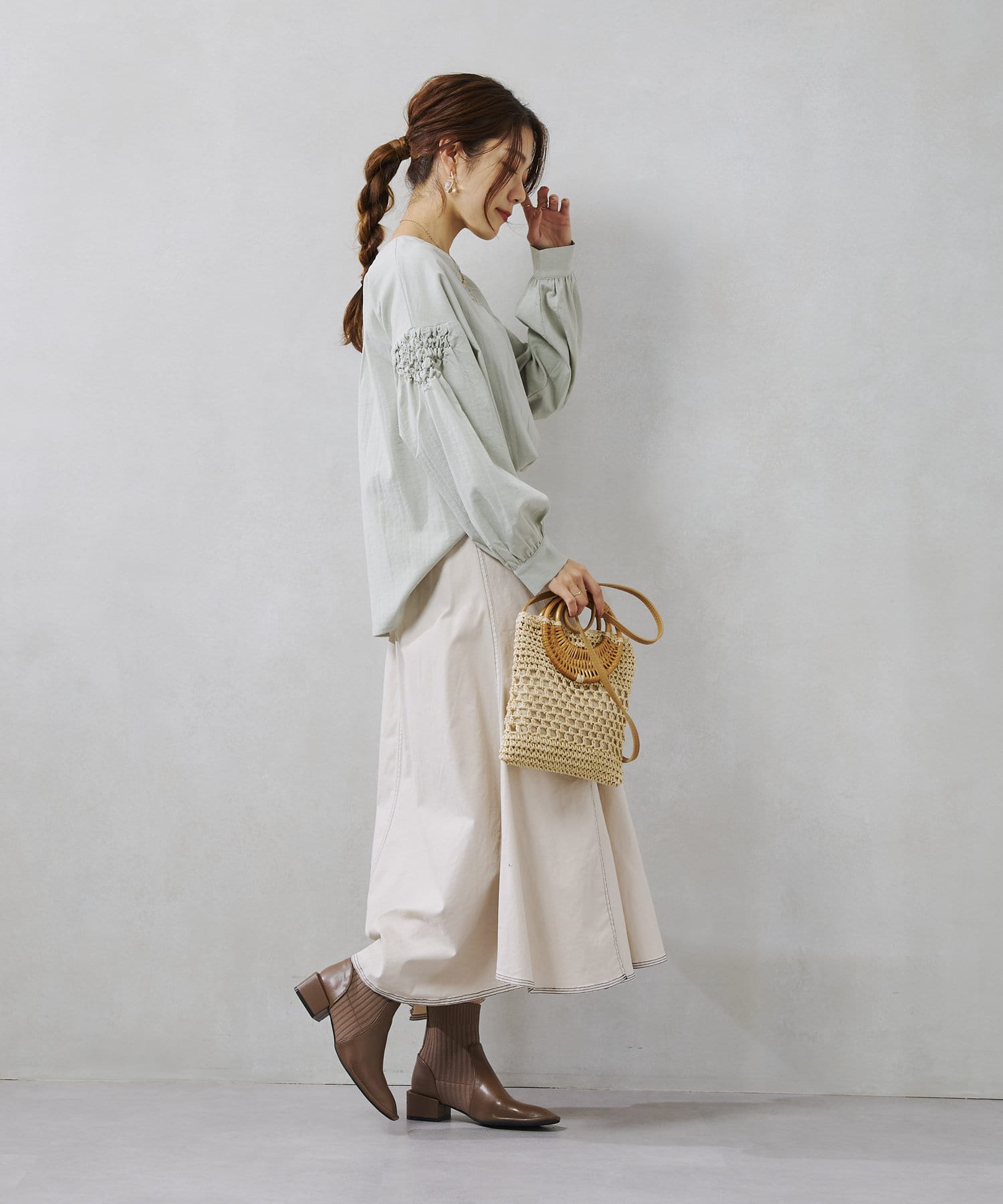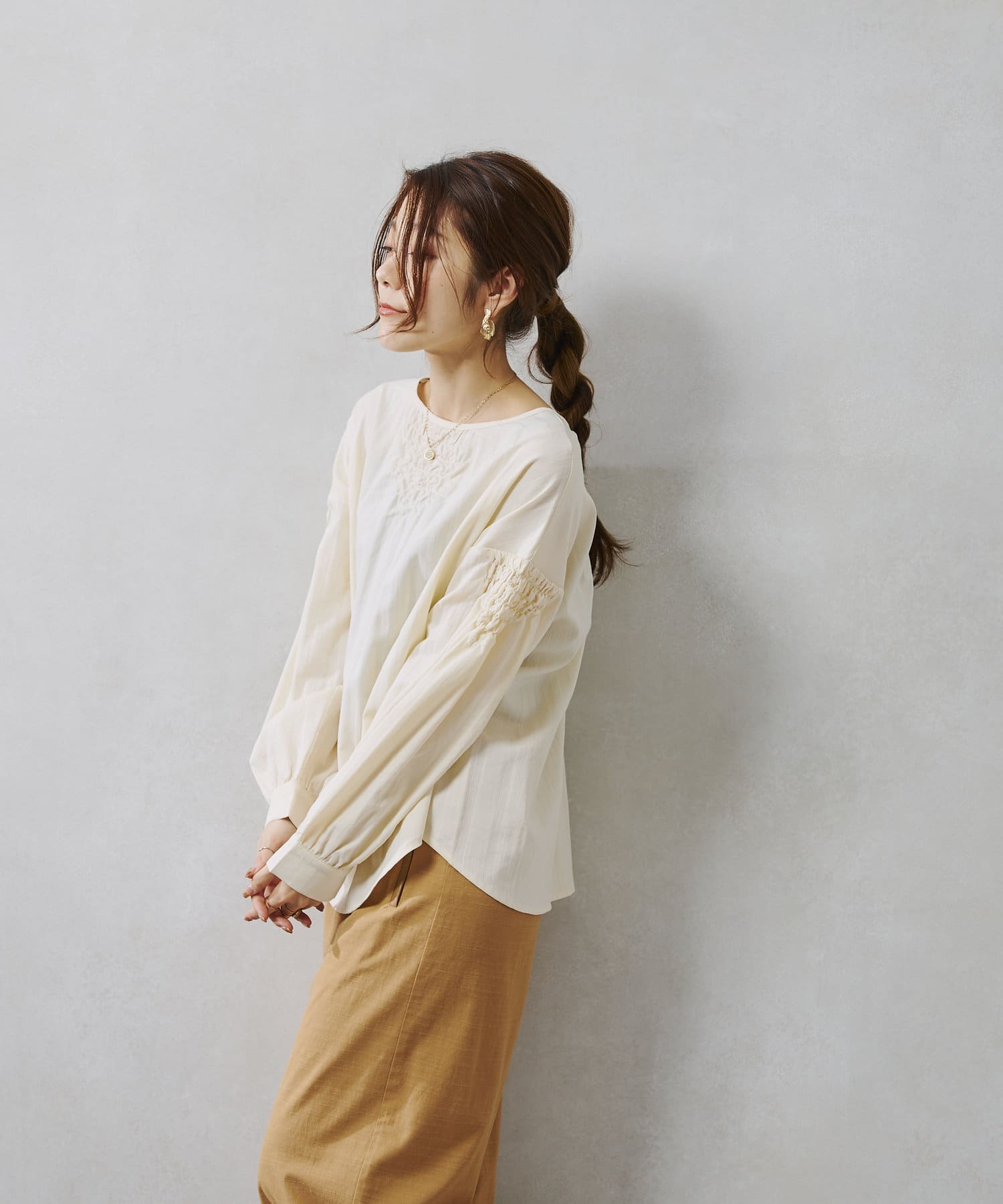 ・バブルシャーリングの刺繡入りでオトナフェミニンな雰囲気に。