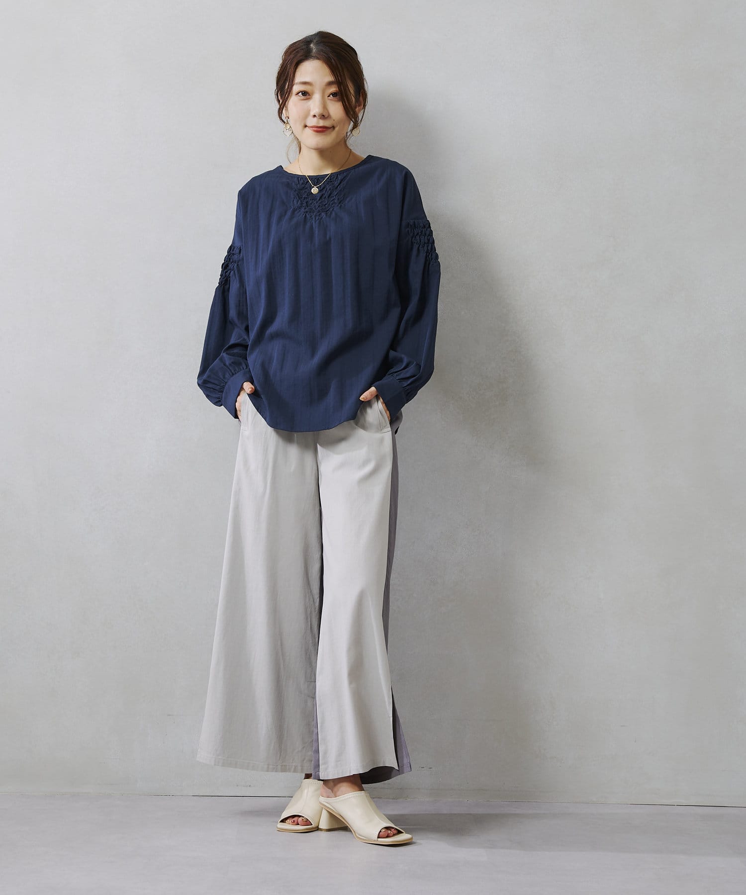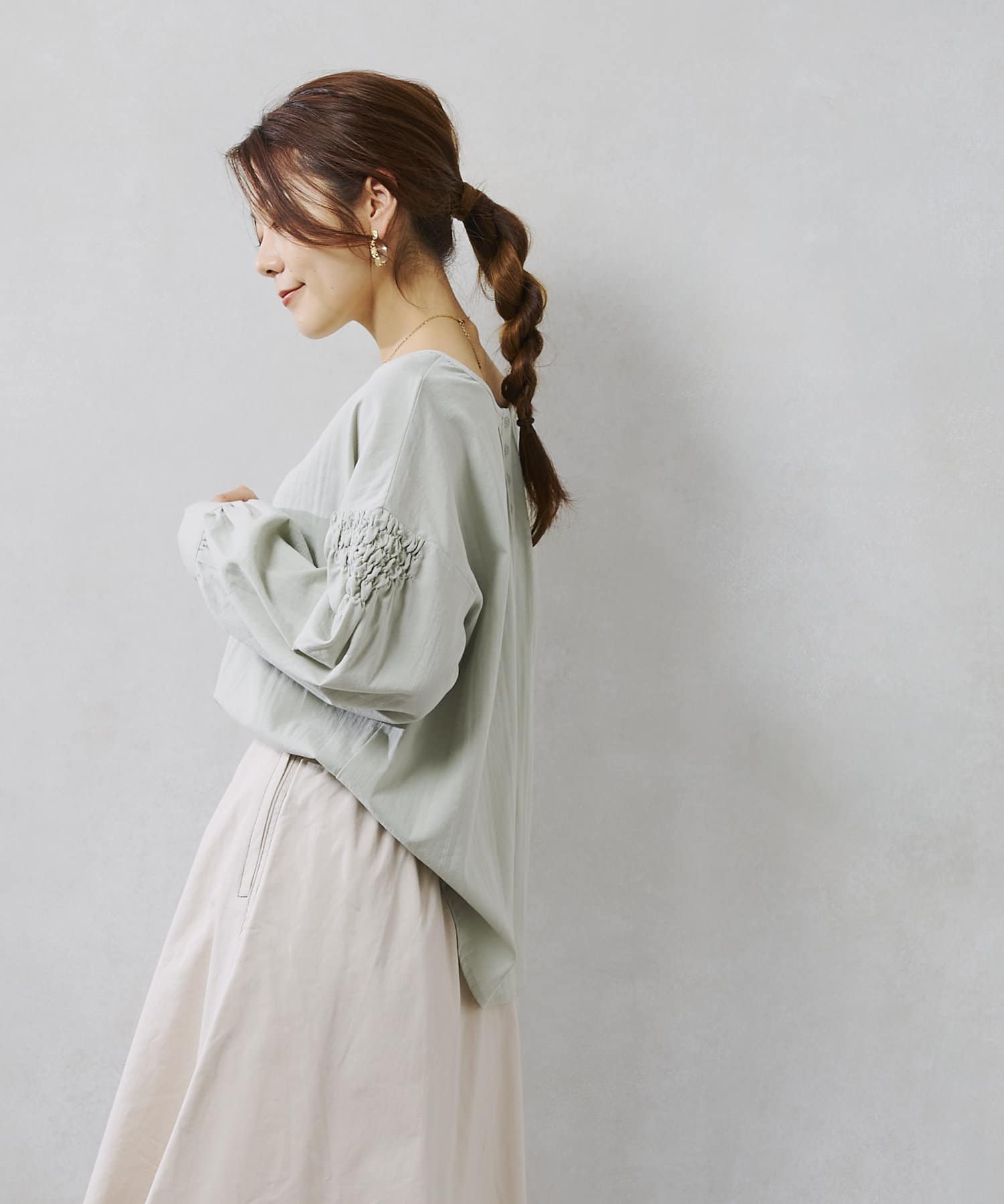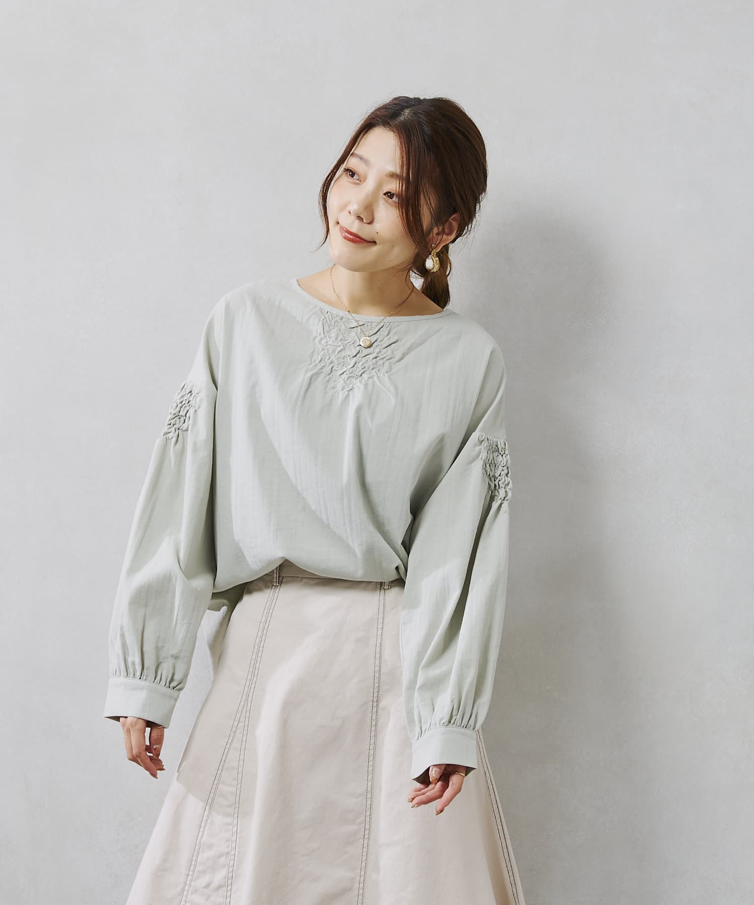 ・バブルシャーリングの刺繡入りでオトナフェミニンな雰囲気に。