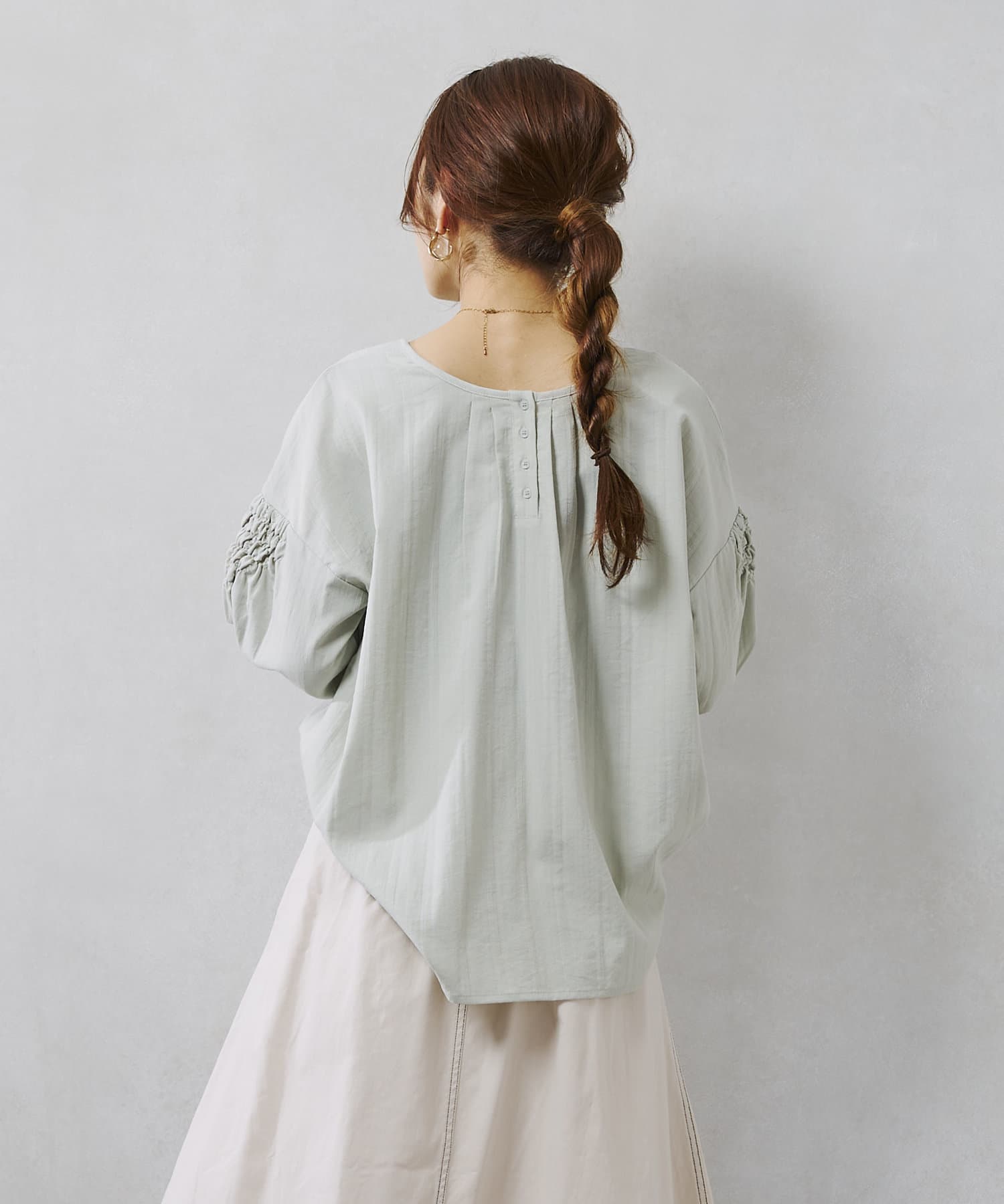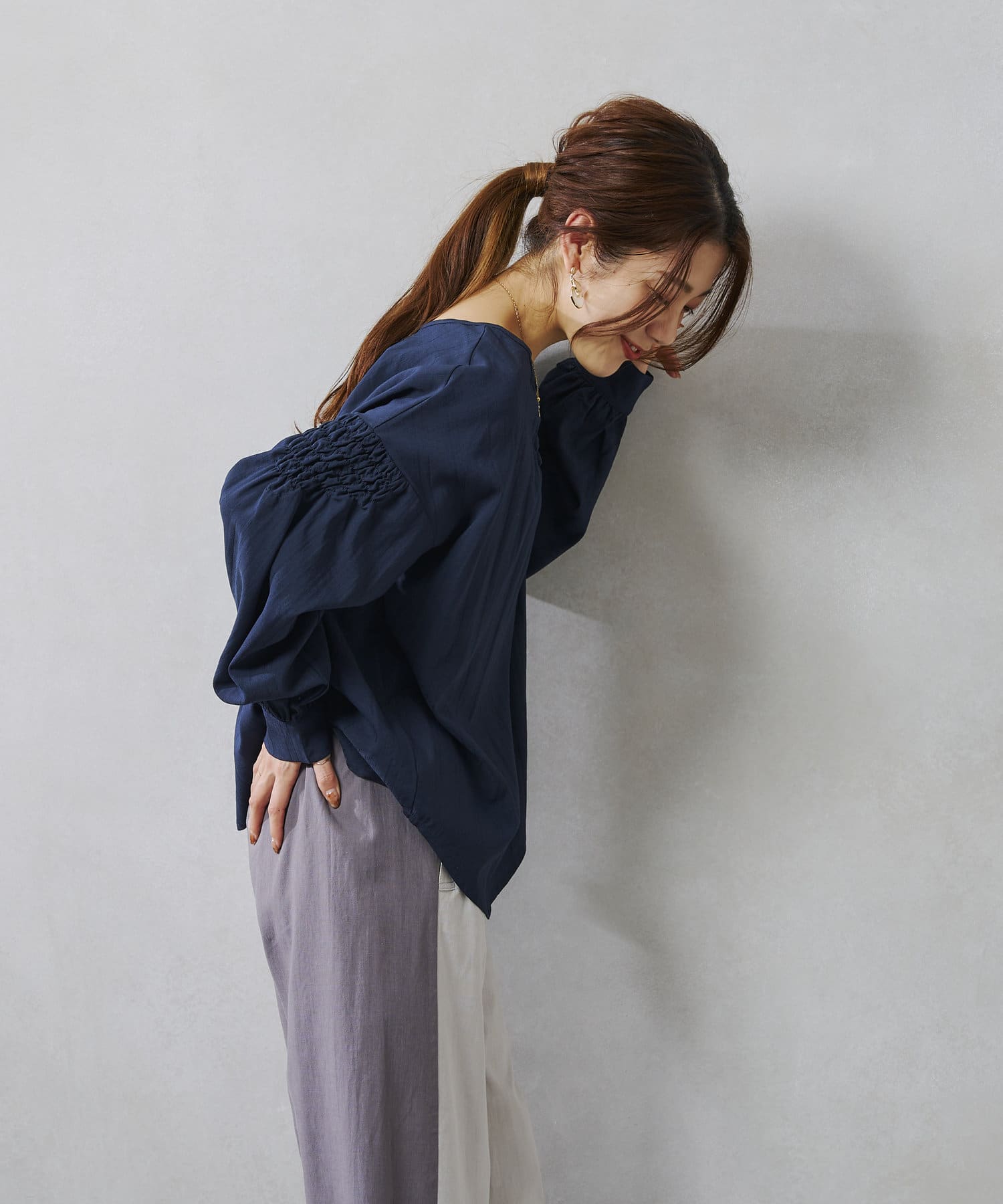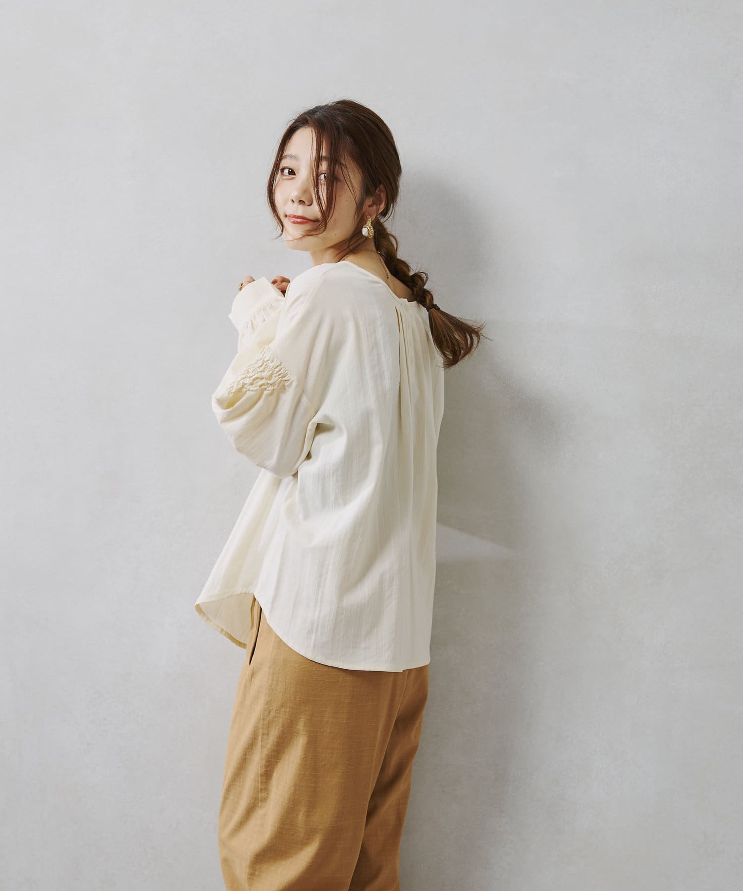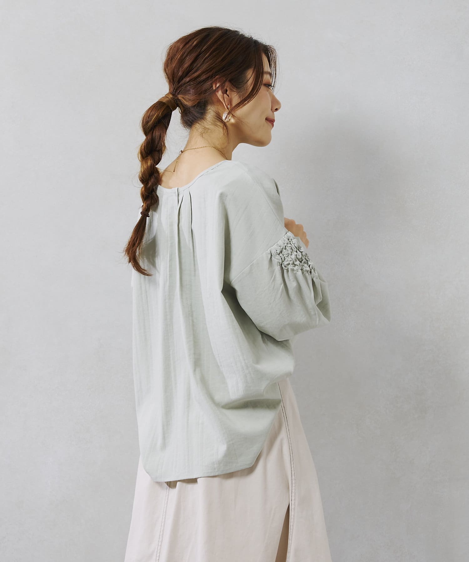・袖は少しボリューム感があり、シャーリングになったデザイン。