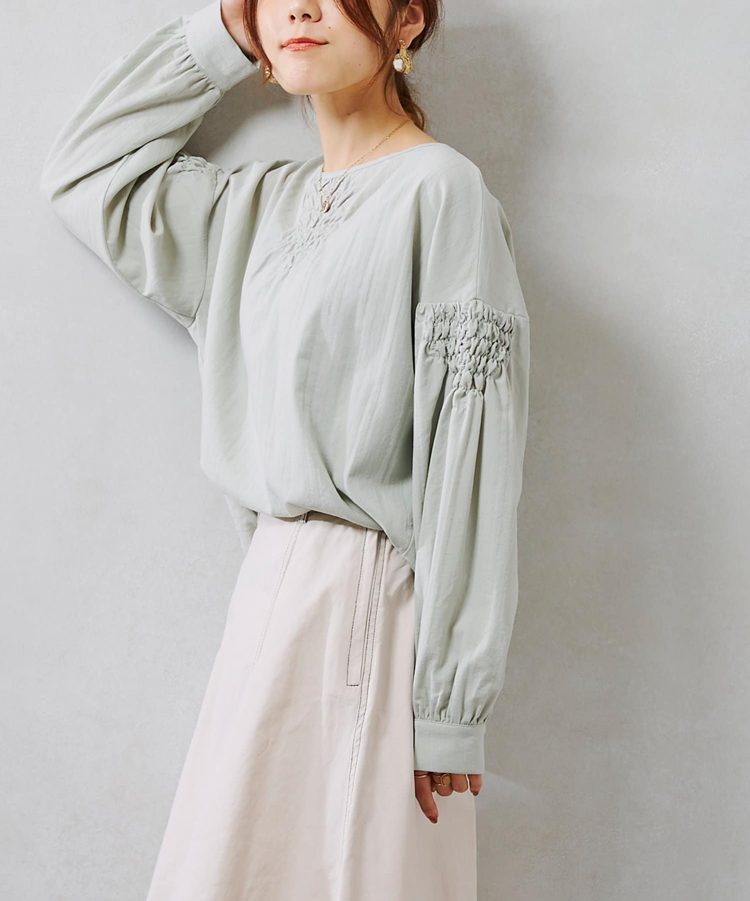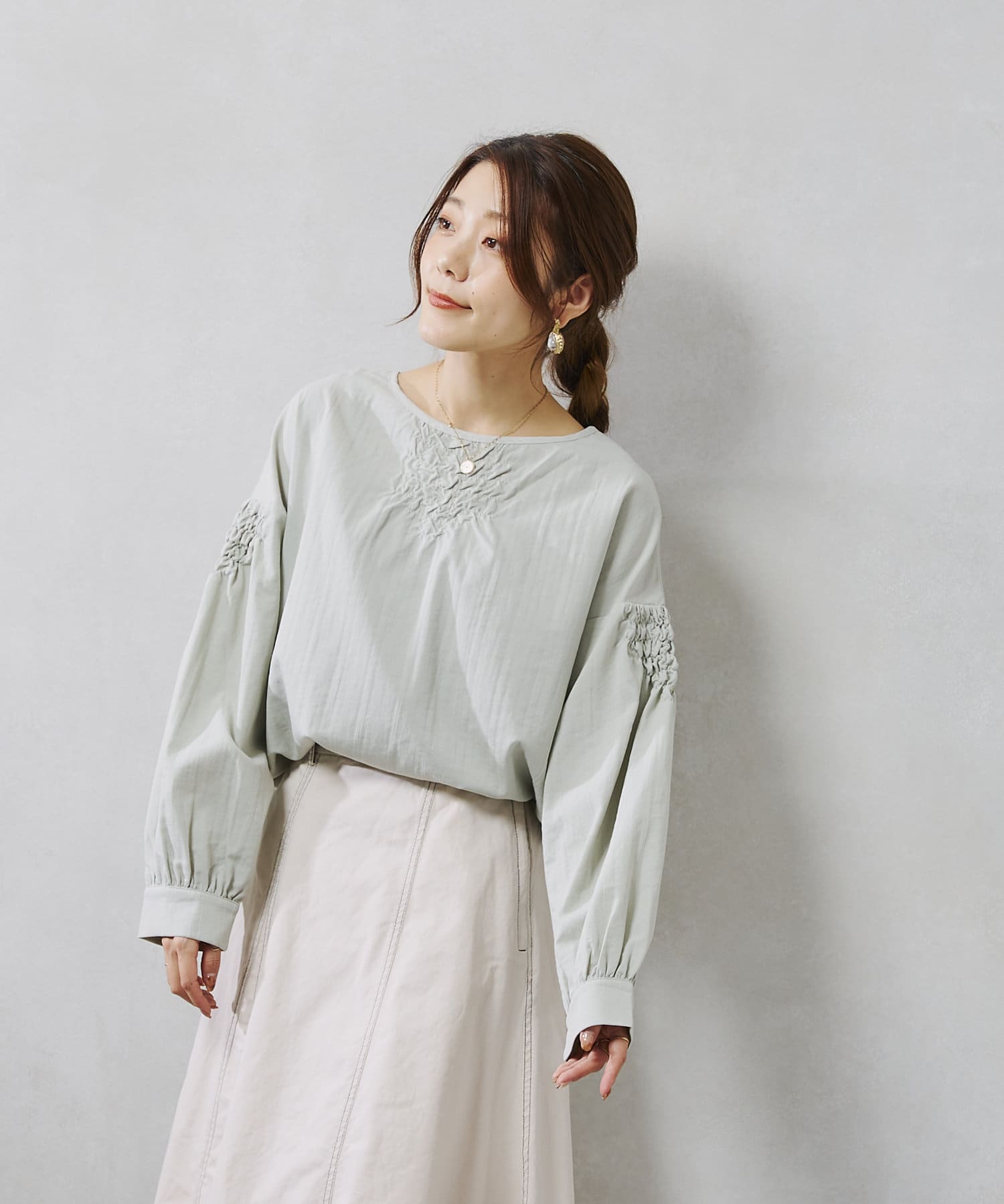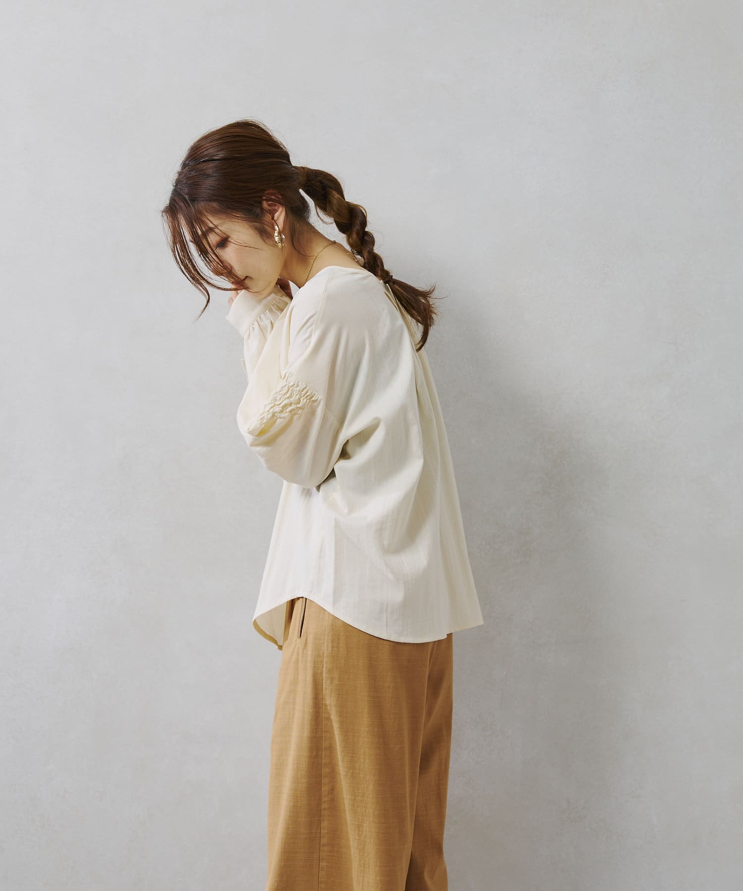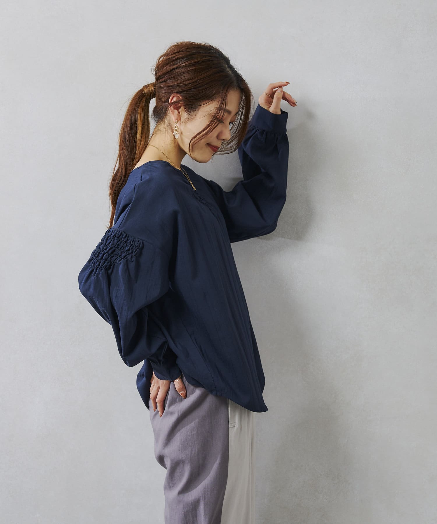 ・袖は少しボリューム感があり、シャーリングになったデザイン。
