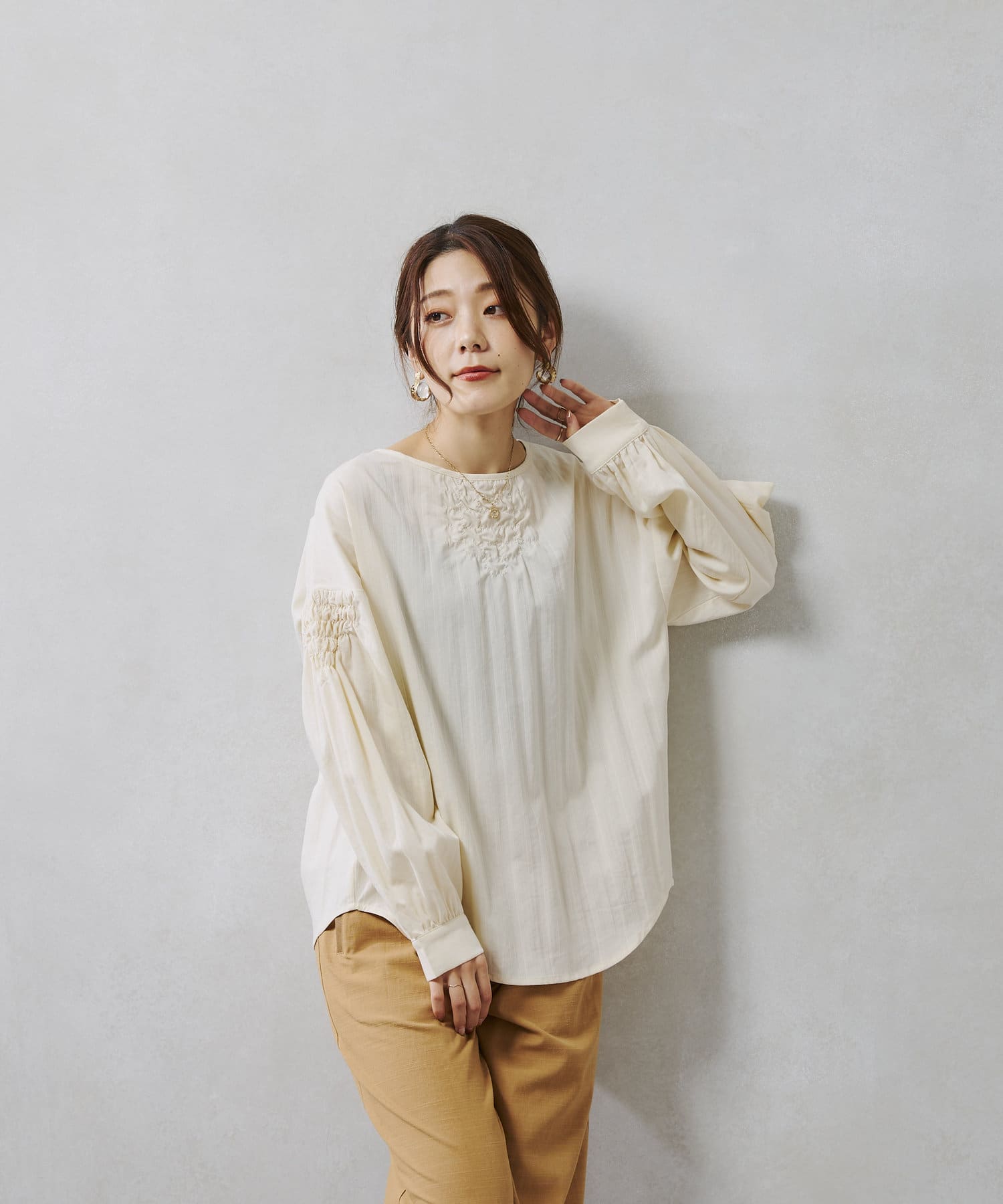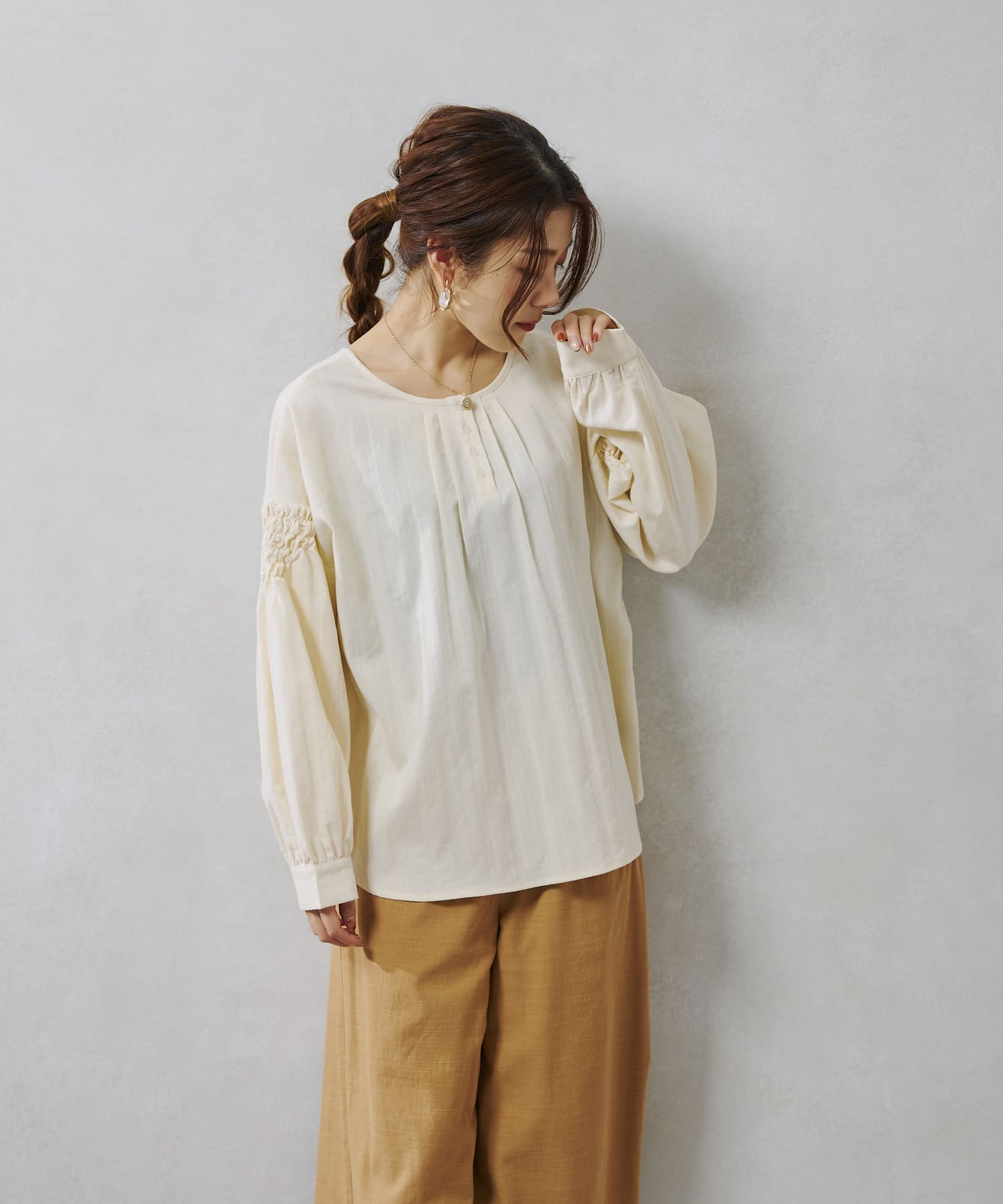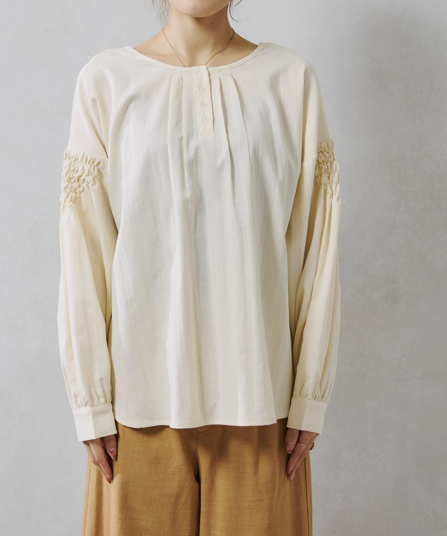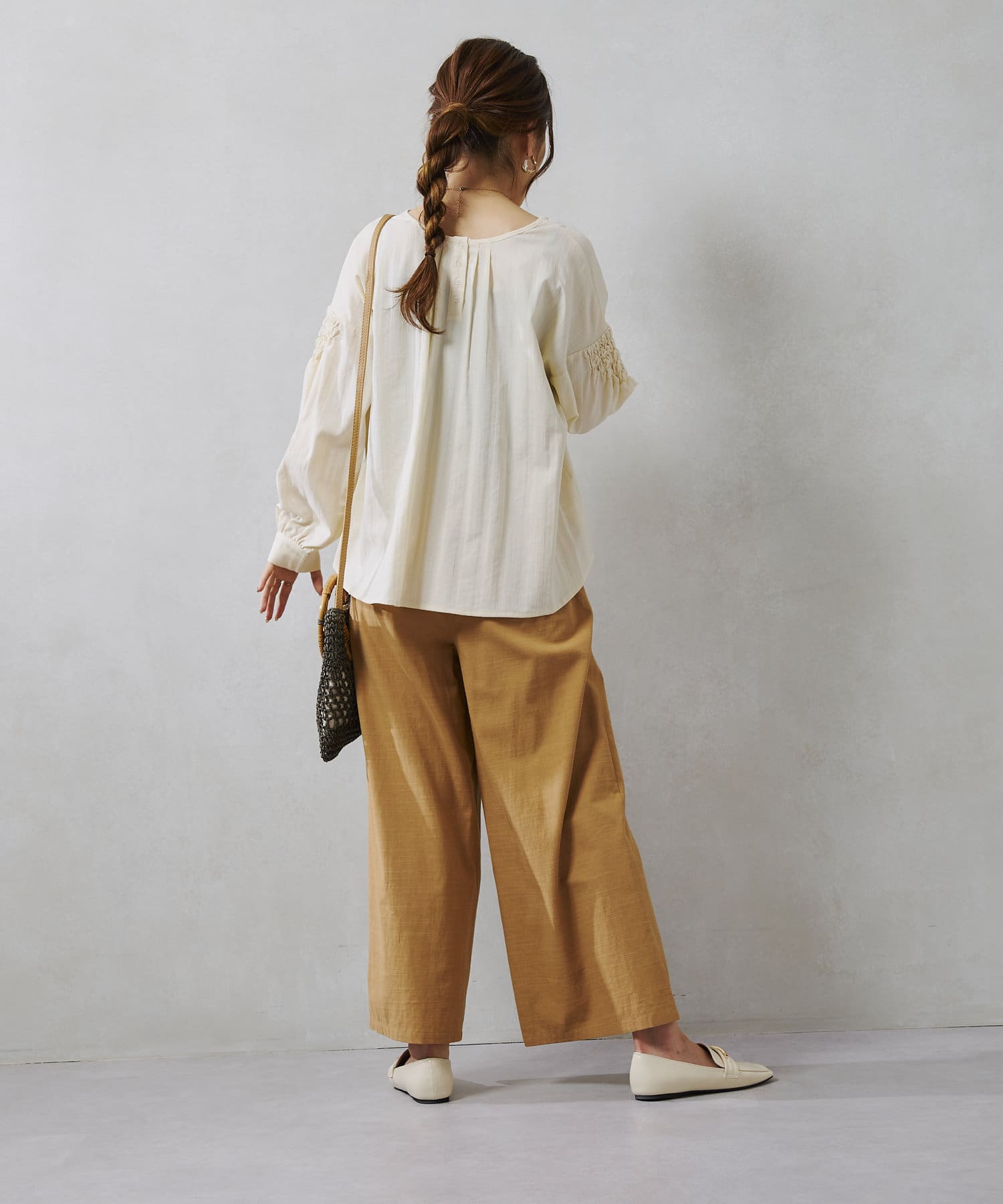・袖は少しボリューム感があり、シャーリングになったデザイン。