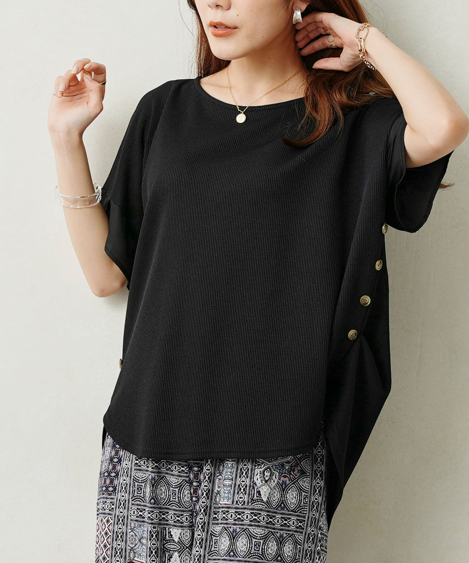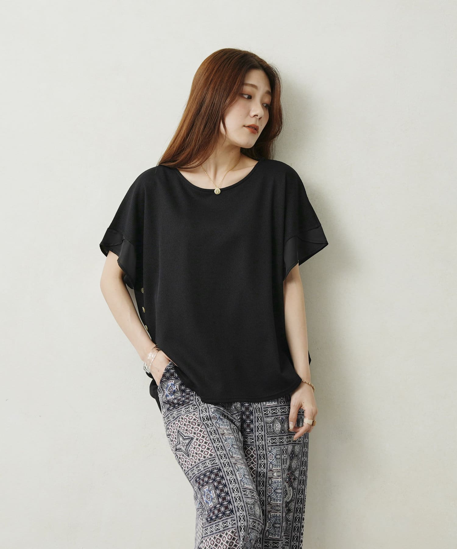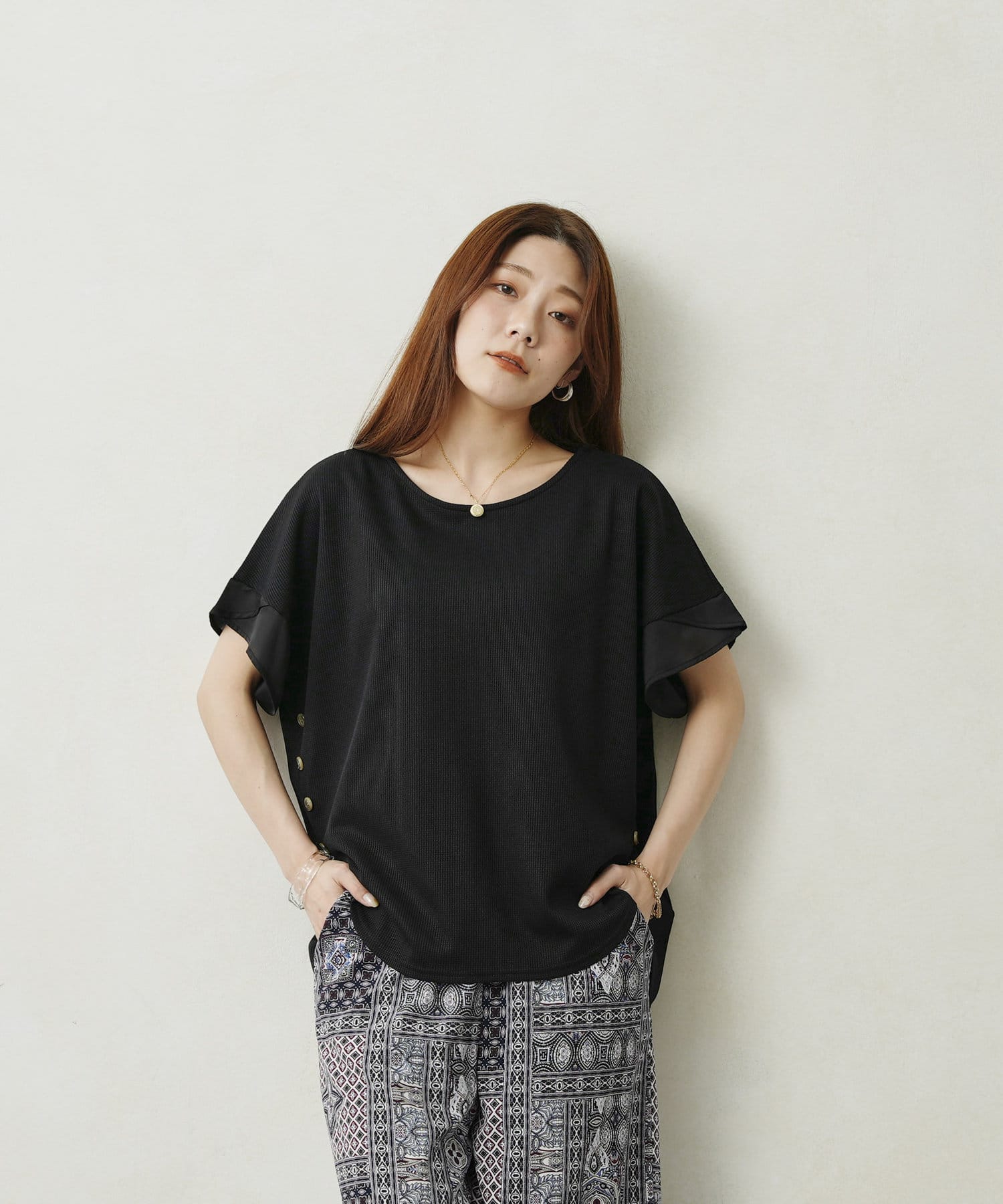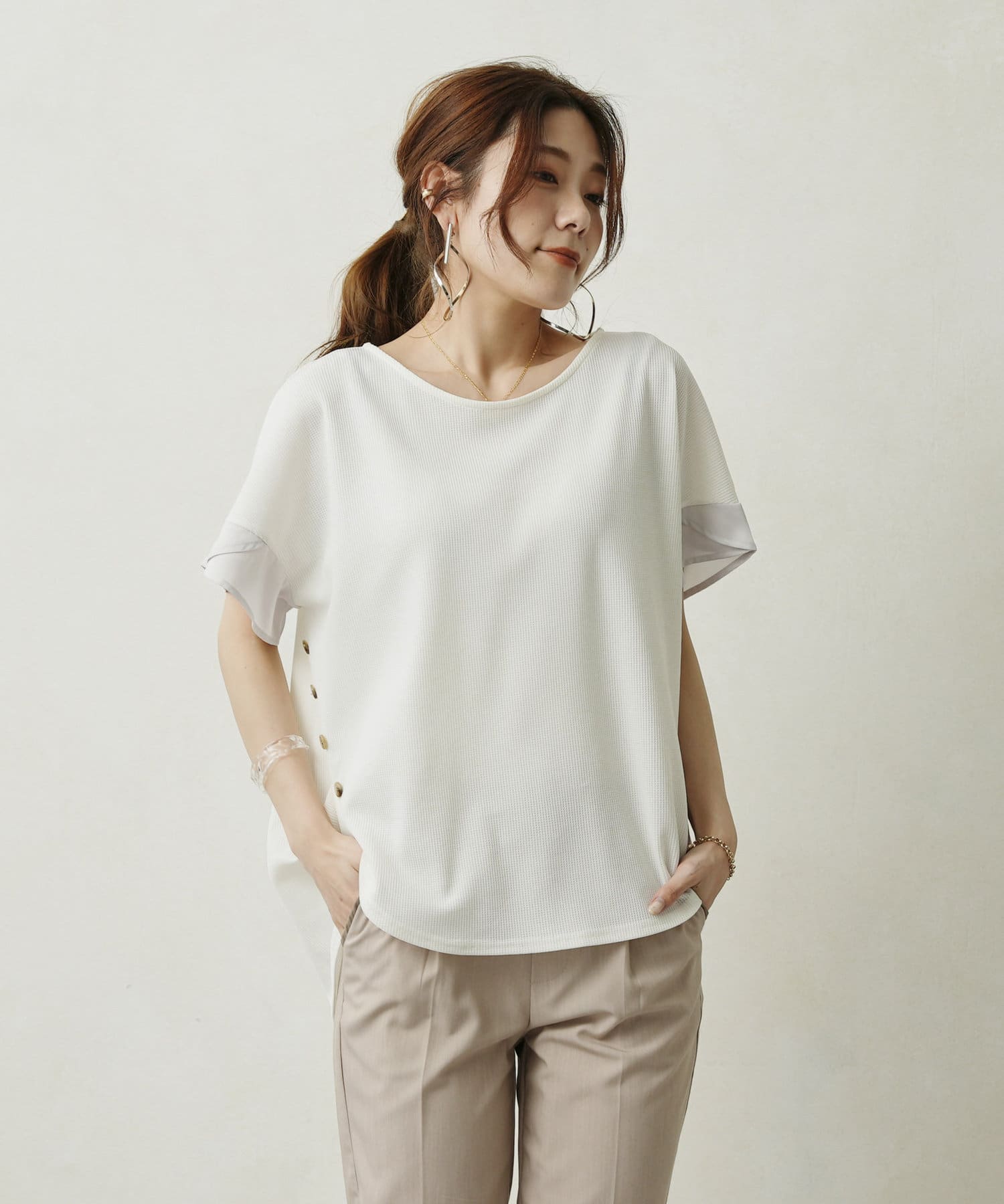 着回し抜群!袖サテンのサイドボタンが程よいアクセントを作ってくれるトップス