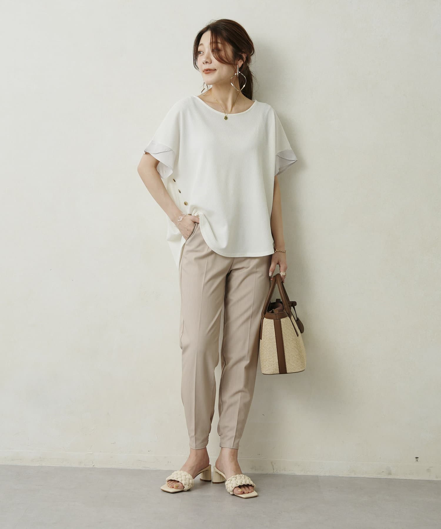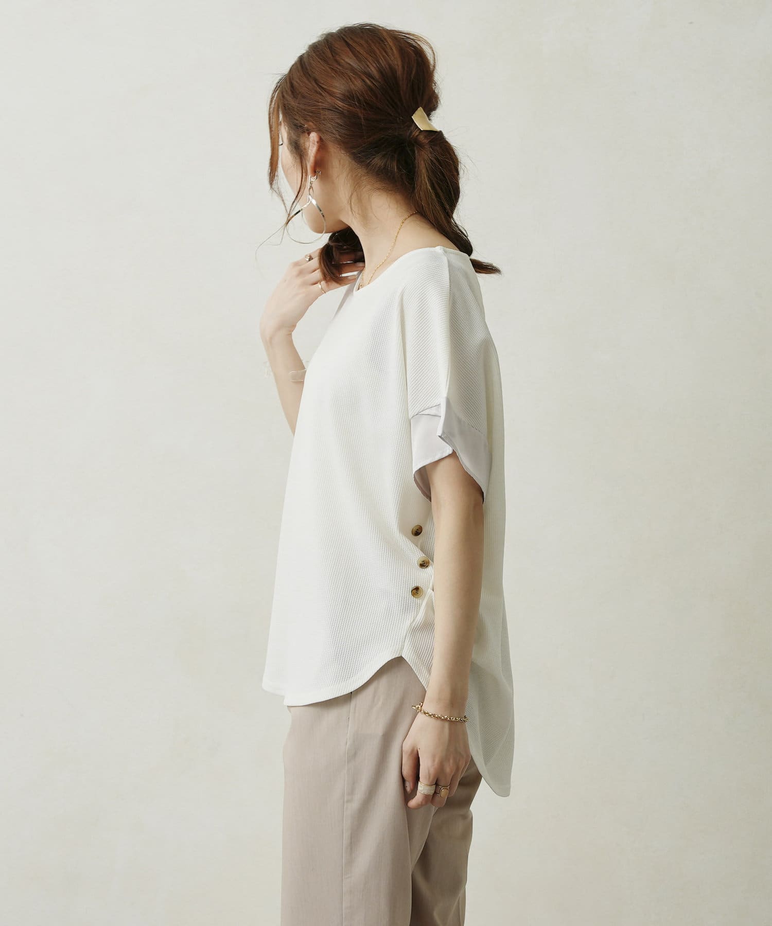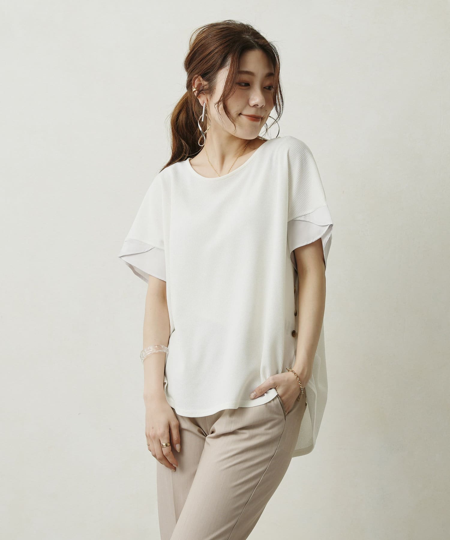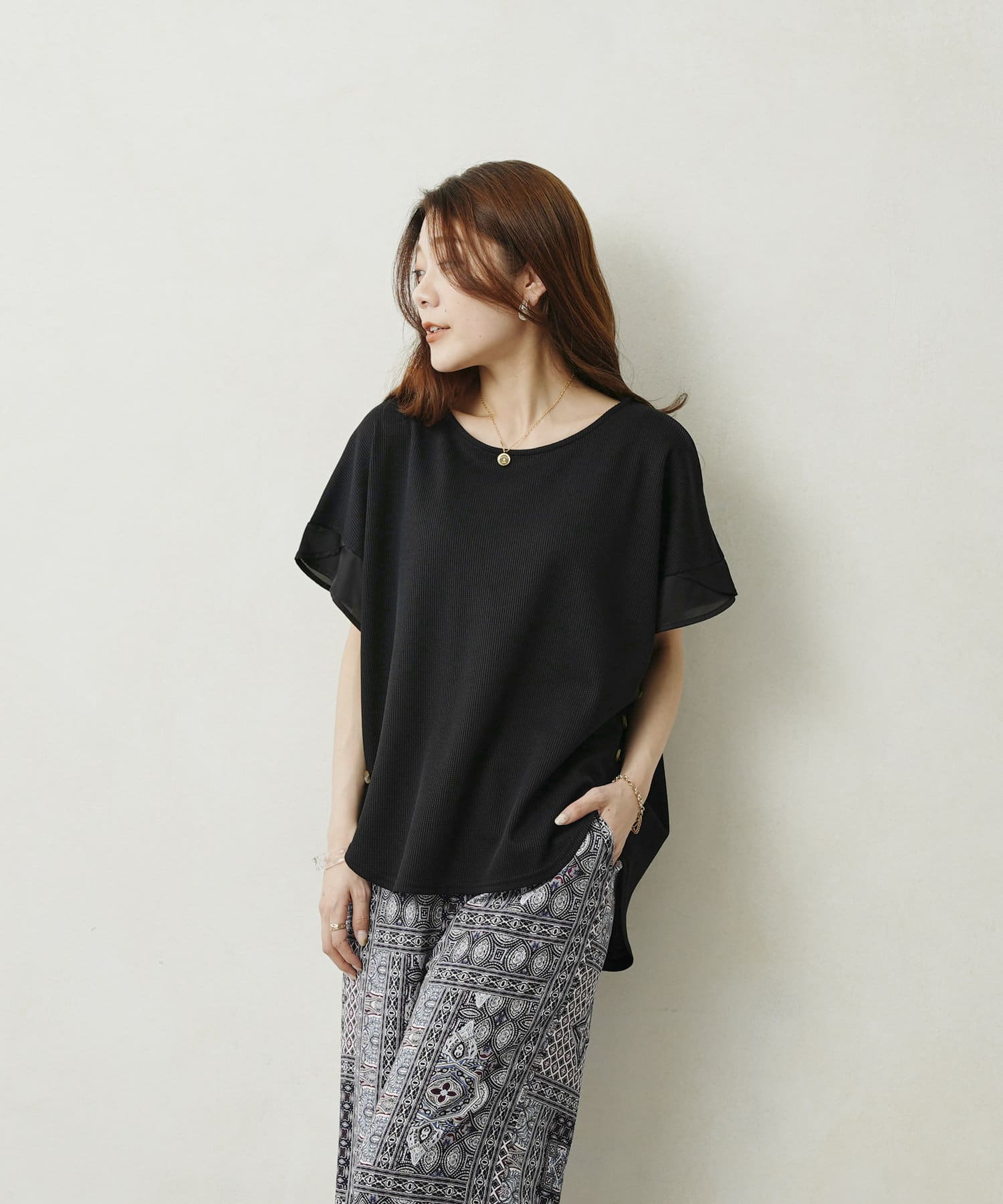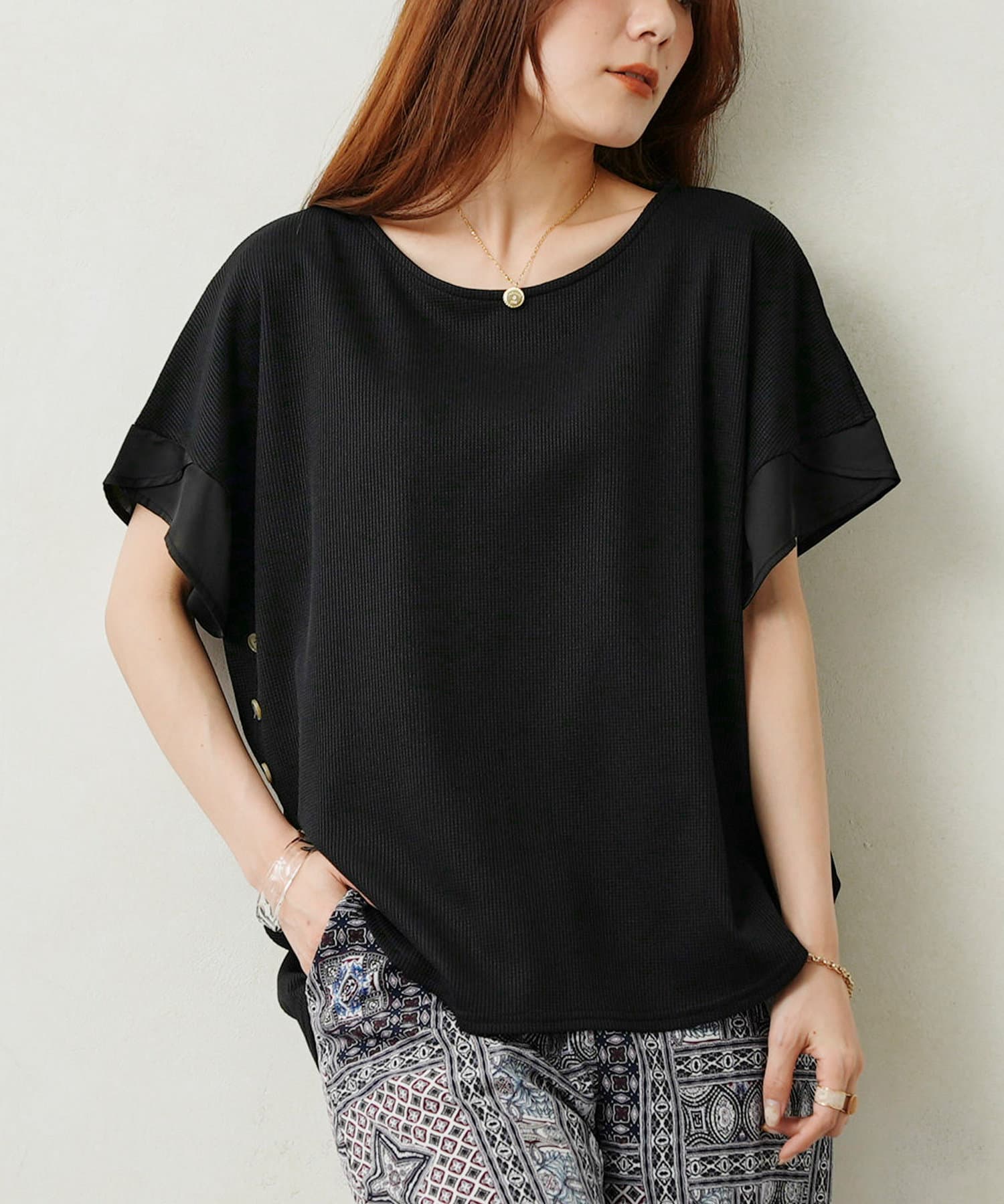 着回し抜群!袖サテンのサイドボタンが程よいアクセントを作ってくれるトップス