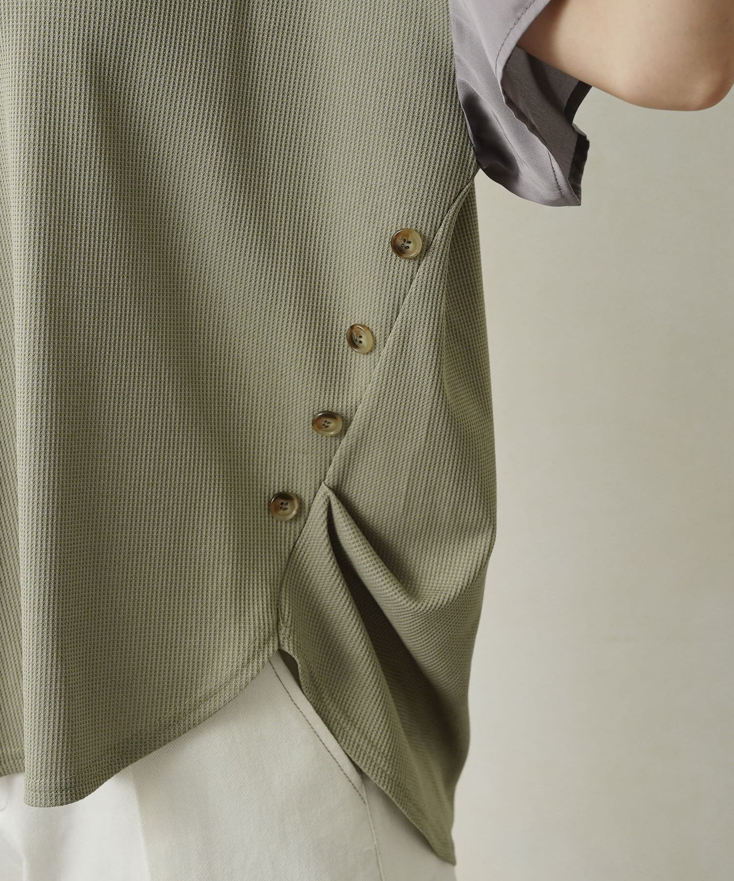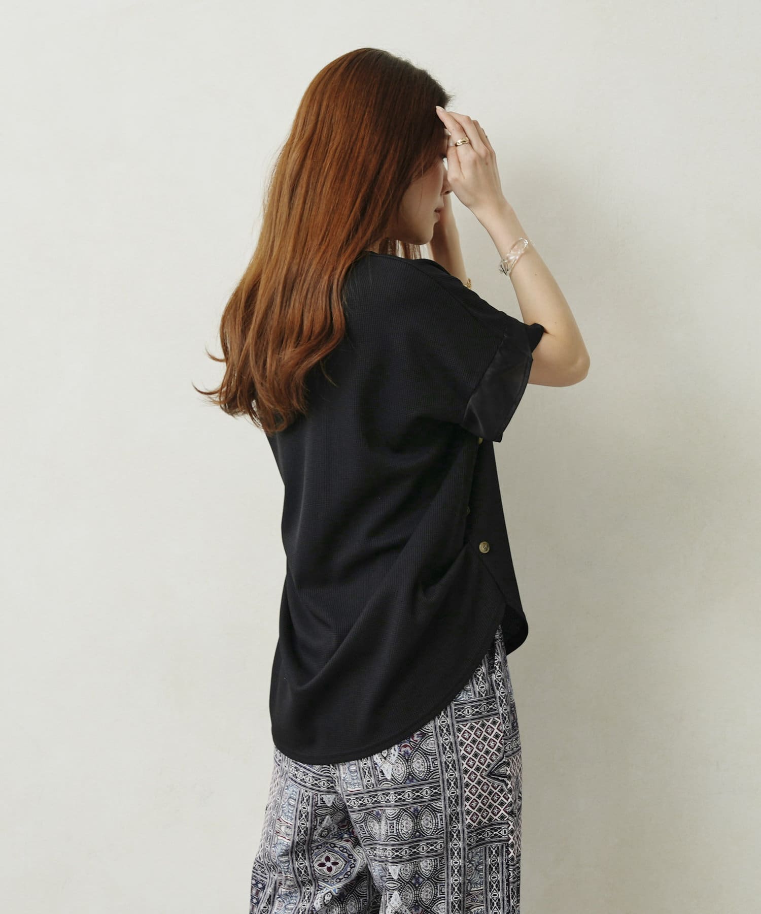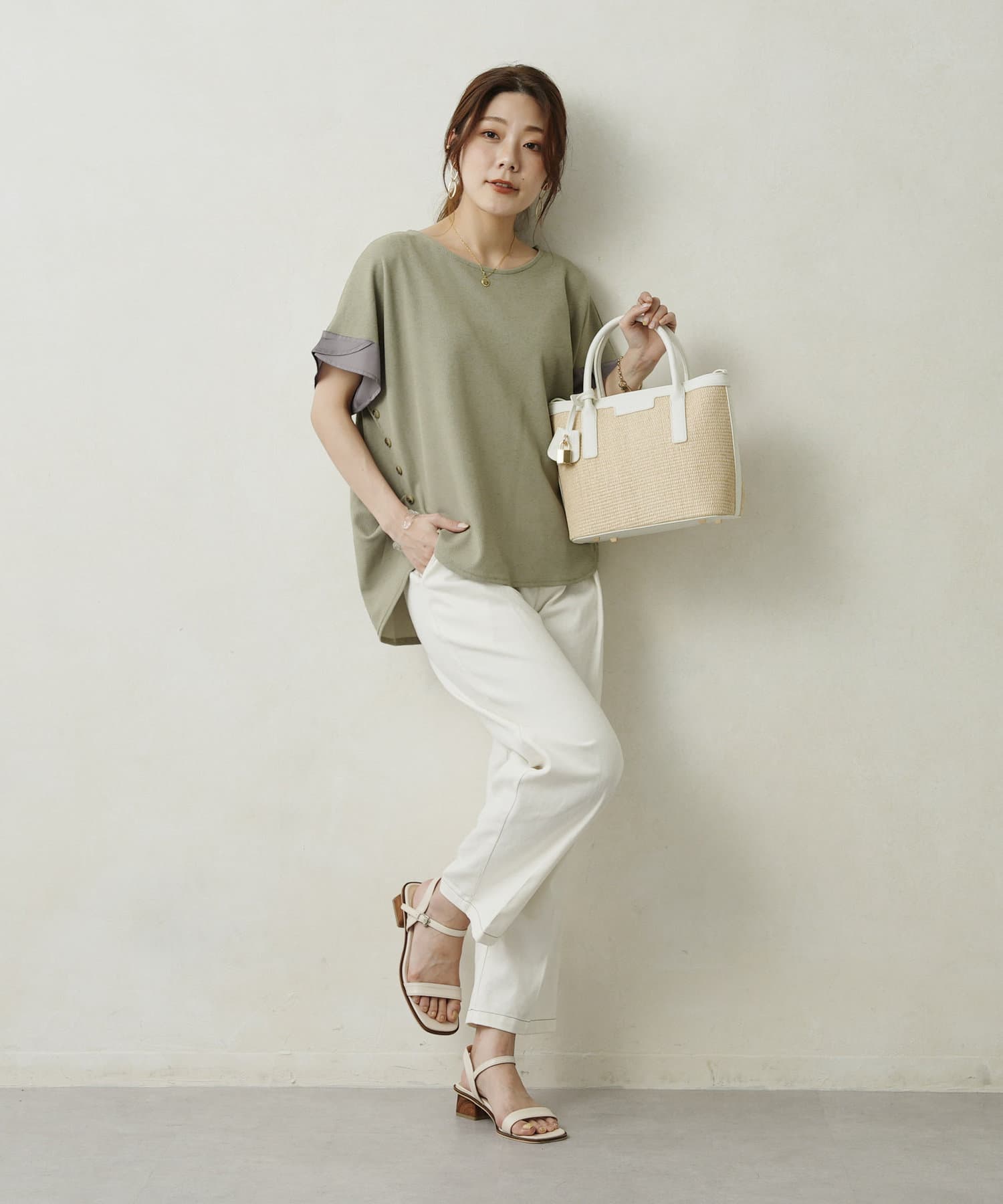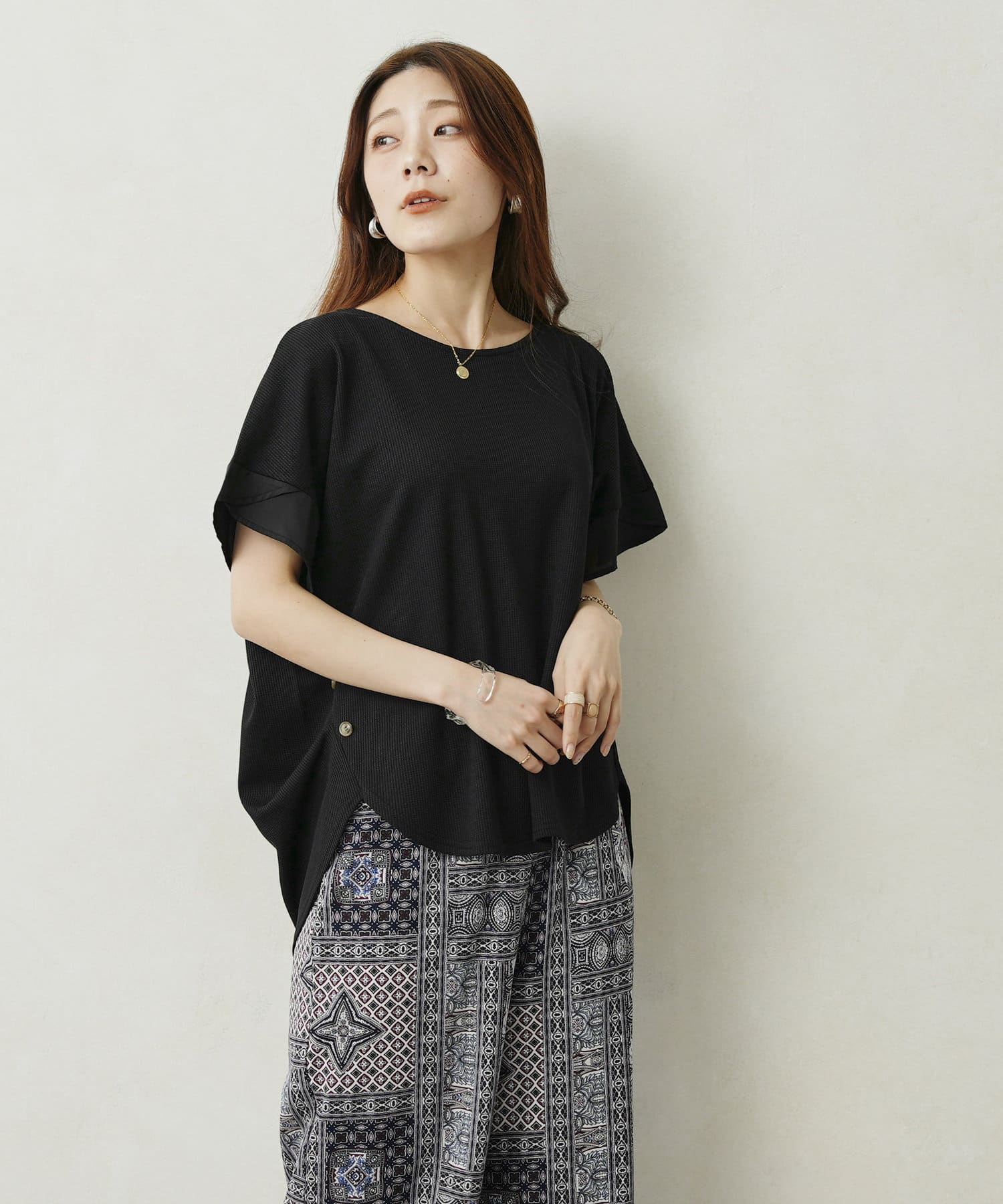 着回し抜群!袖サテンのサイドボタンが程よいアクセントを作ってくれるトップス